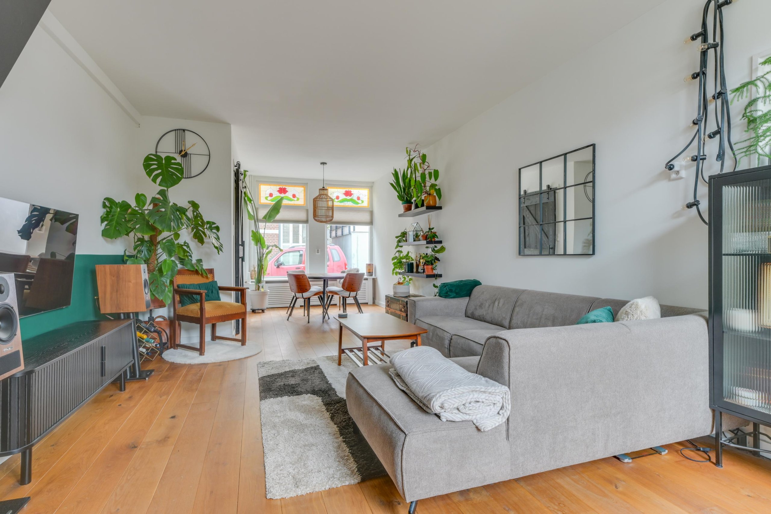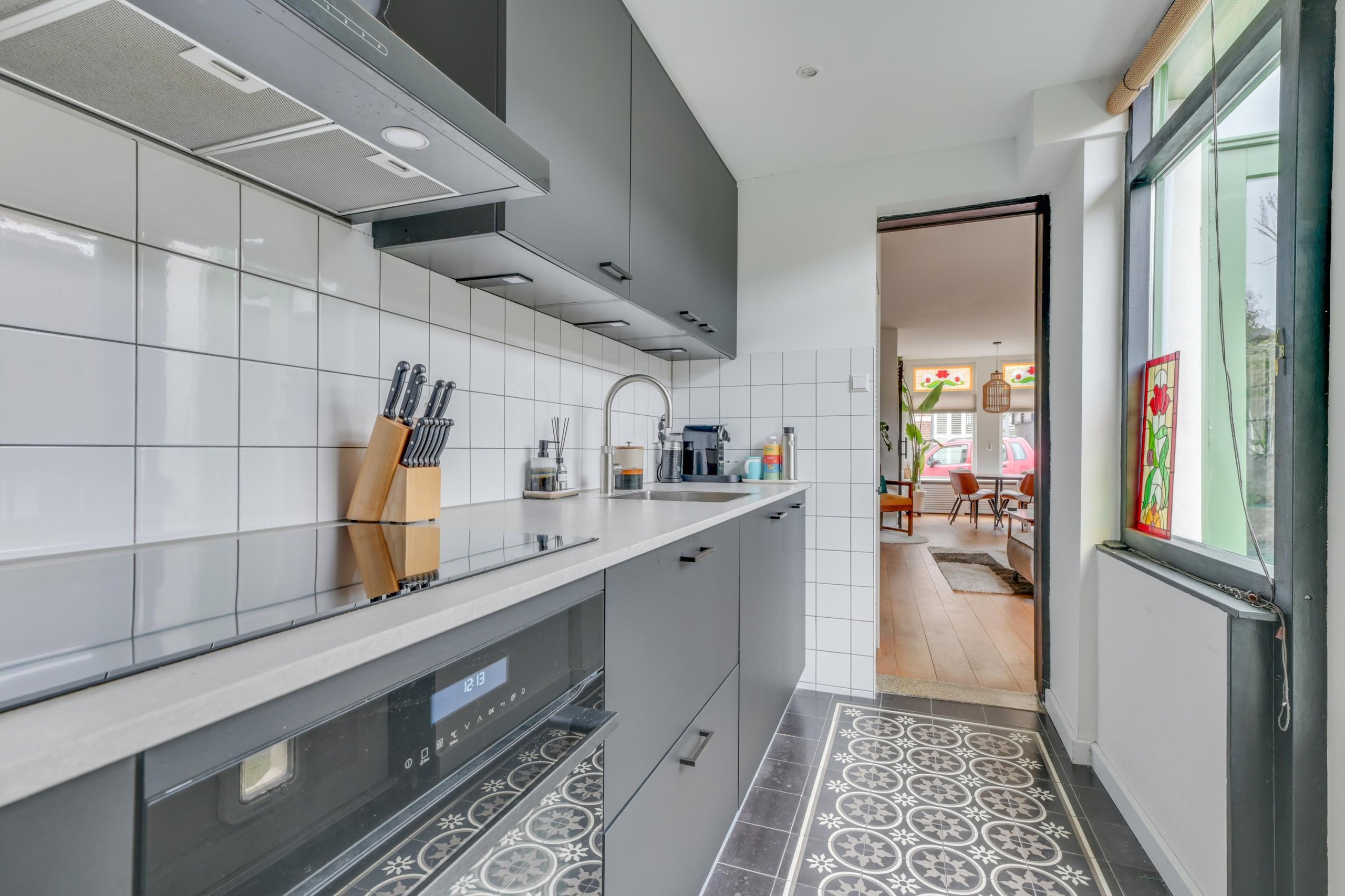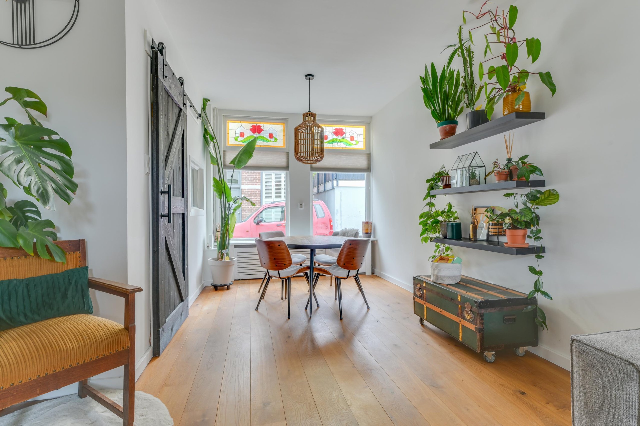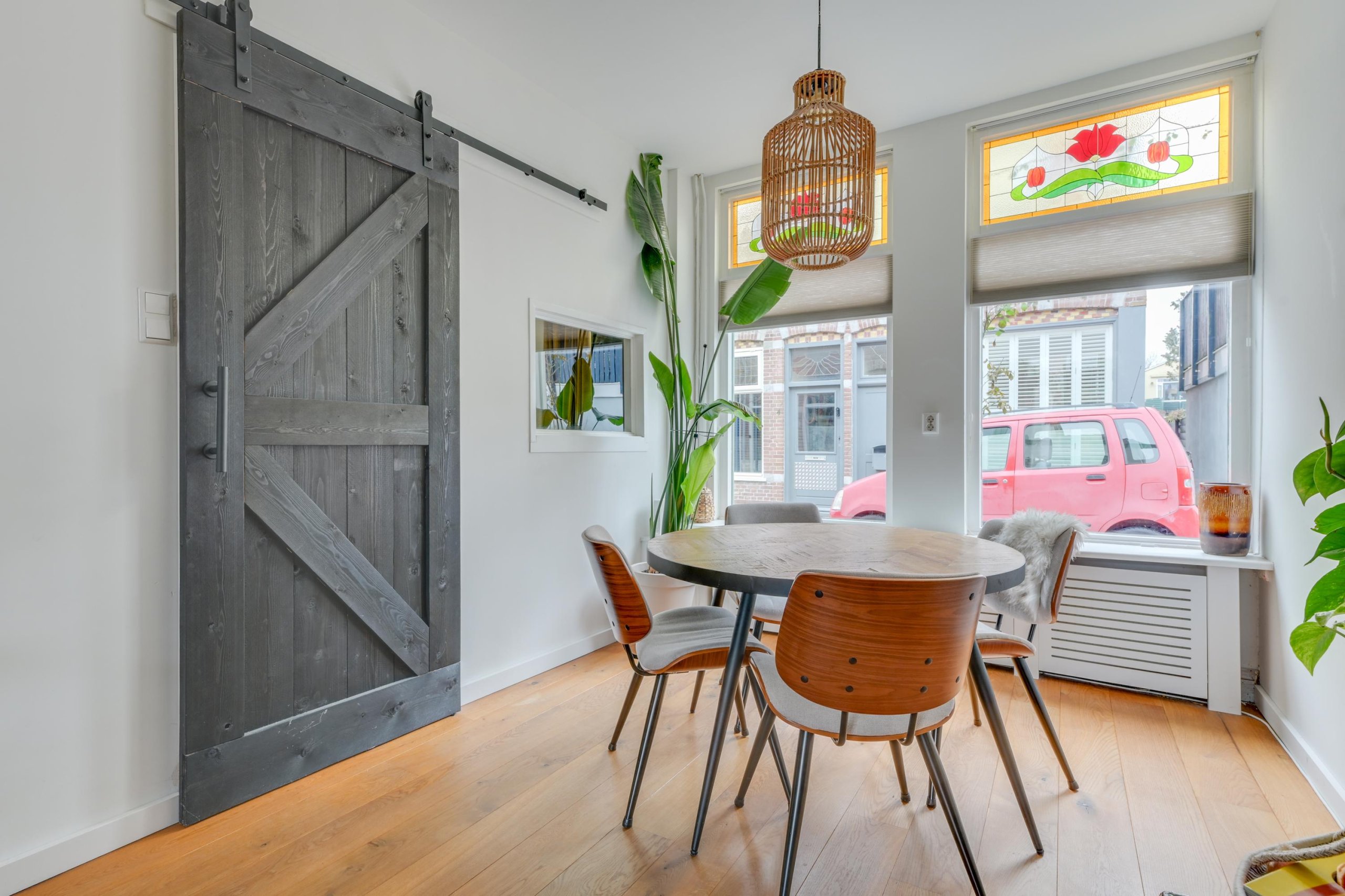 Begane grond: Entree, hal met meterkast en toegang tot de woon-eetkamer. De lichte en sfeervolle woon-eetkamer beschikt aan de voorzijde over karakteristieke glas-in-loodramen, die zorgen voor een authentieke uitstraling en een warme lichtinval.