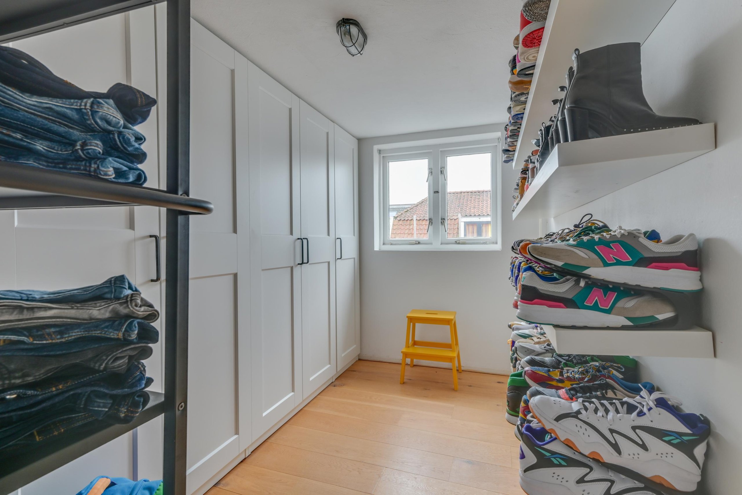 In de tuin bevindt zich een aangebouwde schuur voor extra bergruimte. Vanuit de woonkamer door middel van een vaste trap toegang naar de eerste verdieping.