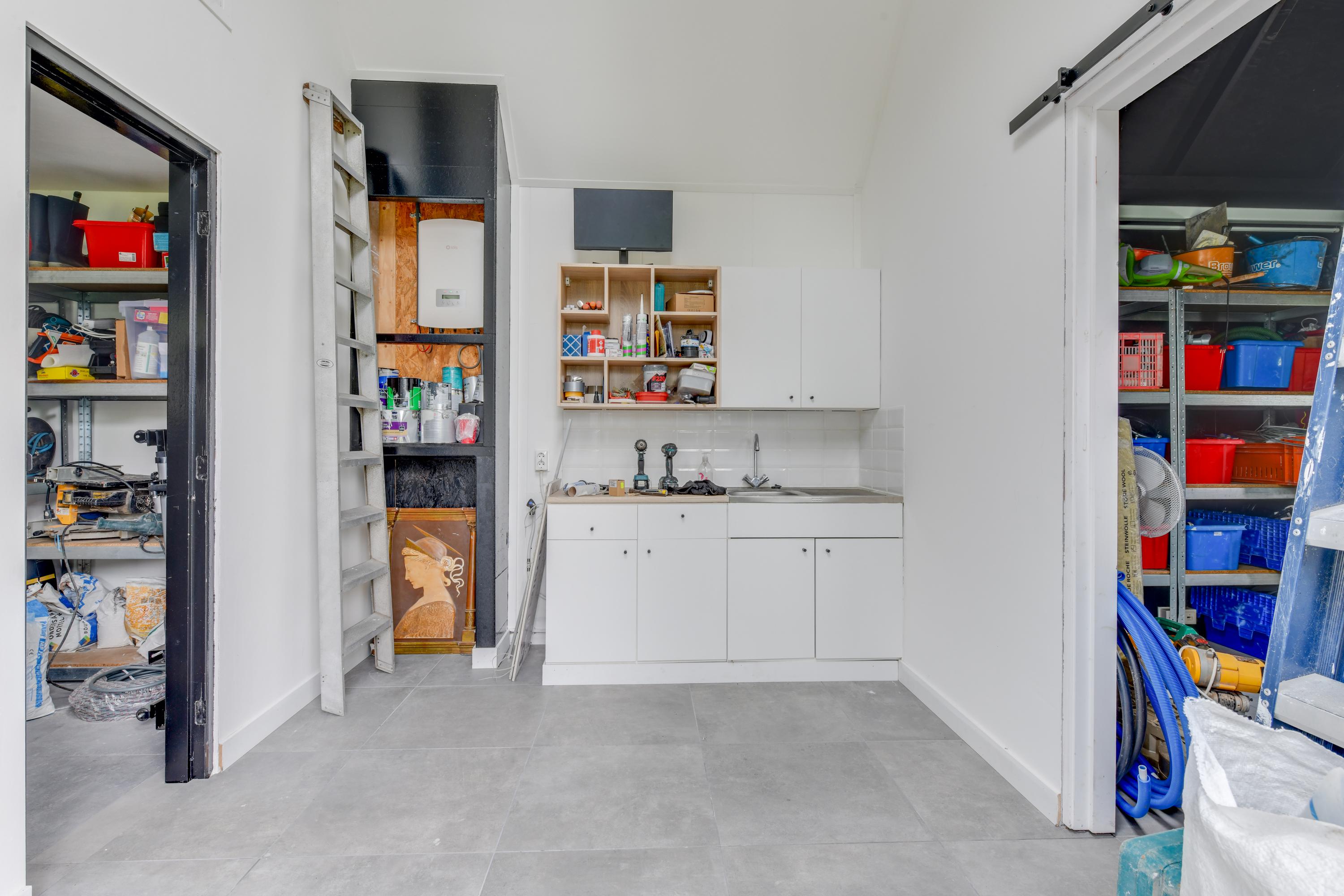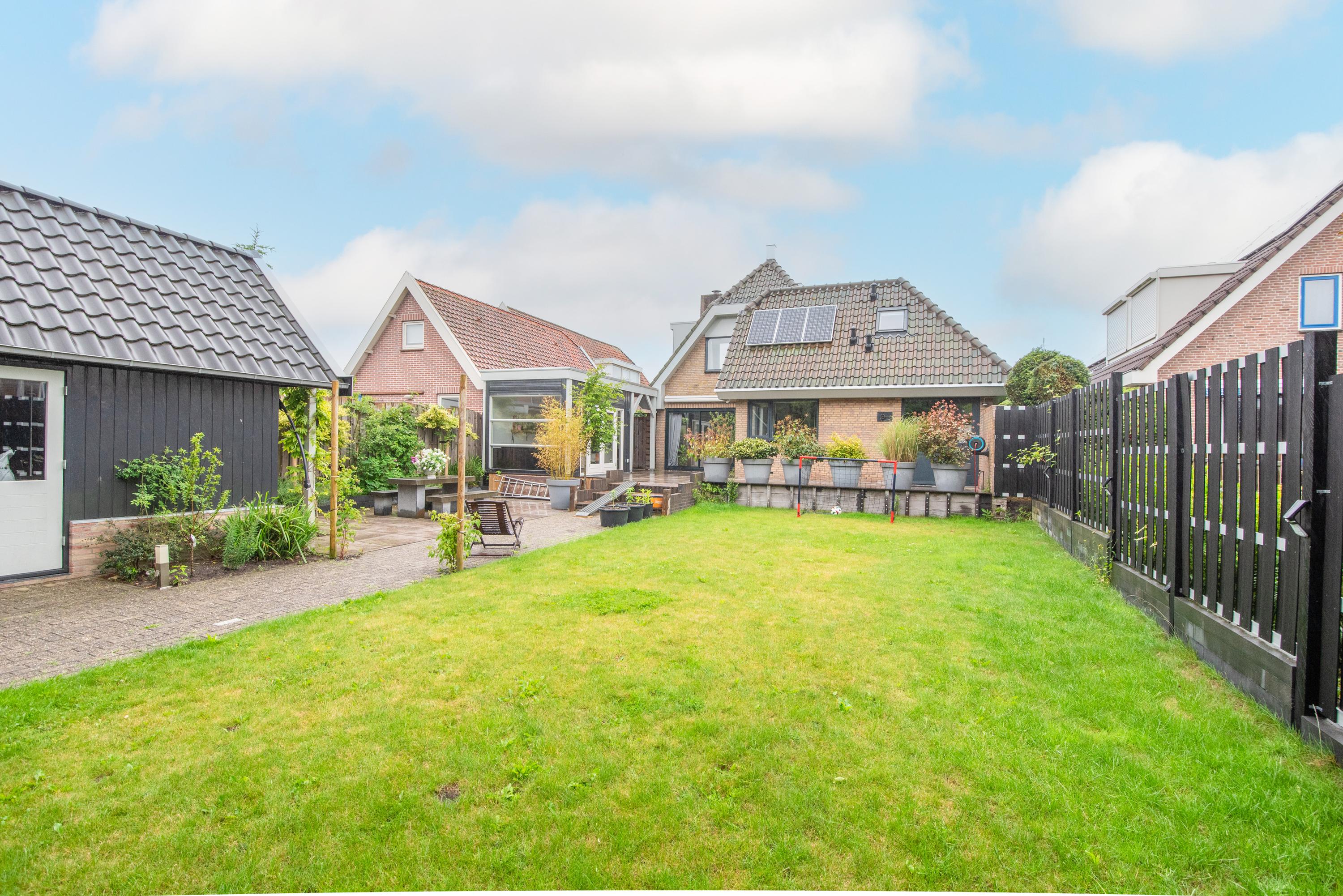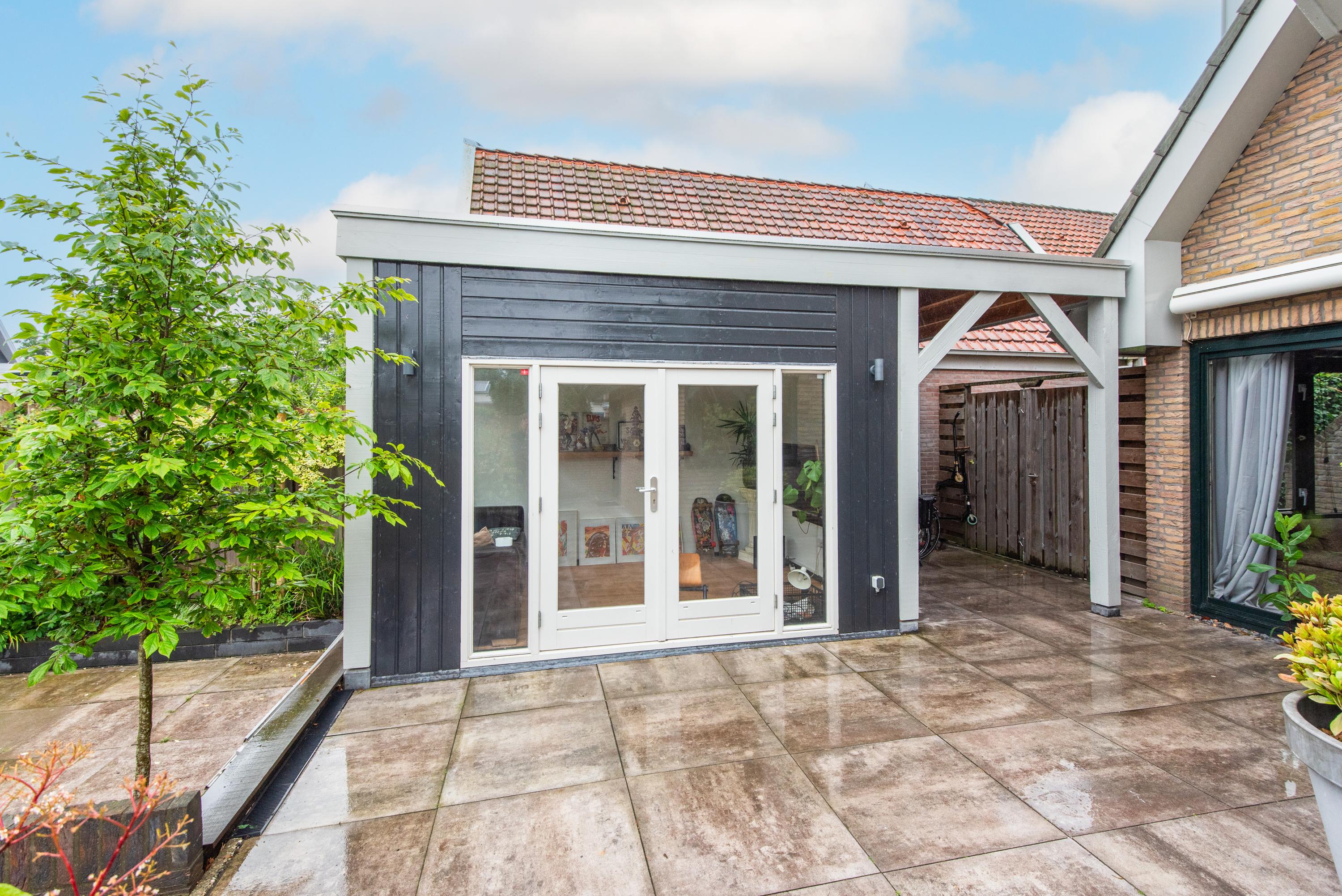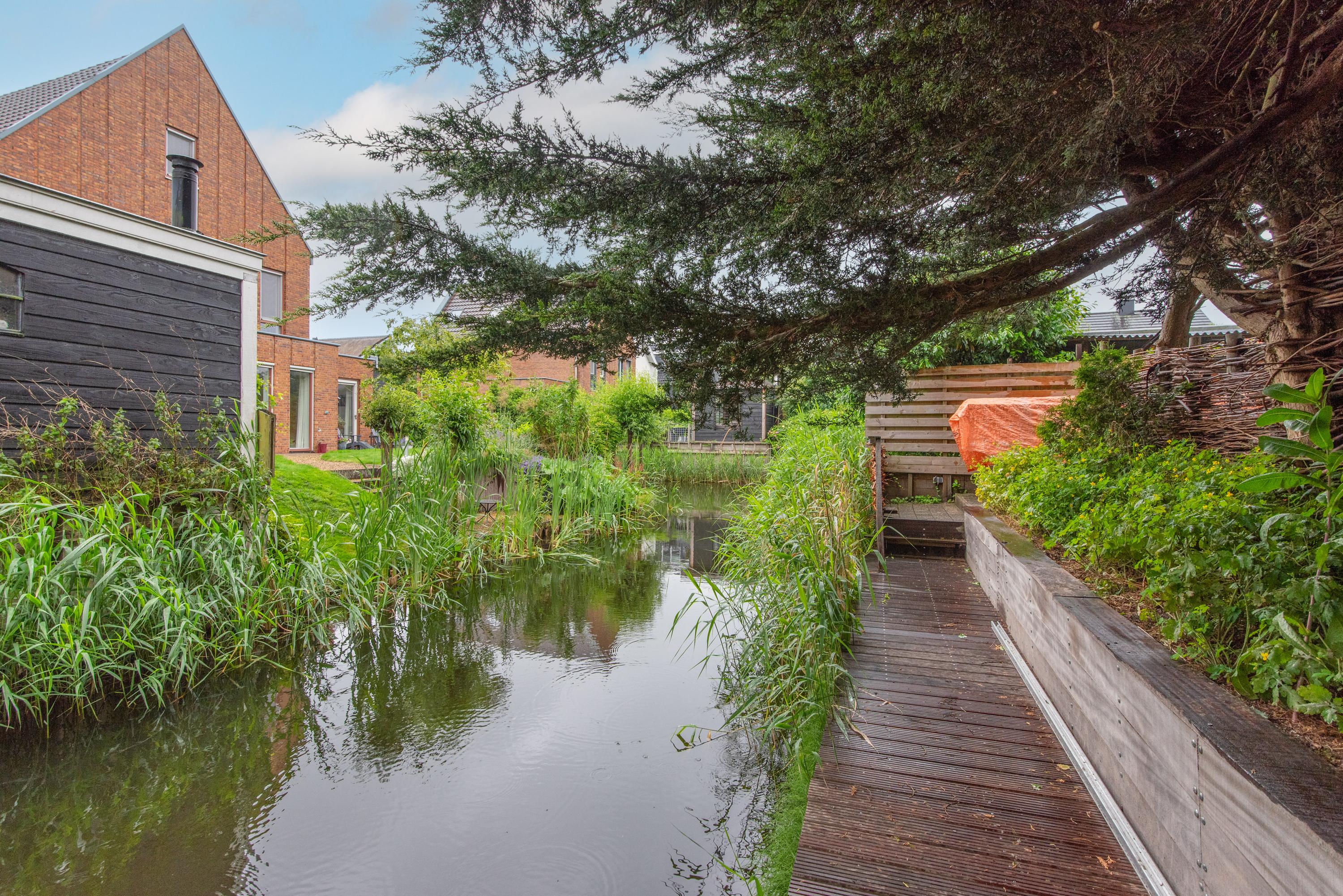 Begane grond: Via de verzorgde voortuin, waarbij je de mogelijkheid hebt om meerdere auto's op eigen terrein te parkeren, kom je binnen in een ruime entreehal met toilet, meterkast en de trap naar de eerste verdieping. Vanuit de hal heb je toegang tot de garage, waar zich ook de bergruimte met de opstelling van de CV-ketel bevindt. Verder is er toegang tot de keuken. De keuken is modern en ruim opgezet met een spoel-/kookeiland en van alle gemakken voorzien. Vanuit de keuken loop je door naar de ruime en lichte zit-, eet- en woonkamer, mede dankzij de vele raampartijen. Aan de achterzijde grenst de begane grond aan een royale tuin met een zonneterras. De diepe tuin is deels betegeld en beschikt over meerdere zitplekken, waaronder een gezellig terras aan het water. In de tuin bevinden zich een ruime berging en een tuinhuis met woon-/slaapkamergedeelte en keukenblok, multifunctioneel in te zetten als aanleunwoning, werkplaats, atelier of praktijkruimte.