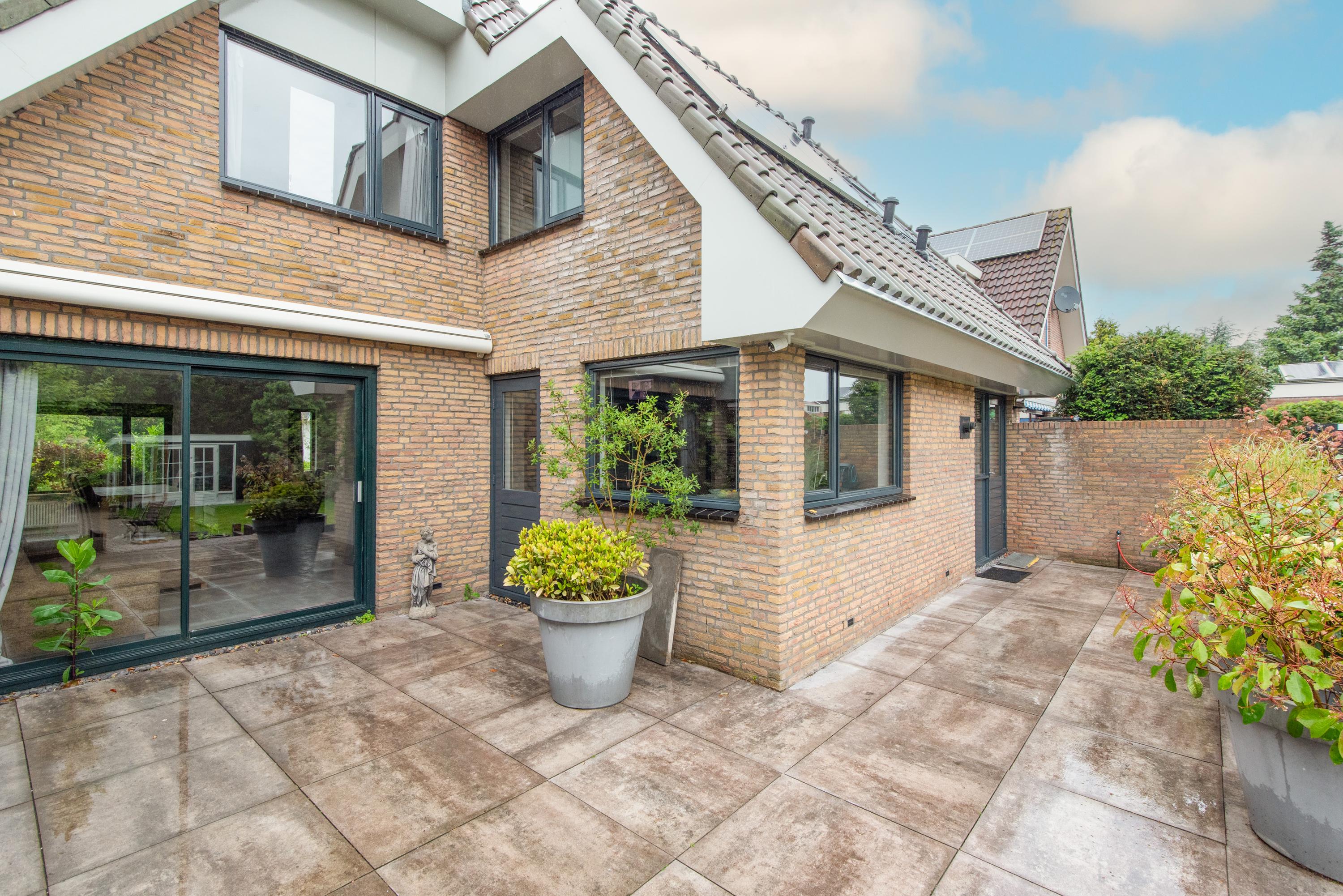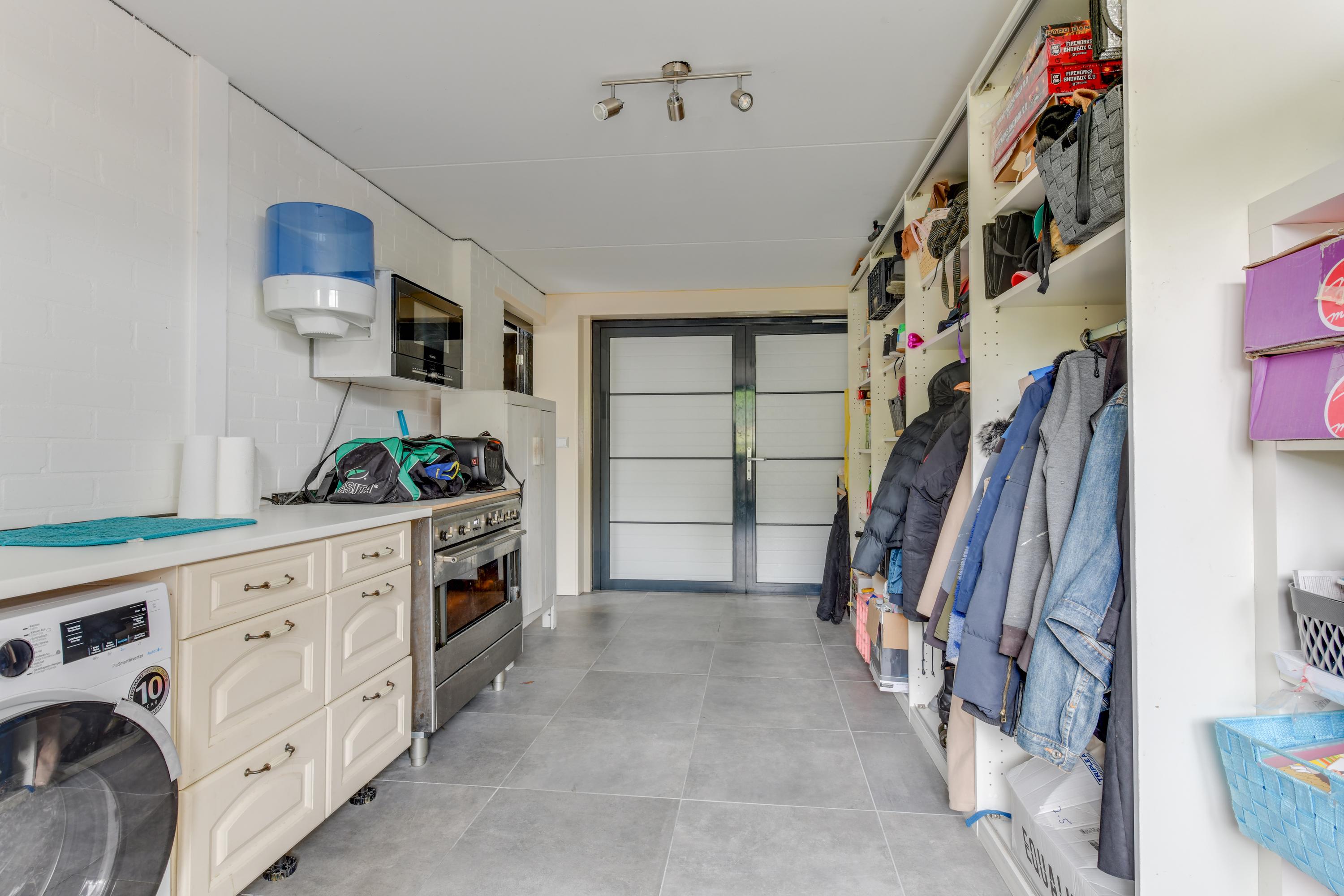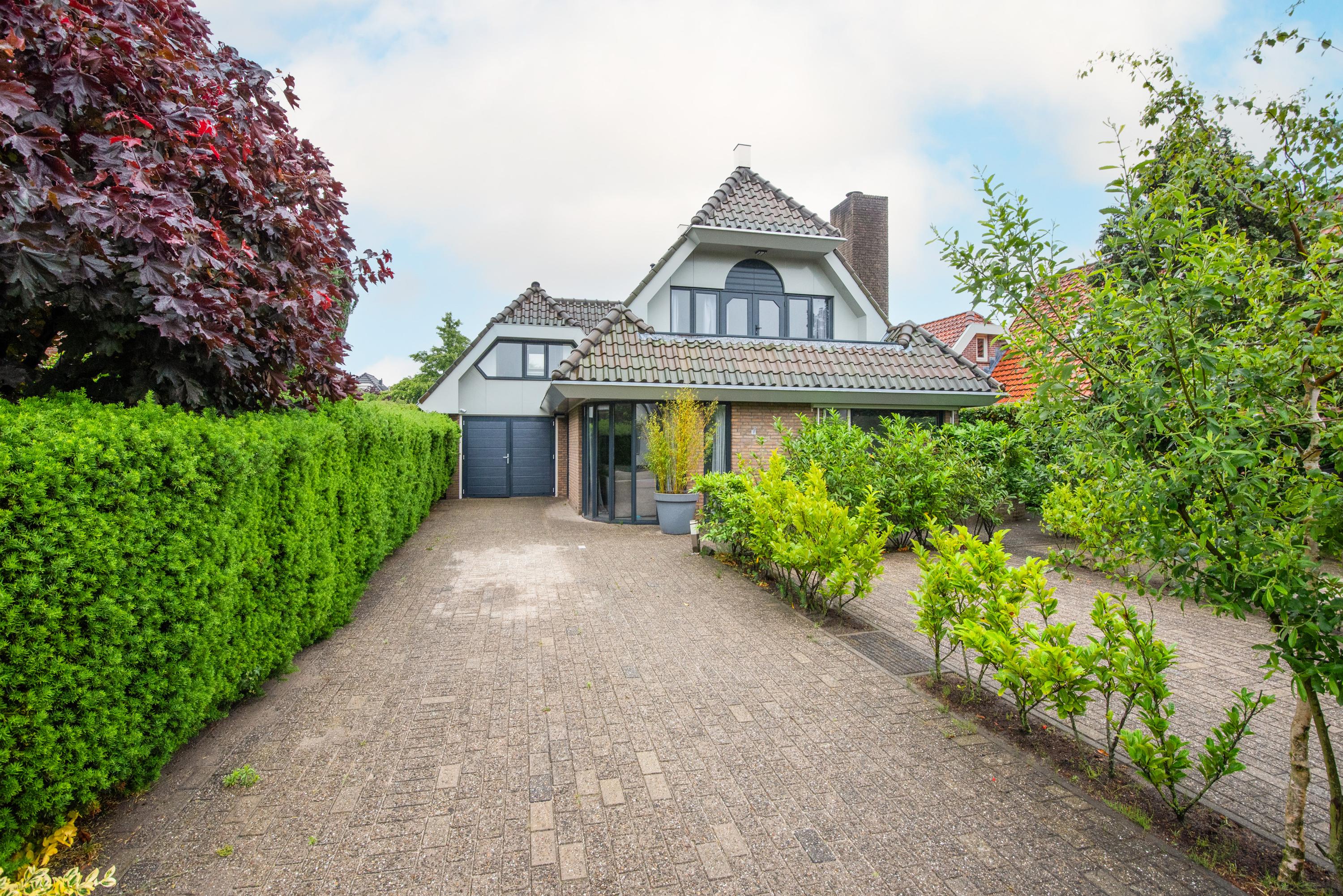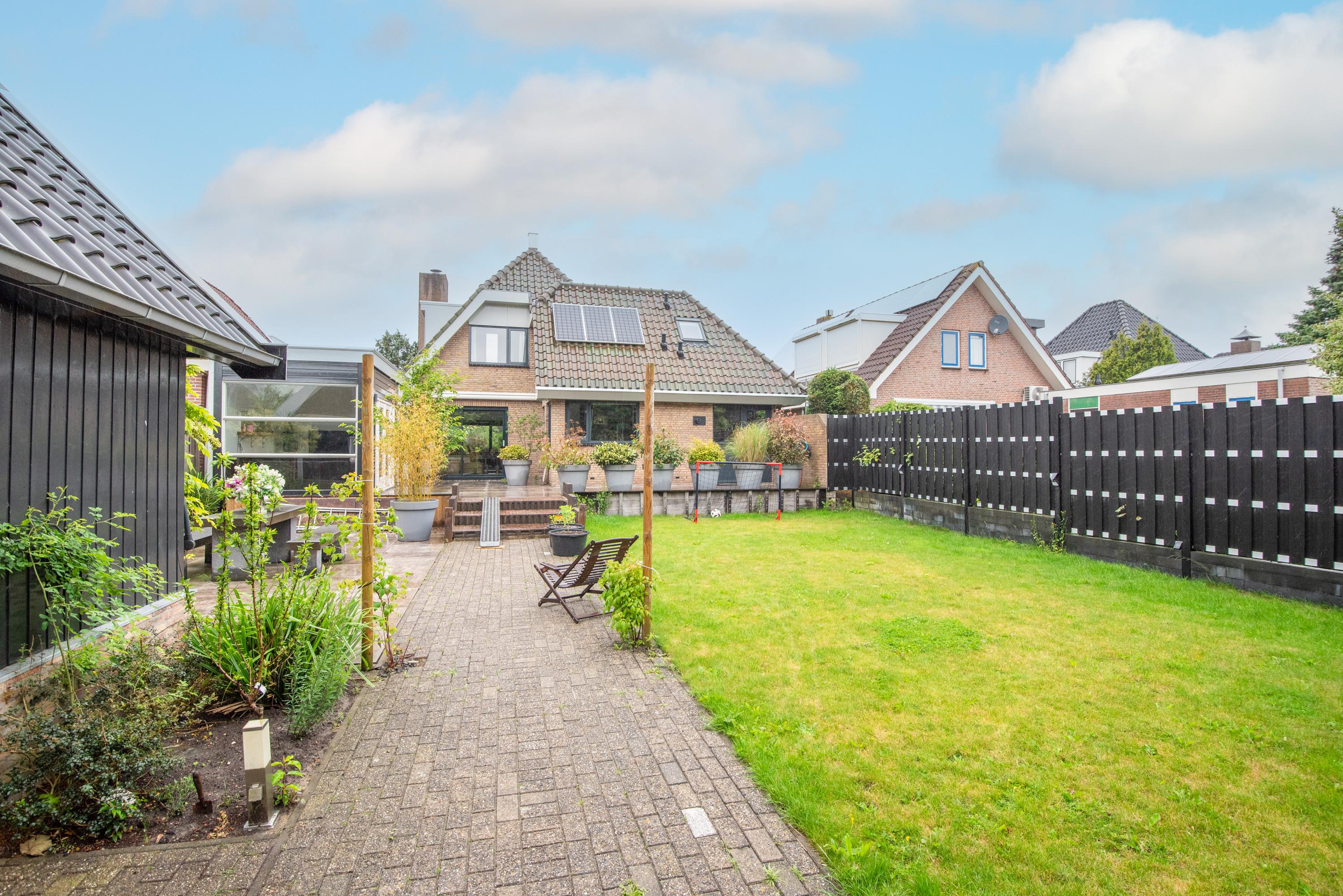 Begane grond: Via de verzorgde voortuin, waarbij je de mogelijkheid hebt om meerdere auto's op eigen terrein te parkeren, kom je binnen in een ruime entreehal met toilet, meterkast en de trap naar de eerste verdieping. Vanuit de hal heb je toegang tot de garage, waar zich ook de bergruimte met de opstelling van de CV-ketel bevindt. Verder is er toegang tot de keuken. De keuken is modern en ruim opgezet met een spoel-/kookeiland en van alle gemakken voorzien. Vanuit de keuken loop je door naar de ruime en lichte zit-, eet- en woonkamer, mede dankzij de vele raampartijen. Aan de achterzijde grenst de begane grond aan een royale tuin met een zonneterras. De diepe tuin is deels betegeld en beschikt over meerdere zitplekken, waaronder een gezellig terras aan het water. In de tuin bevinden zich een ruime berging en een tuinhuis met woon-/slaapkamergedeelte en keukenblok, multifunctioneel in te zetten als aanleunwoning, werkplaats, atelier of praktijkruimte.