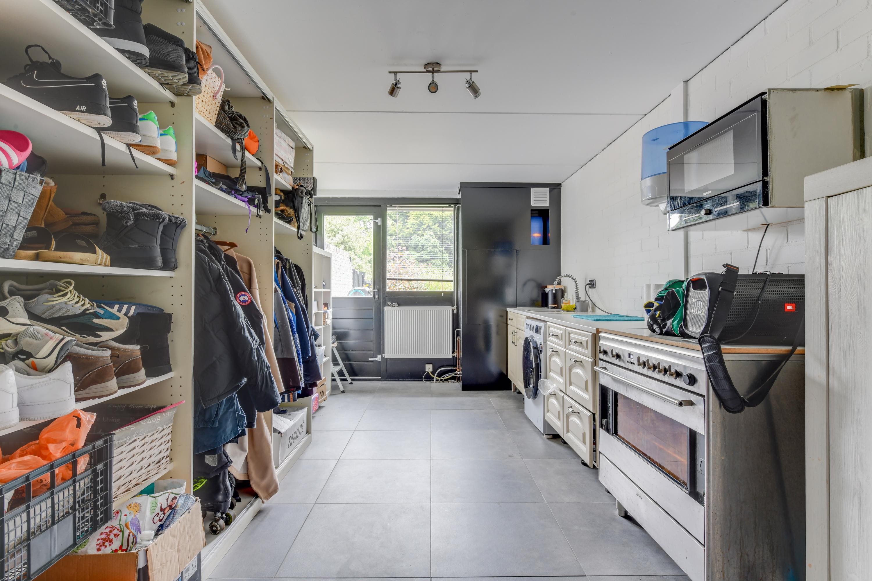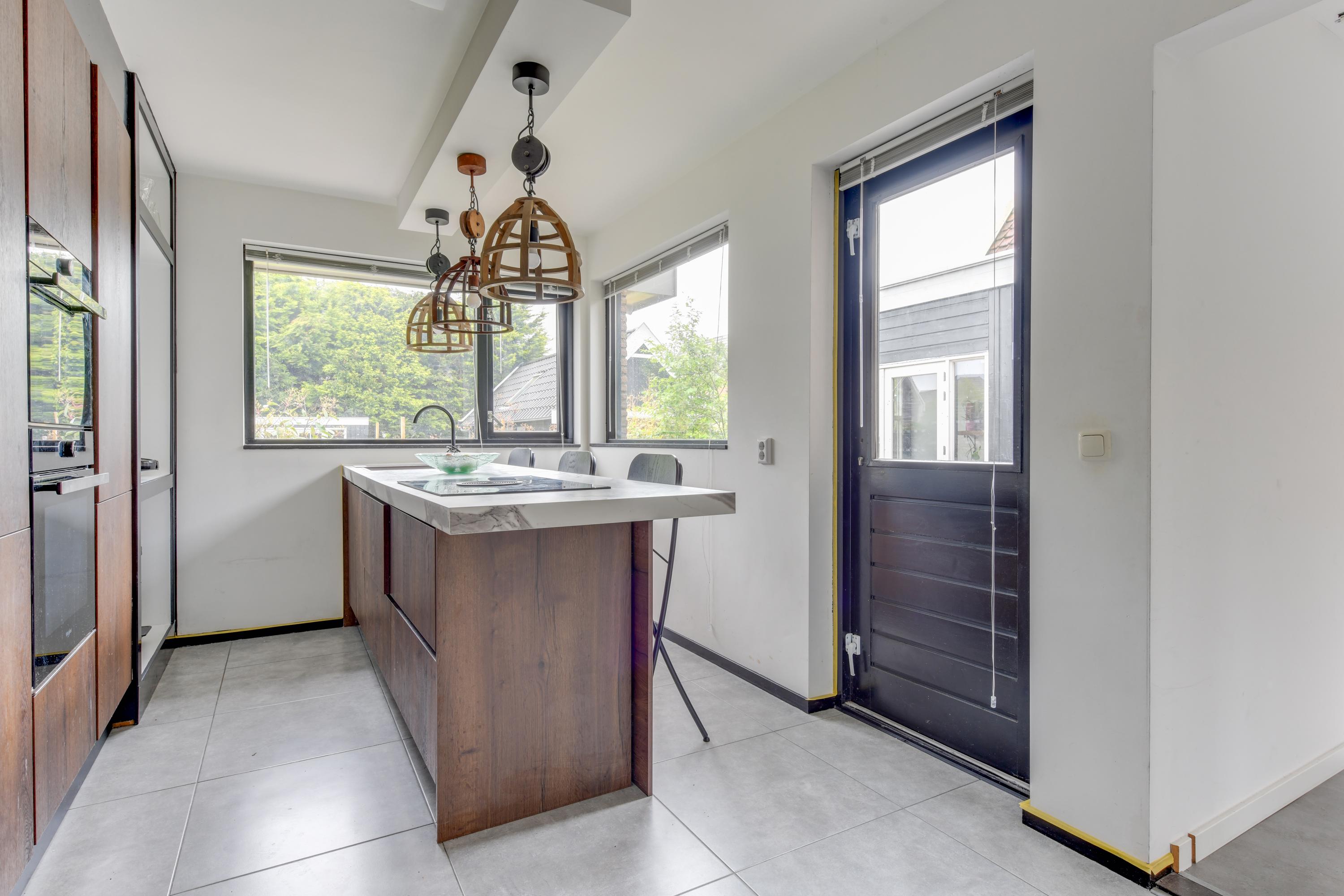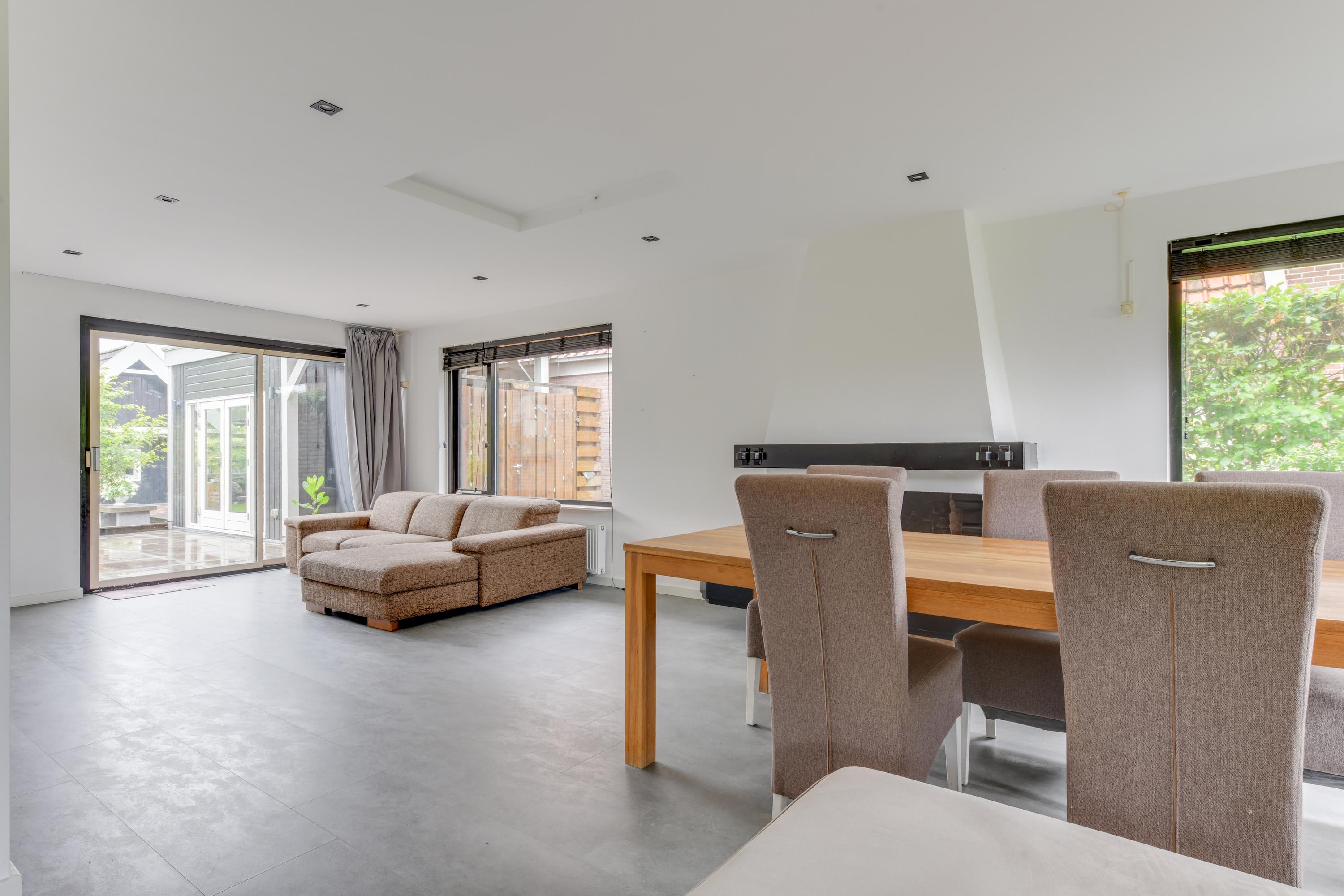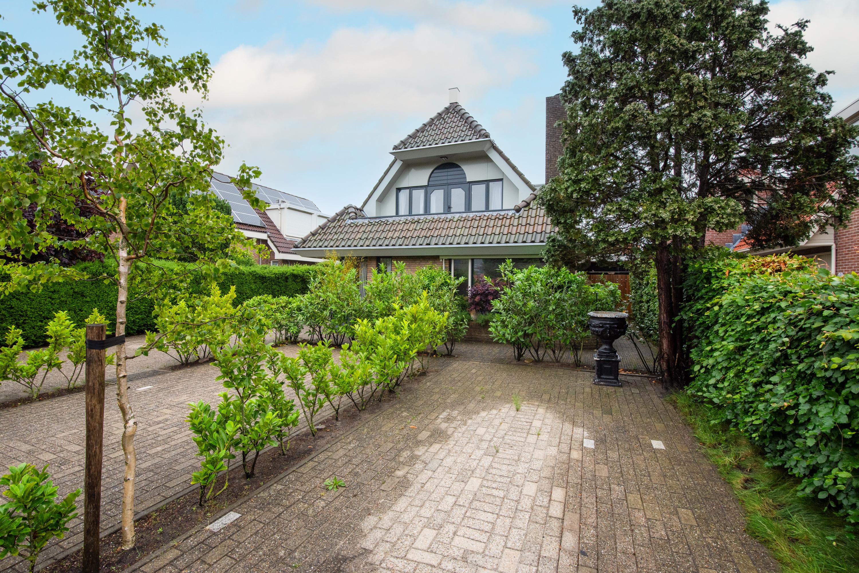 Begane grond: Via de verzorgde voortuin, waarbij je de mogelijkheid hebt om meerdere auto's op eigen terrein te parkeren, kom je binnen in een ruime entreehal met toilet, meterkast en de trap naar de eerste verdieping. Vanuit de hal heb je toegang tot de garage, waar zich ook de bergruimte met de opstelling van de CV-ketel bevindt. Verder is er toegang tot de keuken. De keuken is modern en ruim opgezet met een spoel-/kookeiland en van alle gemakken voorzien. Vanuit de keuken loop je door naar de ruime en lichte zit-, eet- en woonkamer, mede dankzij de vele raampartijen. Aan de achterzijde grenst de begane grond aan een royale tuin met een zonneterras. De diepe tuin is deels betegeld en beschikt over meerdere zitplekken, waaronder een gezellig terras aan het water. In de tuin bevinden zich een ruime berging en een tuinhuis met woon-/slaapkamergedeelte en keukenblok, multifunctioneel in te zetten als aanleunwoning, werkplaats, atelier of praktijkruimte.