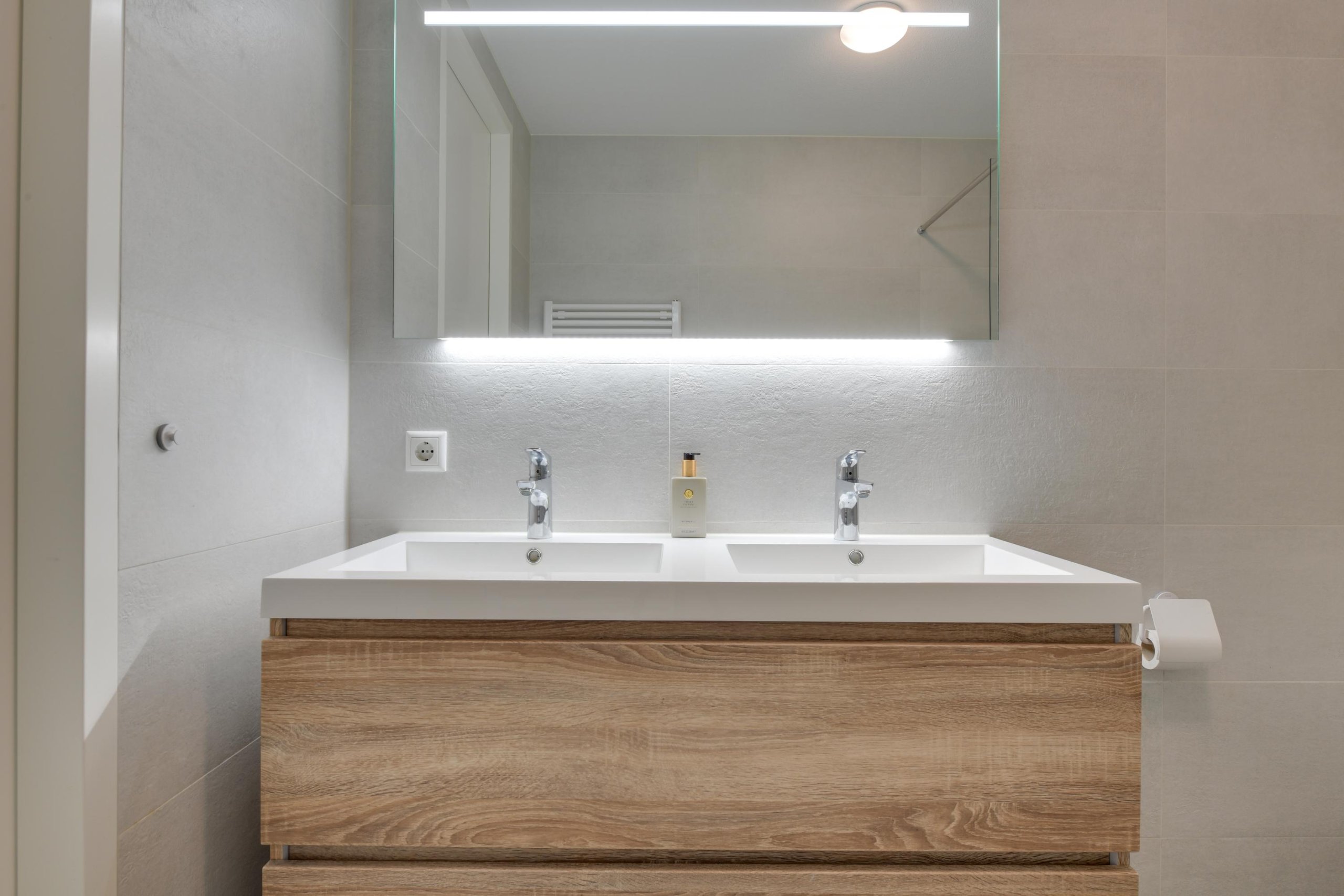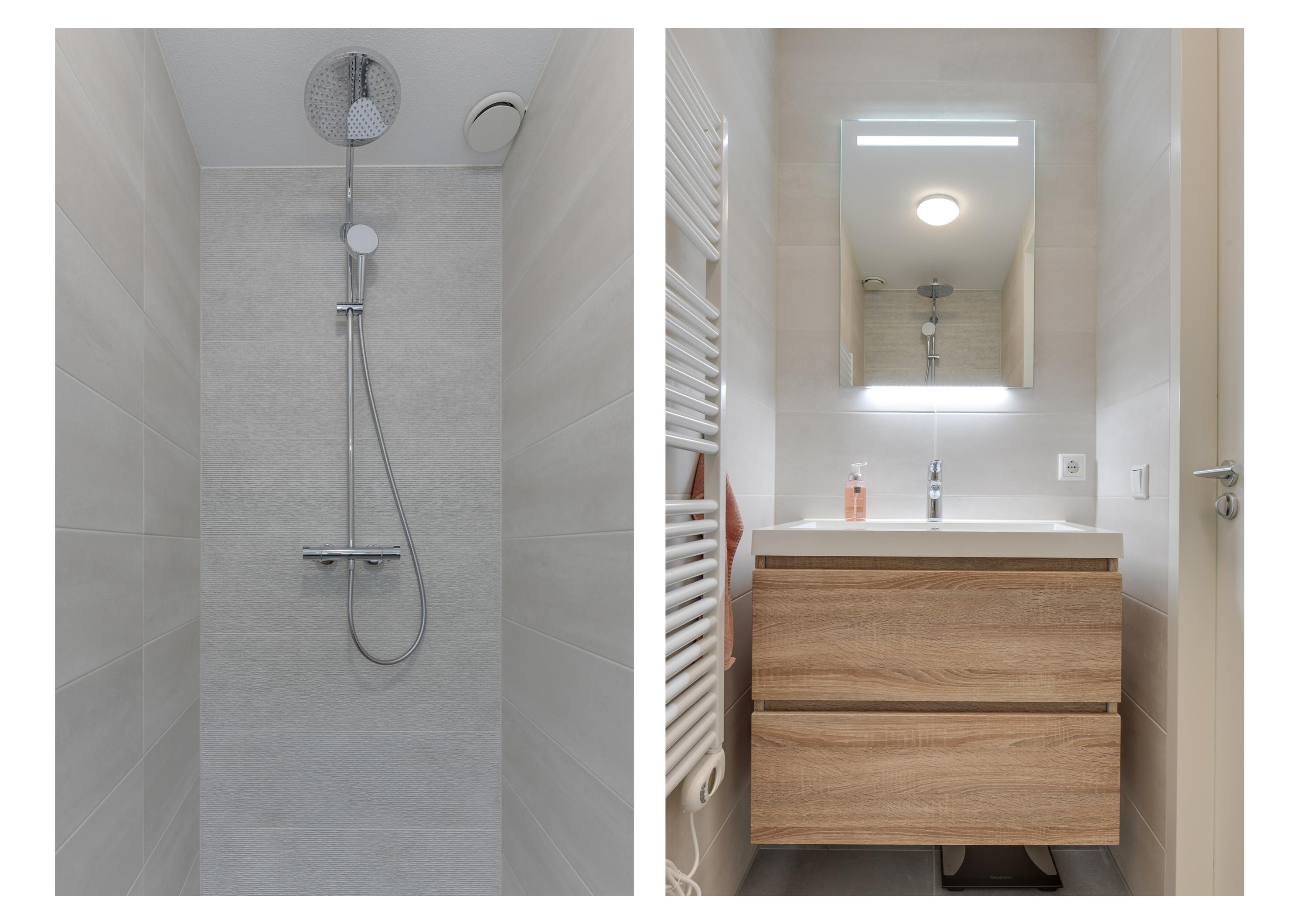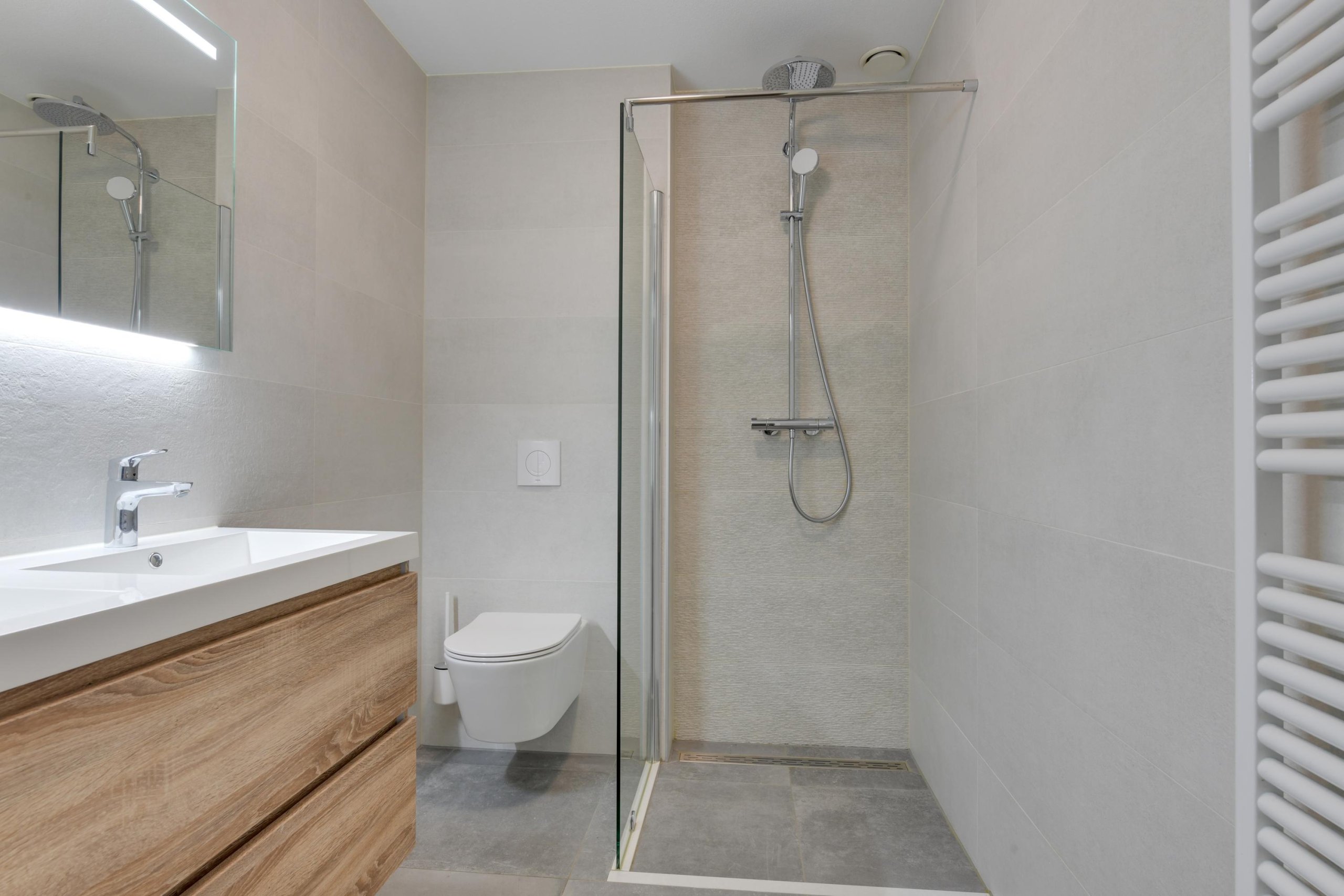 Via de woonkamer stap je het riante zonneterras op, dat over de volledige breedte van het appartement loopt. Dankzij de overkapping kun je hier bijna het hele jaar door genieten van een ontspannen buitenleven. Het appartement beschikt over twee ruime slaapkamers, beide voorzien van een eigen moderne badkamer met een inloopdouche en wastafel. Hierdoor geniet je van optimale privacy en comfort. Daarnaast is er een separate toiletruimte en een aparte ruimte voor de wasmachine, droger en waterontharder.