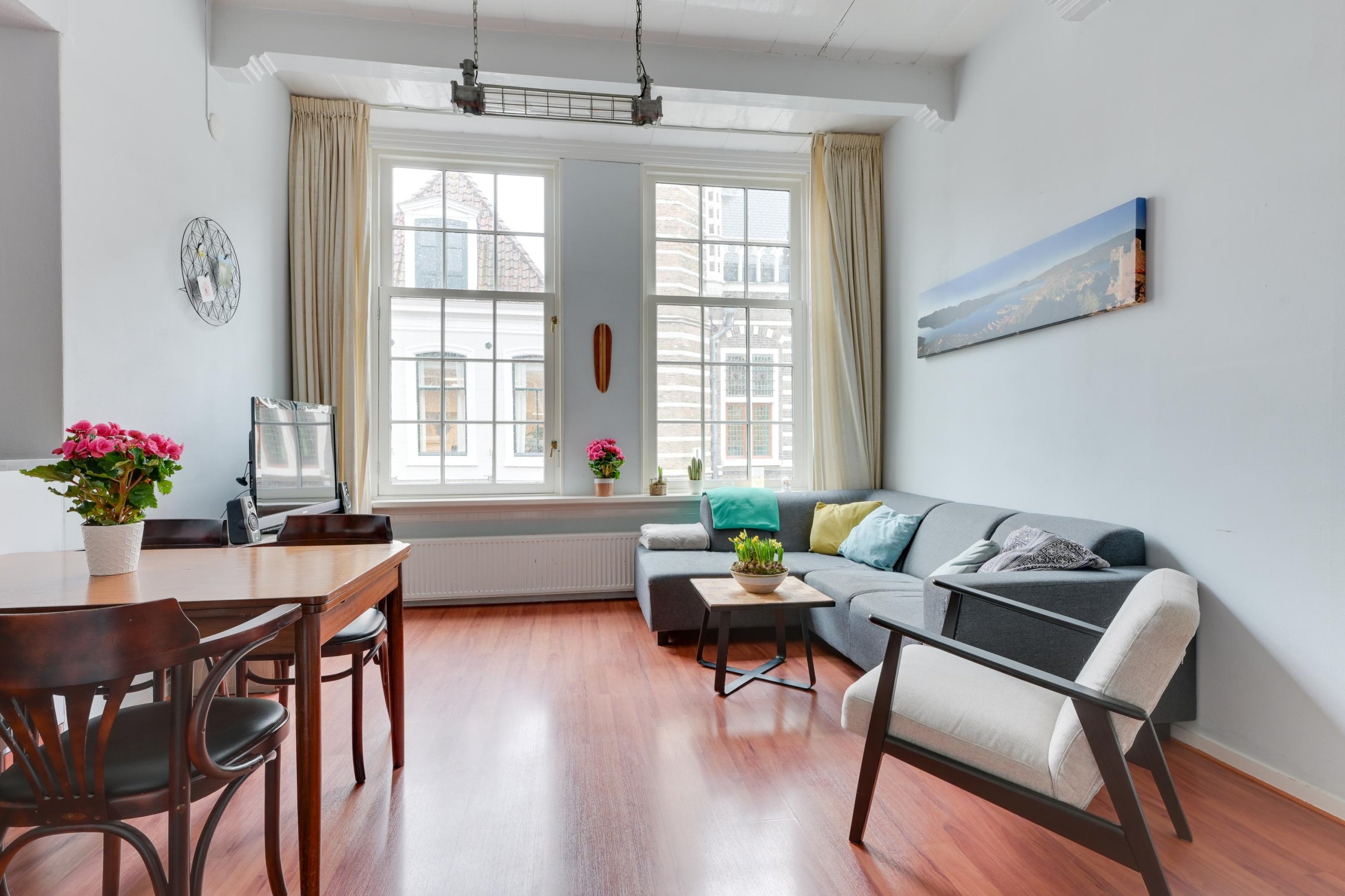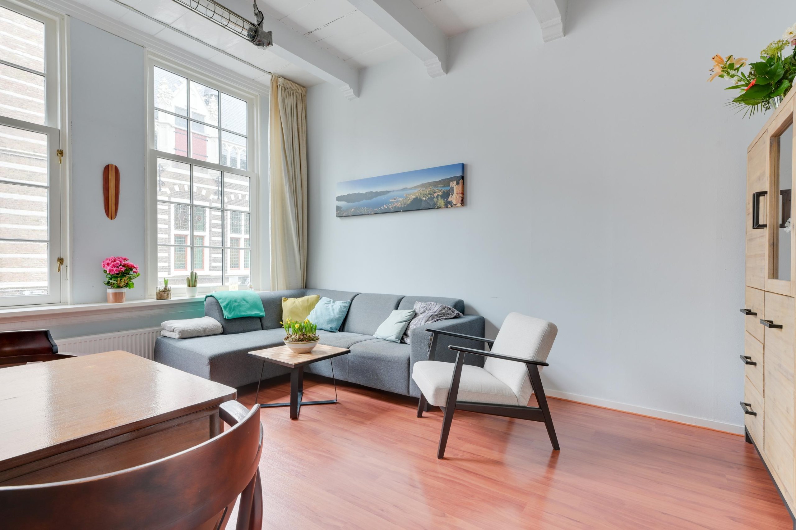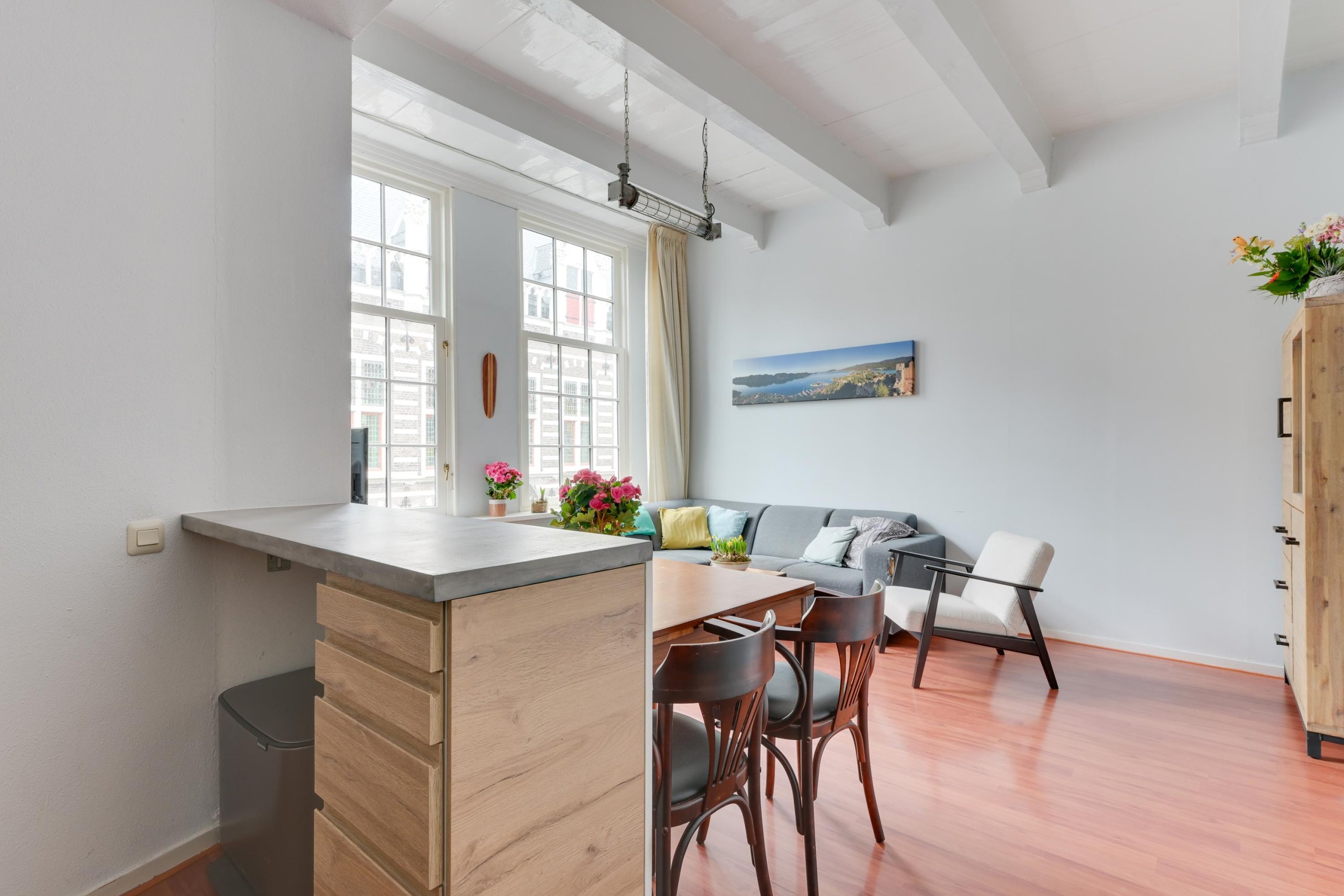 De woonkamer is sfeervol en licht, met karakteristieke details zoals het balkenplafond en uitzicht over de Langestraat. De woonkamer is voorzien van nieuwe ramen met HR++ glas.