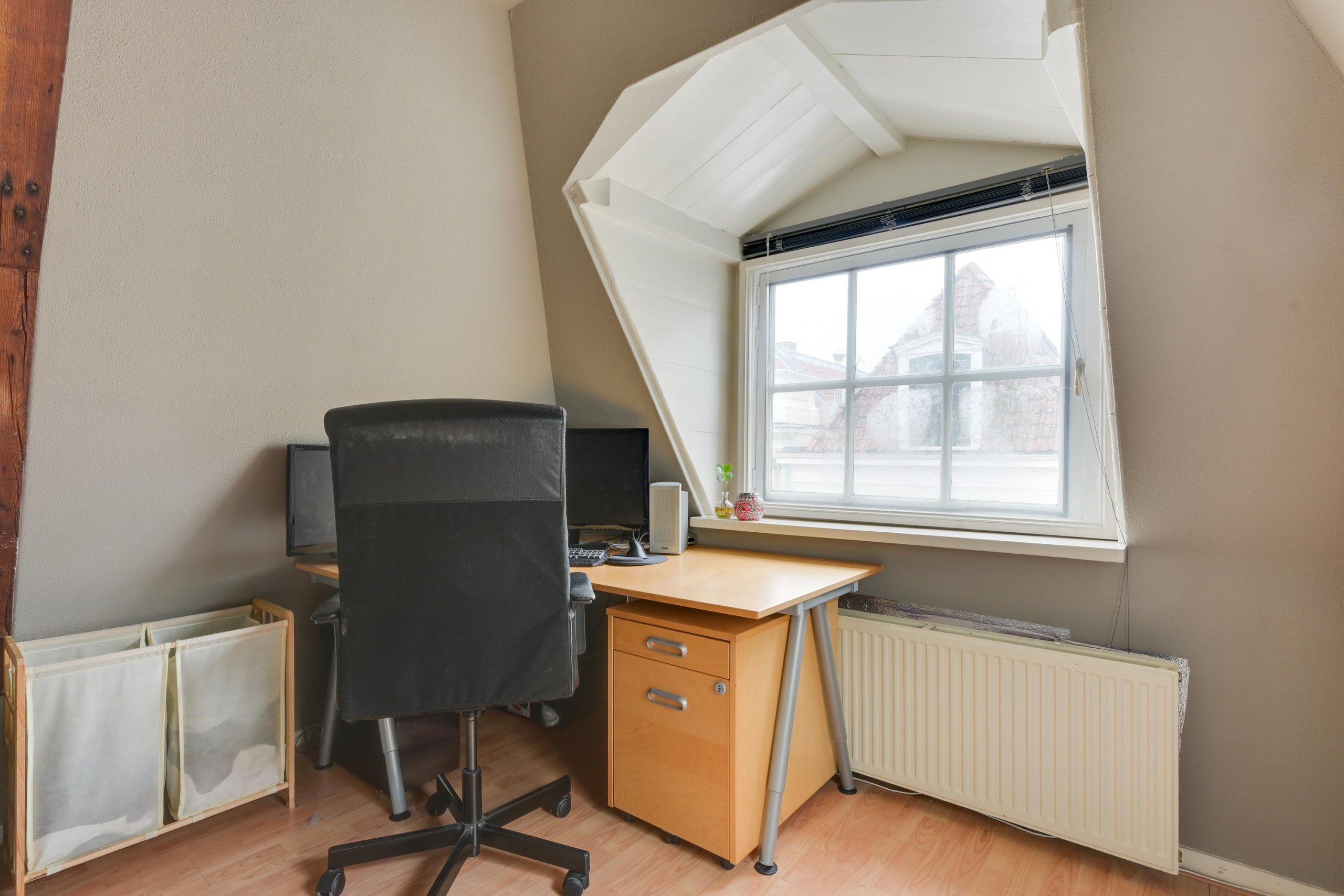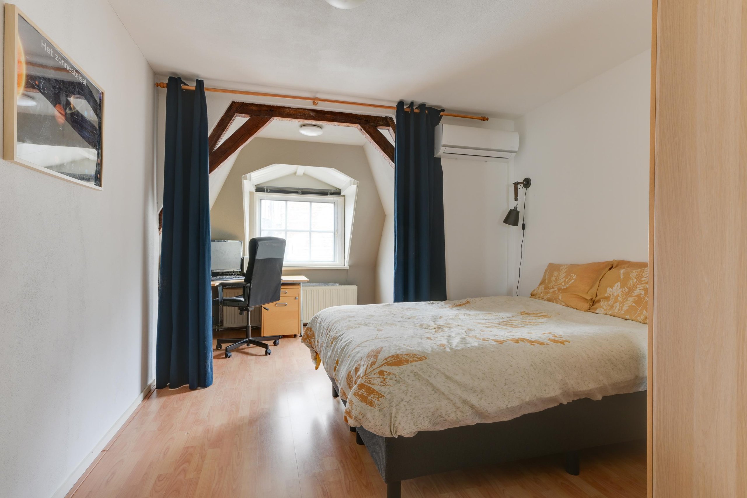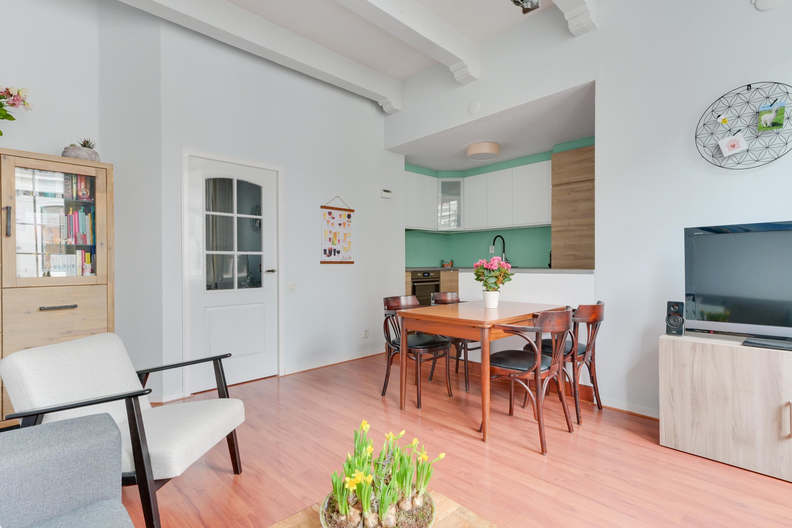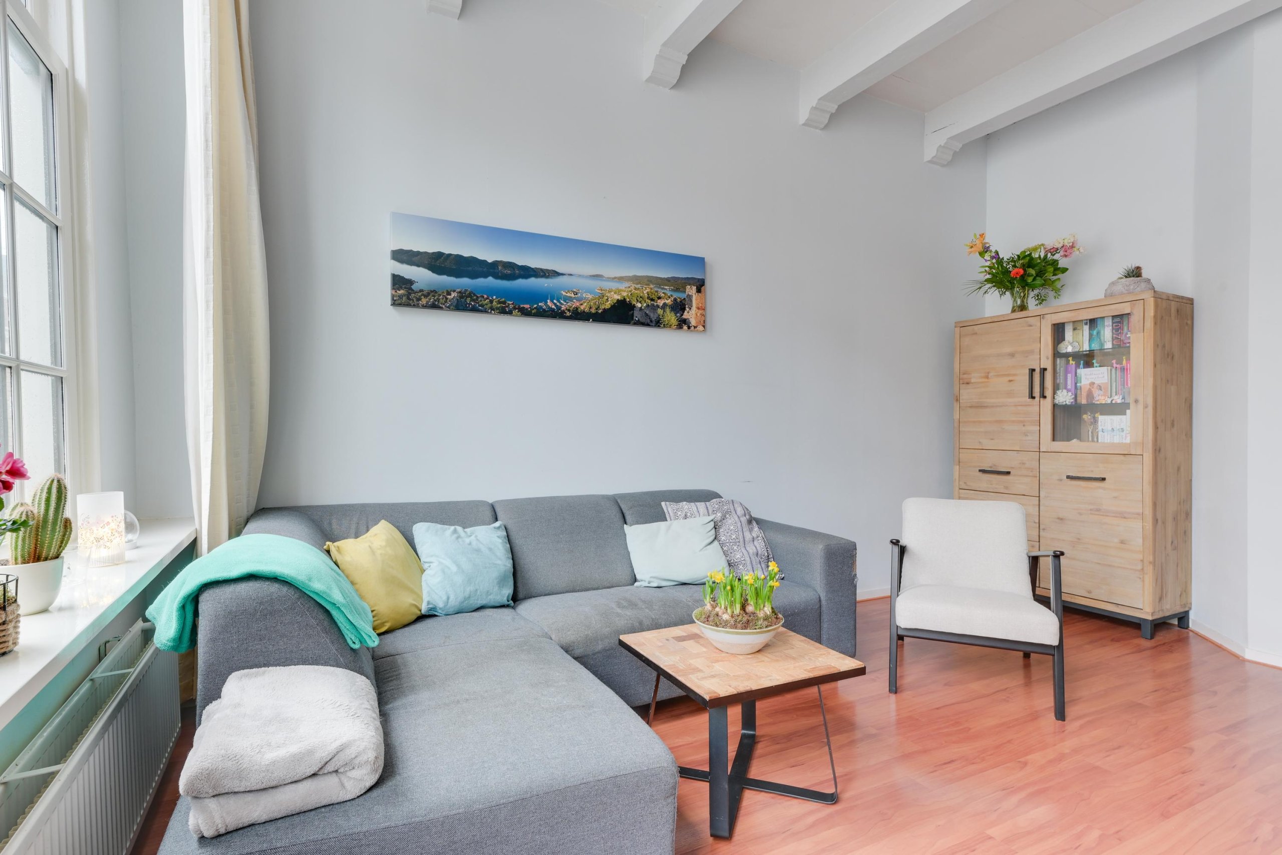 De woonkamer is sfeervol en licht, met karakteristieke details zoals het balkenplafond en uitzicht over de Langestraat. De woonkamer is voorzien van nieuwe ramen met HR++ glas.