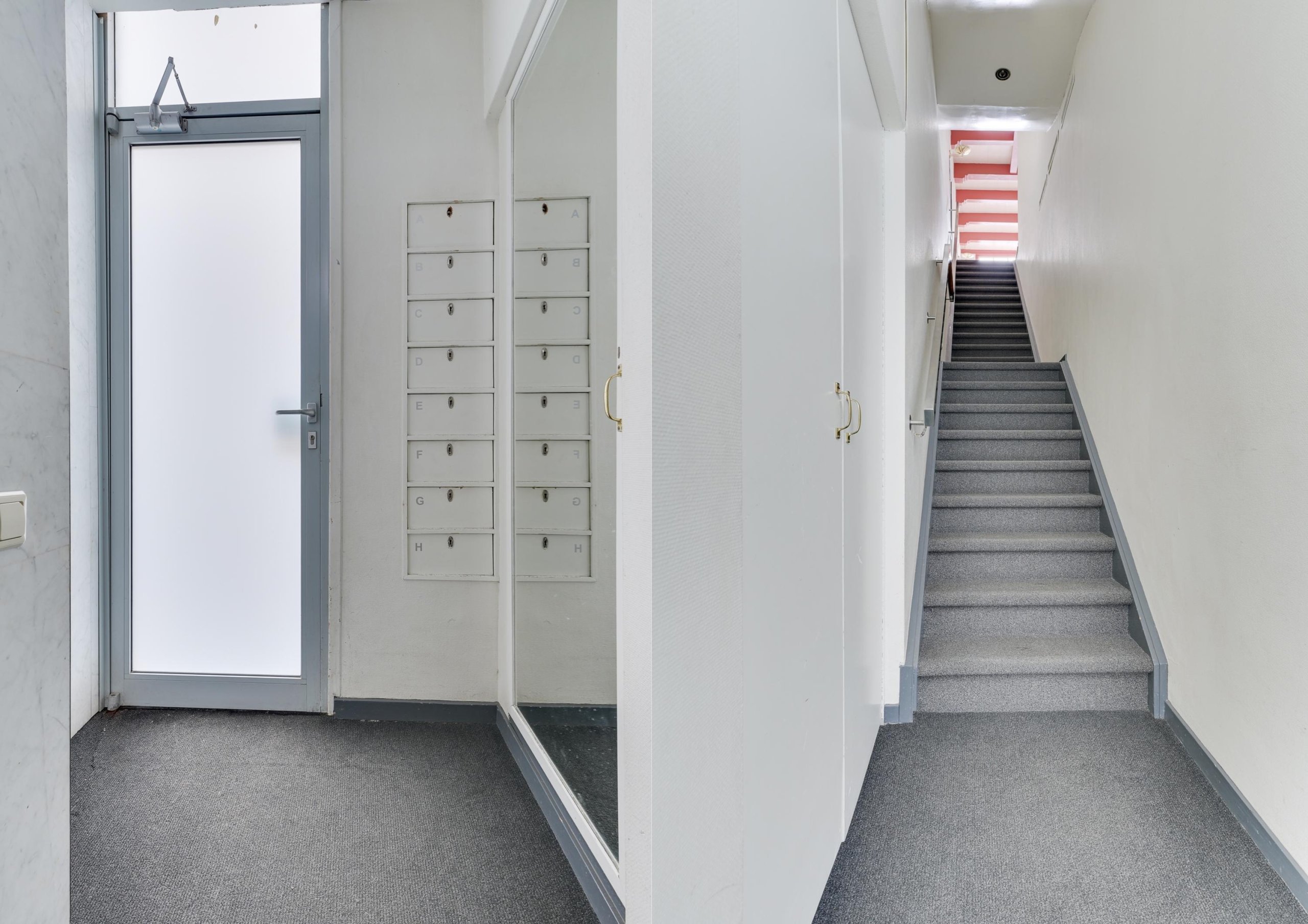 Centrale entree met brievenbussen en trapopgang naar de appartementen.