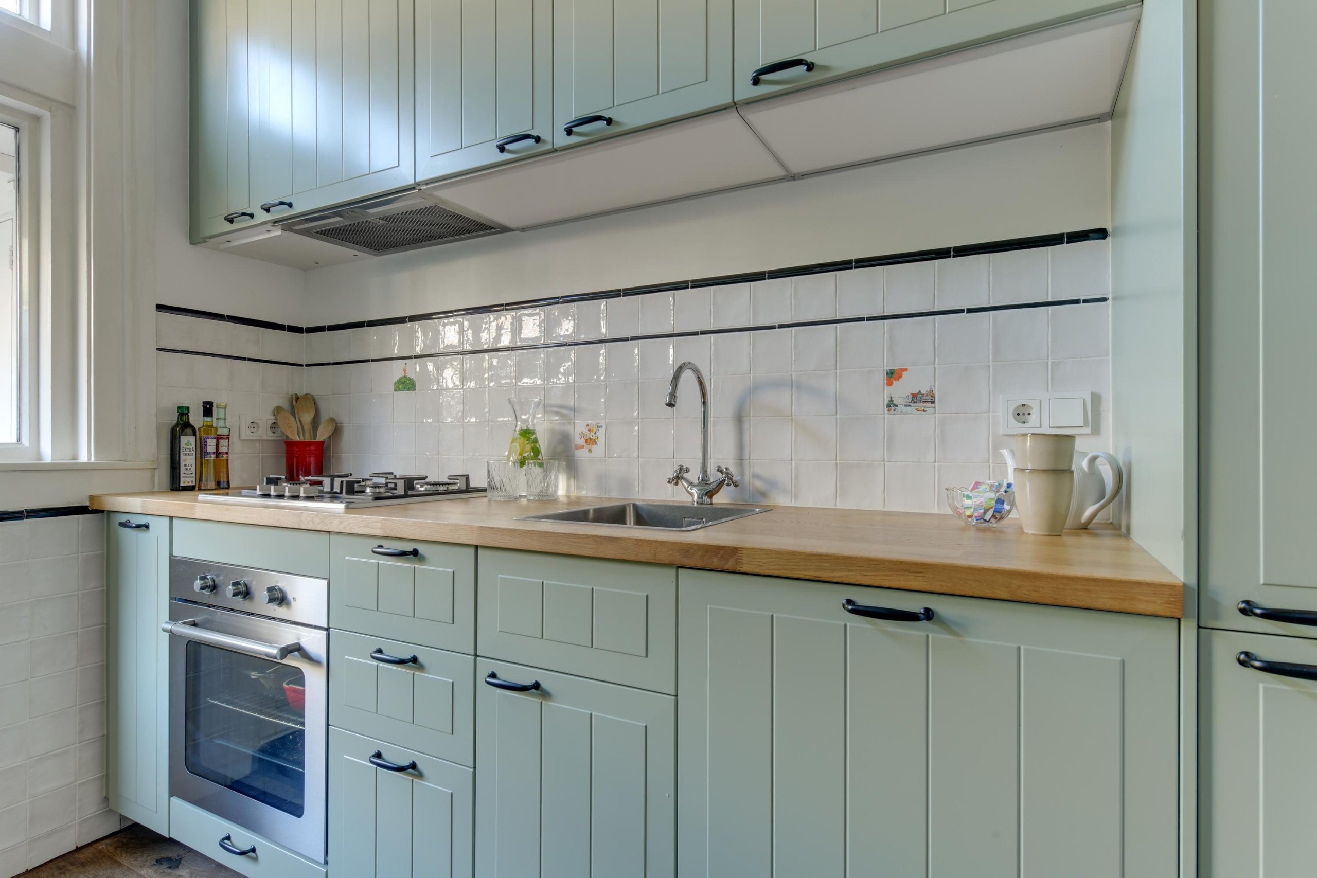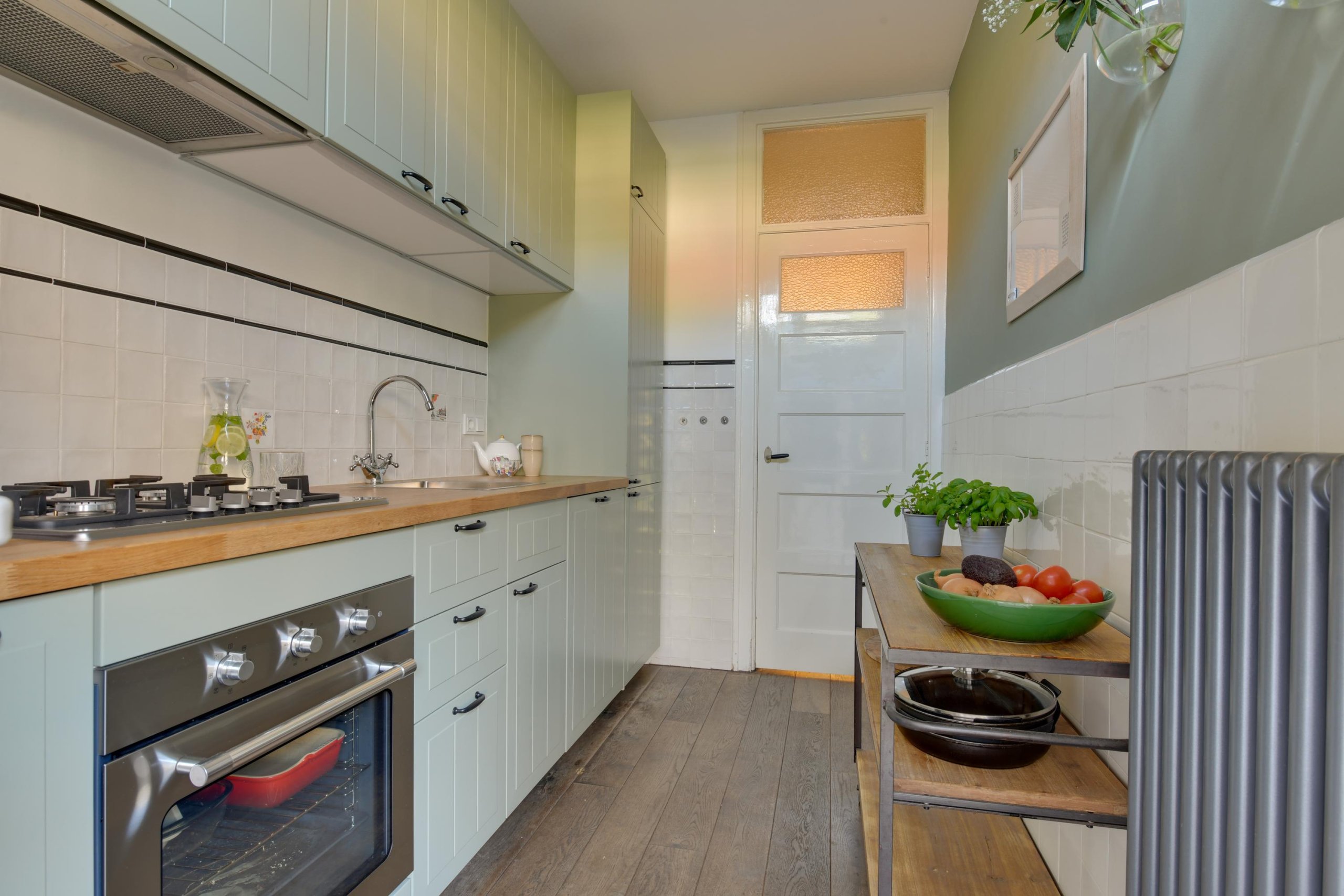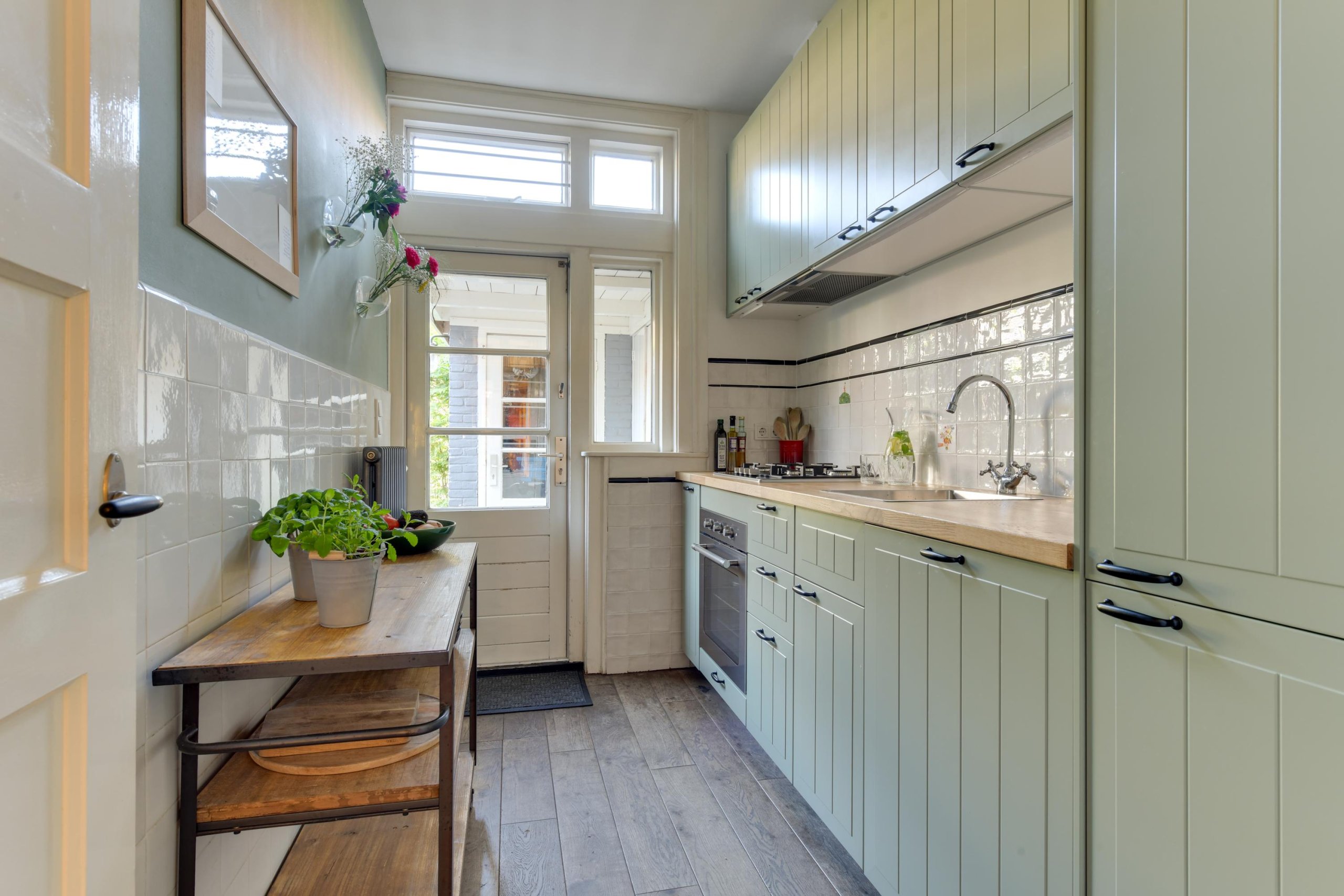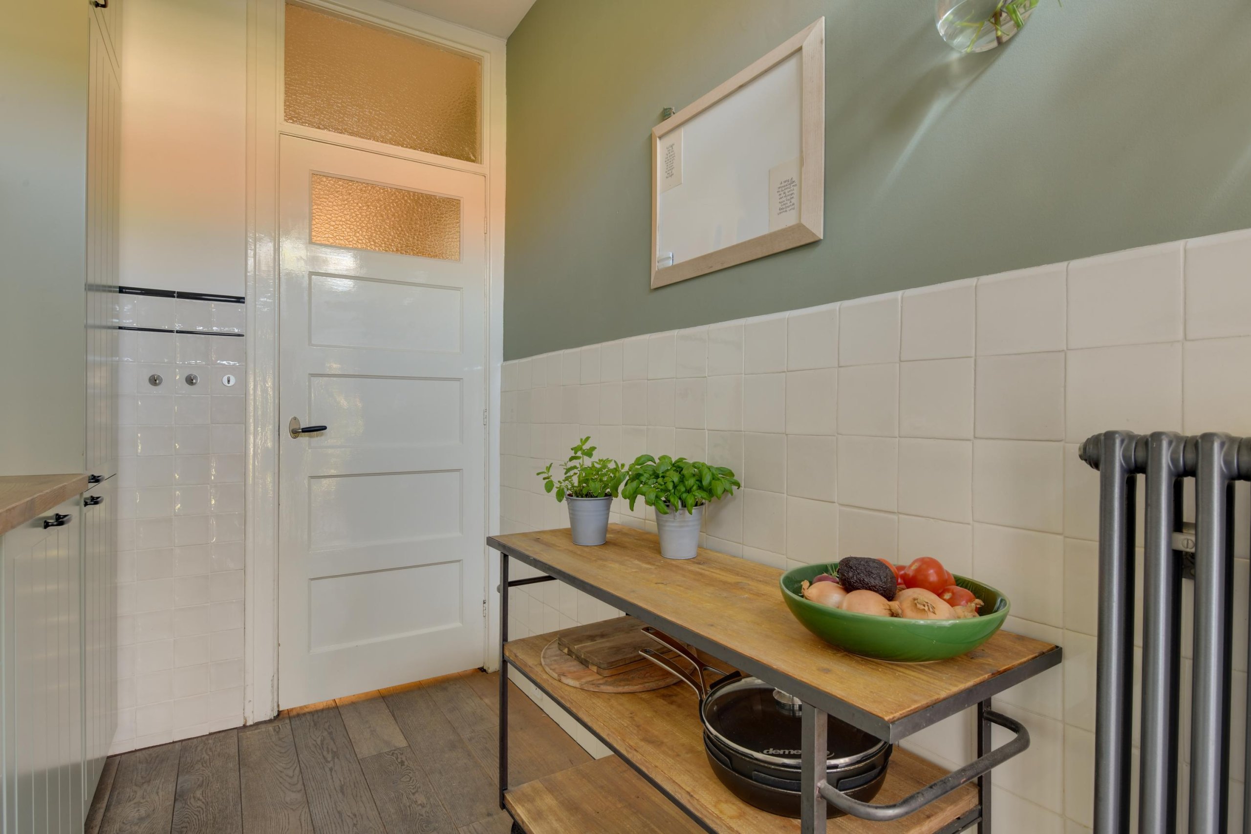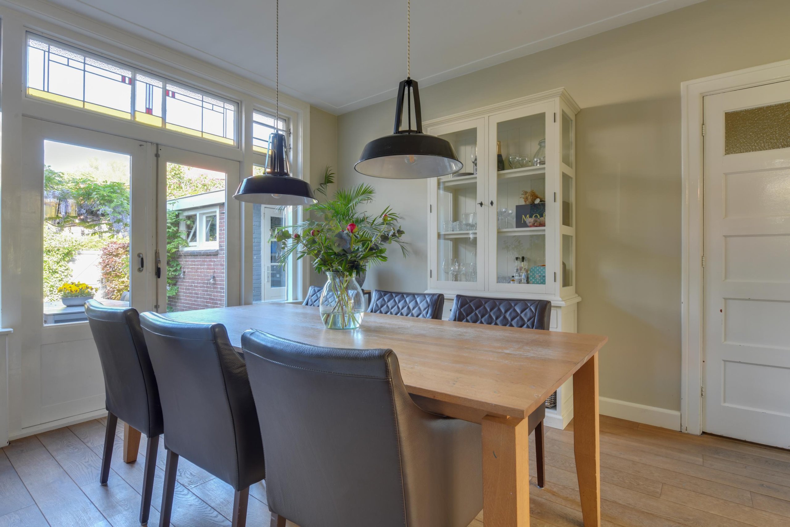 In de eetkamer tref je de dubbele deuren naar de achtertuin. Het prachtige kozijn is voorzien van glas-in-lood met aan de buitenzijde een zonnescherm. De besloten keuken is medio 2024 volledig vernieuwd en voorzien van moderne inbouwapparatuur. Middels de loopdeur in de keuken bereik je de achtertuin.