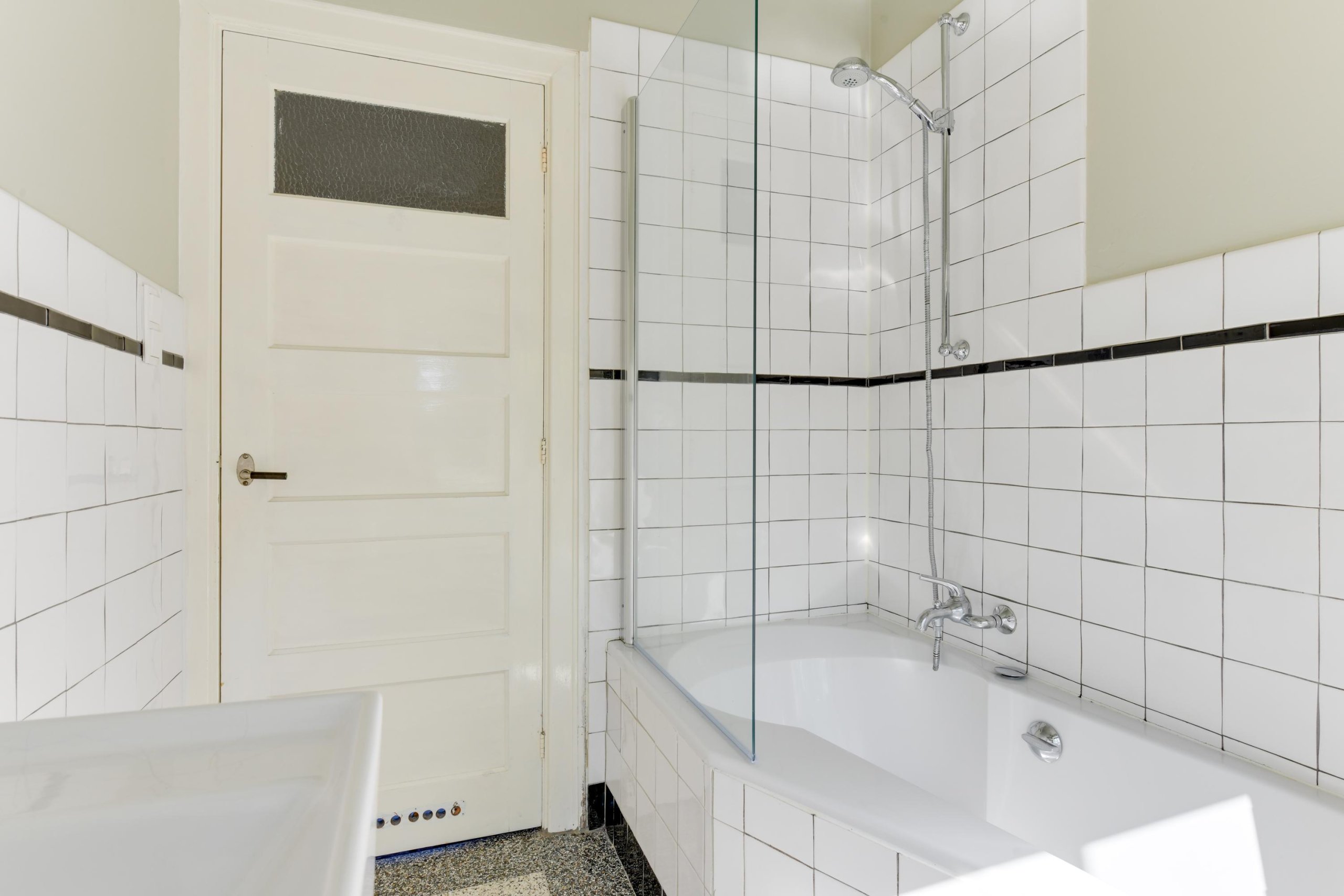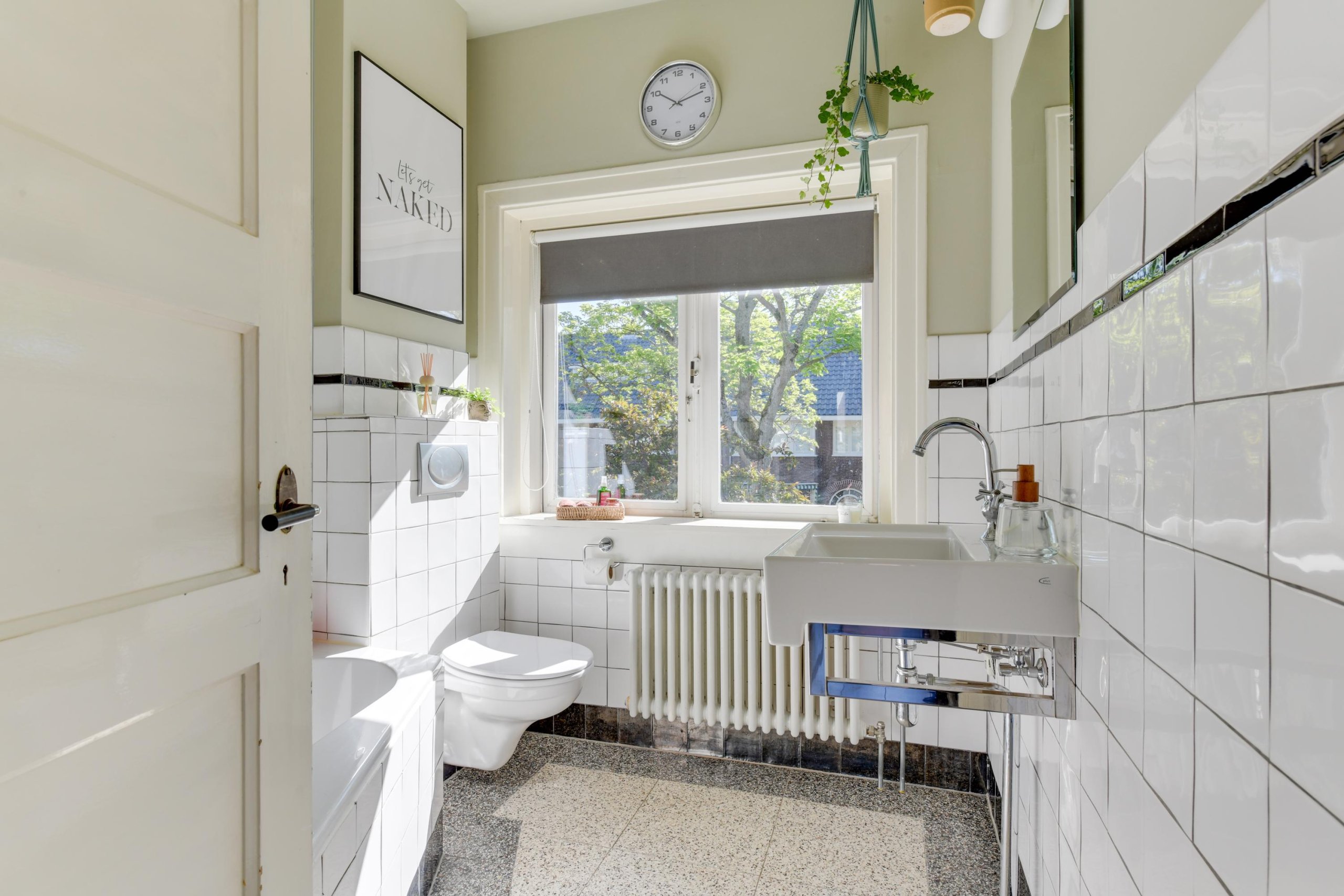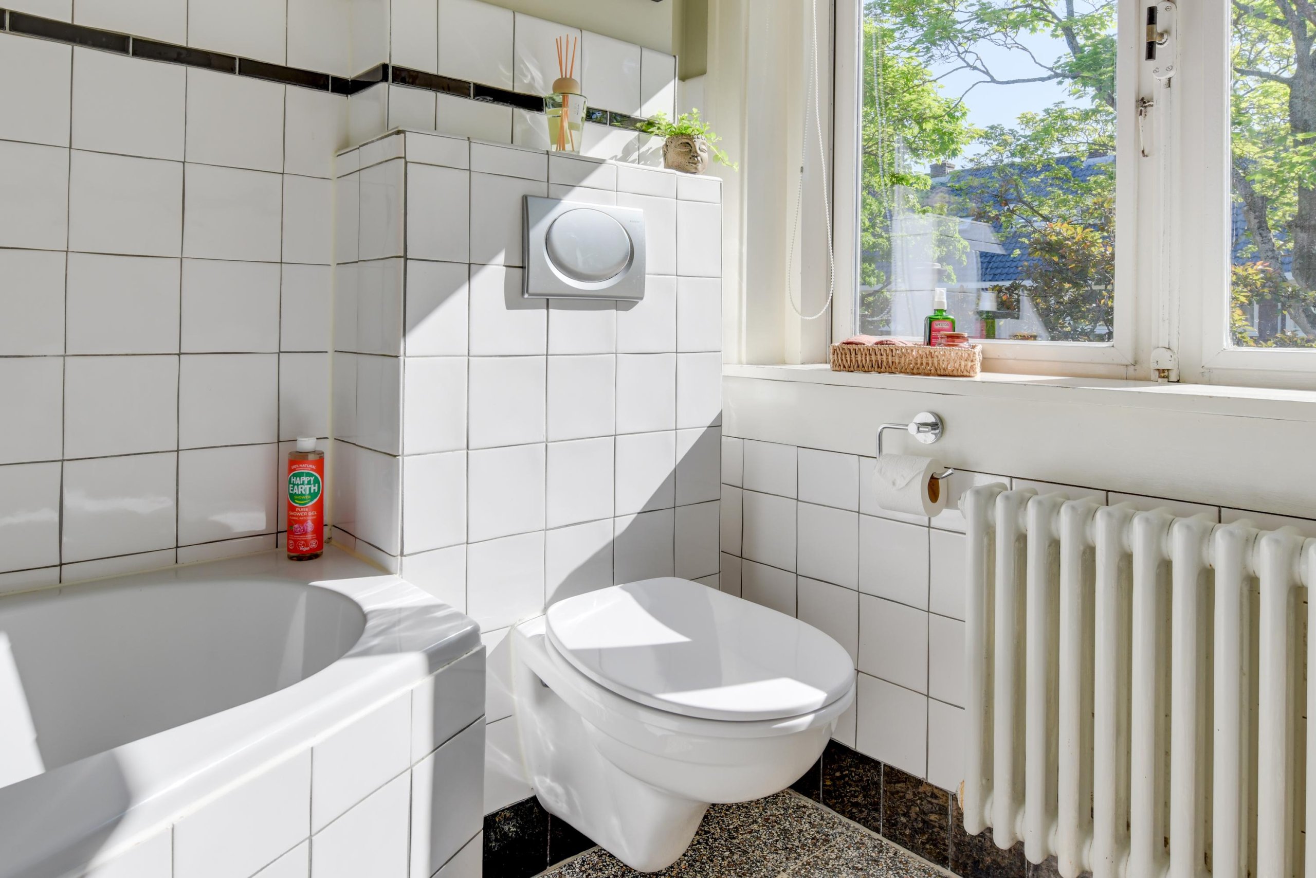 - Fraaie lichte badkamer met ligbad/douche, wastafel en toilet