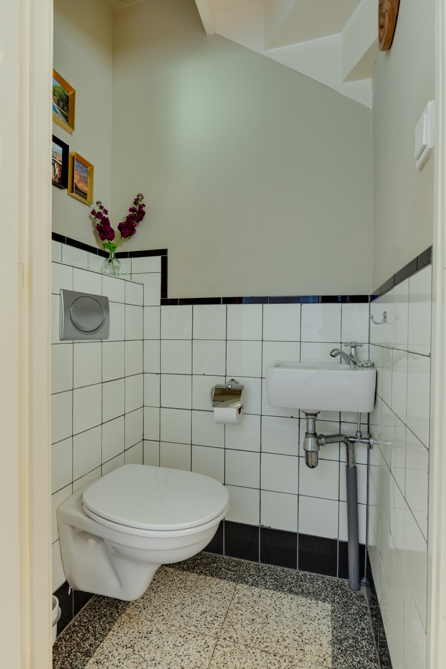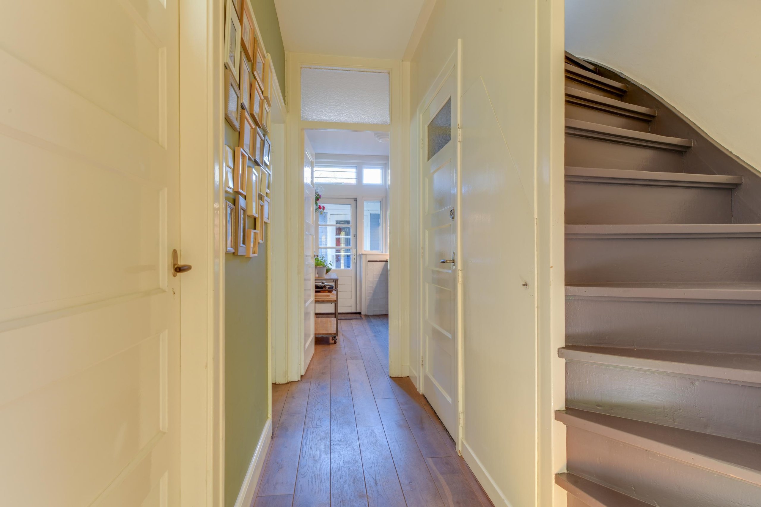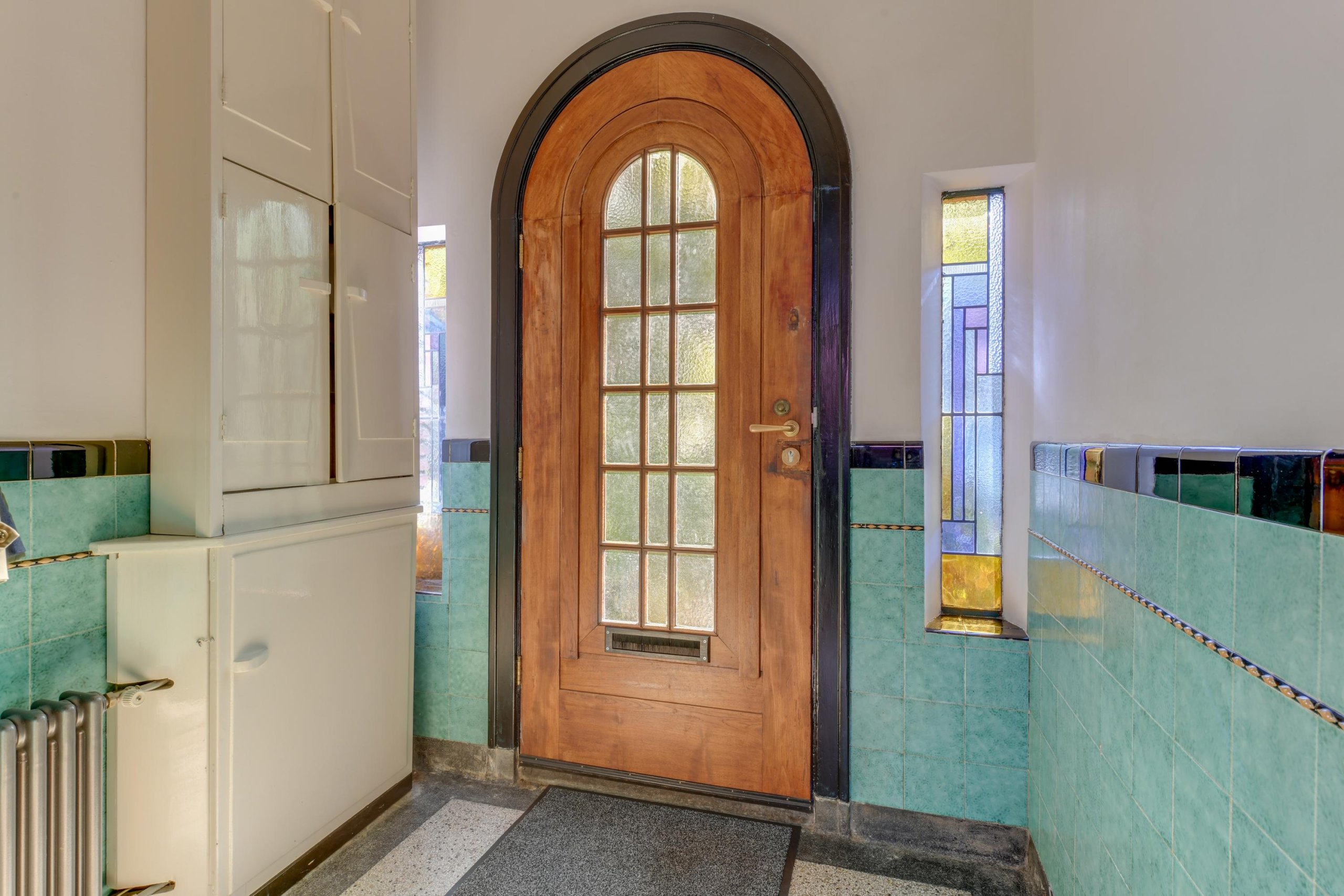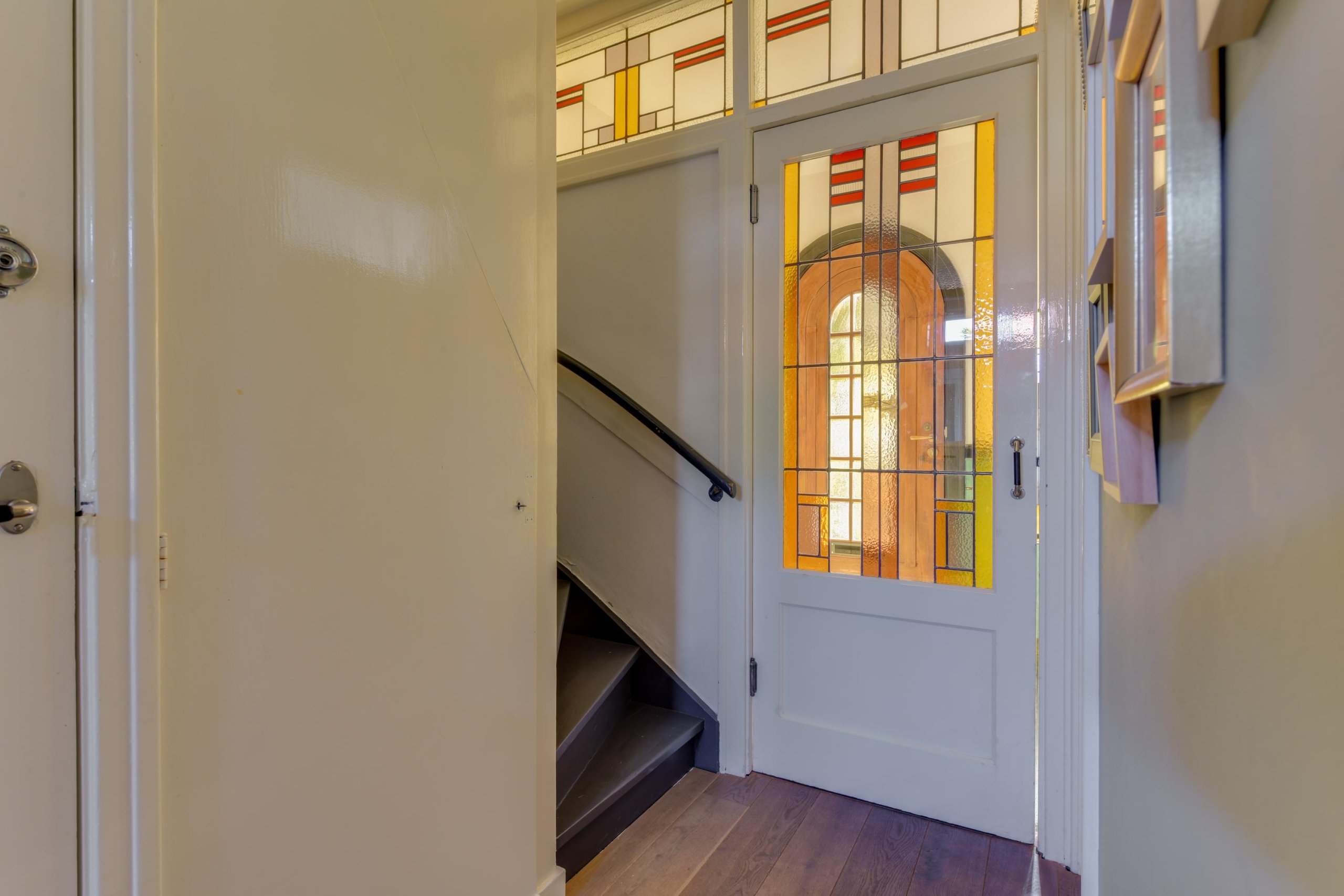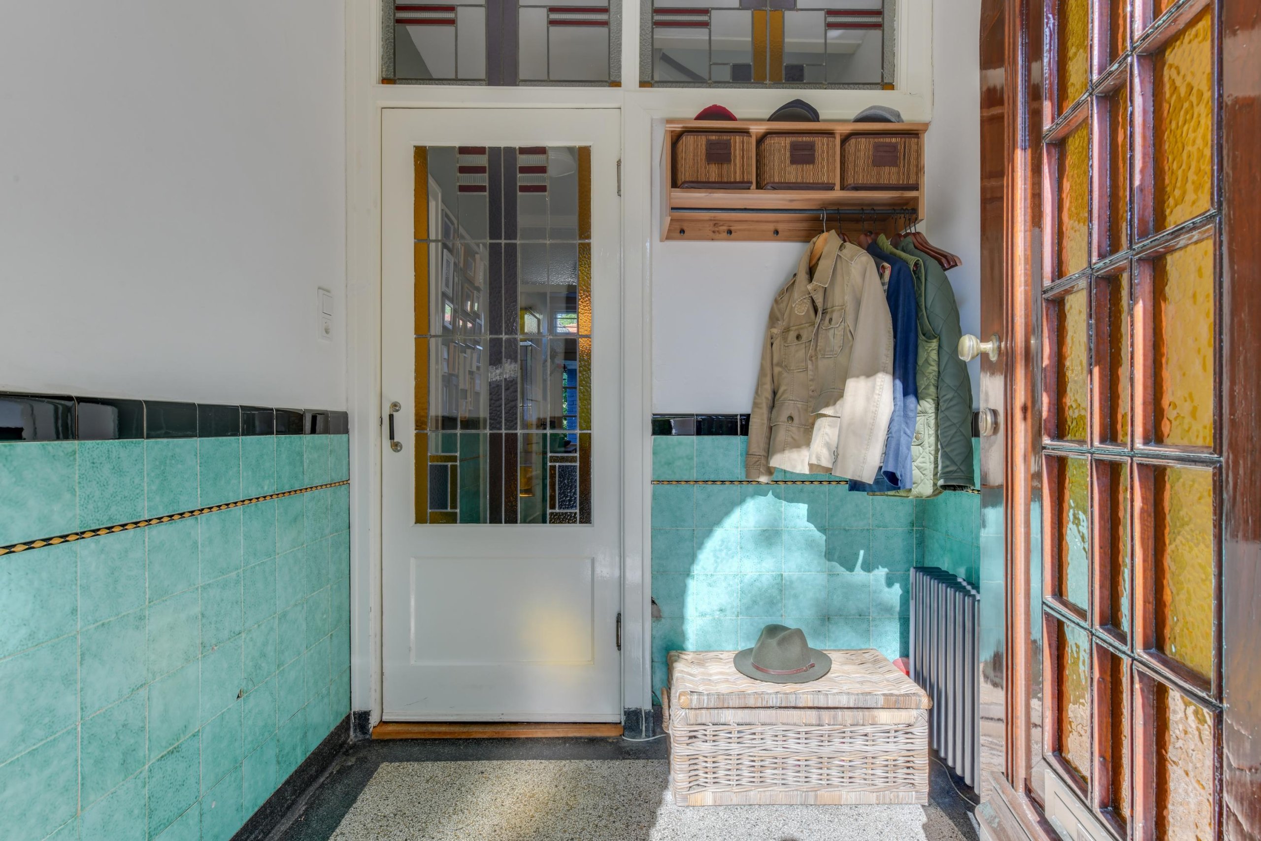 Via de voortuin en de statige entree met glas-in-loodramen bereik je de vestibule inclusief origineel tegelwerk met garderoberuimte, meterkast en een glas-in-lood taatsdeur naar de hal. Daar vinden we de trapopgang naar de eerste verdieping, een praktische kelderkast, het toilet en toegang tot het woongedeelte en de keuken.