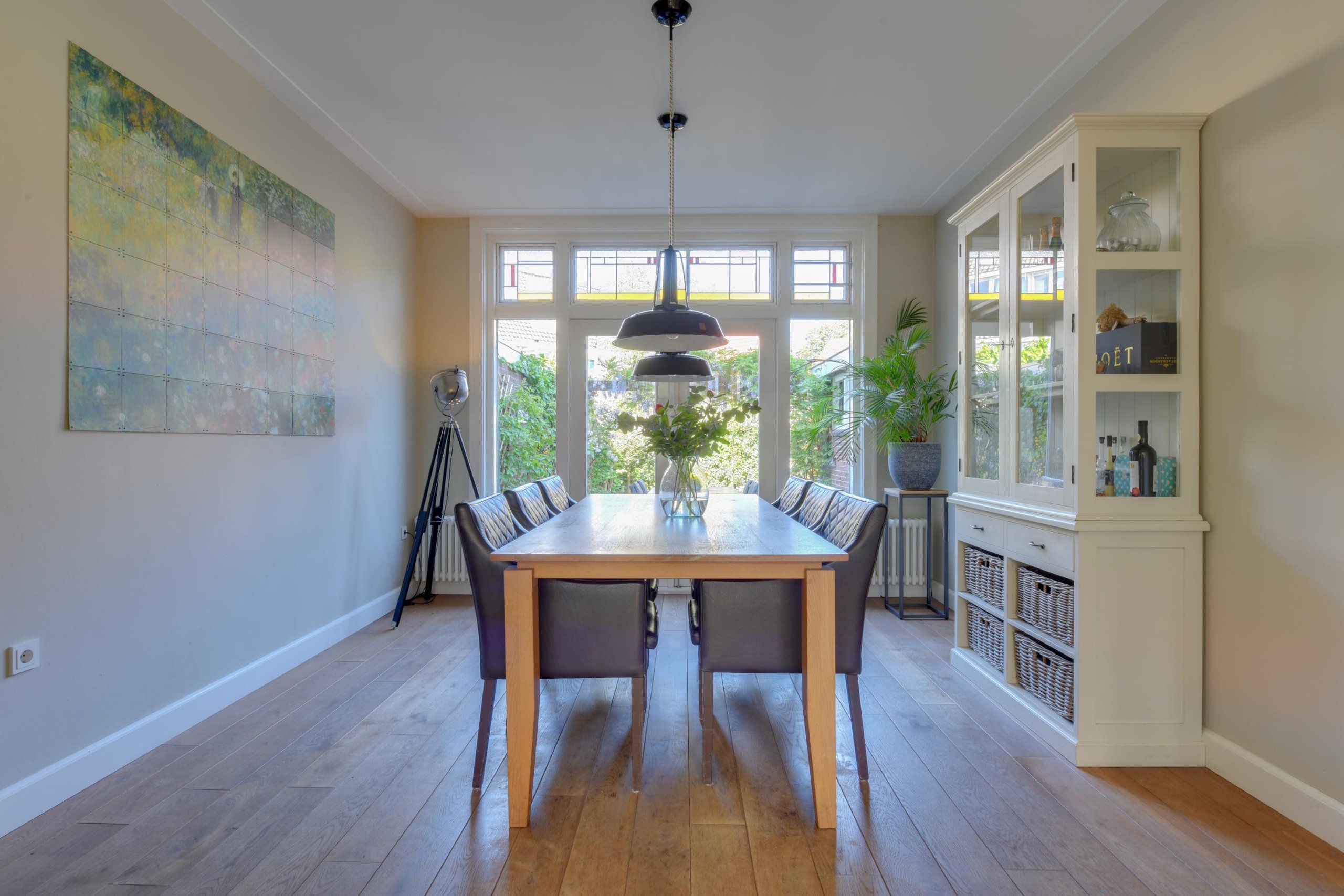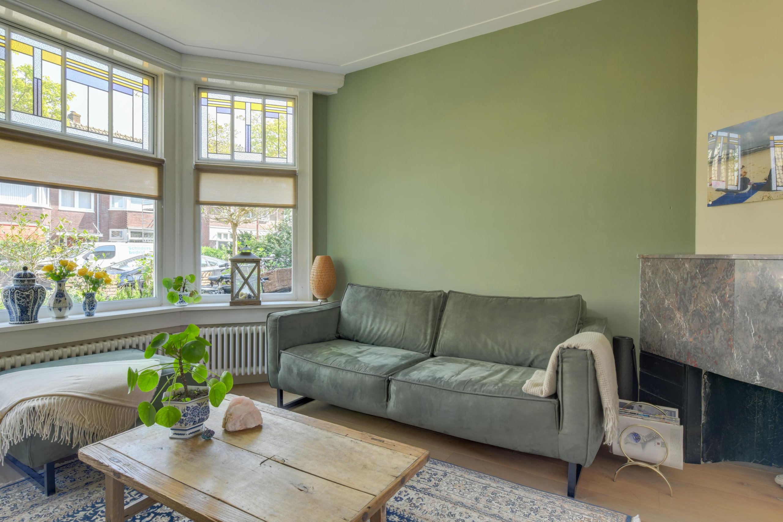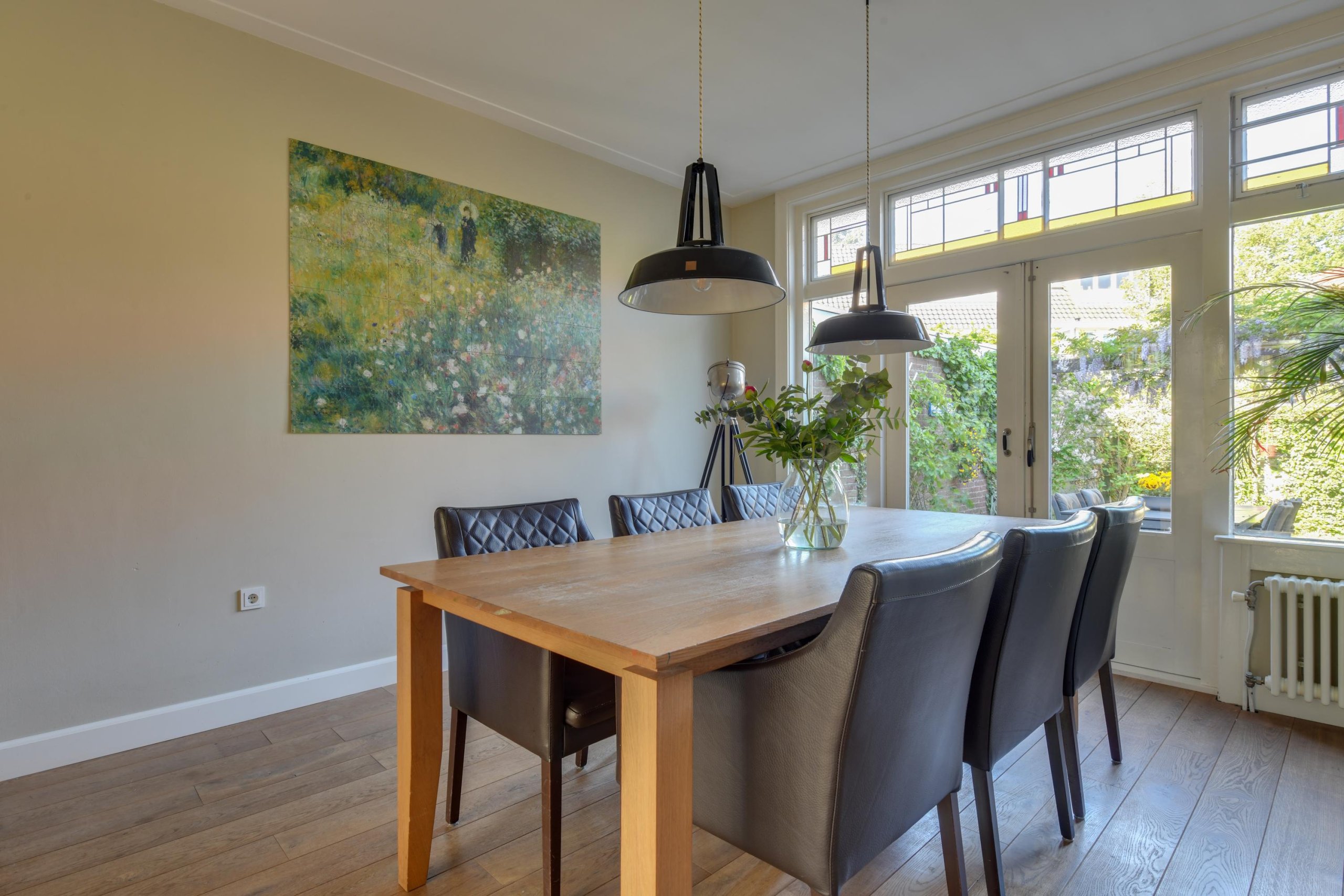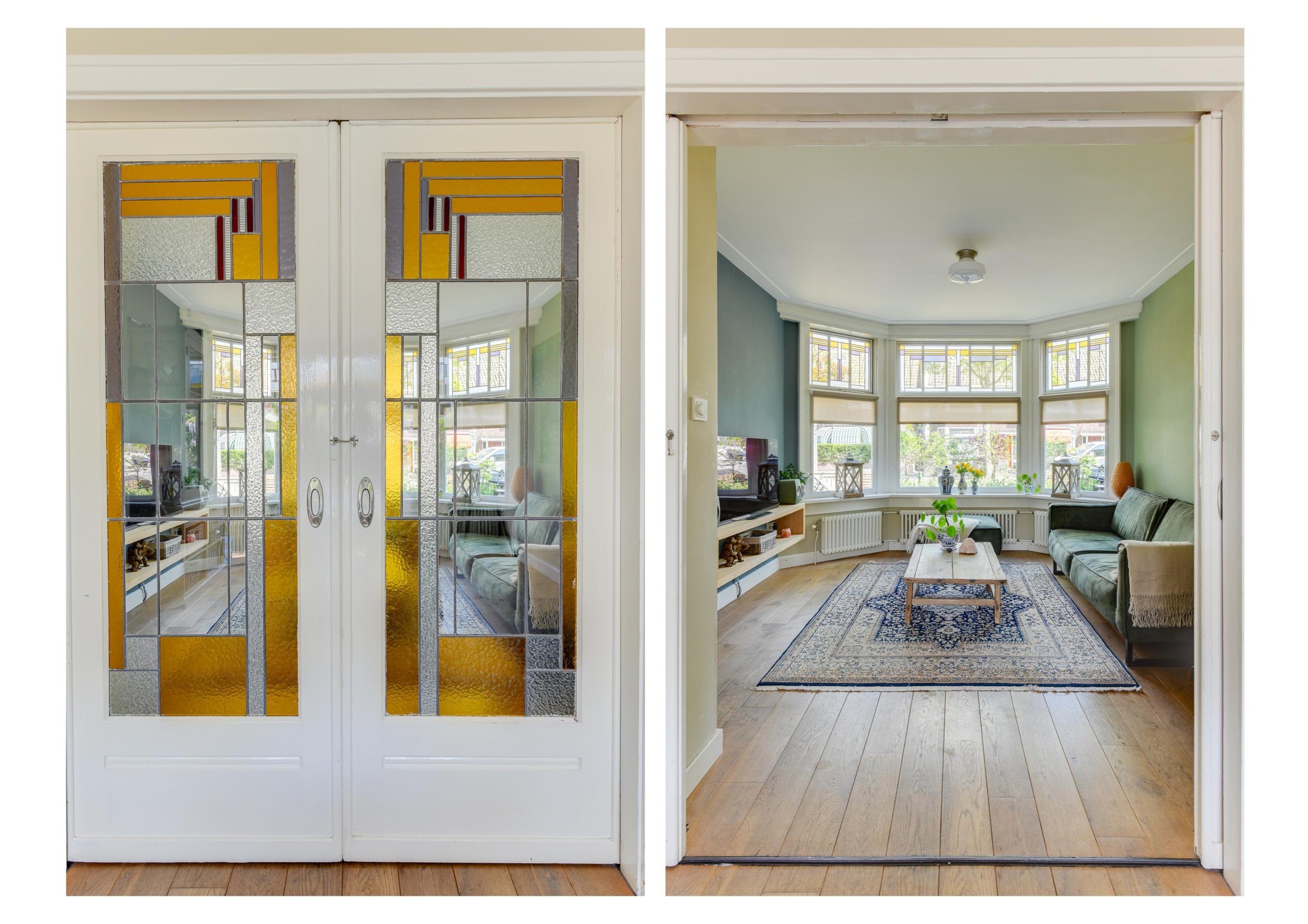 - Ruime en sfeervolle woonkamer met originele glas-in-lood en-suitedeuren