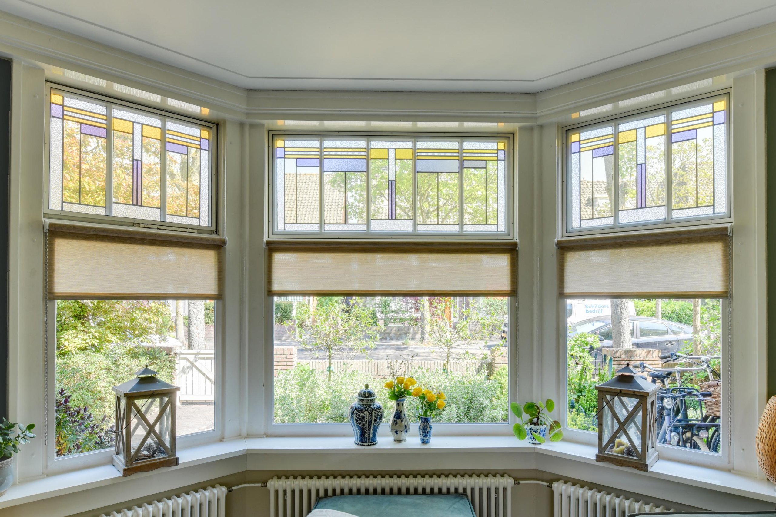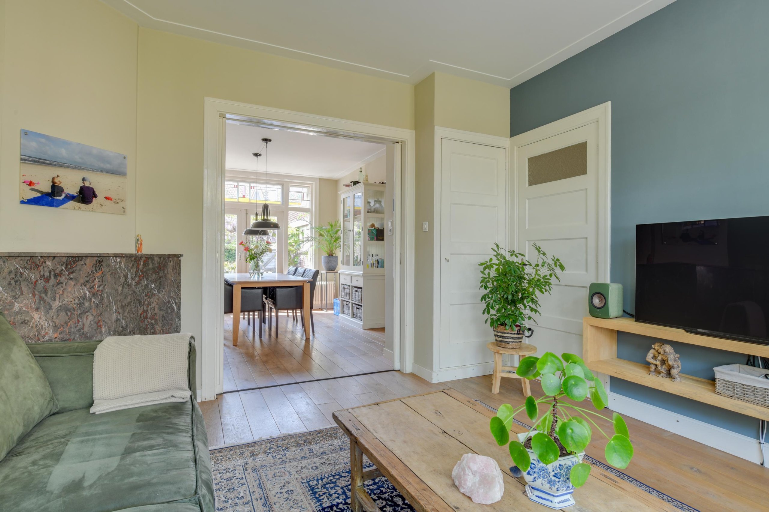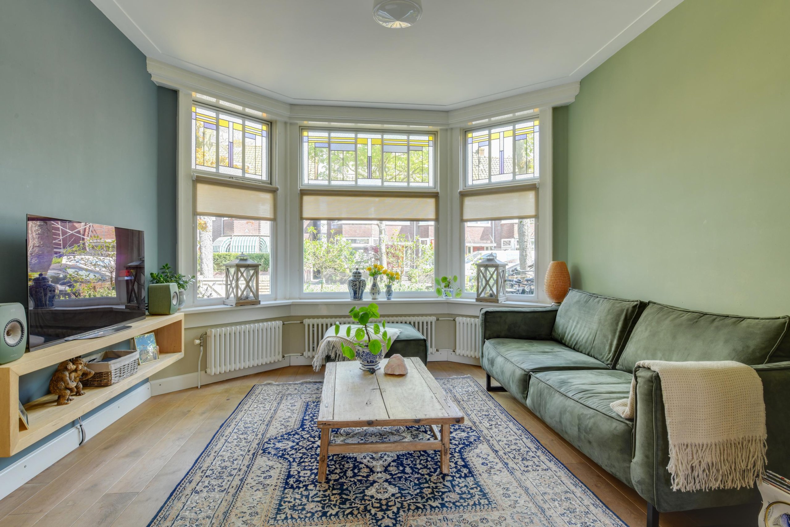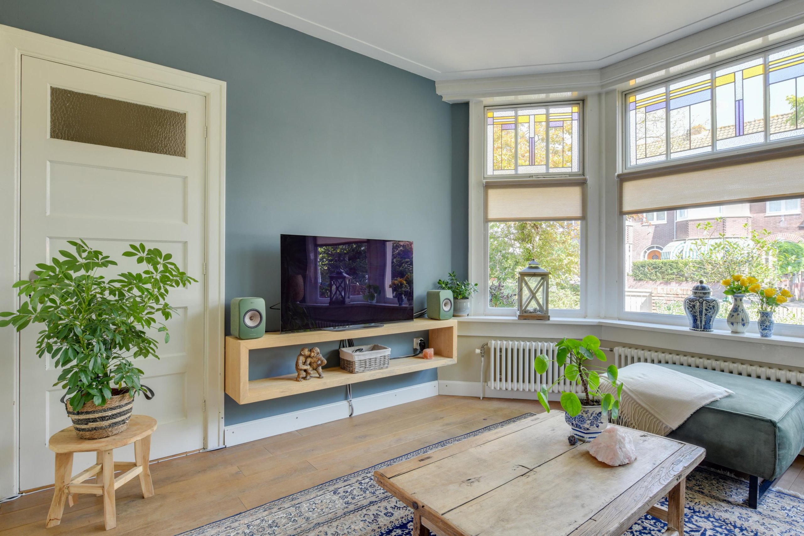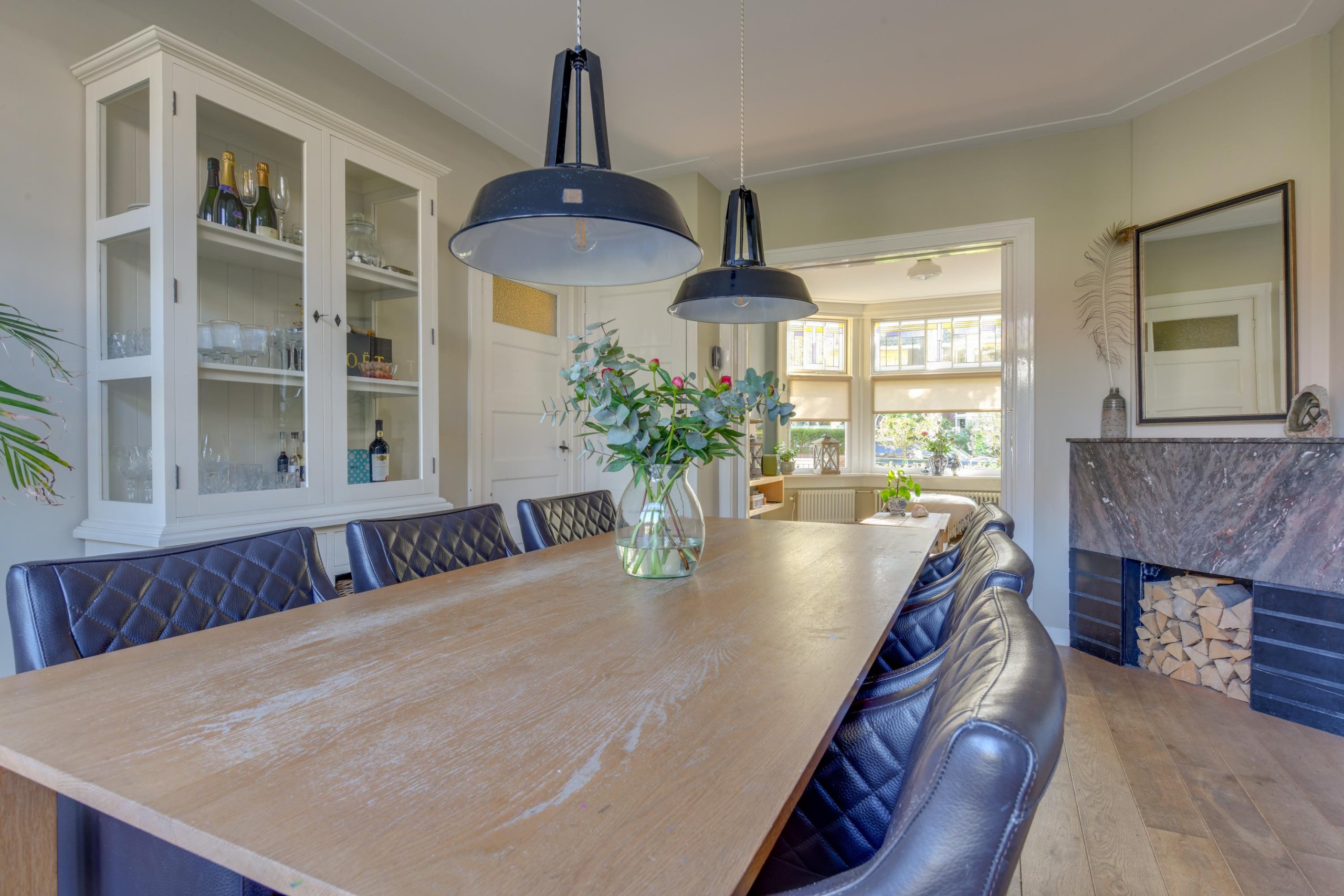 - Ruime en sfeervolle woonkamer met originele glas-in-lood en-suitedeuren