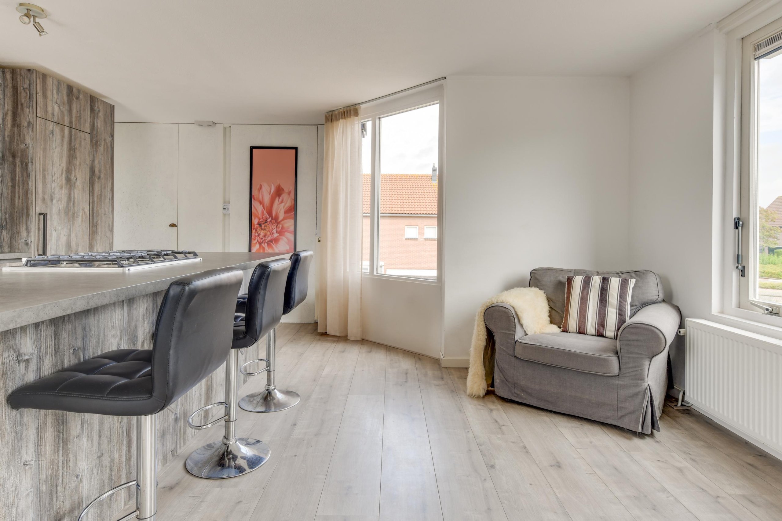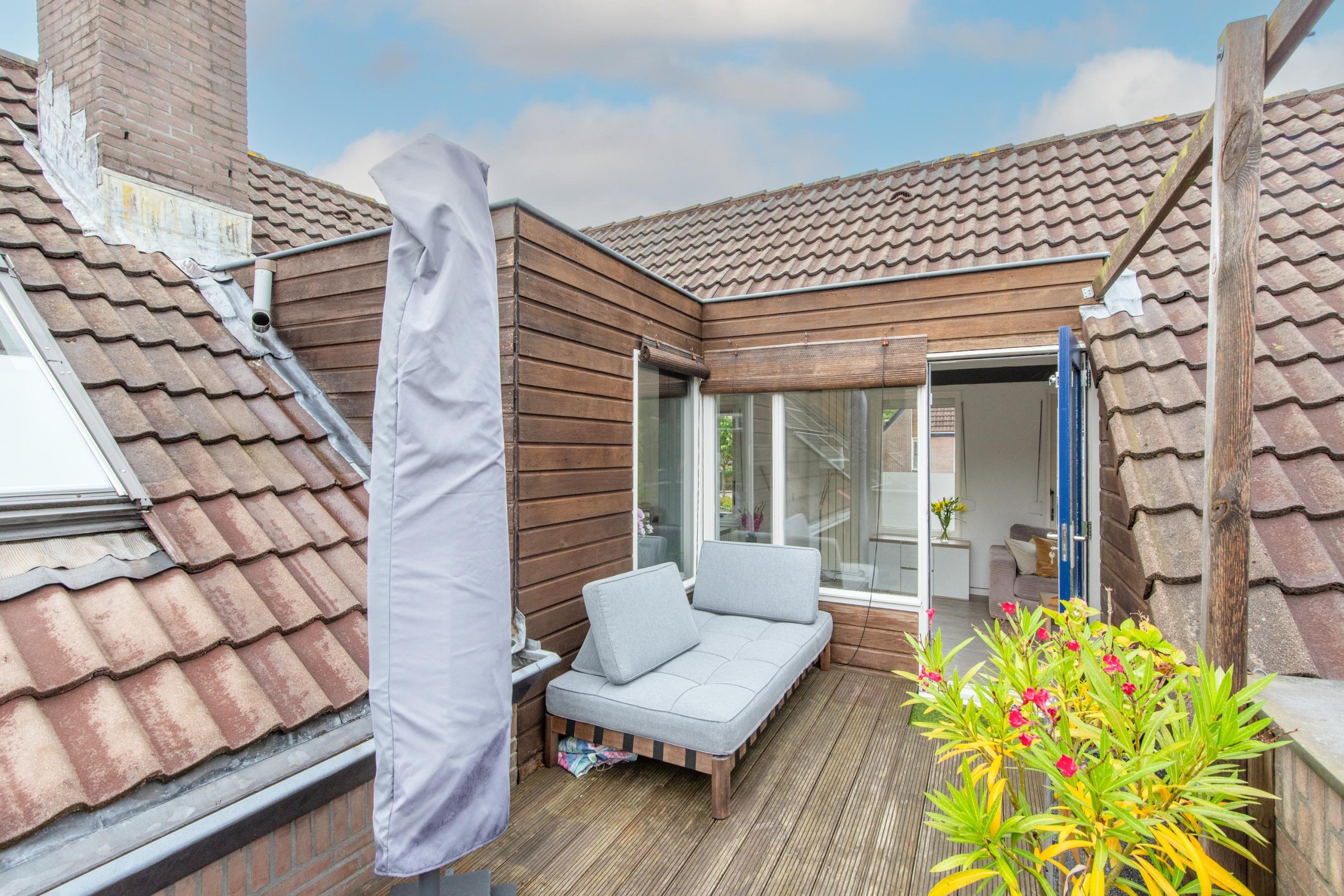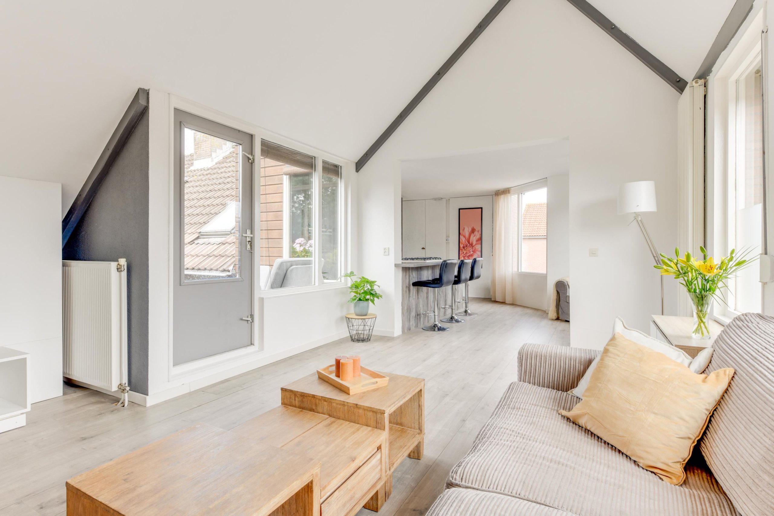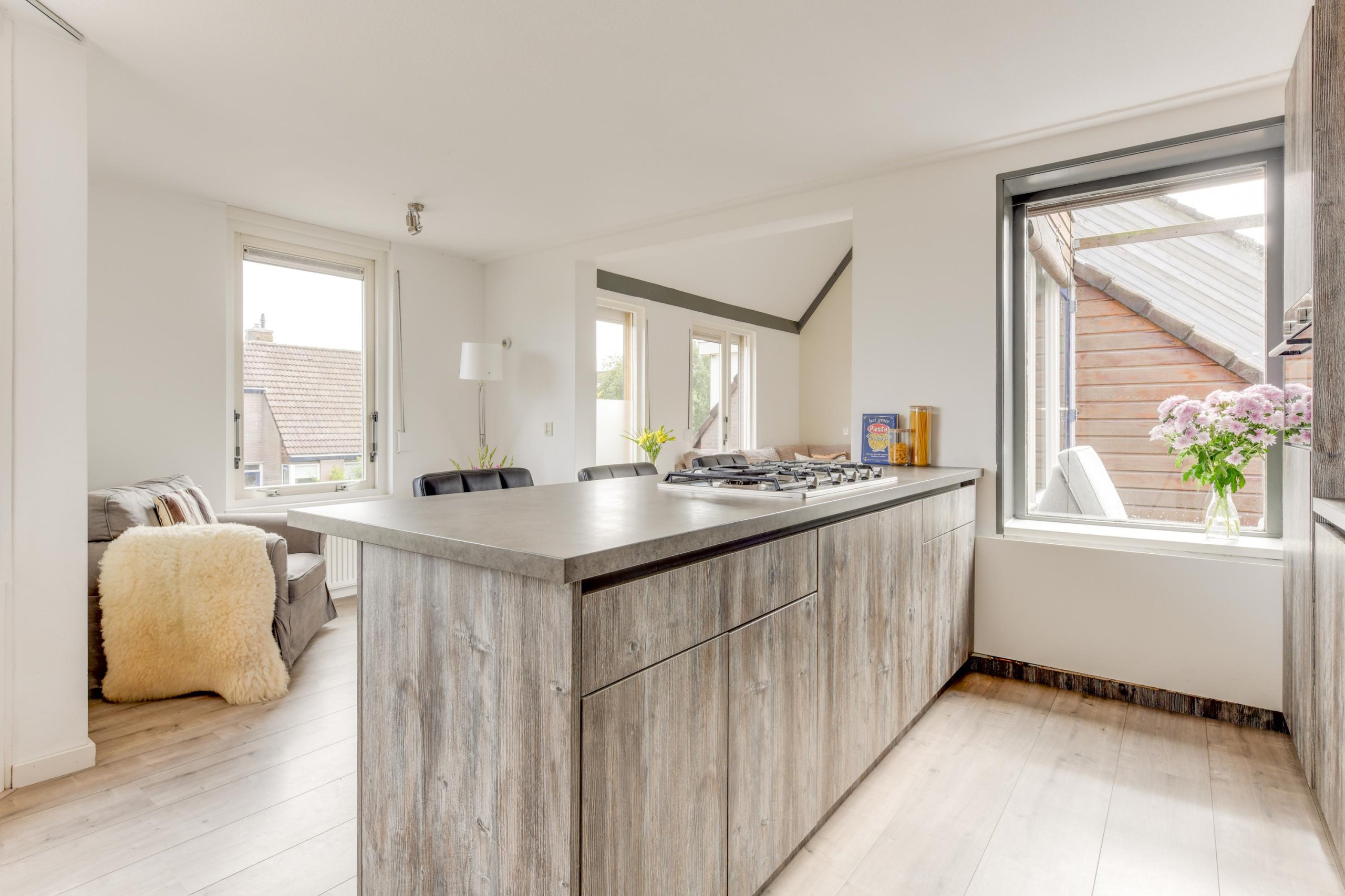 Eerste verdieping: De lichte woonkamer heeft een hoog plafond wat een ruimtelijk effect geeft. Vanuit hier stap je zo het ruime dakterras op: heerlijk privé en ideaal op de zon gelegen. De keuken, uitgevoerd in een strakke, neutrale stijl en voorzien van diverse inbouwapparatuur, waaronder een vaatwasser.