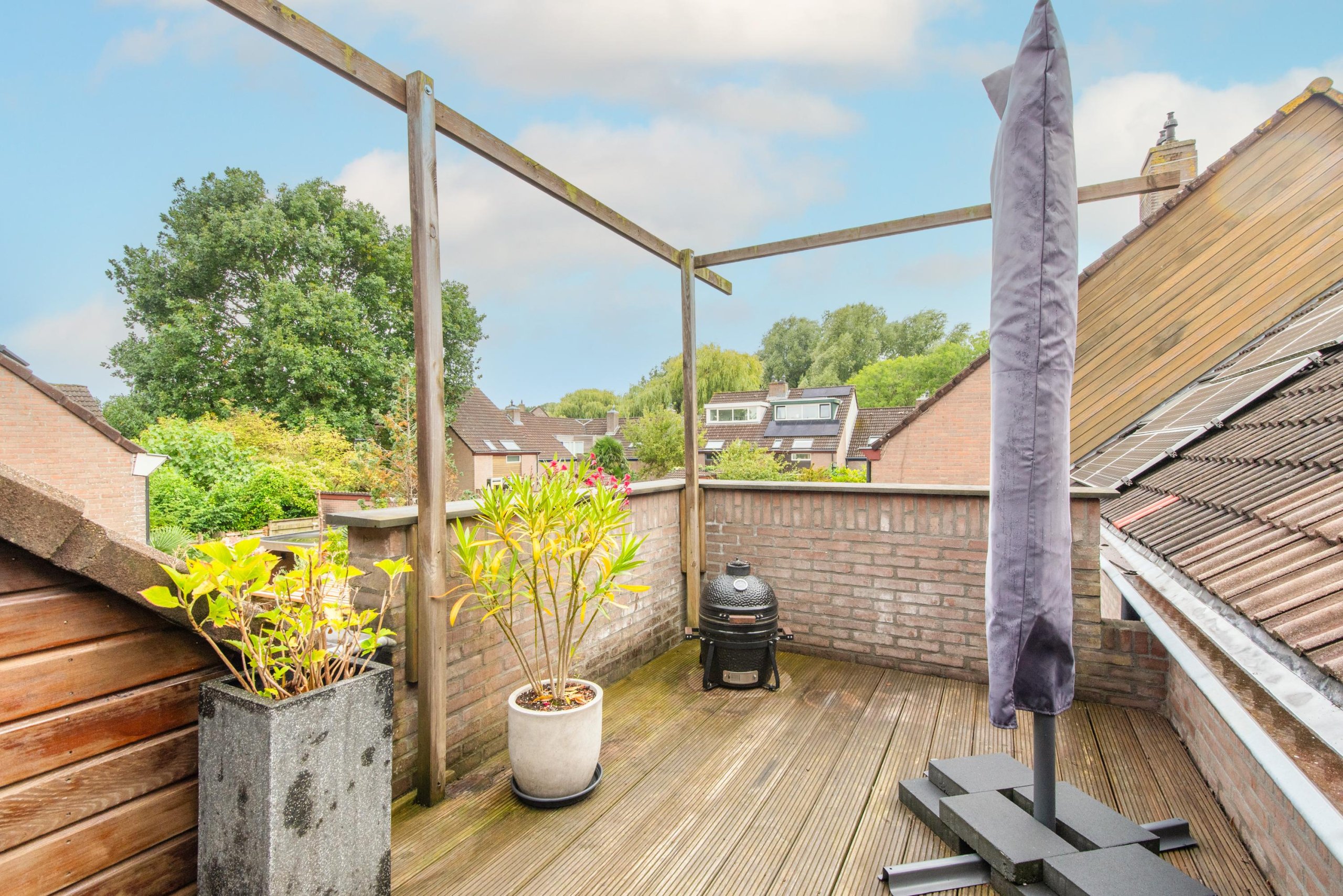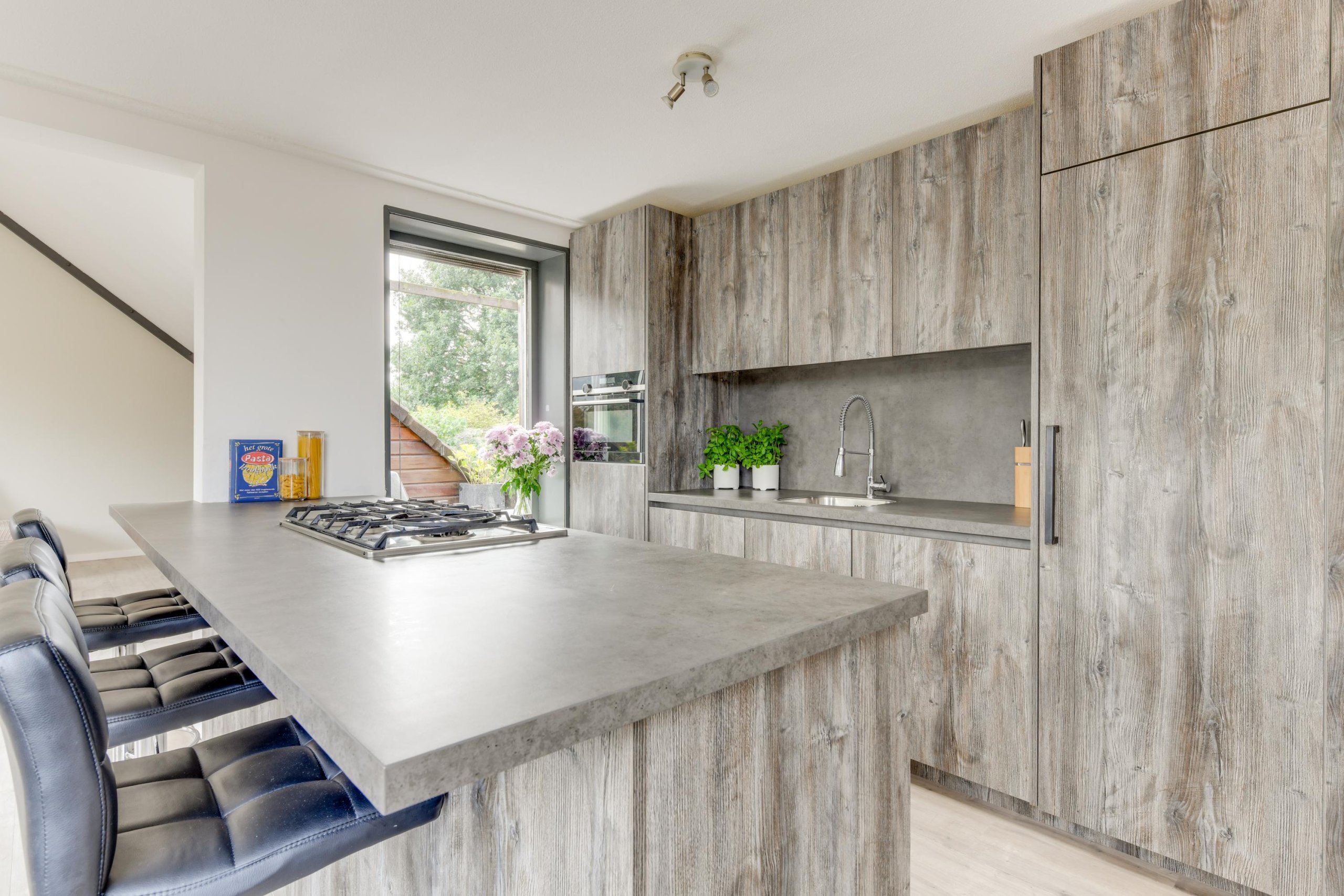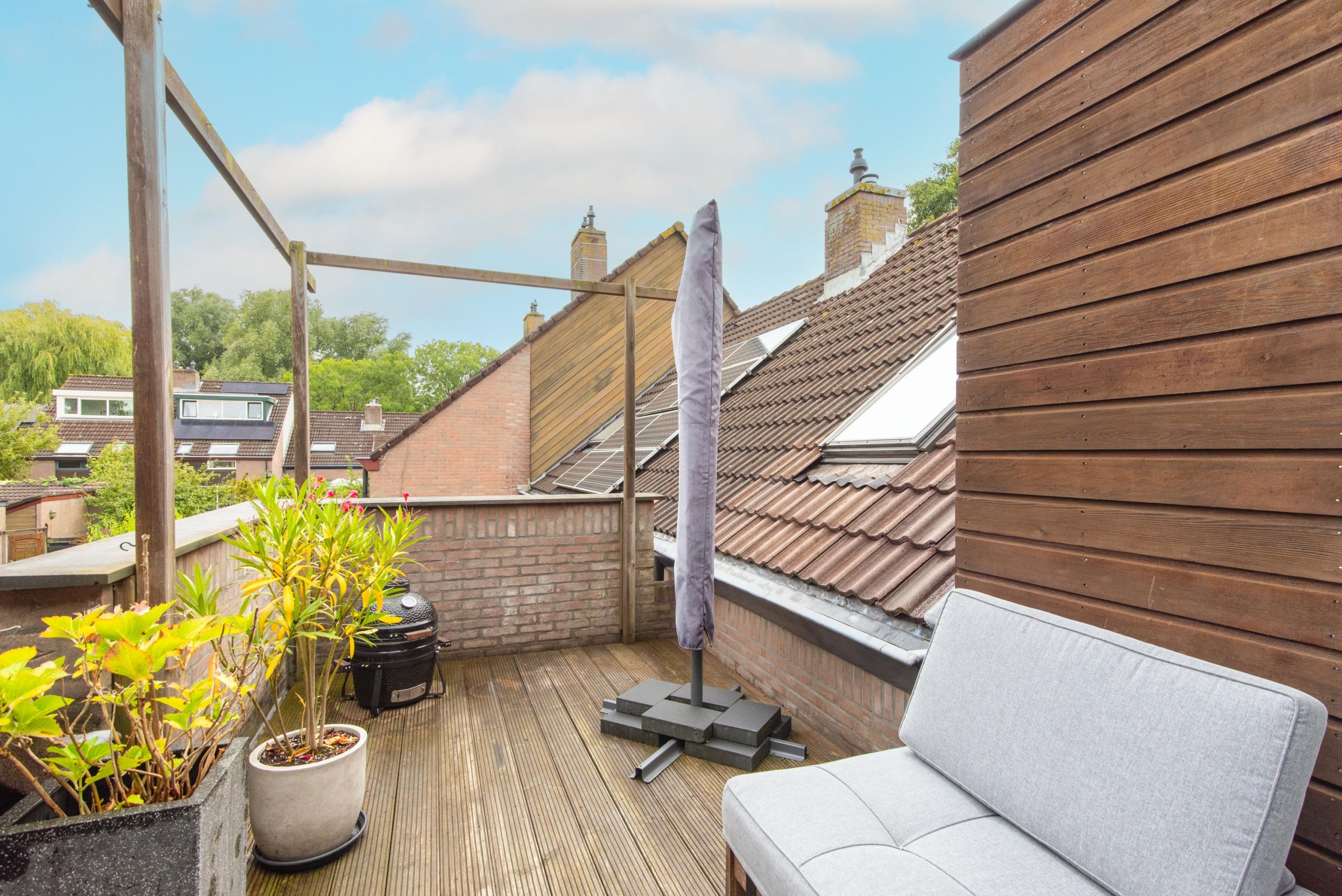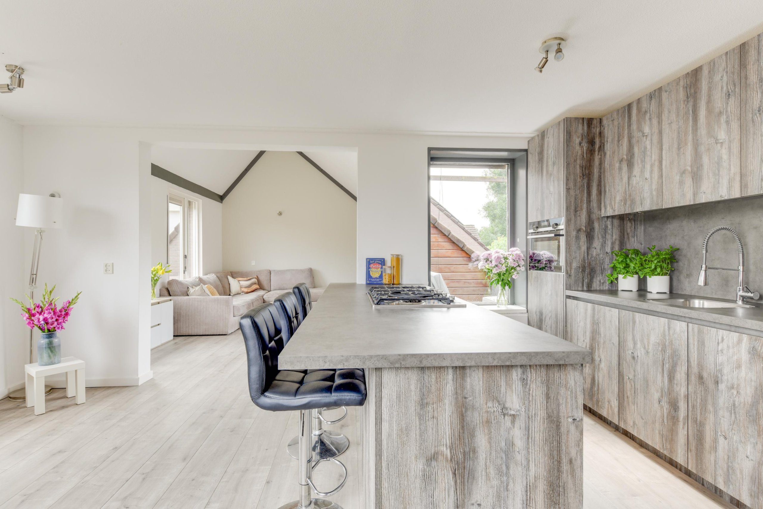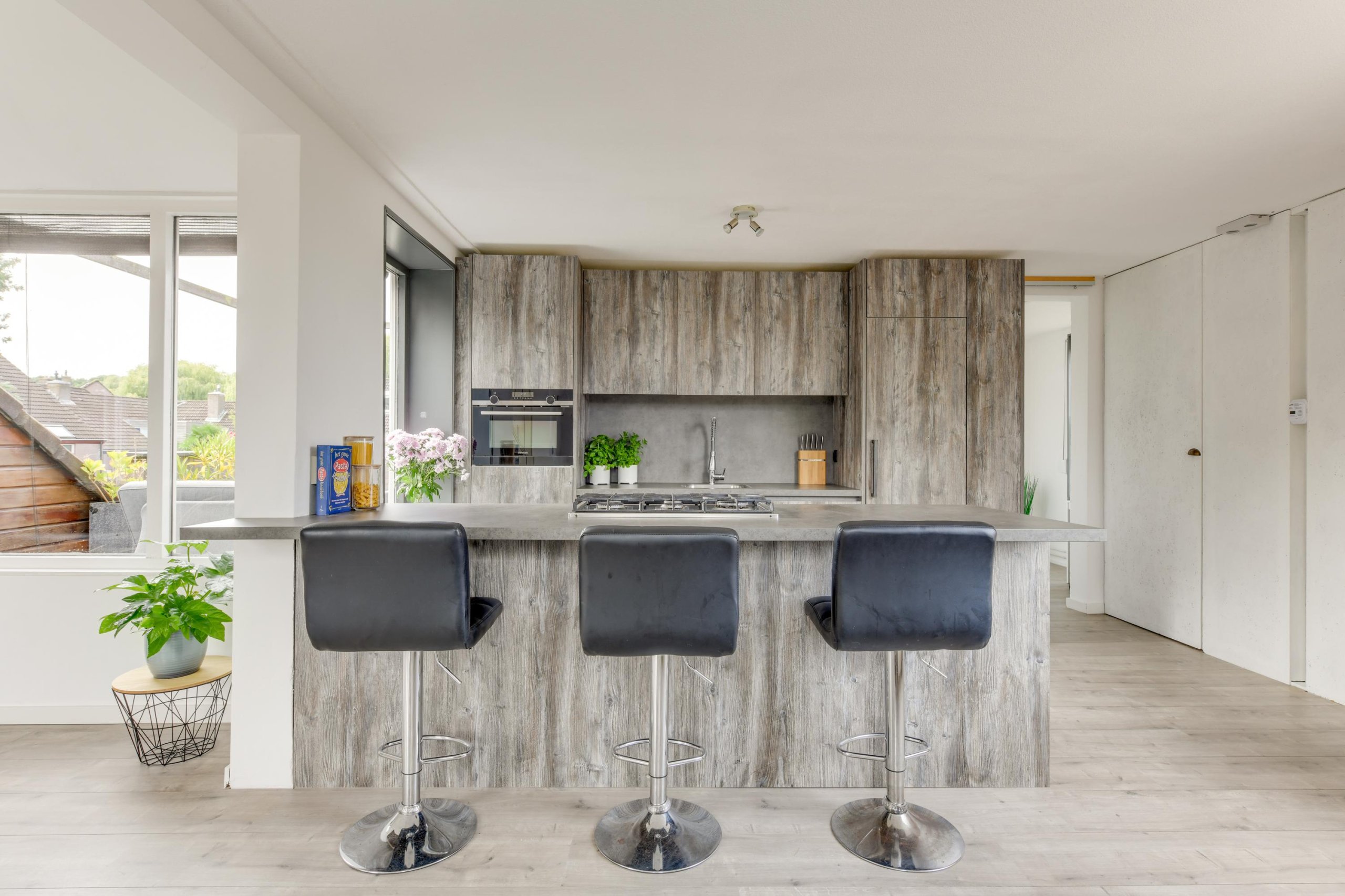 Eerste verdieping: De lichte woonkamer heeft een hoog plafond wat een ruimtelijk effect geeft. Vanuit hier stap je zo het ruime dakterras op: heerlijk privé en ideaal op de zon gelegen. De keuken, uitgevoerd in een strakke, neutrale stijl en voorzien van diverse inbouwapparatuur, waaronder een vaatwasser.