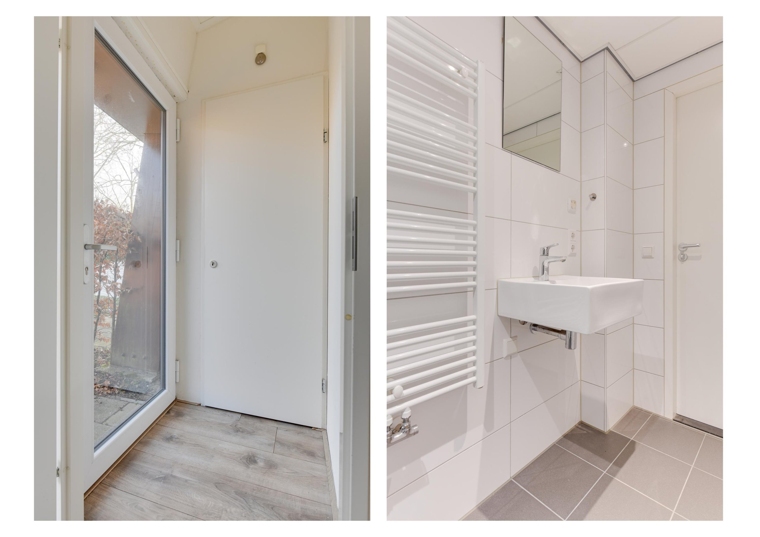 Via de entree bereik je de hal met daarin de meterkast. Vervolgens kom je in de heerlijk lichte woonkamer met grote glazen pui naar de tuin. De keuken staat in open verbinding met de woonkamer en is voorzien van een moderne inrichting met ingebouwde koelkast met vriesvak, gaskookplaat en afzuigkap. Vervolgens tref je het separate toilet aan welke modern is betegeld en voorzien is van een zwevend toilet. De badkamer tref je aan de overzijde van de toiletruimte en deze is voorzien van een heerlijke inloopdouche, wastafel en een designradiator. Op een kleine verhoging ligt de slaapkamer. Deze is ruim bemeten en in 2024 voorzien van een nieuw kozijn. Doordat de slaapkamer op een verhoging ligt is er ruimte onder de kamer aanwezig. Deze wordt thans gebruikt voor de wasmachine, de opstelling van de CV ketel en opbergruimte. De tuin voor de woning ontvangt de gehele dag de zon doordat het gebouw laag is en de zon daardoor alle ruimte heeft om in de tuin te schijnen.