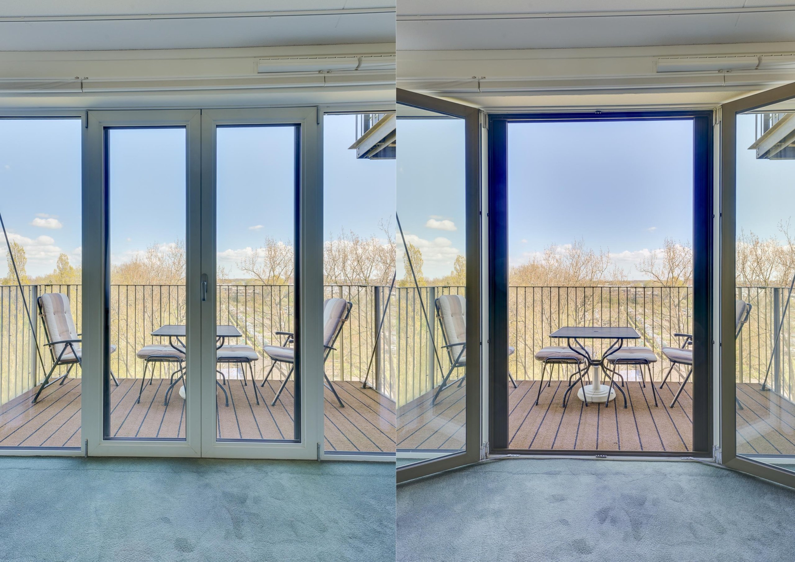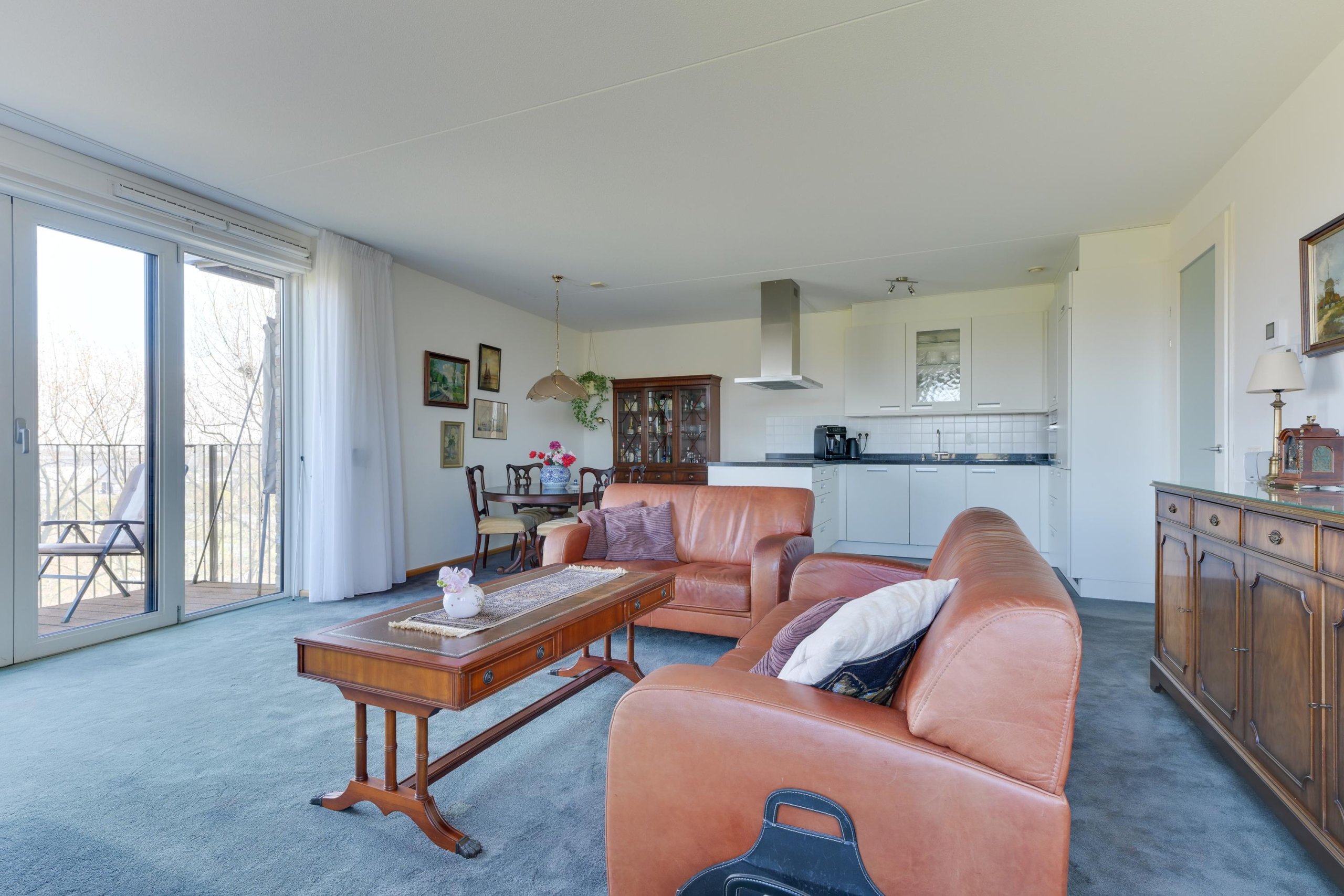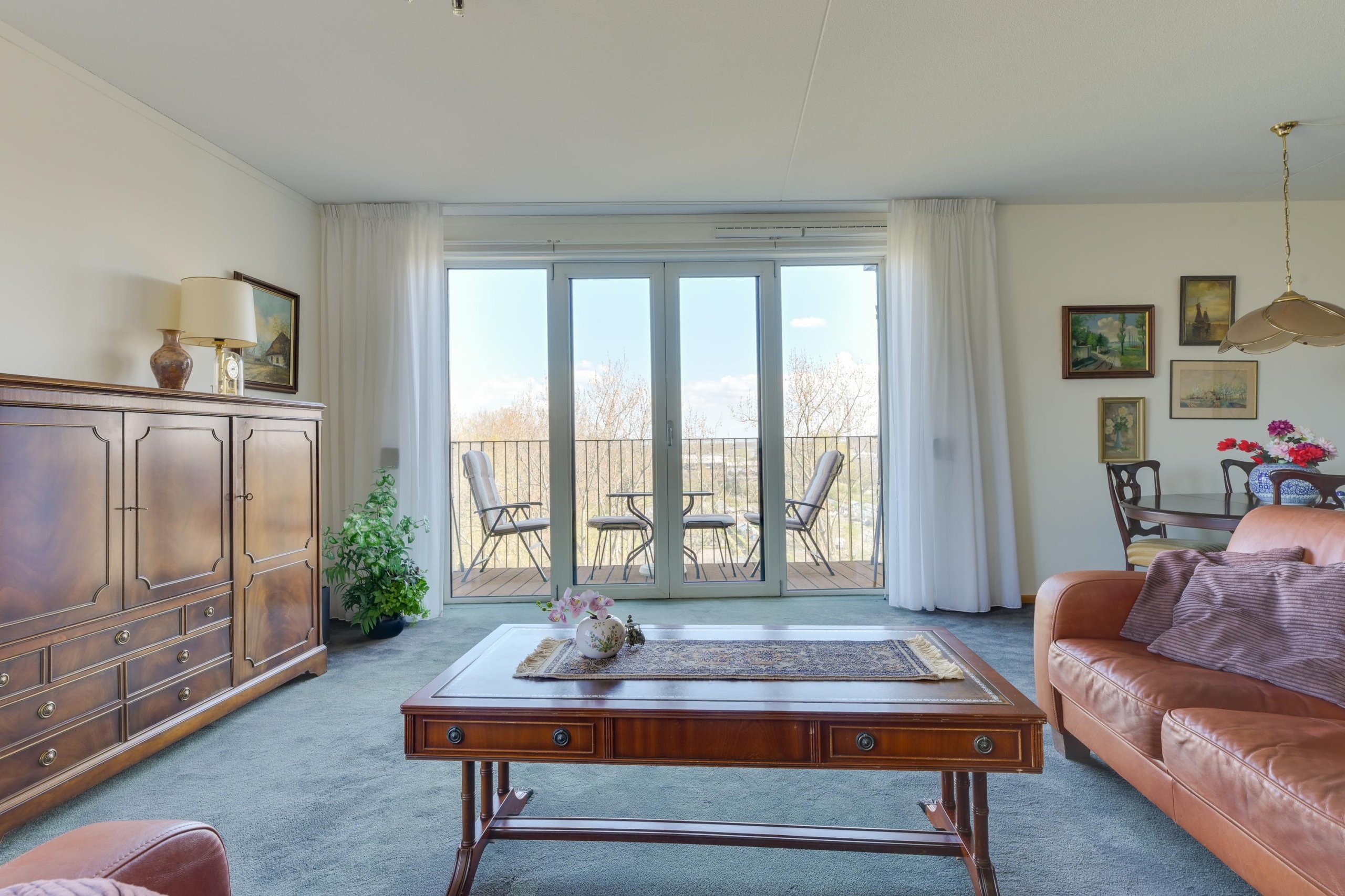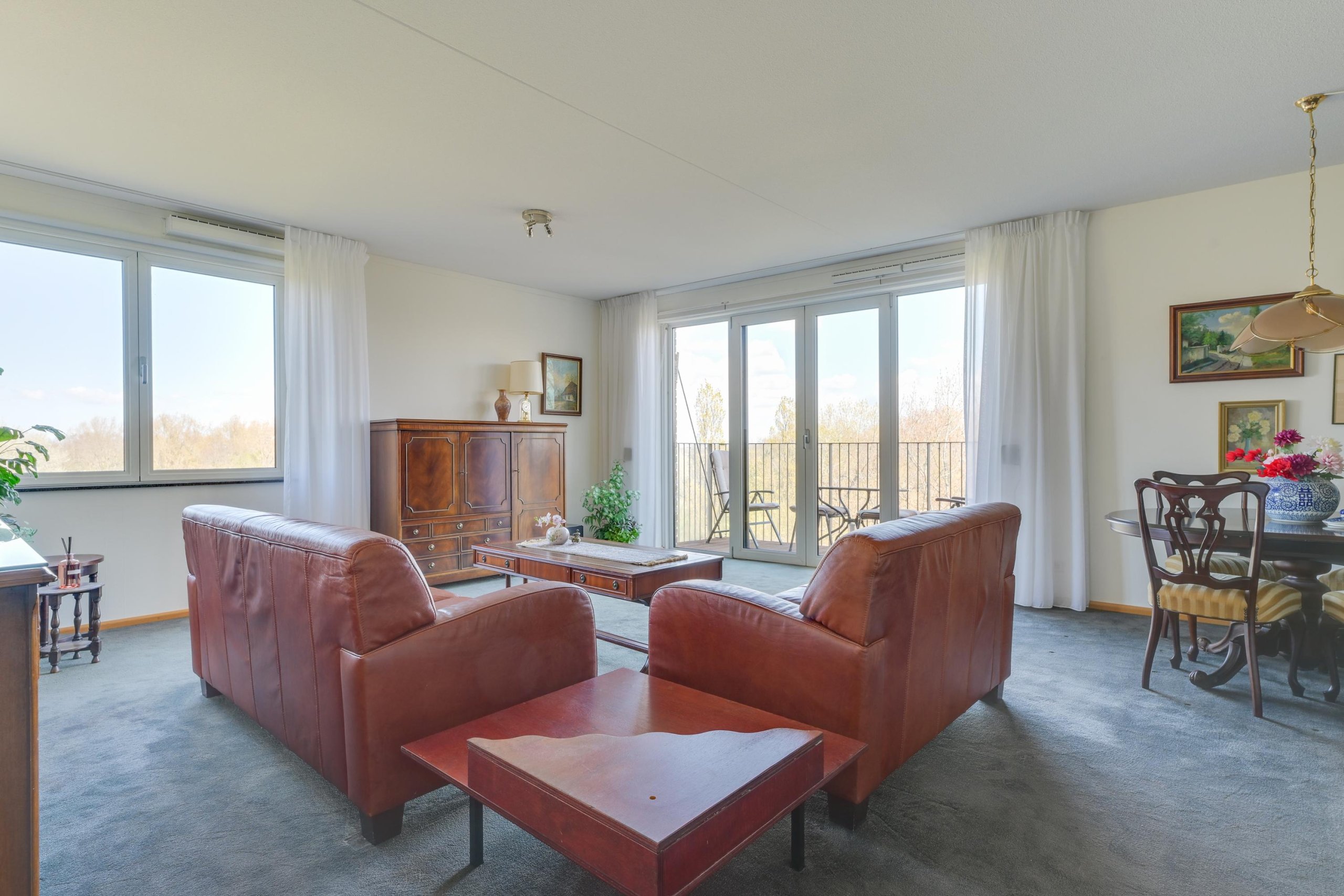 Vanuit de woonkamer heb je middels met openslaande deuren toegang tot het eigen zonneterras, waar je kunt genieten van een vrij uitzicht over het park.