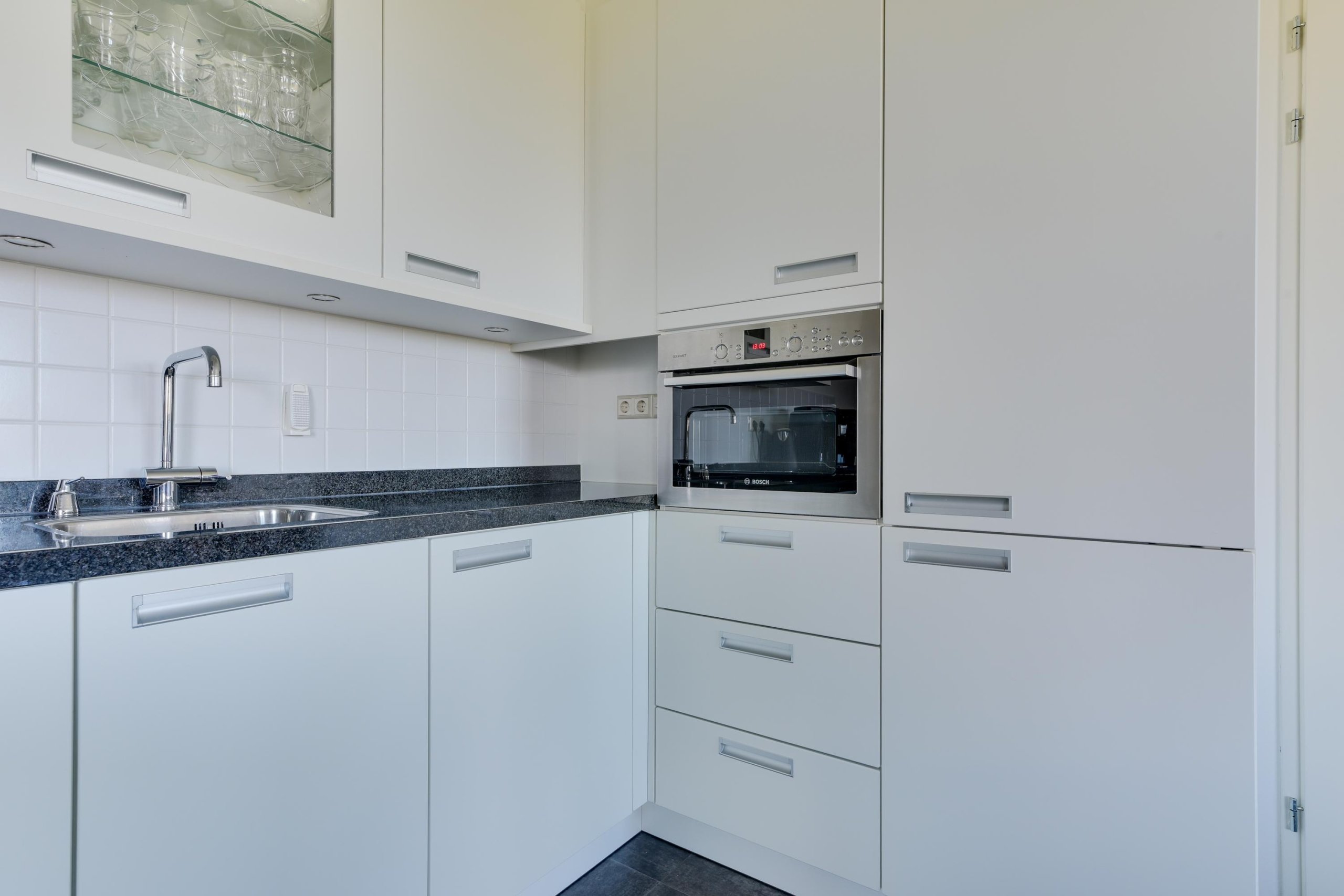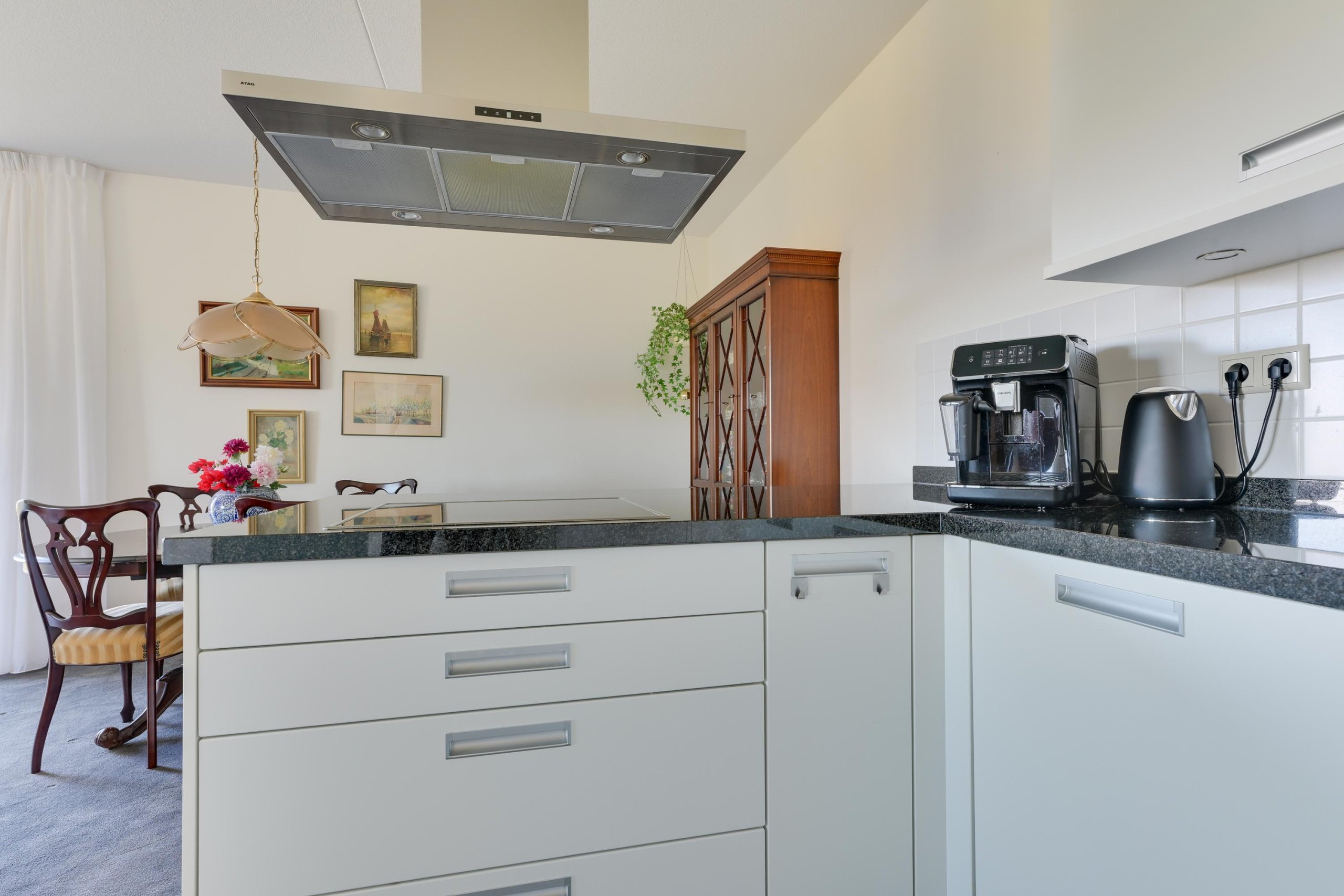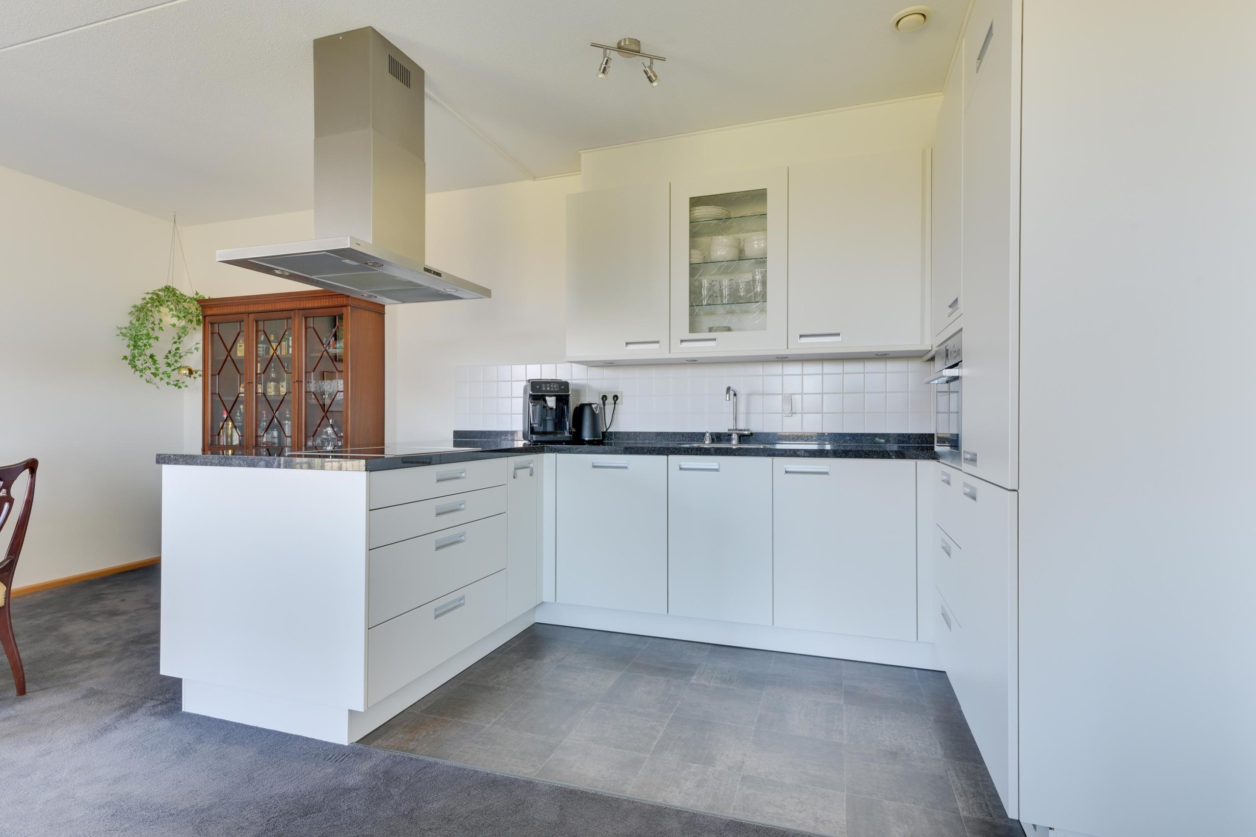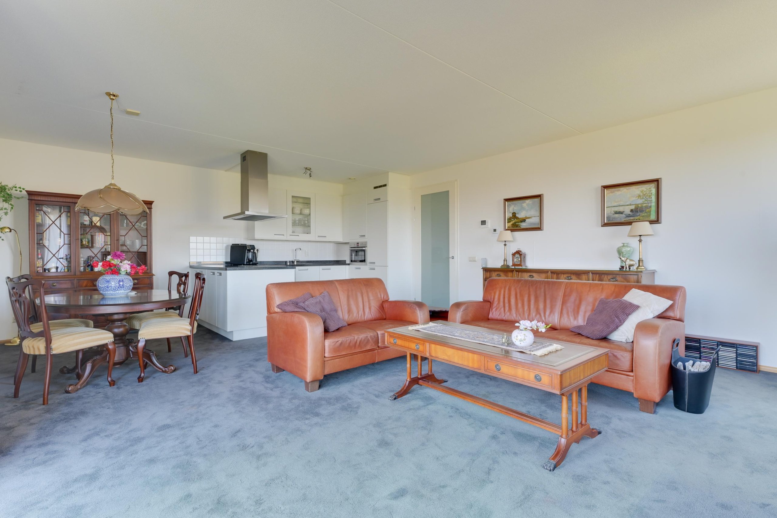 Via de portiek bereik je de entree van het appartement. Vanuit de hal kom je in de ruime en lichte woonkamer met open keuken, voorzien van diverse inbouwapparatuur.