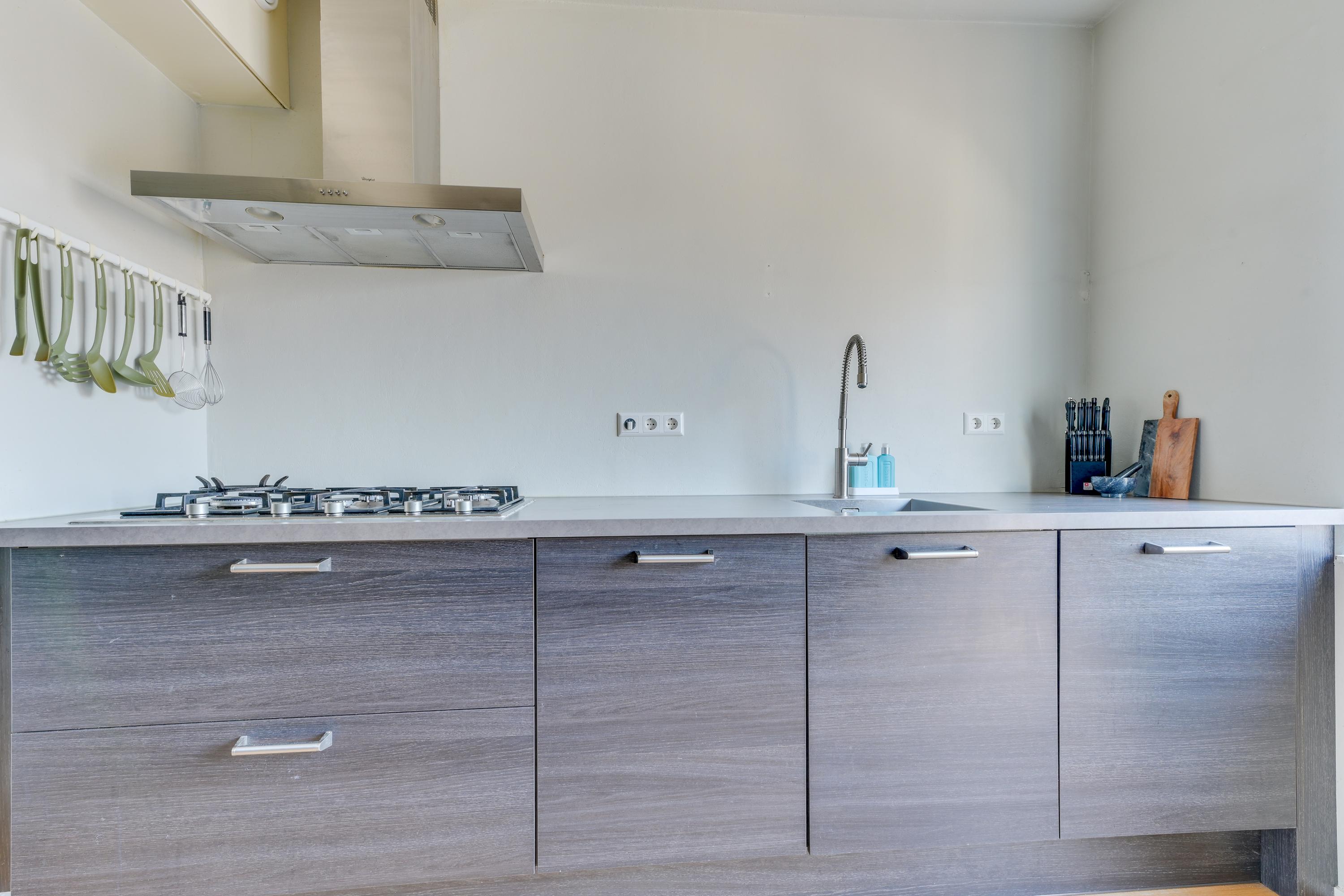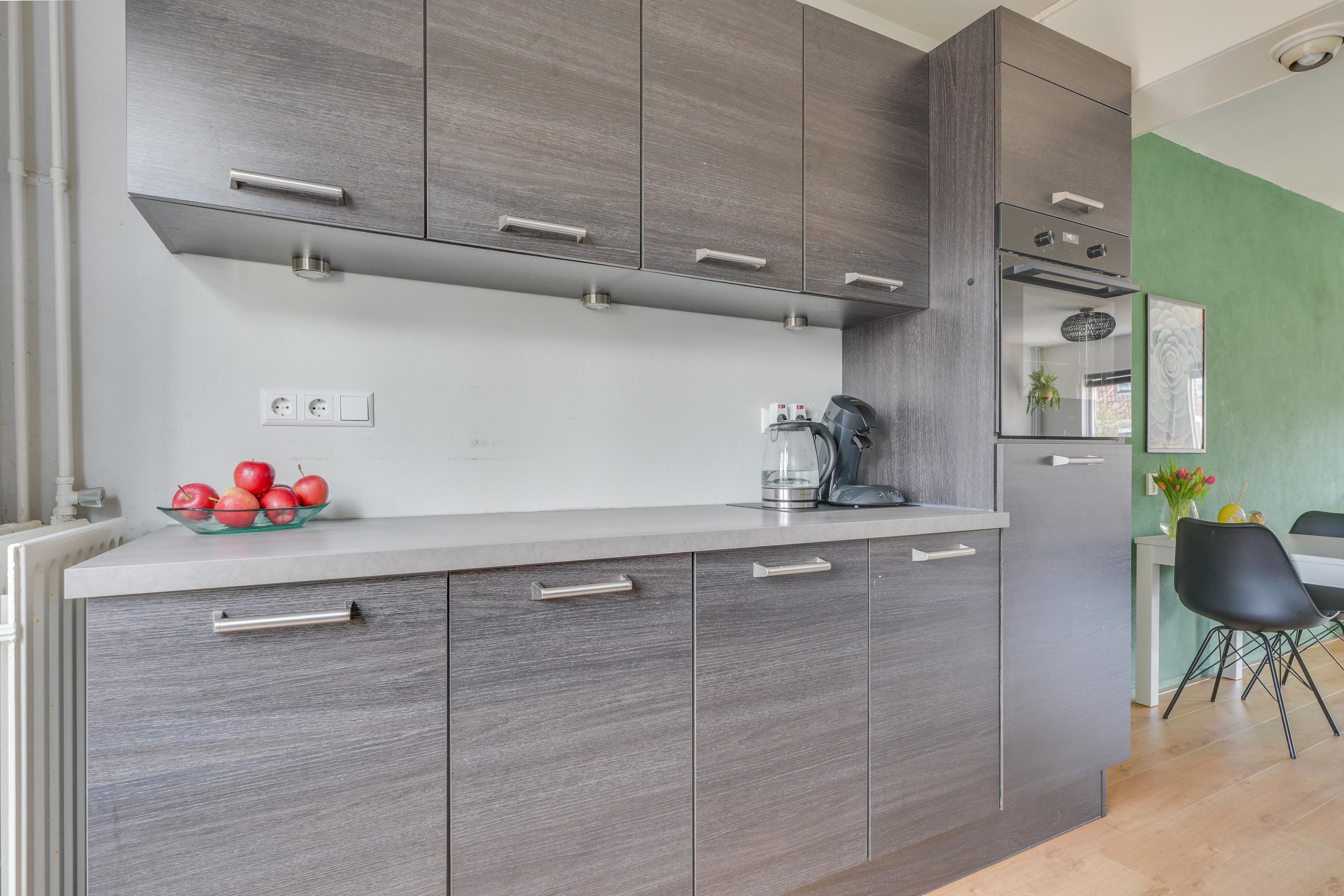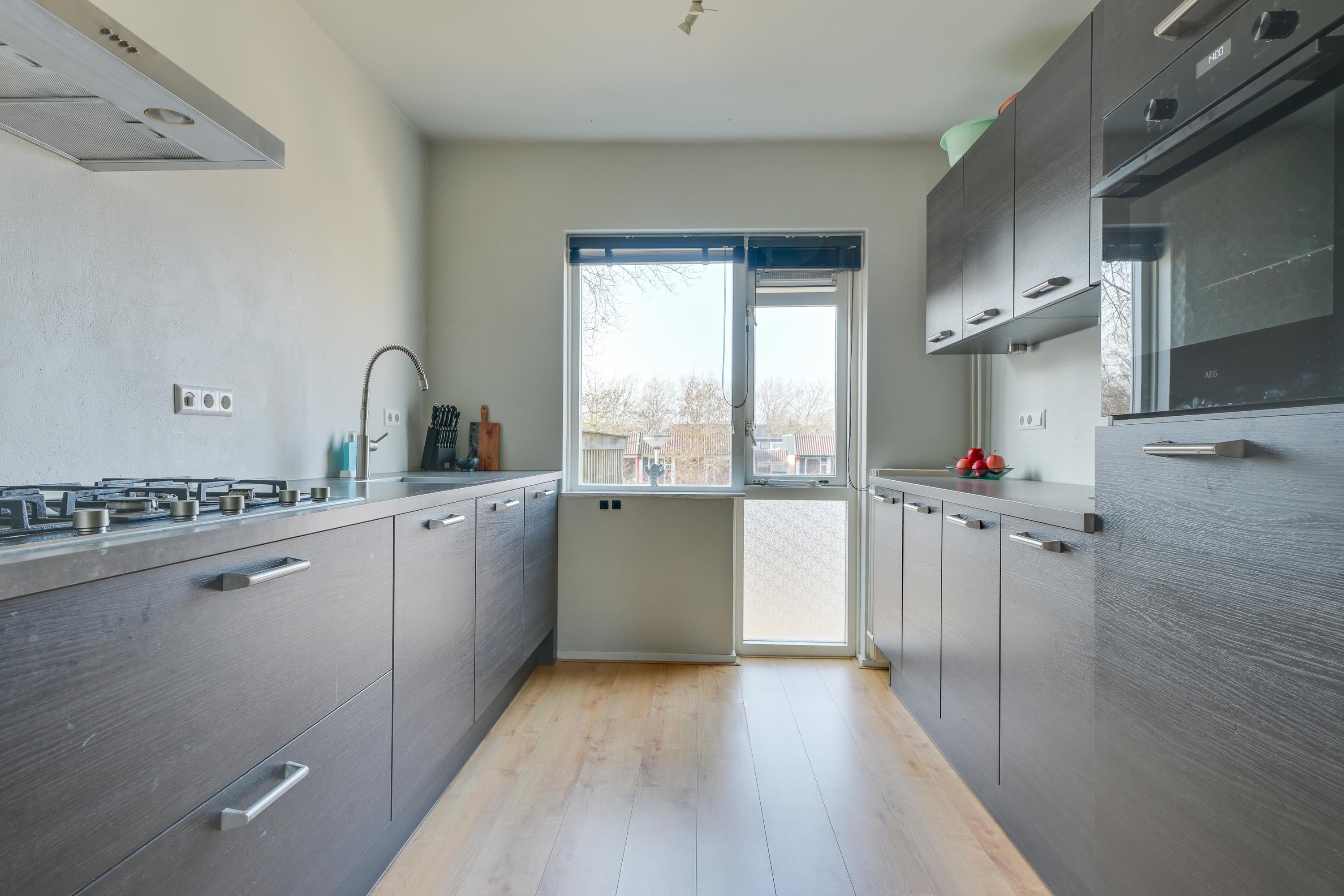 De keuken is netjes uitgevoerd en voorzien van diverse inbouwapparatuur, waaronder een vaatwasser, heteluchtoven en gaskookplaat. Daarnaast is er voldoende kastruimte aanwezig. Vanuit de keuken is er direct zicht op het zonneterras aan de voorzijde.