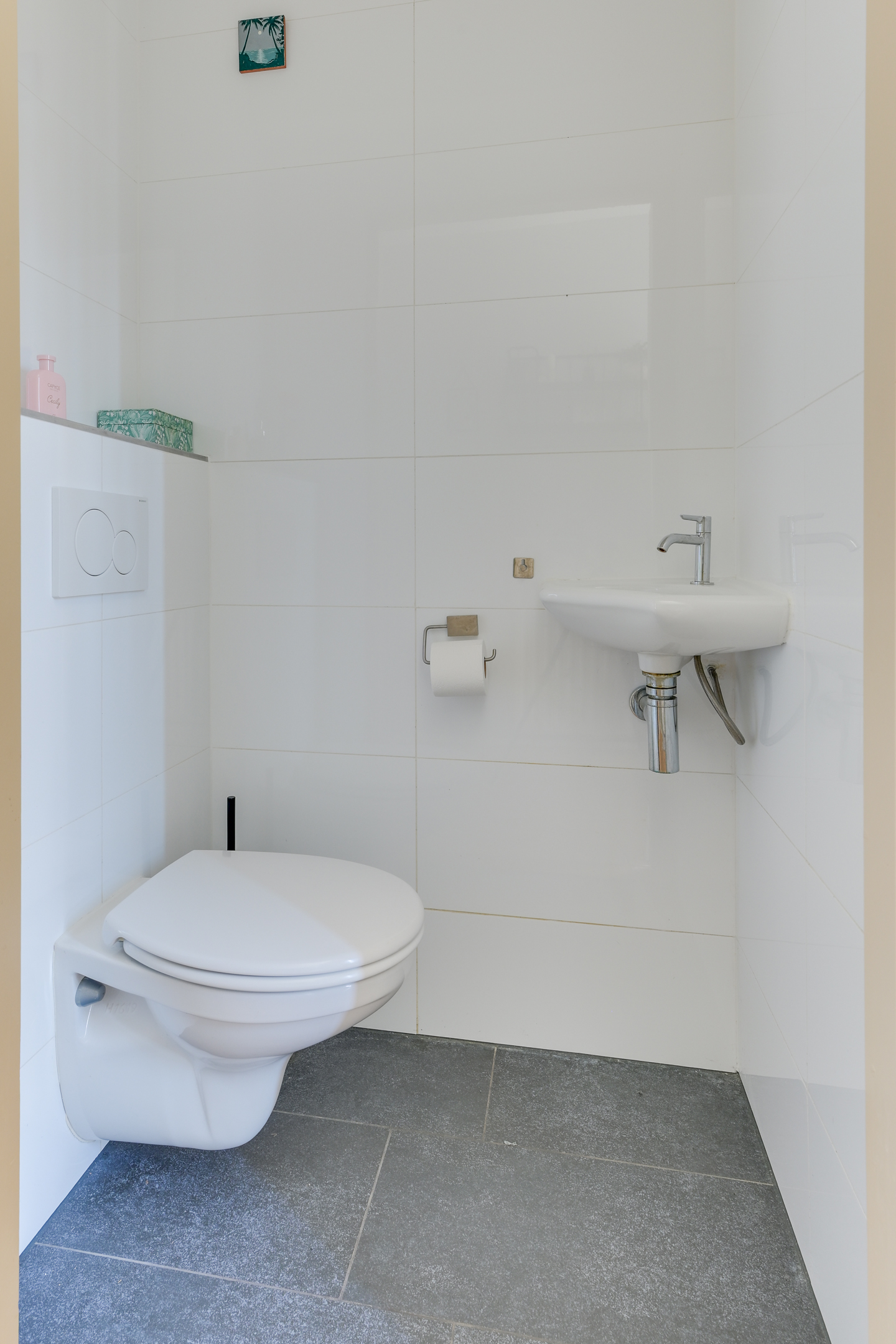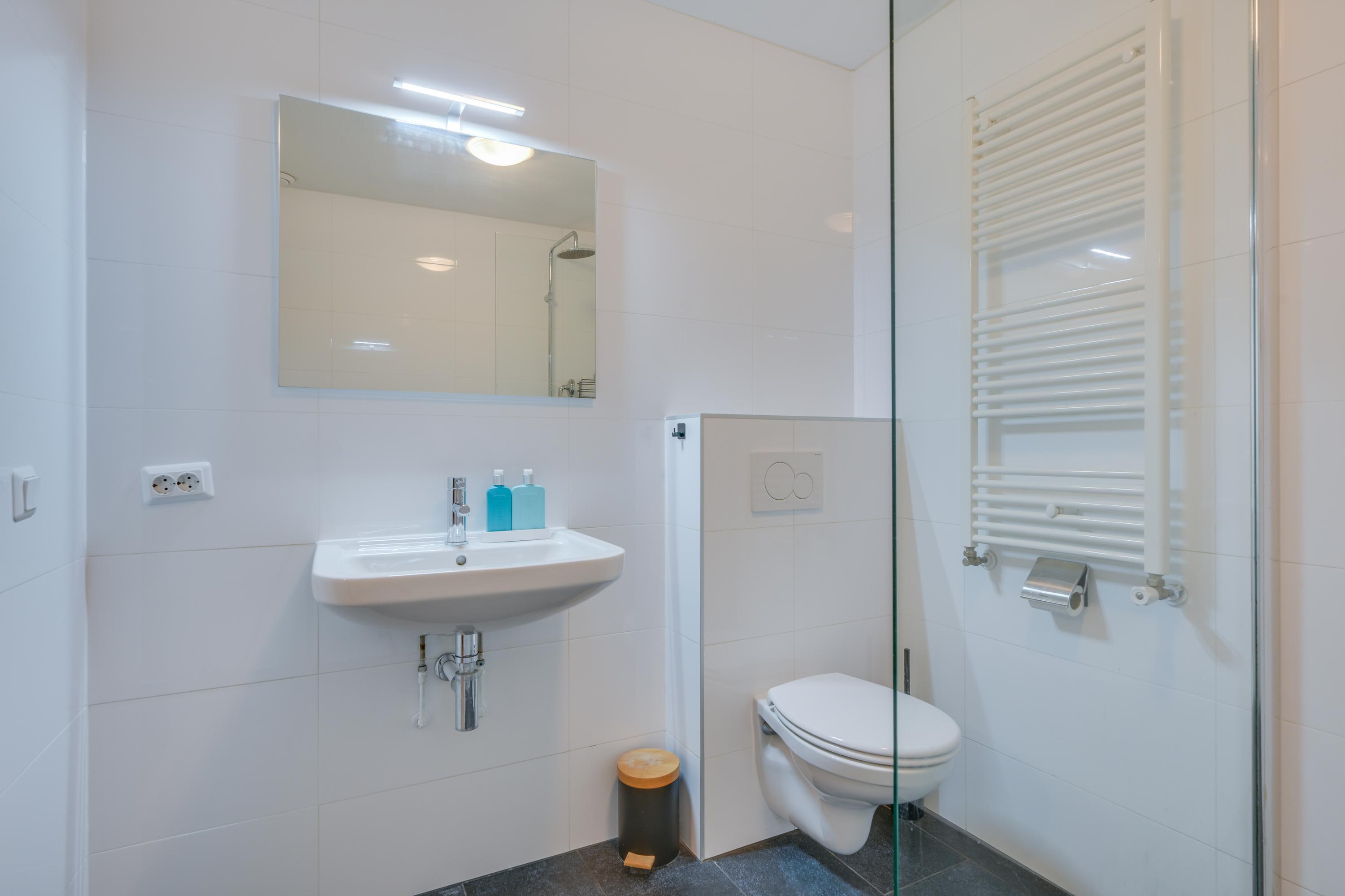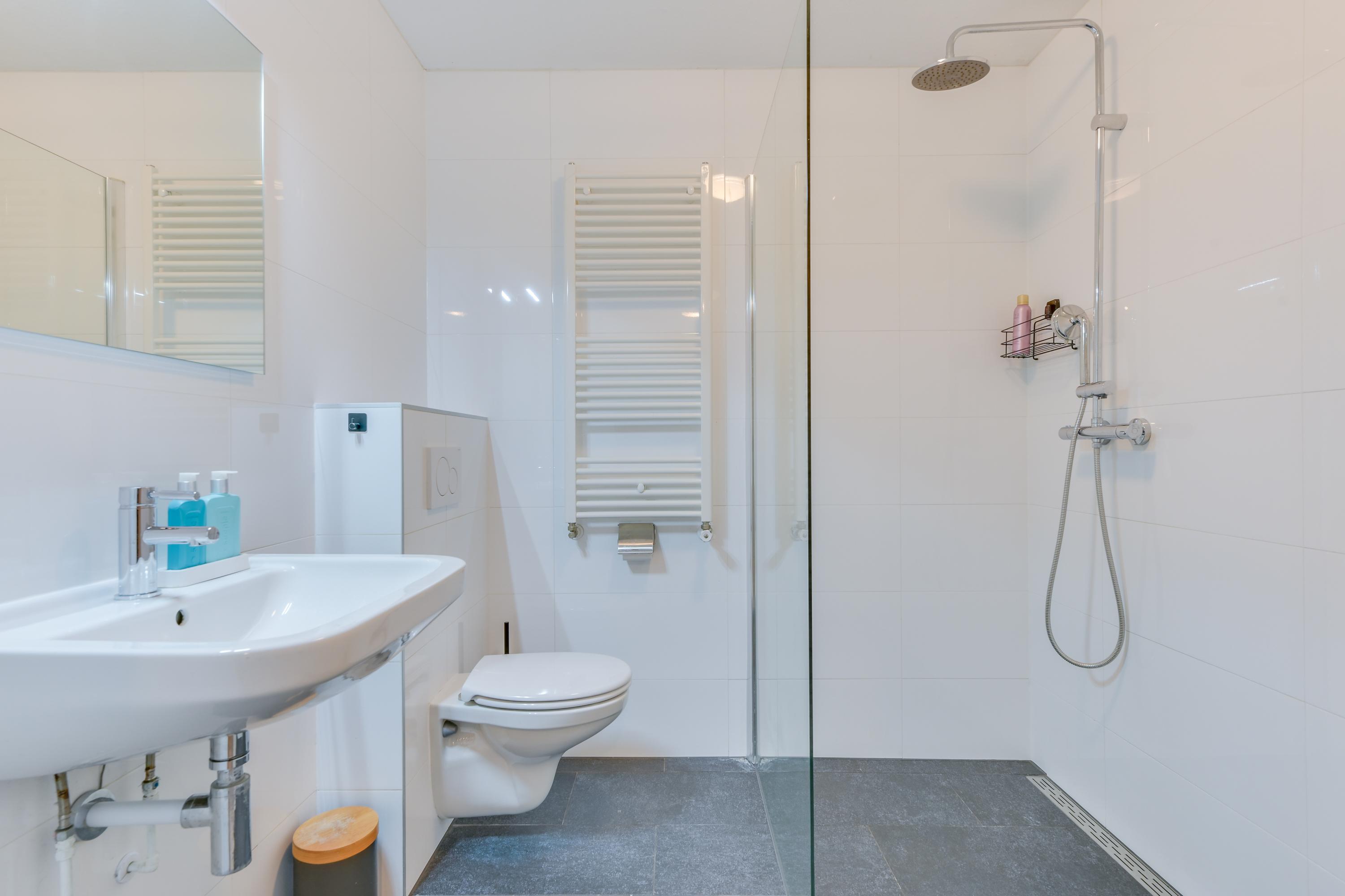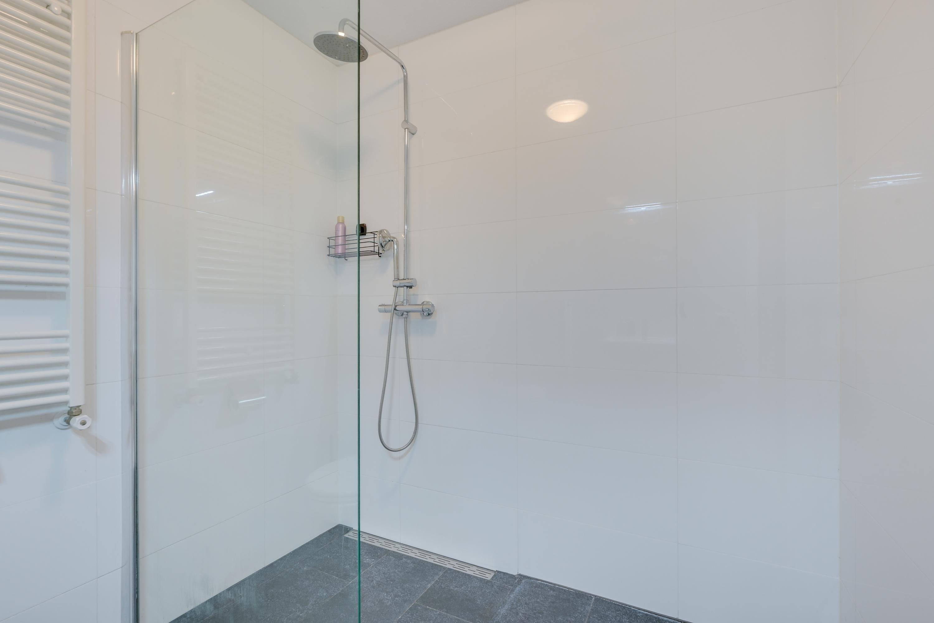 De badkamer is verzorgd en voorzien van een inloopdouche, wastafel en 2e toilet.