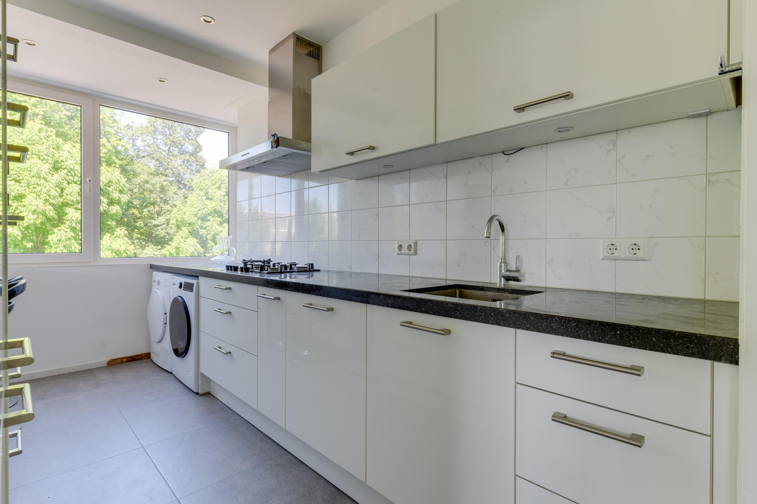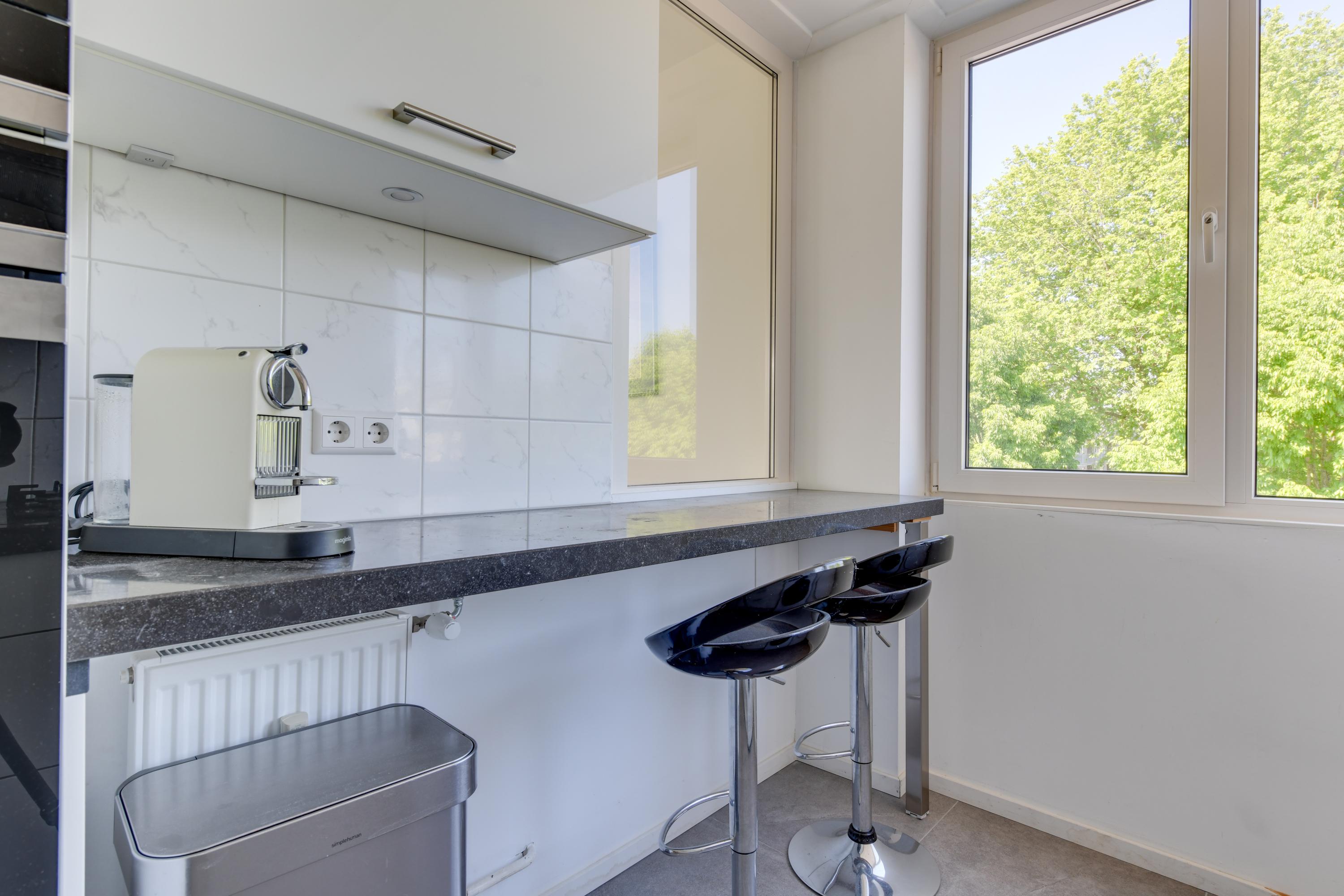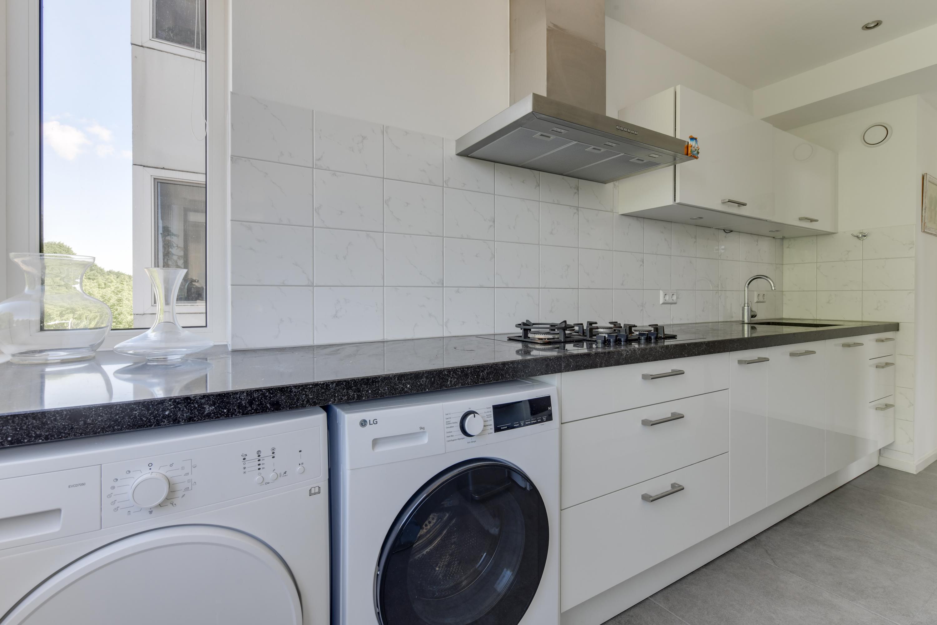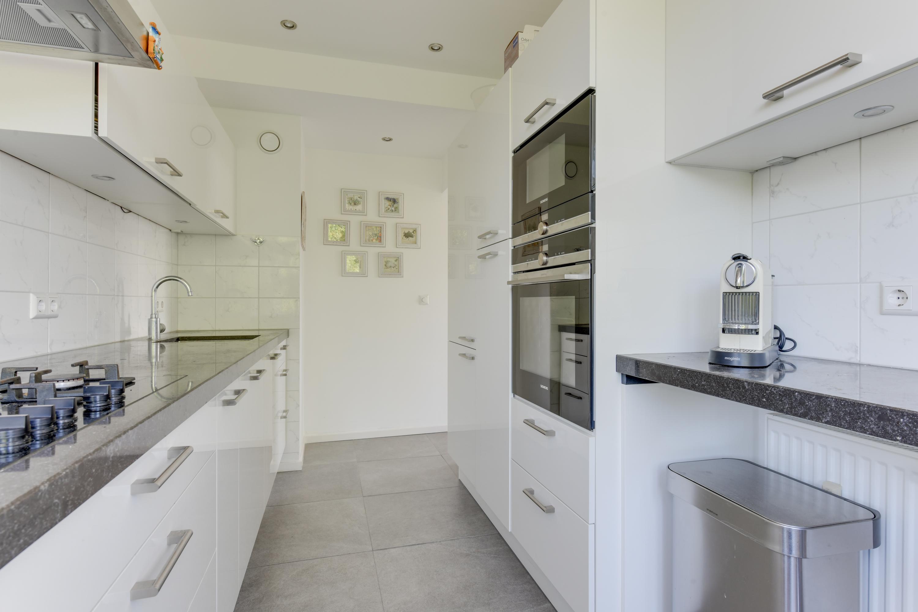 De moderne gesloten keuken is uitgevoerd met witte hoogglans kasten, donker werkblad en voorzien van diverse inbouwapparatuur zoals een gaskookplaat, afzuigkap, oven, combimagnetron, vaatwasser, koelkast en vriezer. Er is tevens ruimte voor een gezellige bar of ontbijtplek aan het raam.