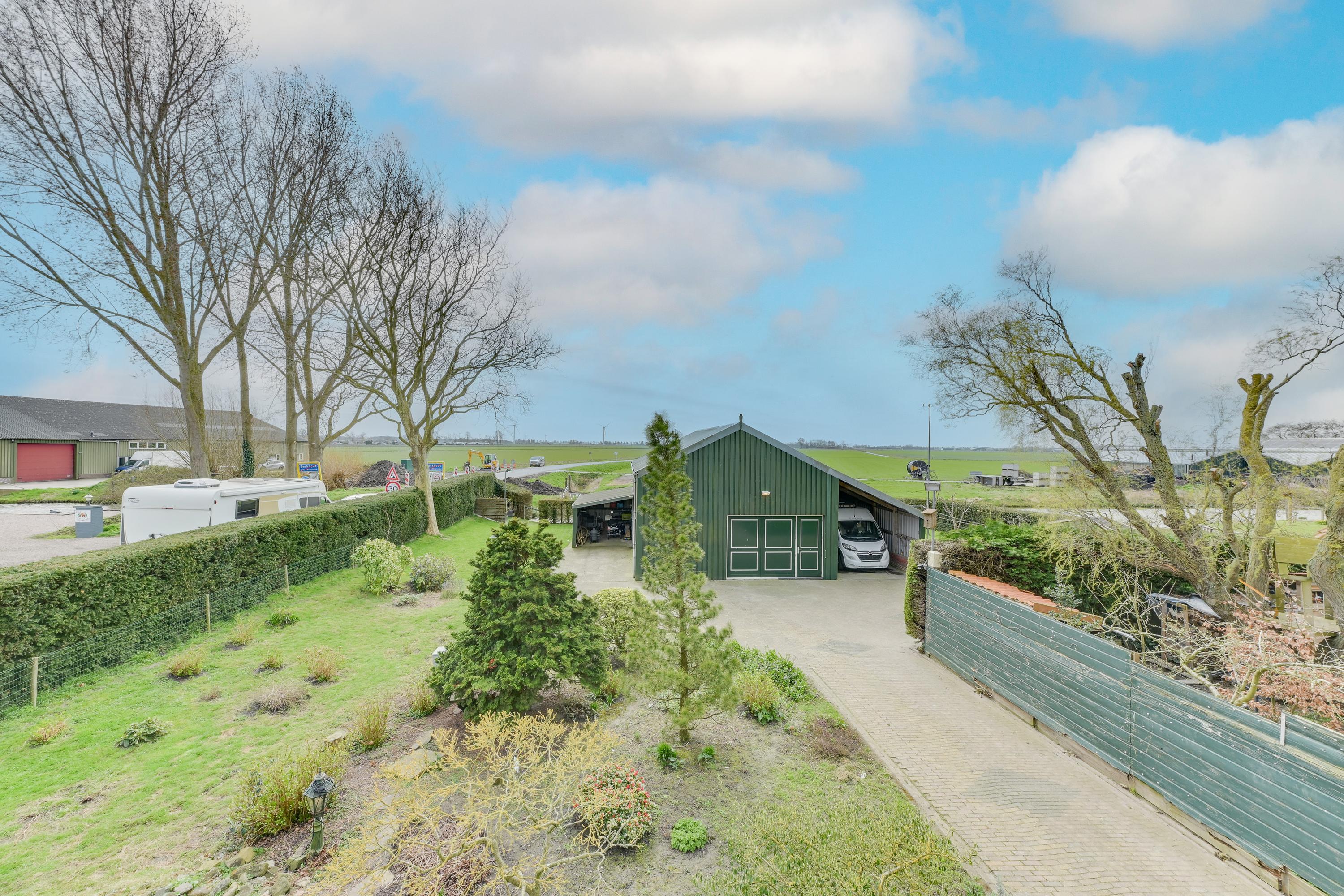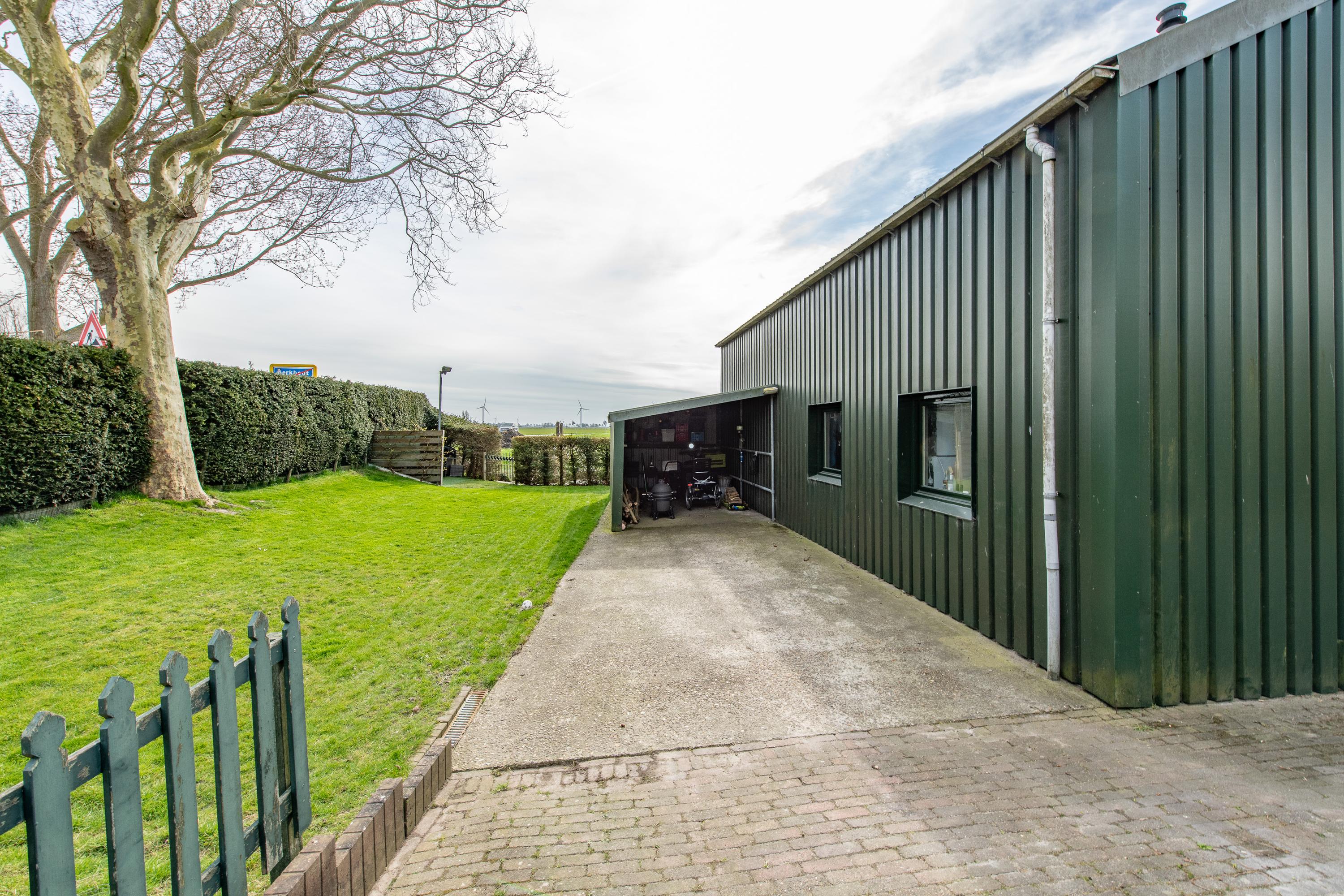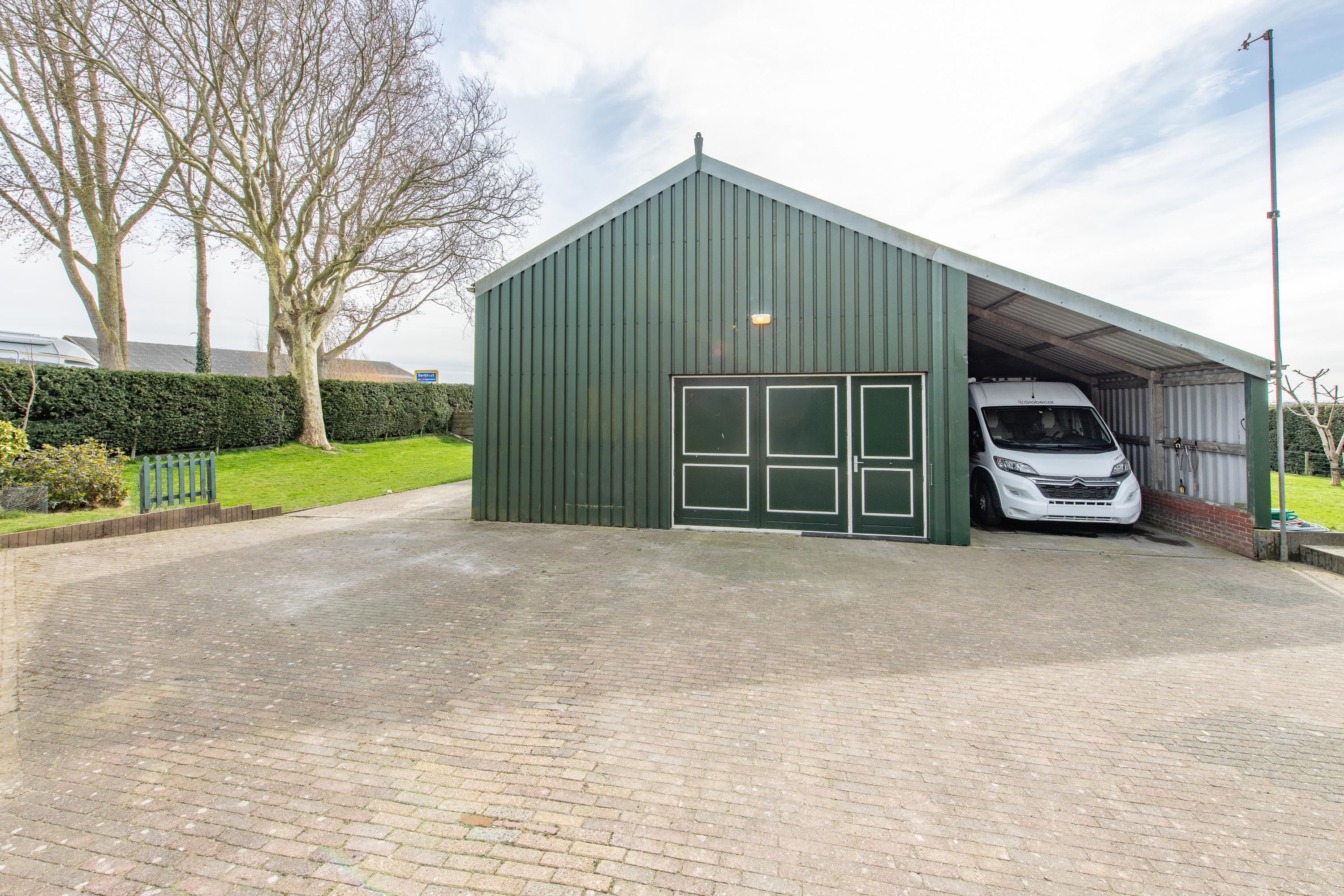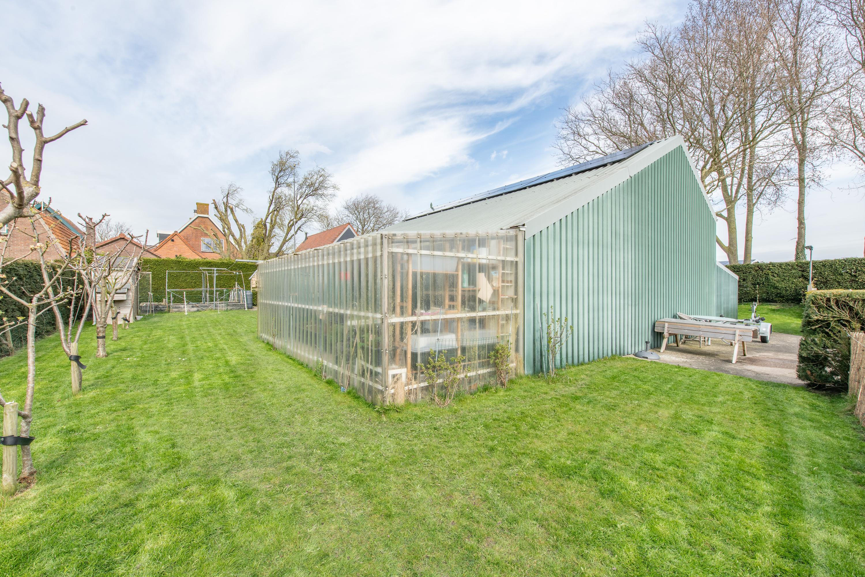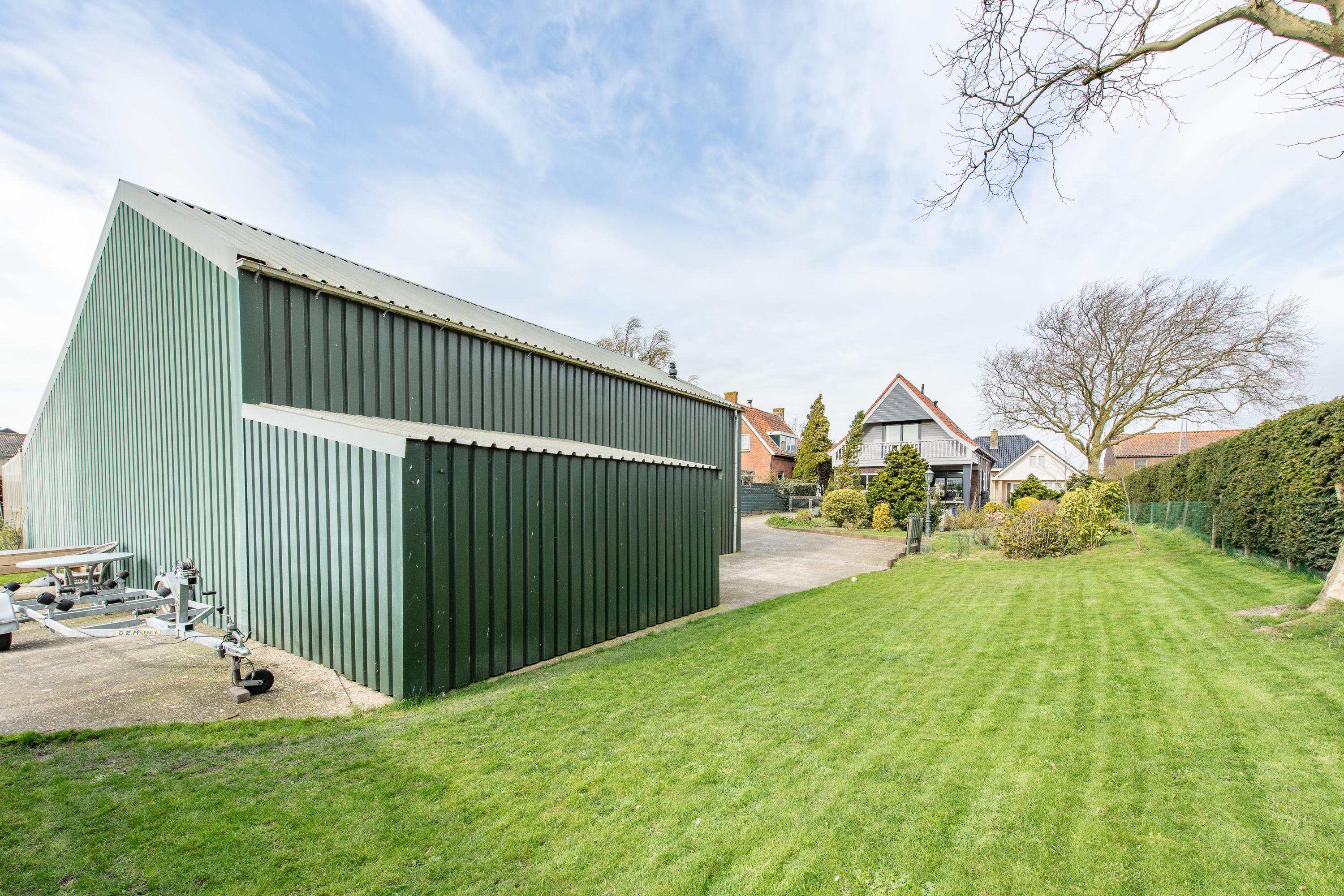 Een grote schuur van circa 150m2 met verdieping en eigen (oudere) cv-installatie, achterin de schuur is een hobbyruimte met keukenblok en boiler ingericht. De voorzijde en verdieping dienen nu als opslag. Aan weerzijde van de schuur zit een carport, ideaal voor het stallen van je auto('s). Op je eigen terrein kun je ook meerdere auto's kwijt. Praktisch voor als de visite langskomt. Ook voor de hobby kun je je hier uitleven zo is er een hobbykas ter eigen invulling, een moestuin voor het kweken van groente en fruit, zijn er fruitbomen en is er een eigen aanlegplaats voor de boot. Praktisch als je een lekker wil varen.