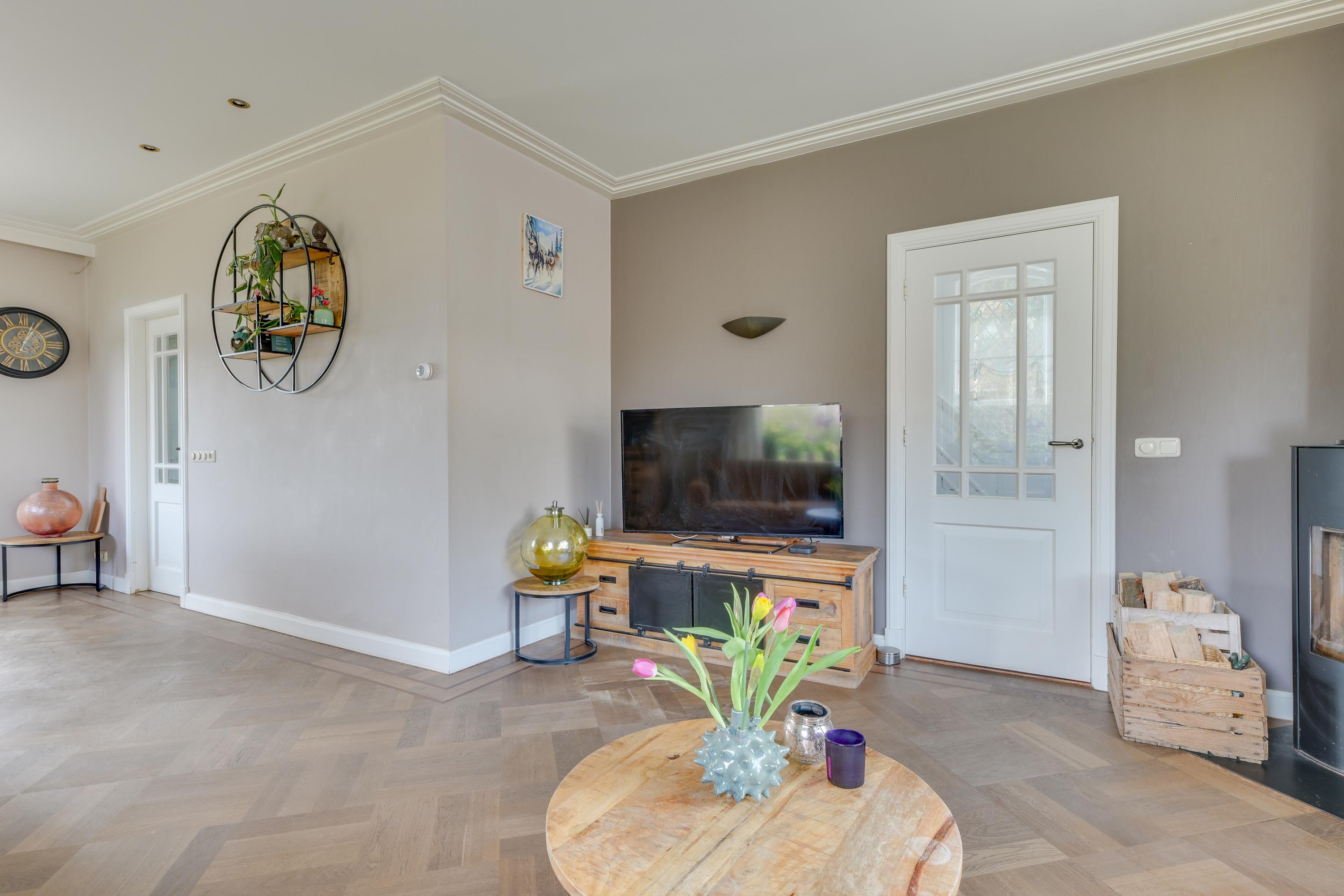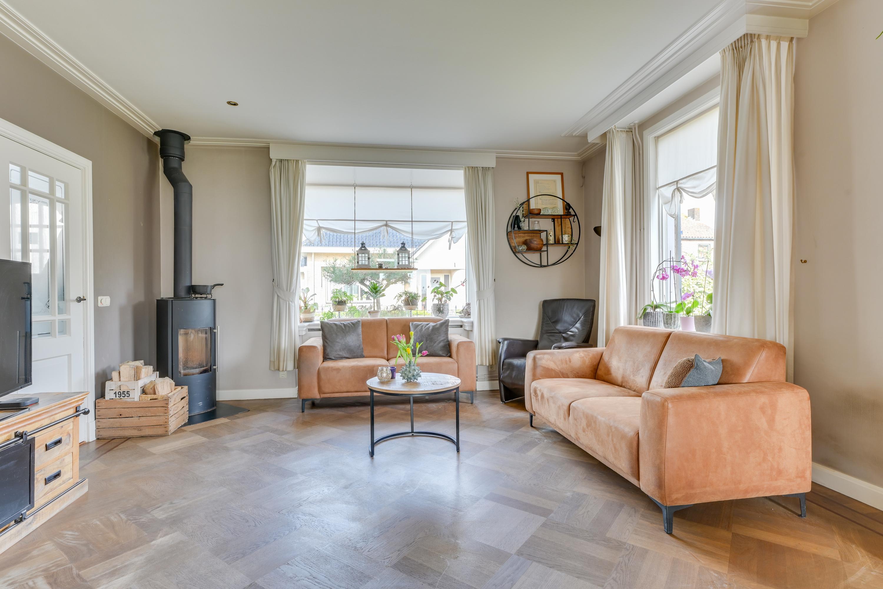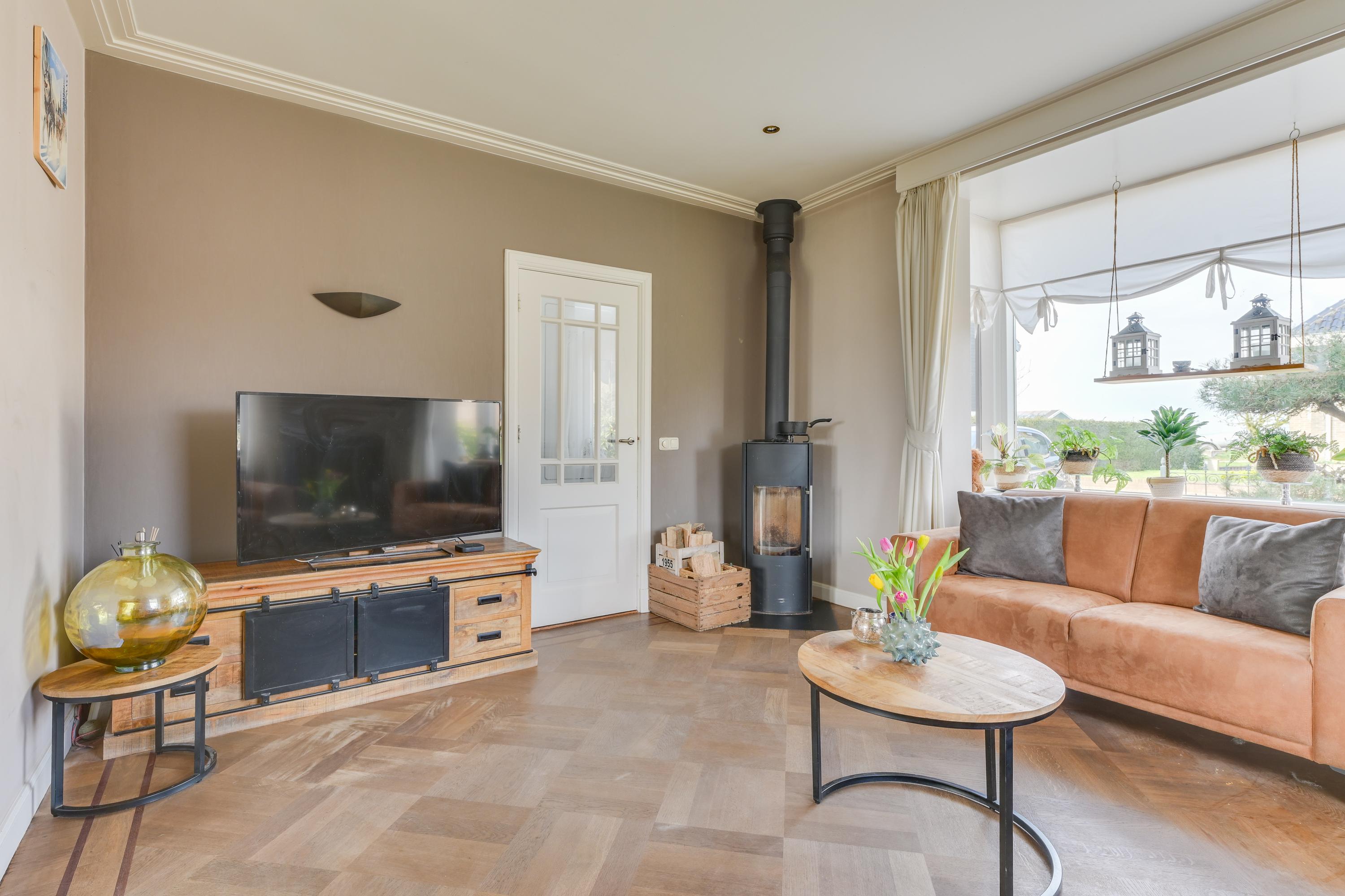 Via de entree kom je in de hal met meterkast, trapopgang en trapkast. De woonkamer is sfeervol en licht, mede dankzij de erker en de openslaande deuren richting de tuin. De ruimte is netjes afgewerkt met gestucte wanden en plafonds. De woonkamer is voorzien van een massief houten vloer en een houtkachel, wat zorgt voor extra warmte en sfeer. Ook is deze ruimte te verwarmen en koelen door middel van een airco en middels de schuifpui loop je zo het overdekte terras op.