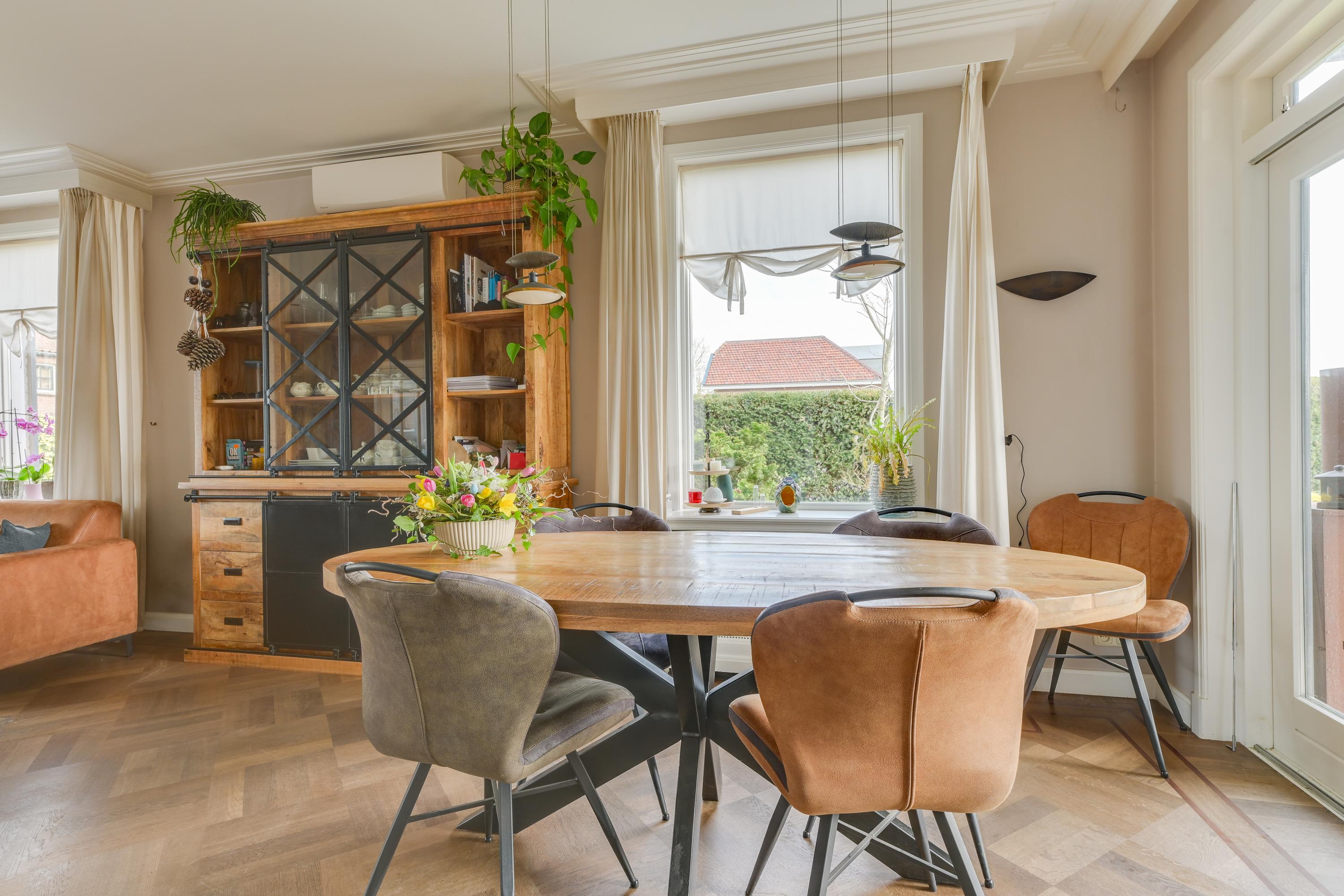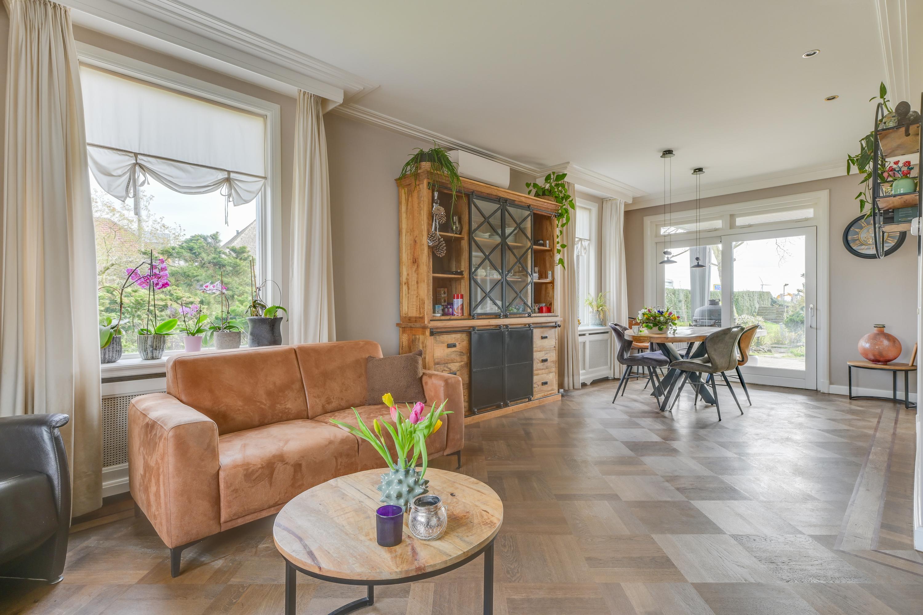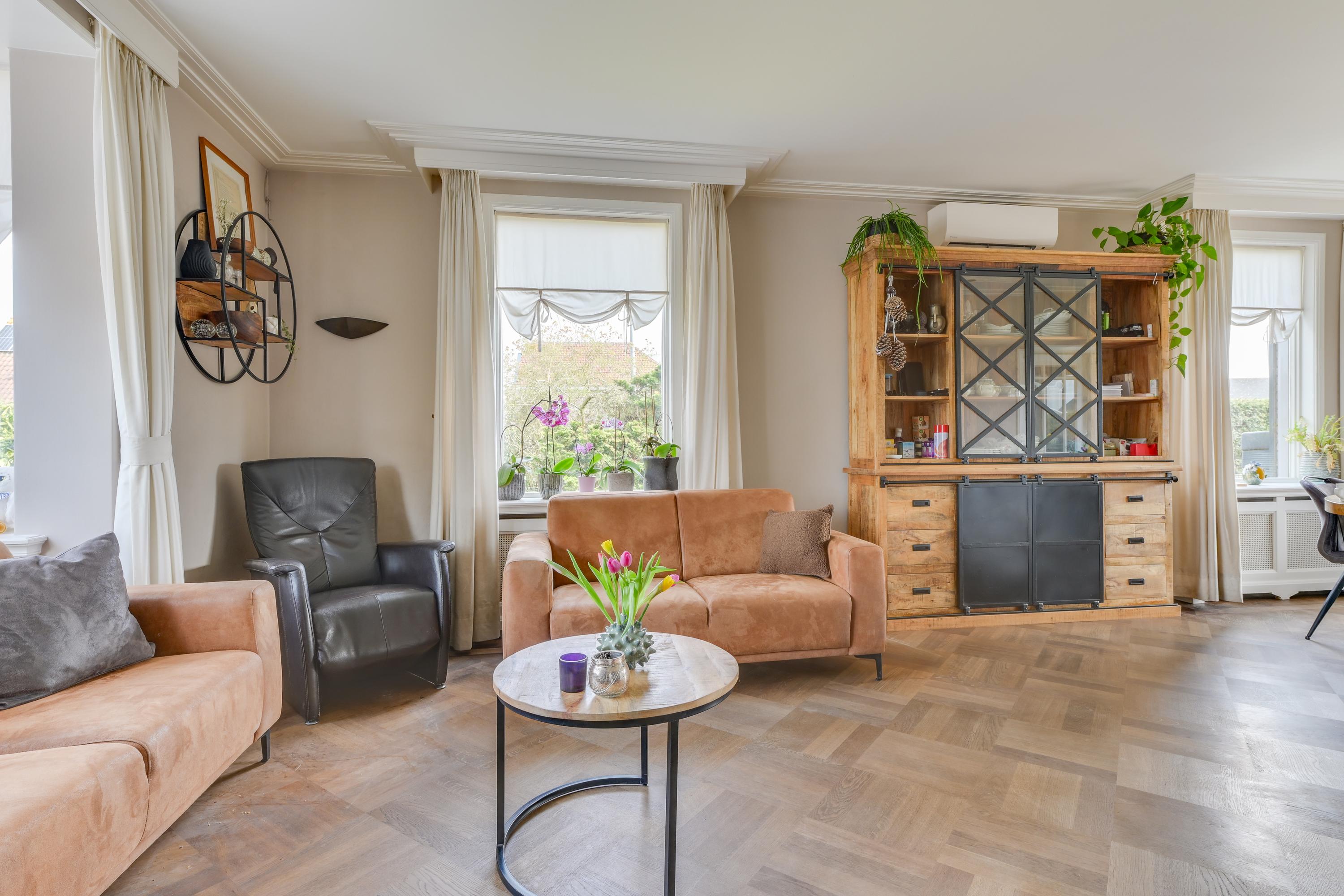 Via de entree kom je in de hal met meterkast, trapopgang en trapkast. De woonkamer is sfeervol en licht, mede dankzij de erker en de openslaande deuren richting de tuin. De ruimte is netjes afgewerkt met gestucte wanden en plafonds. De woonkamer is voorzien van een massief houten vloer en een houtkachel, wat zorgt voor extra warmte en sfeer. Ook is deze ruimte te verwarmen en koelen door middel van een airco en middels de schuifpui loop je zo het overdekte terras op.
