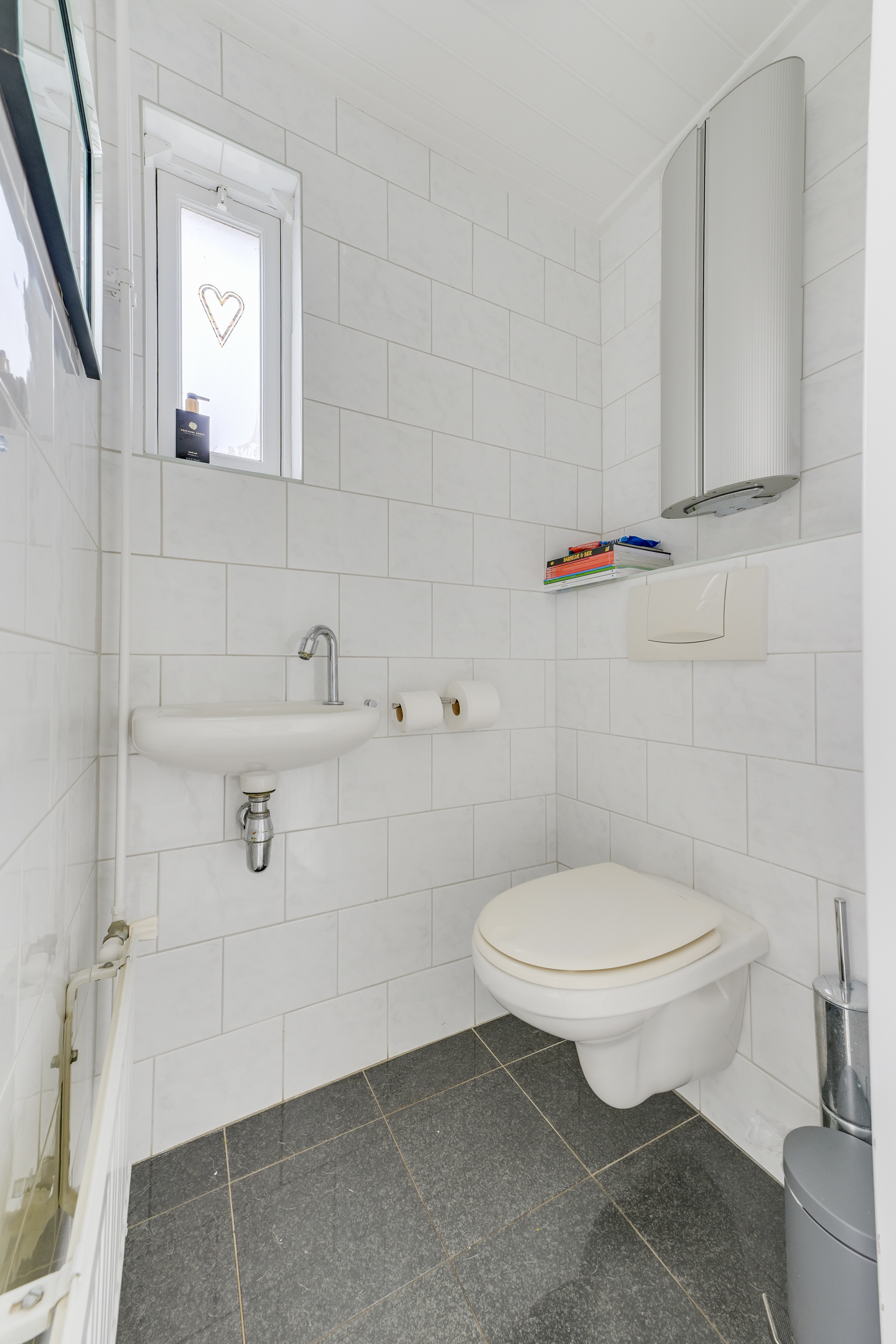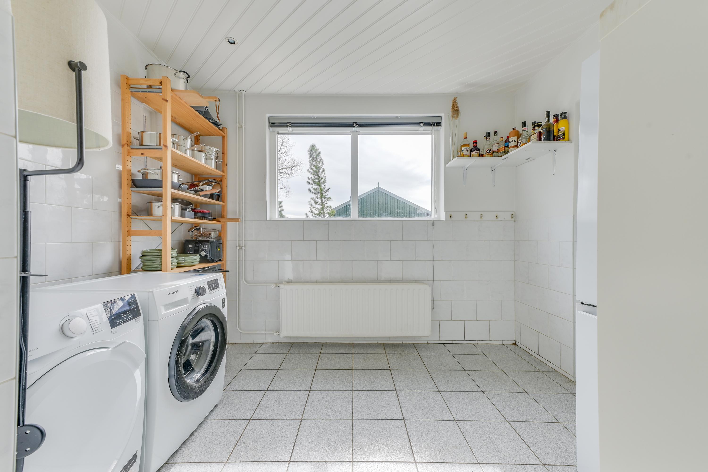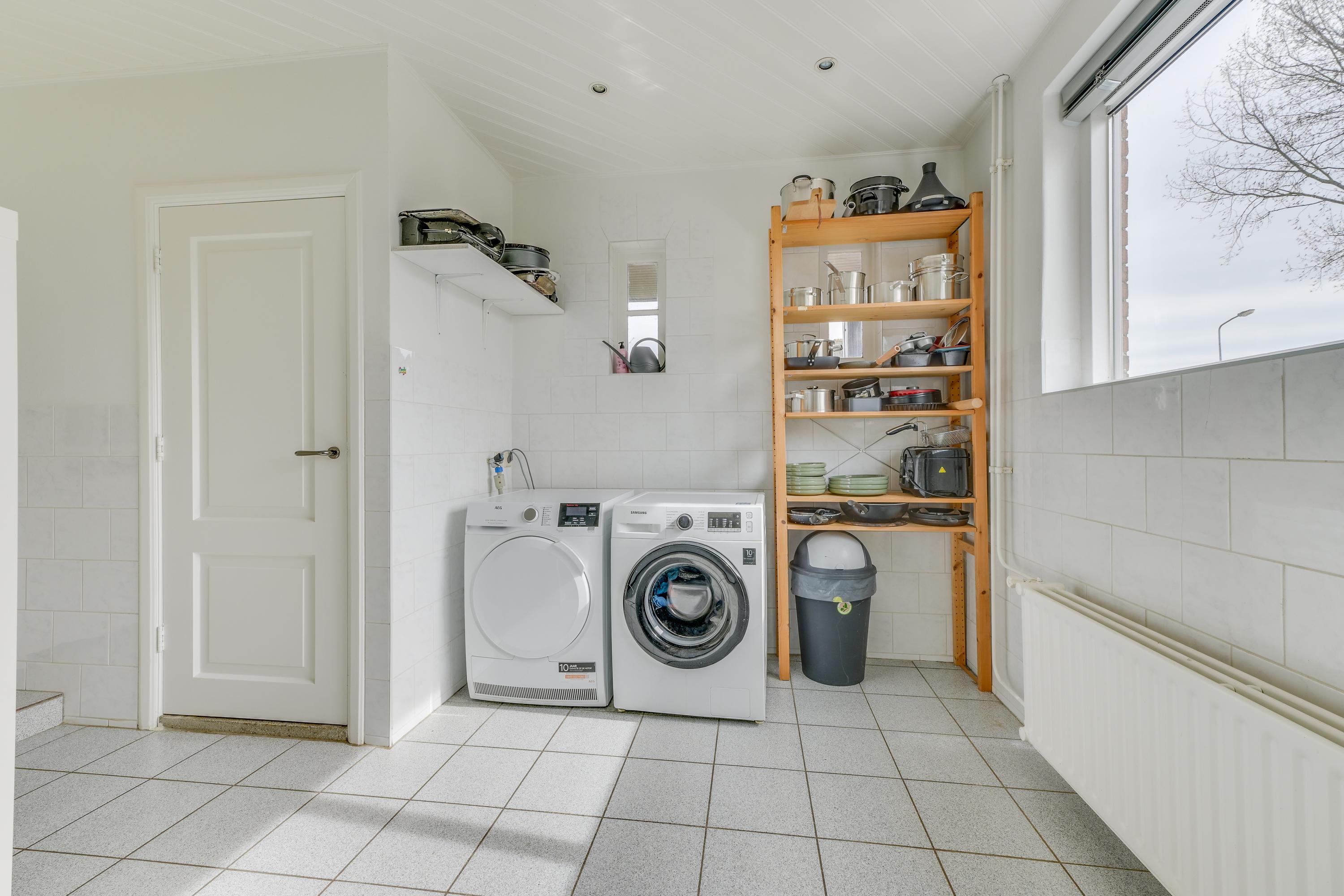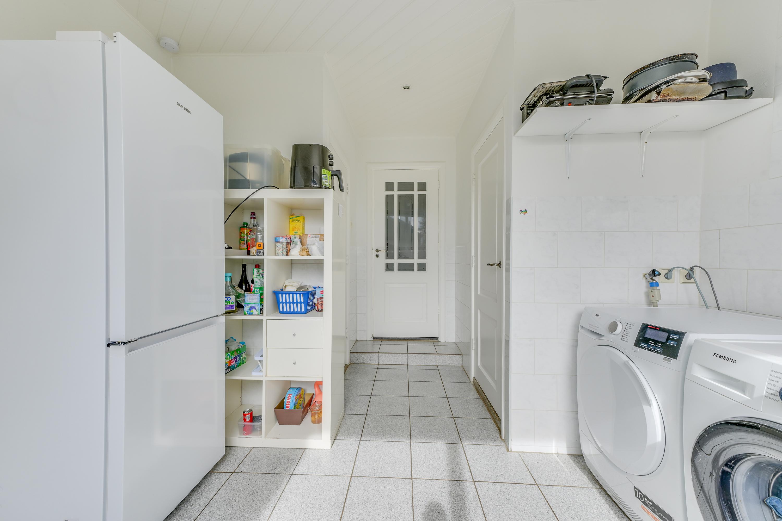 Aansluitend vind je de bijkeuken met aansluitingen voor wasmachine en droger. Hier bevindt zich tevens een bergkast. Het toilet op de begane grond is aanwezig en functioneel.