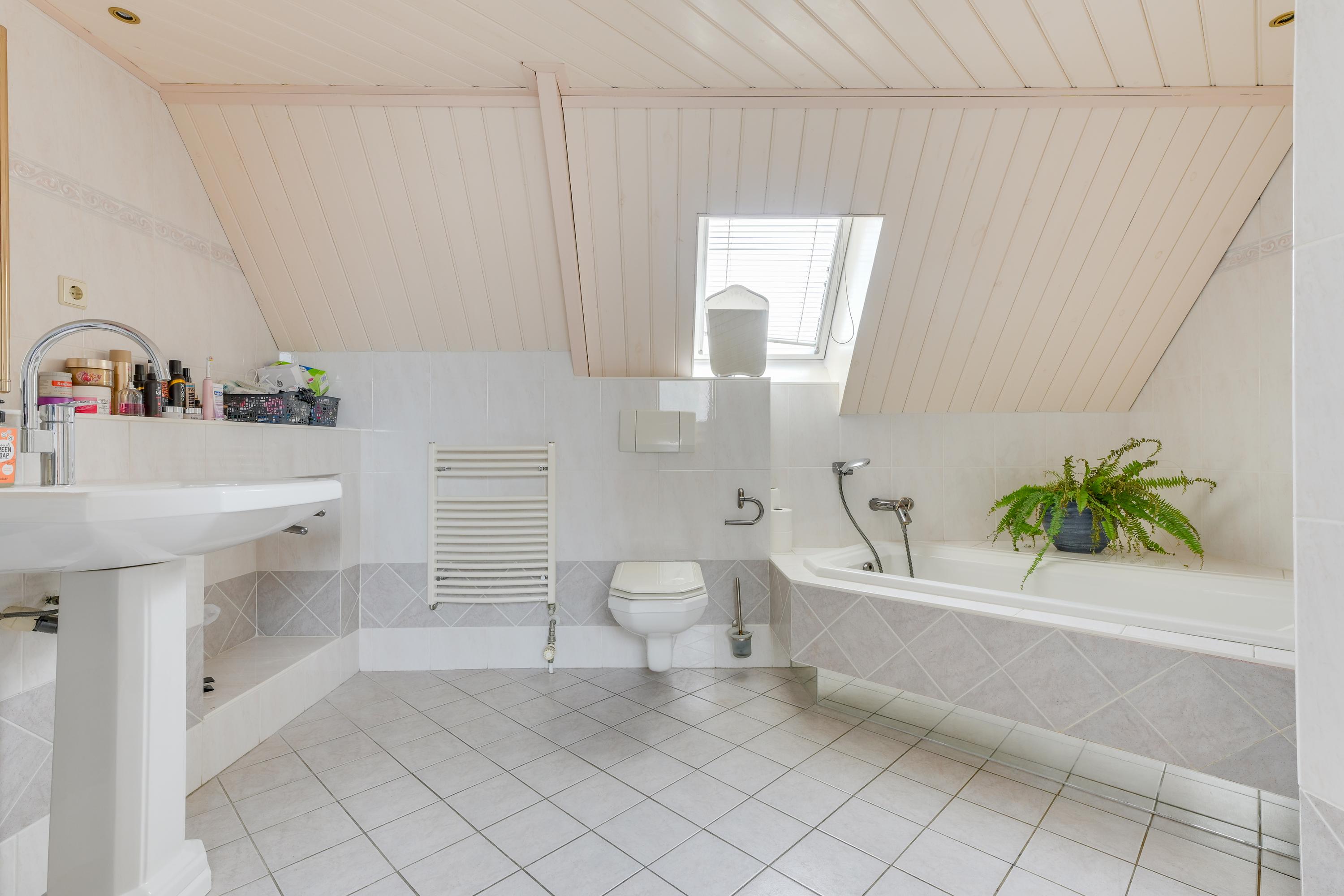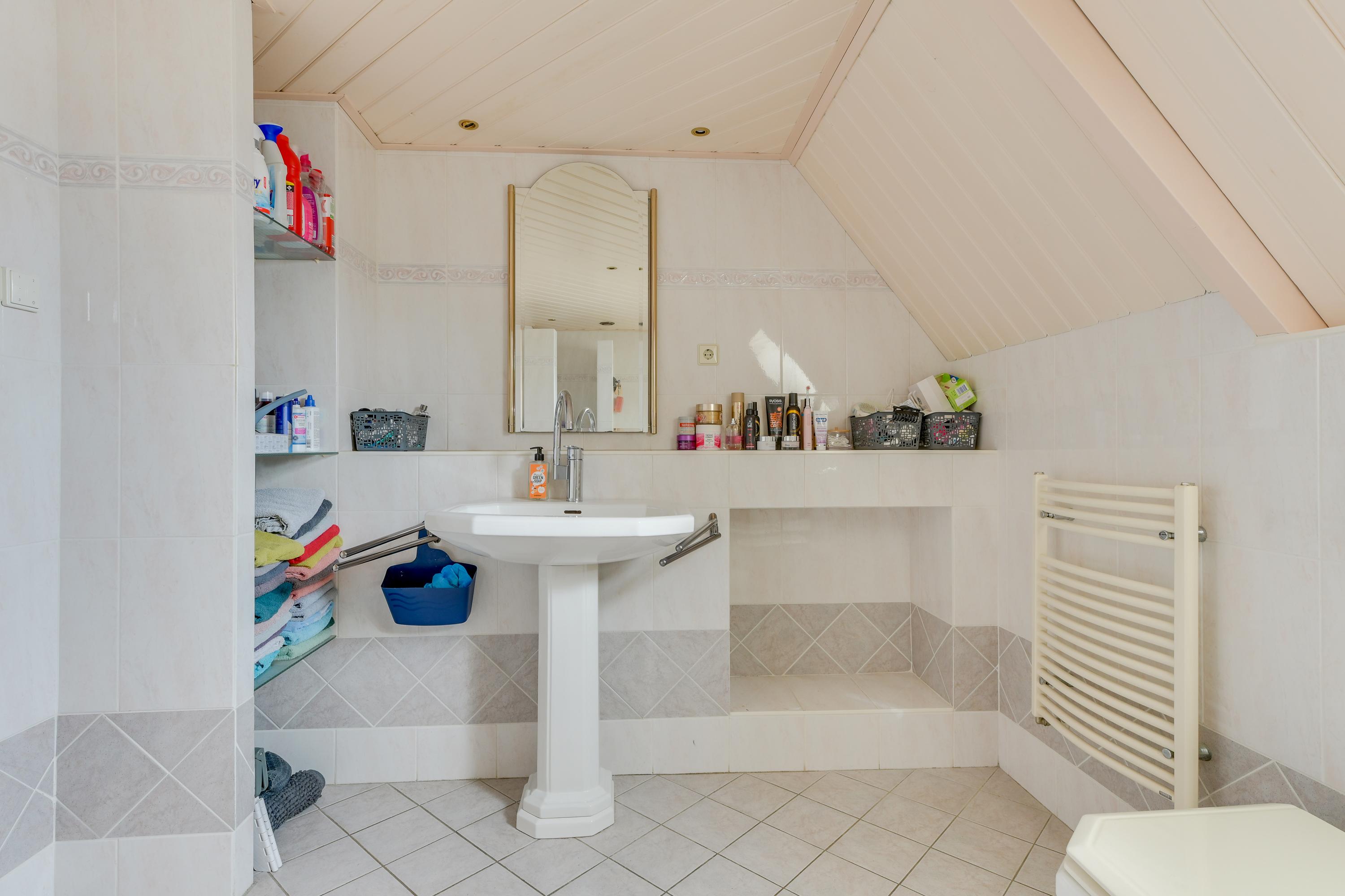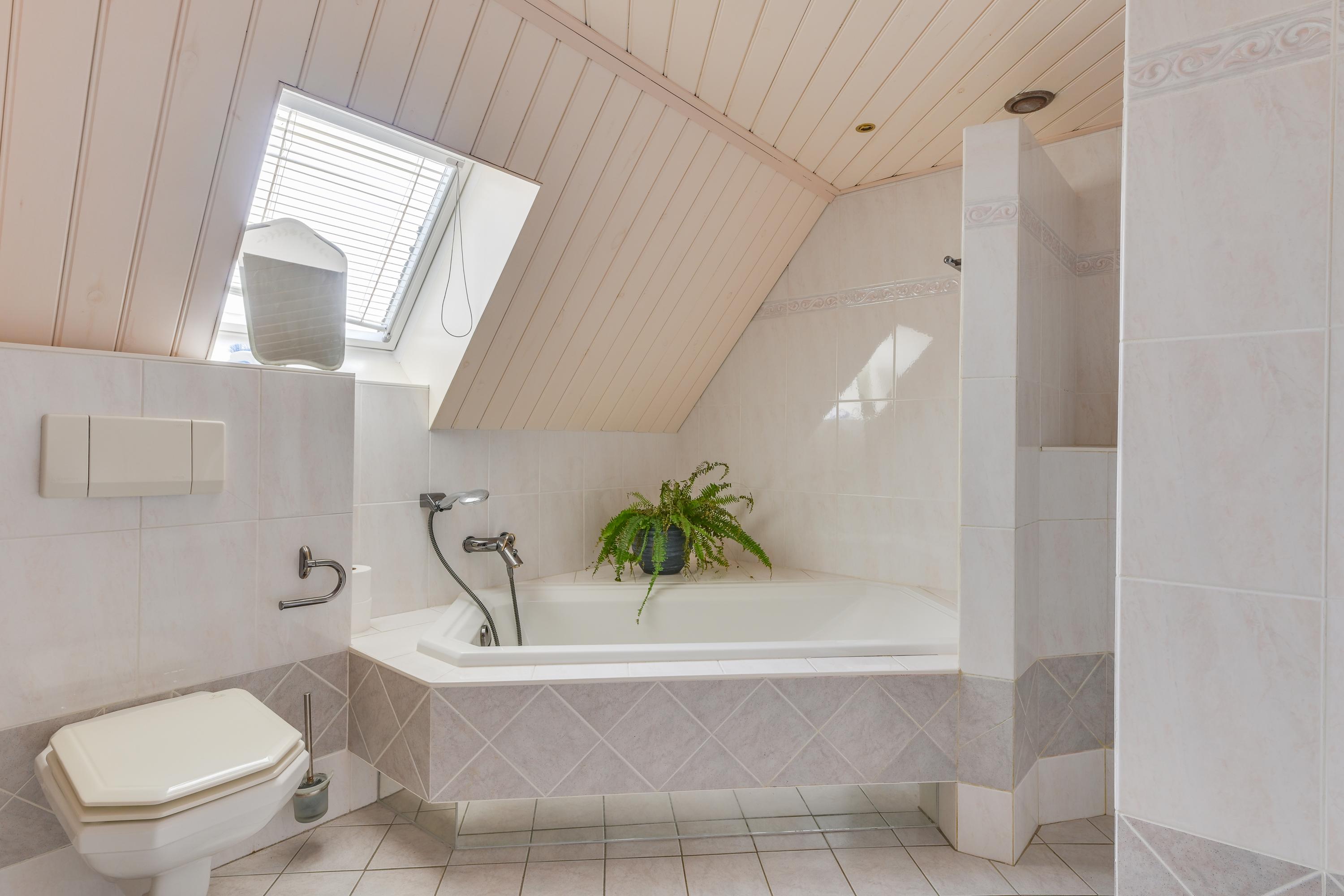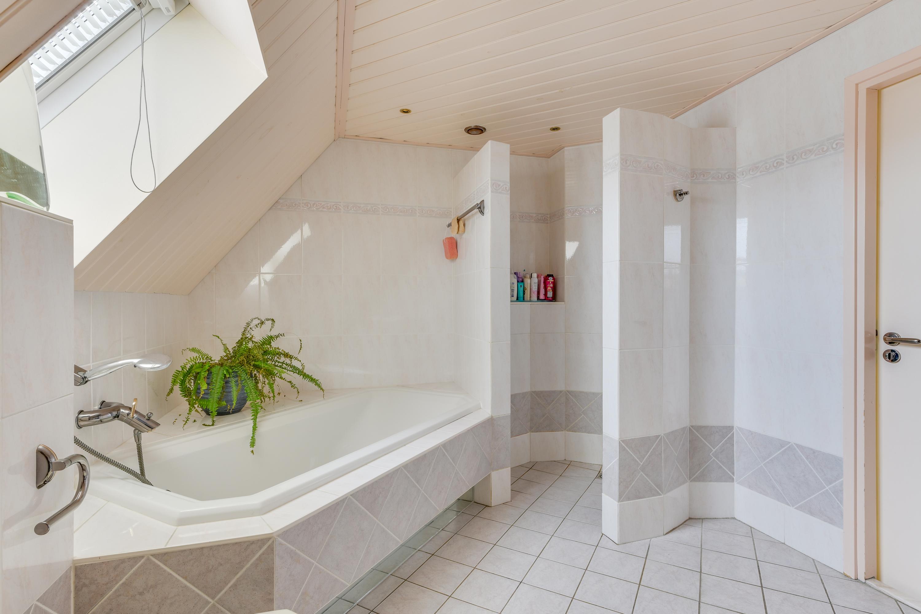 De badkamer is royaal van opzet en uitgerust met een ligbad, inloopdouche, toilet, wastafel en designradiator. Deze ruimte is functioneel en biedt mogelijkheden.