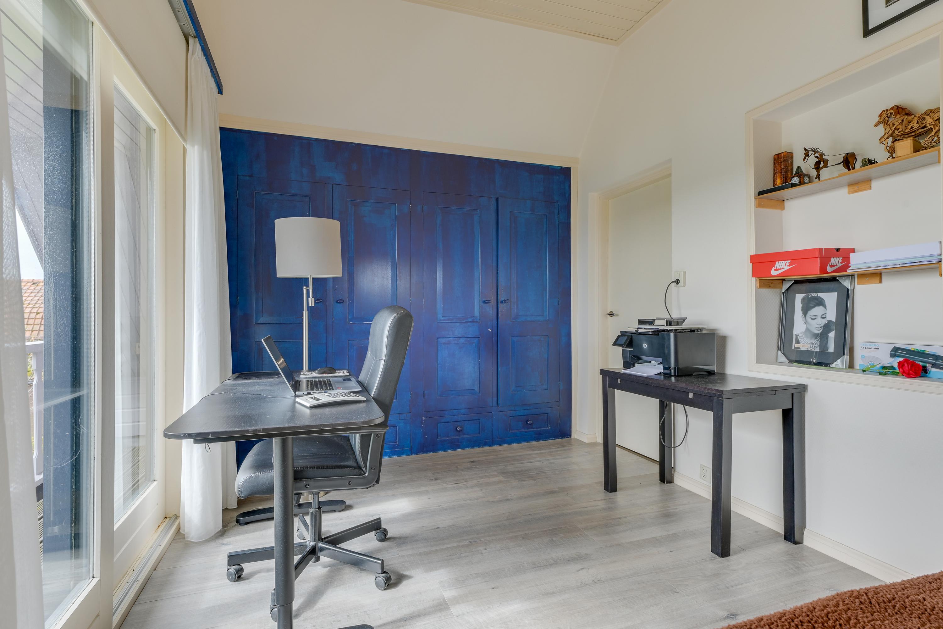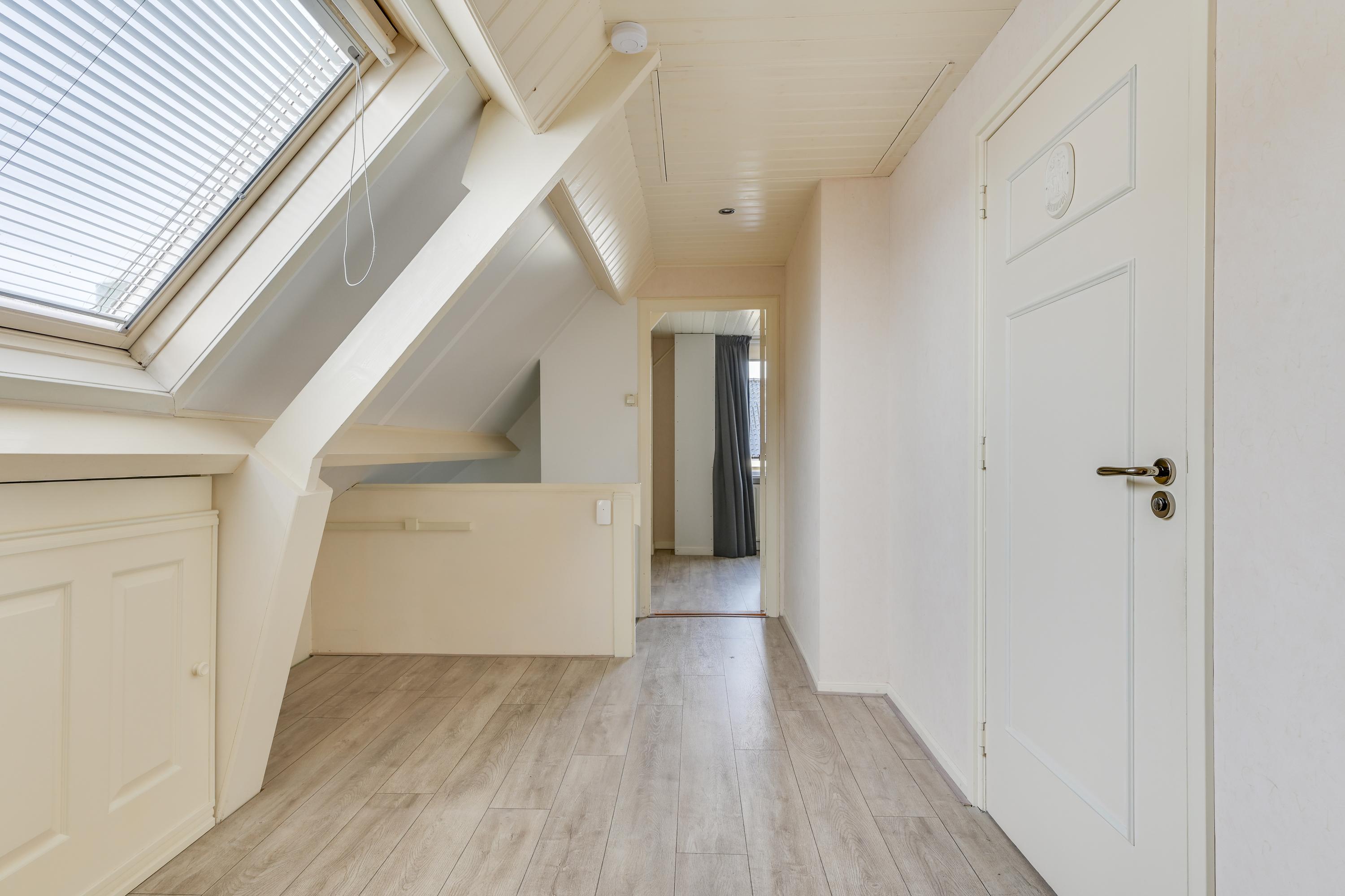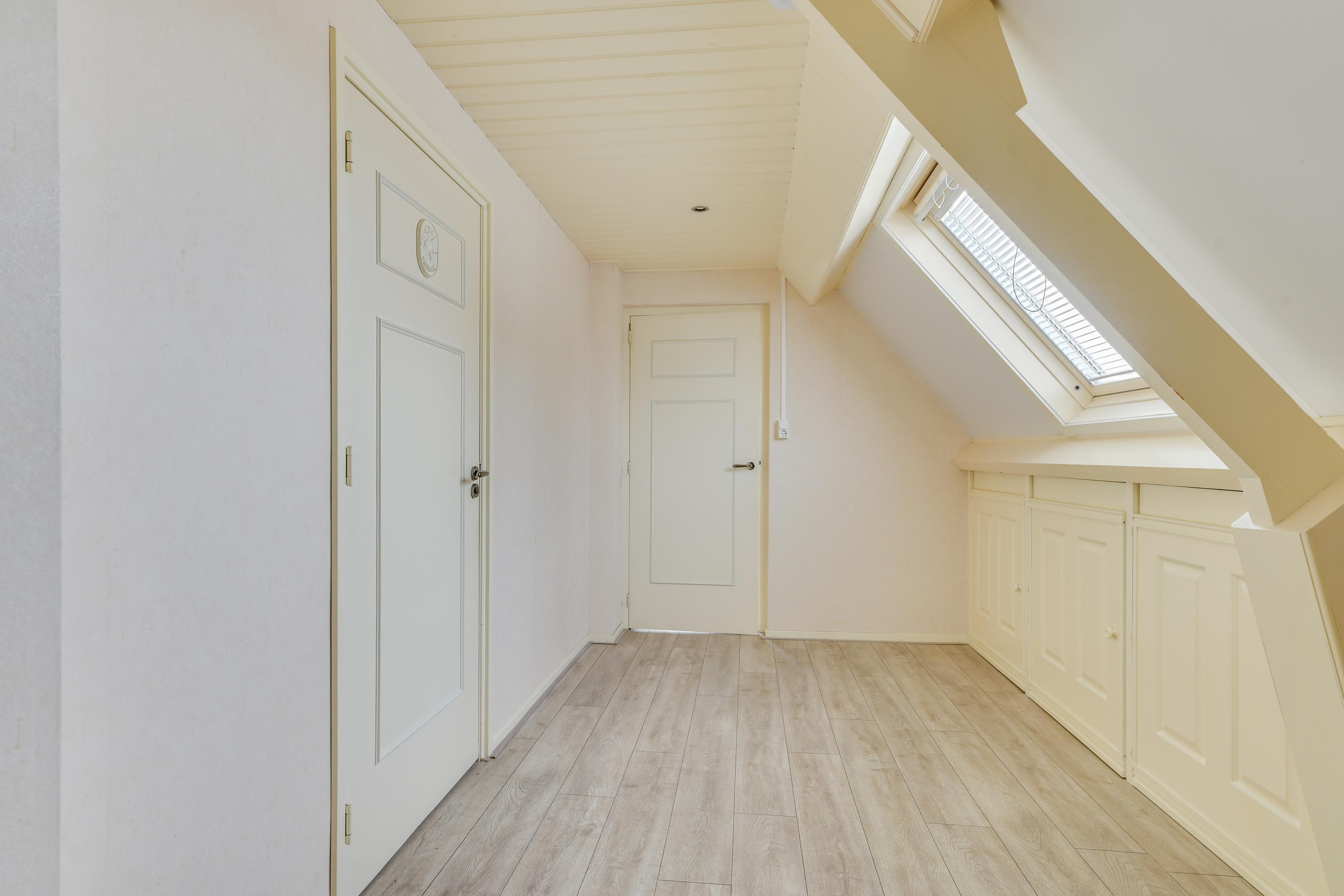 De eerste verdieping beschikt over een ruime overloop met praktische bergruimte achter de knieschotten en vaste kasten. Middels het dakraam is er veel licht op de overloop.