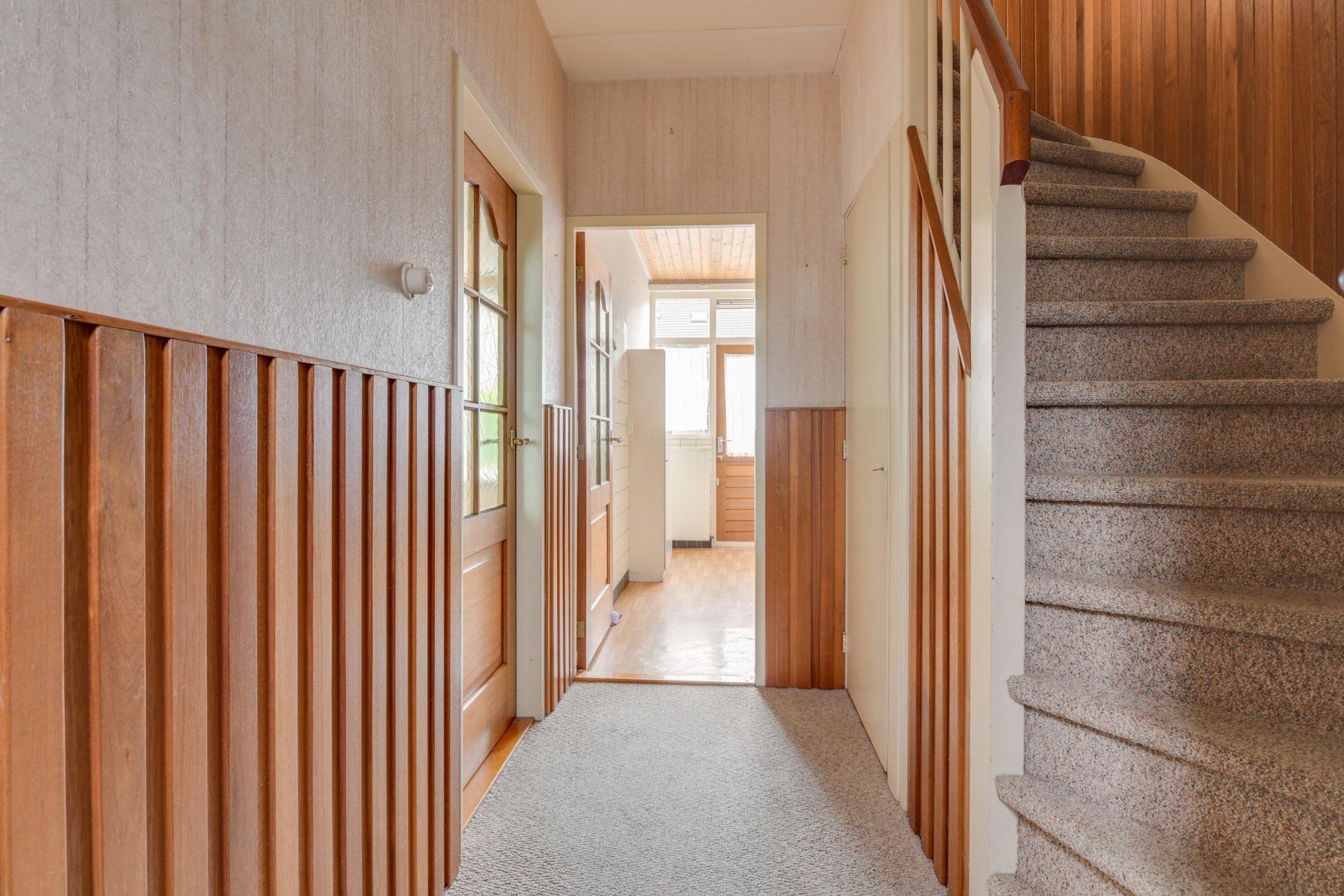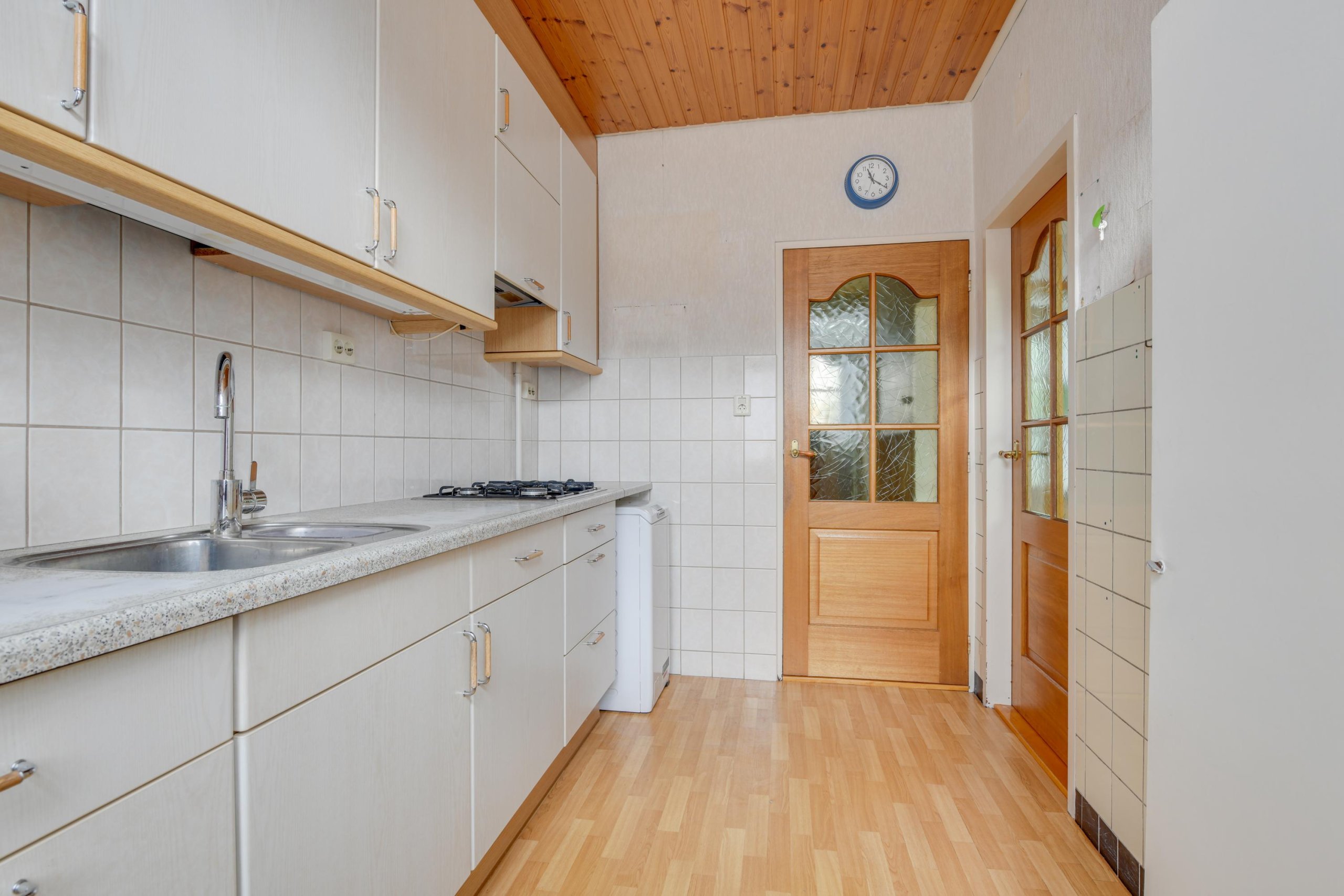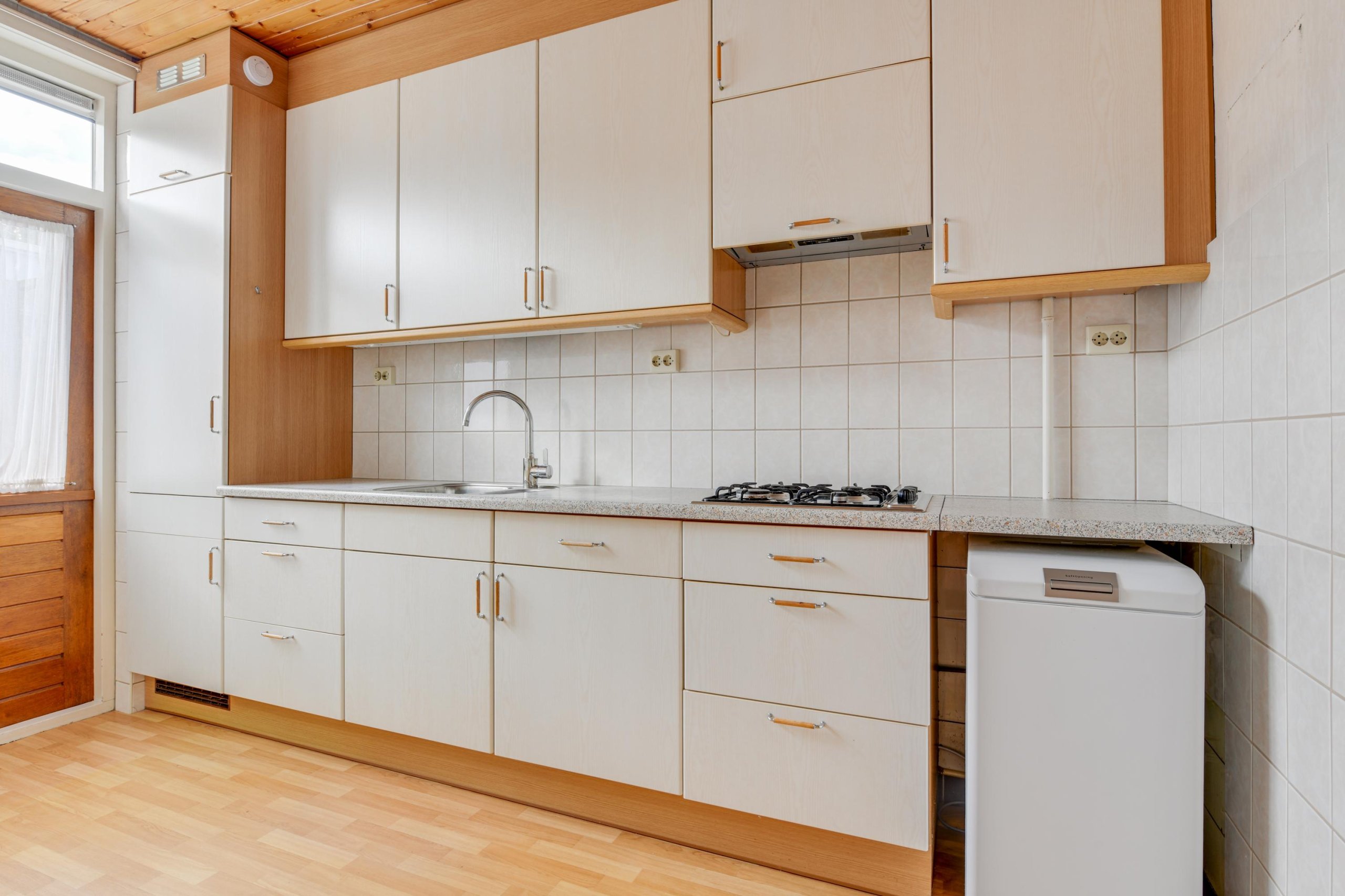 Indeling: Via de voordeur kom je in de hal met de meterkast, trapopgang, trapkast en het toilet. Vervolgens bereik je de heerlijk lichte doorzon woonkamer. Door de grote raampartijen heeft de zon alle ruimte om naar binnen te schijnen. De dichte keuken is voorzien van een eenvoudige inrichting. Bij een eventuele verbouwing van de keuken wordt vaak de muur tussen de woonkamer en de keuken verwijderd waardoor er ruimte ontstaat voor een L-vormige keukenopstelling.