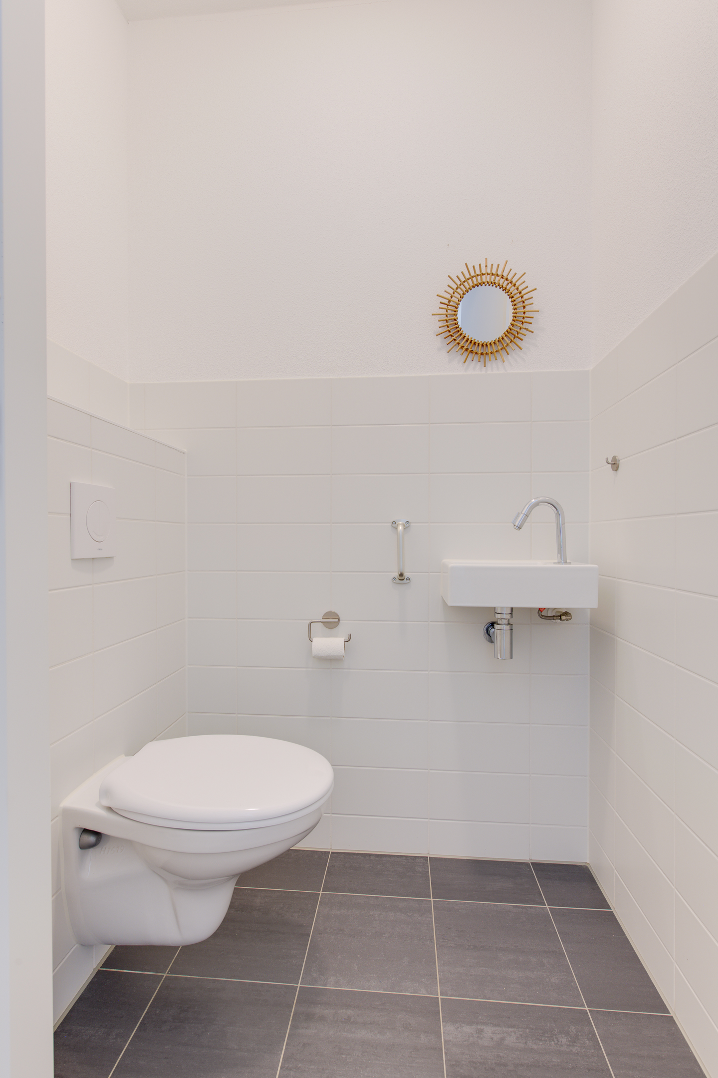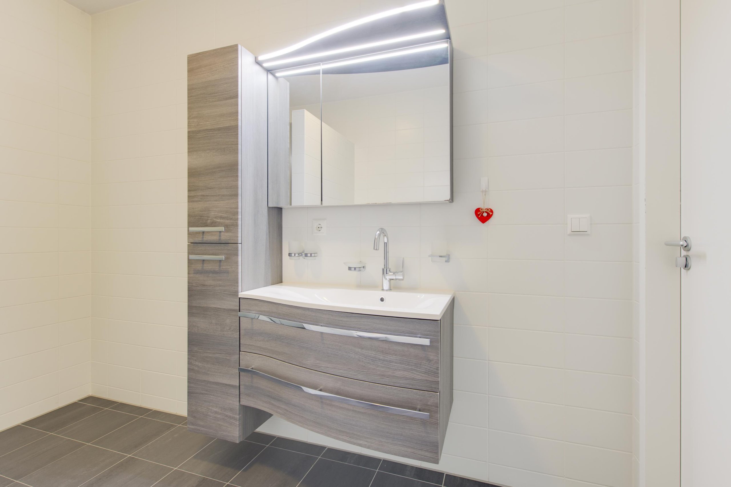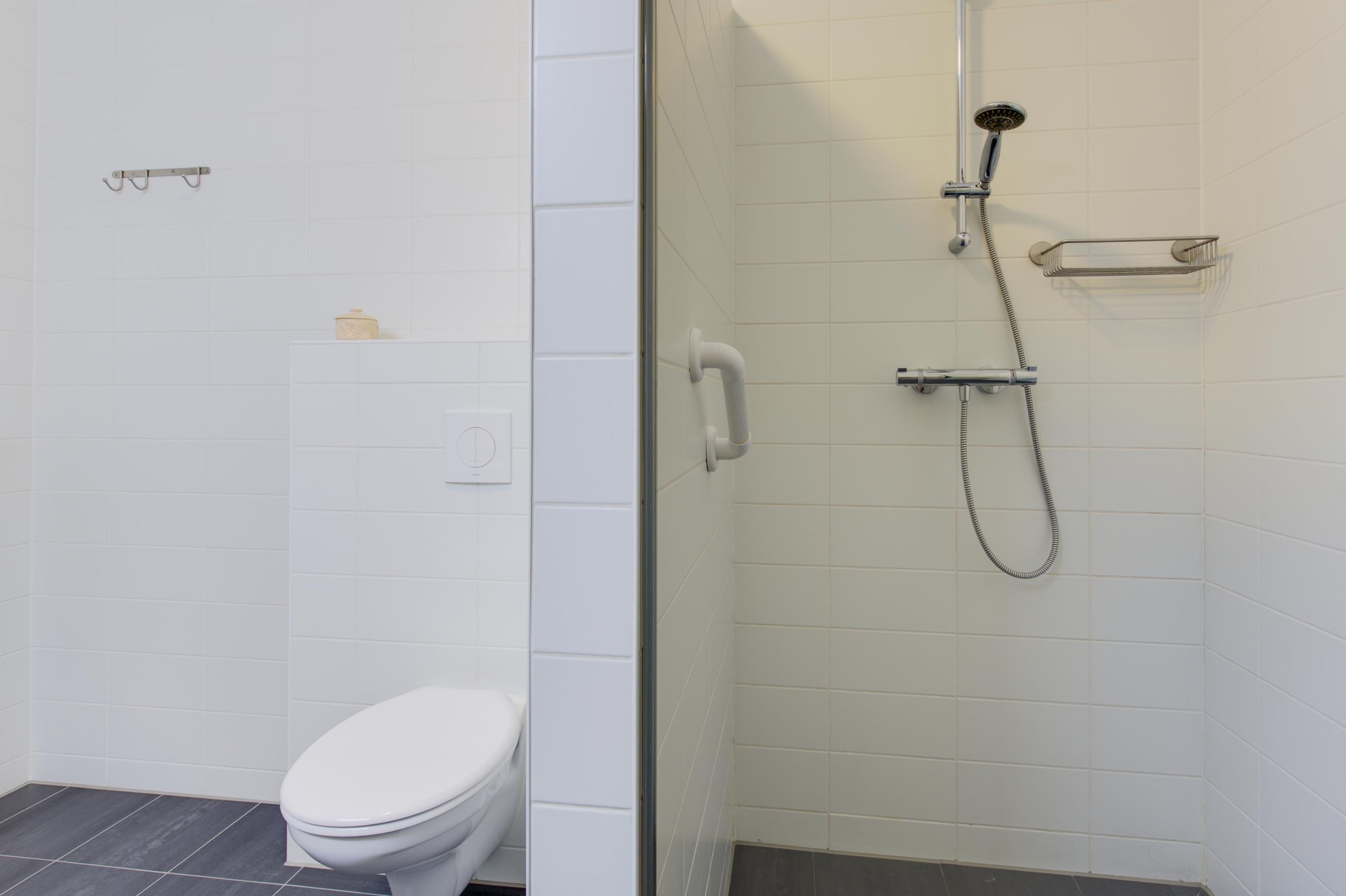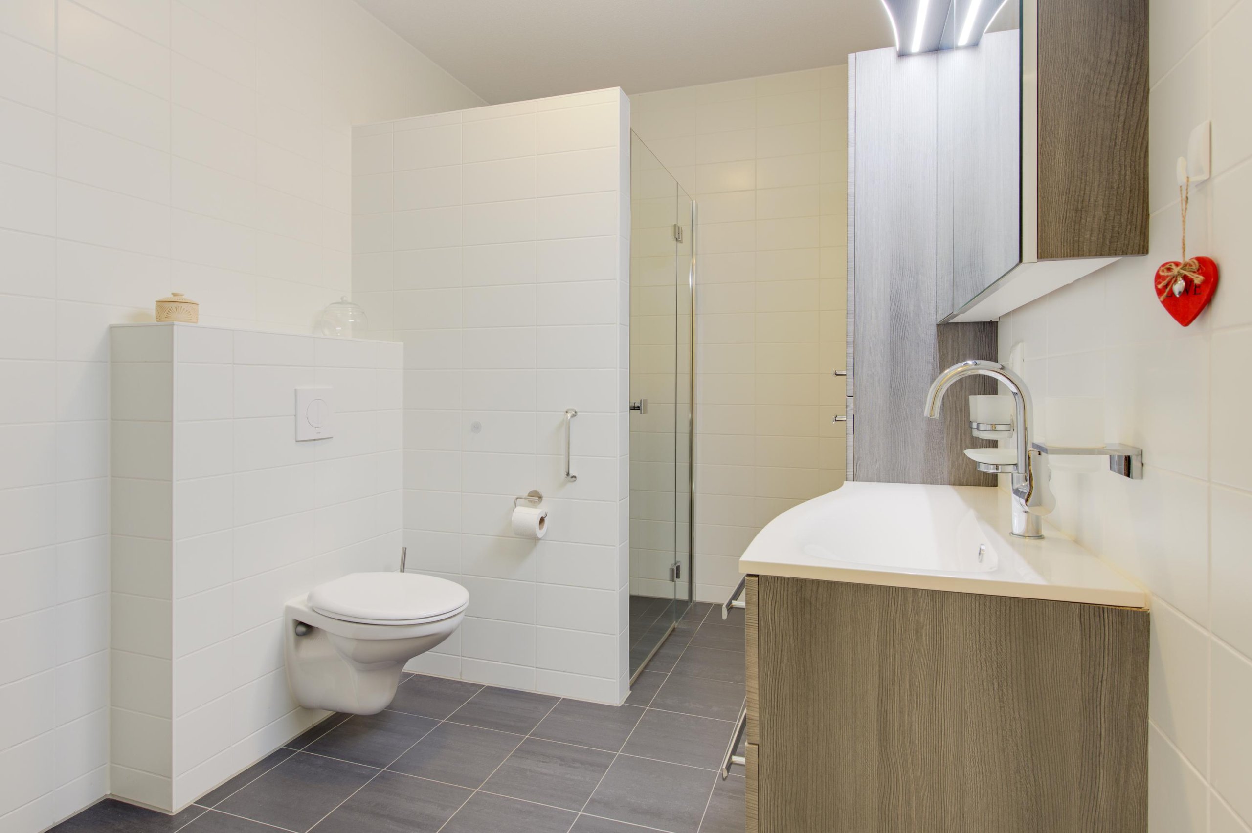De moderne badkamer is volledig betegeld en uitgerust met een inloopdouche, wastafel en toilet. Daarnaast is er een separaat gastentoilet aanwezig.