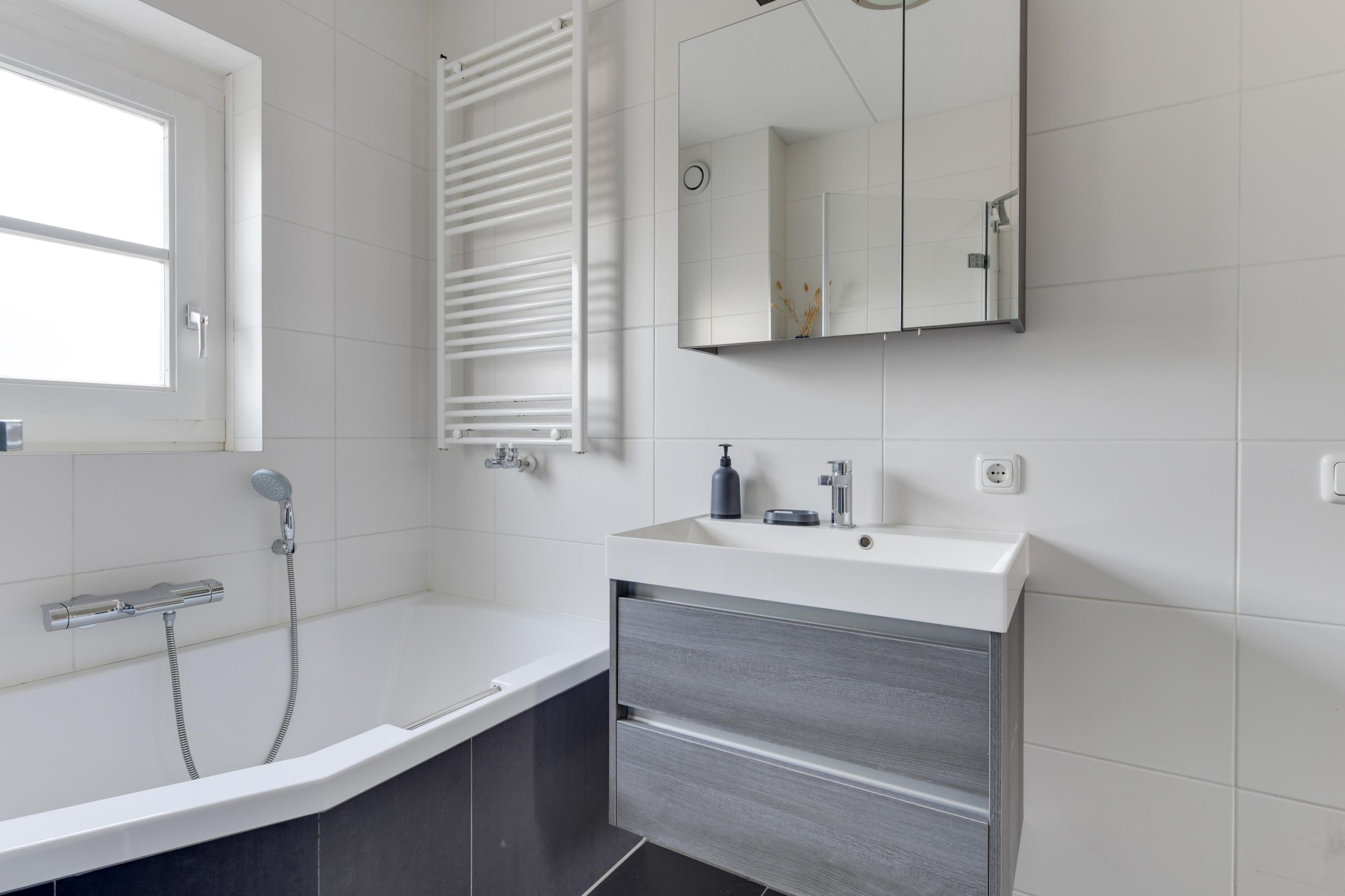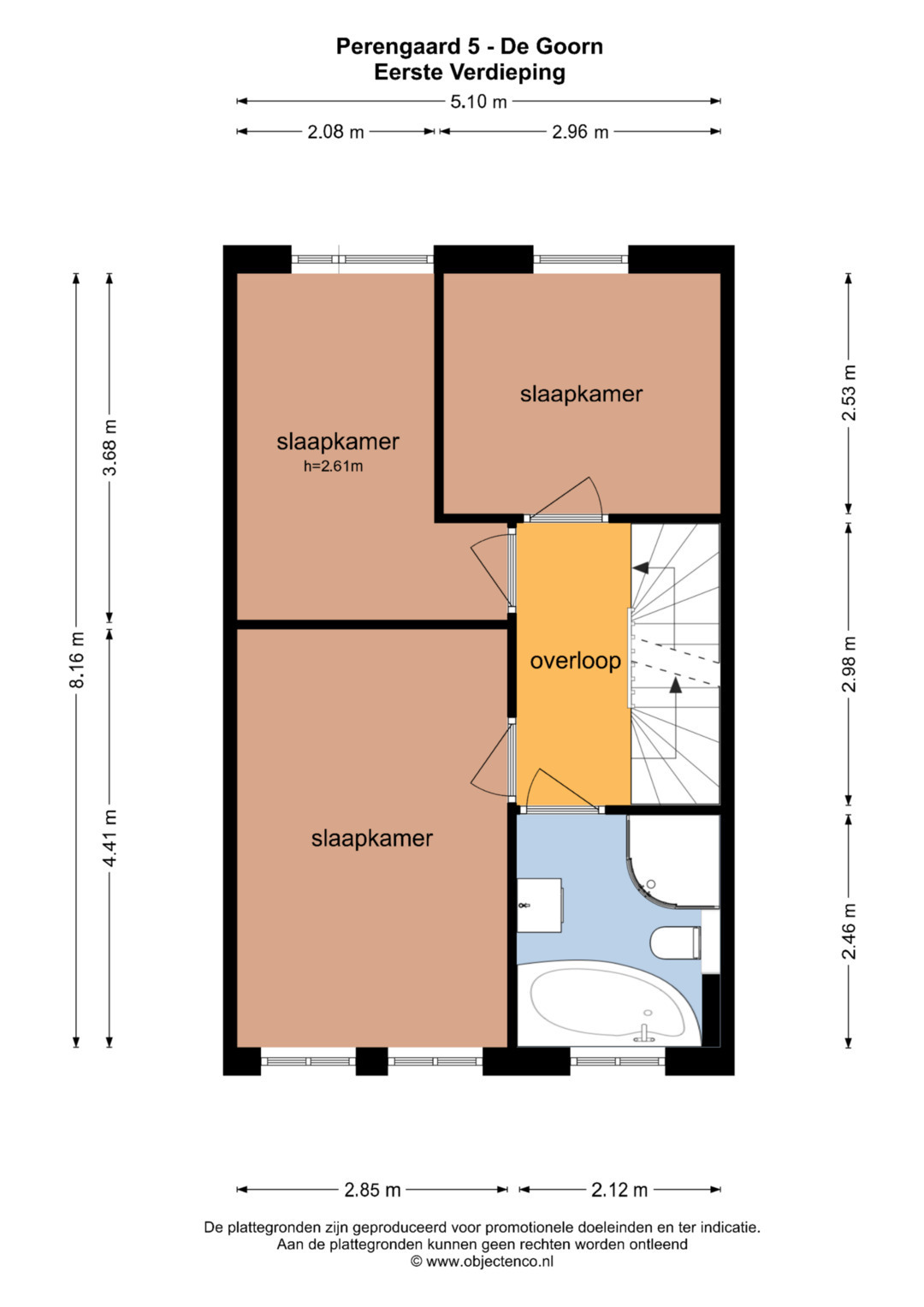 Op de eerste verdieping zijn drie slaapkamers, allemaal netjes afgewerkt en prima van formaat. De badkamer is modern en compleet: met een douche, hoekbad, toilet en wastafel. Zowel de begane grond als de badkamer zijn voorzien van vloerverwarming, wat zorgt voor extra comfort.