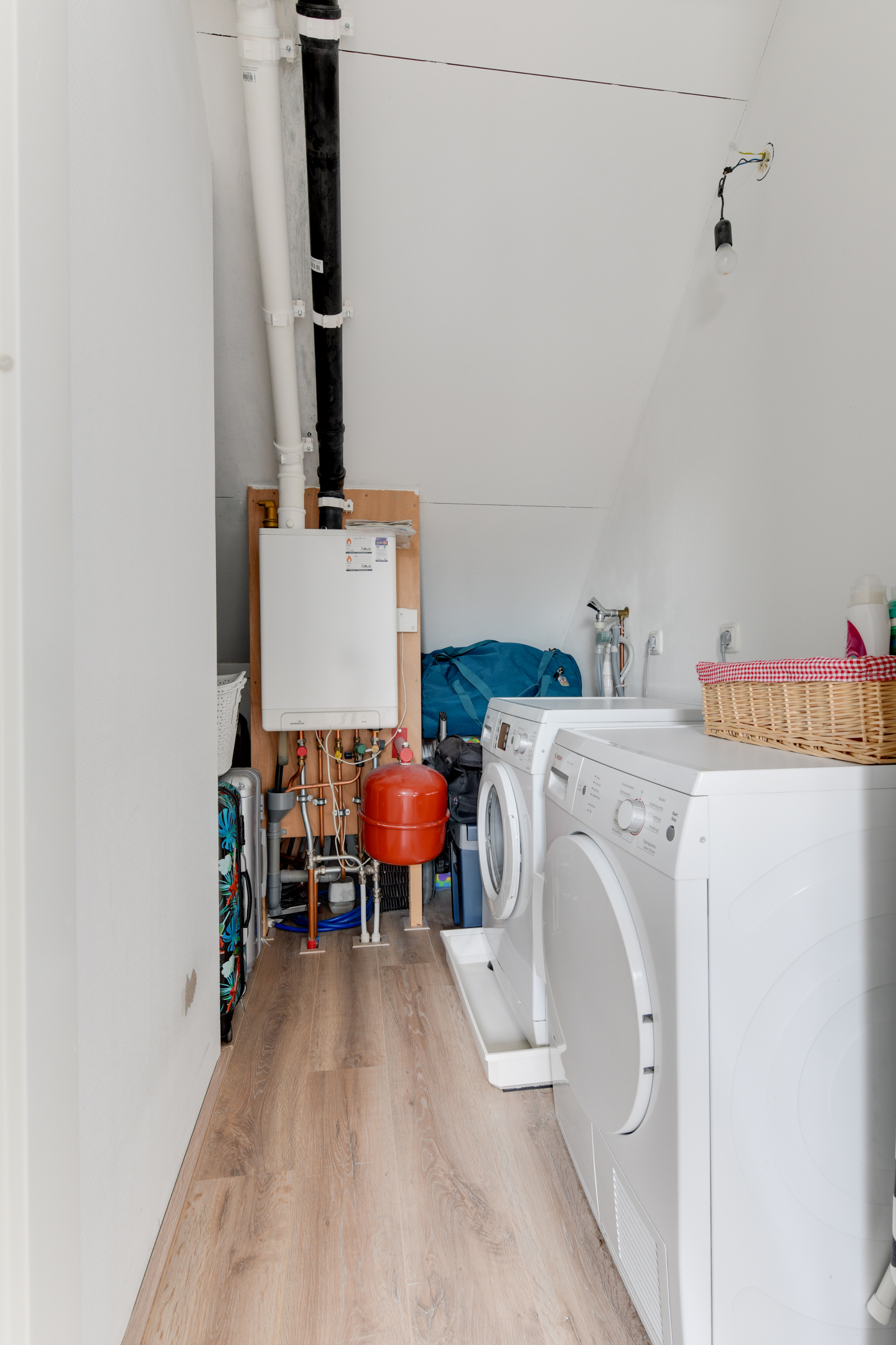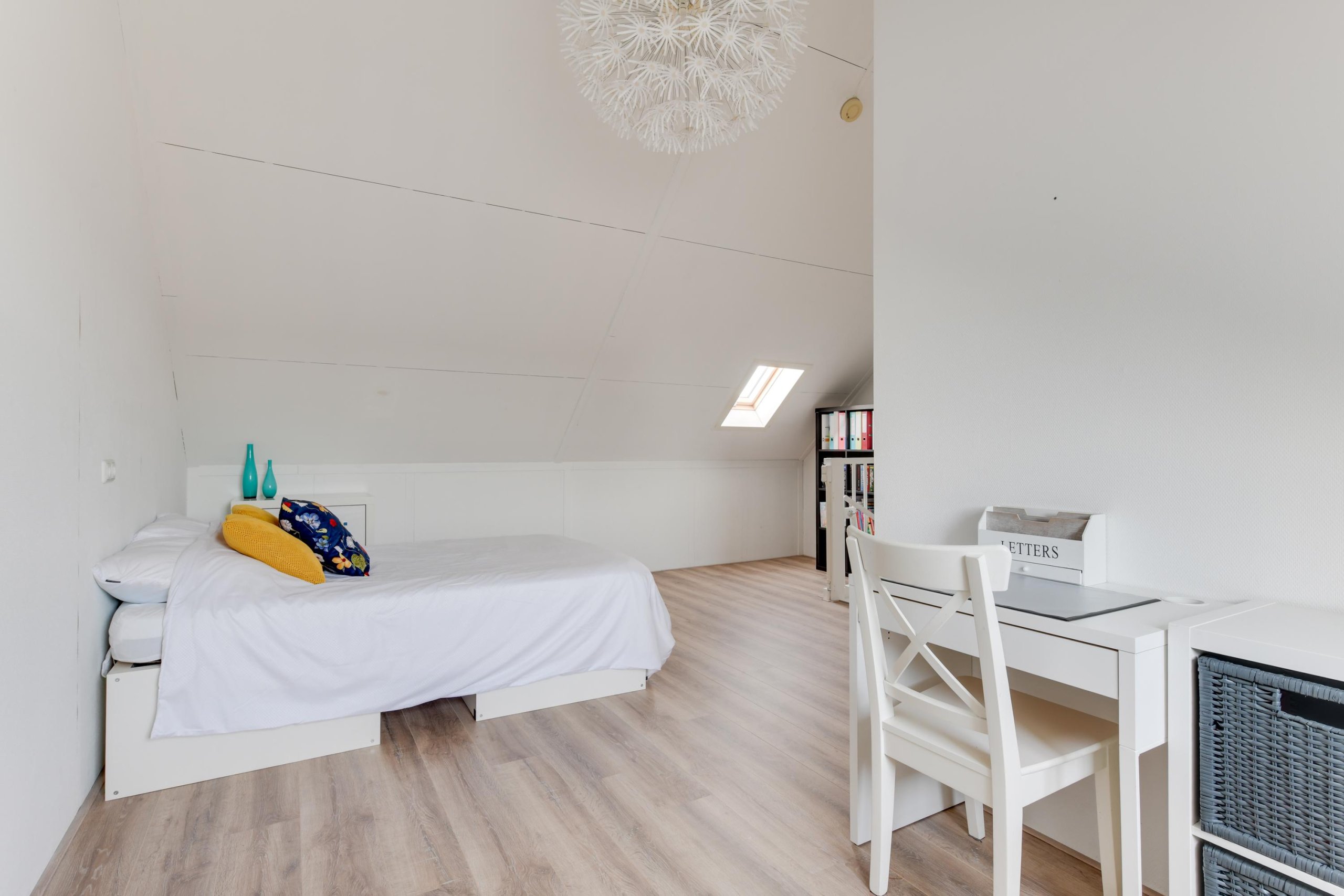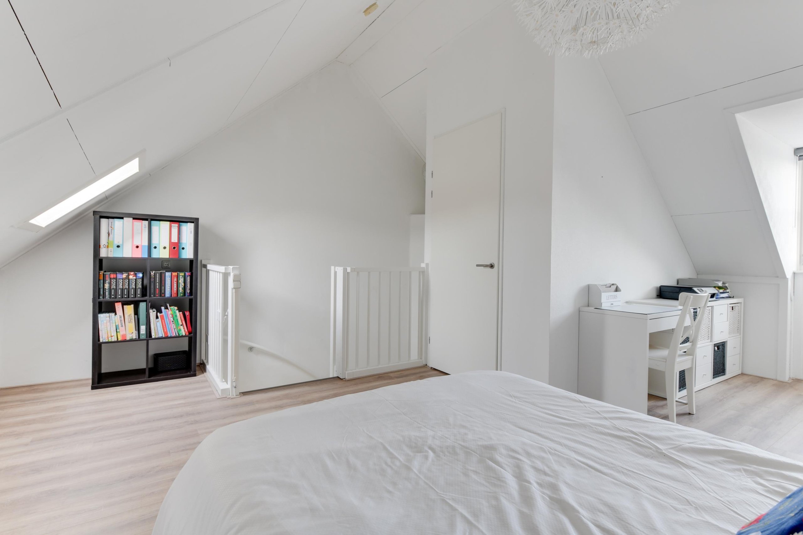 De vaste trap brengt je naar de tweede verdieping. Deze ruime zolder is nu ingericht als slaapkamer, maar kan ook perfect dienen als werkkamer of hobbyruimte. Hier vind je ook de technische ruimte met cv-installatie (Intergas) en aansluiting voor de wasmachine.