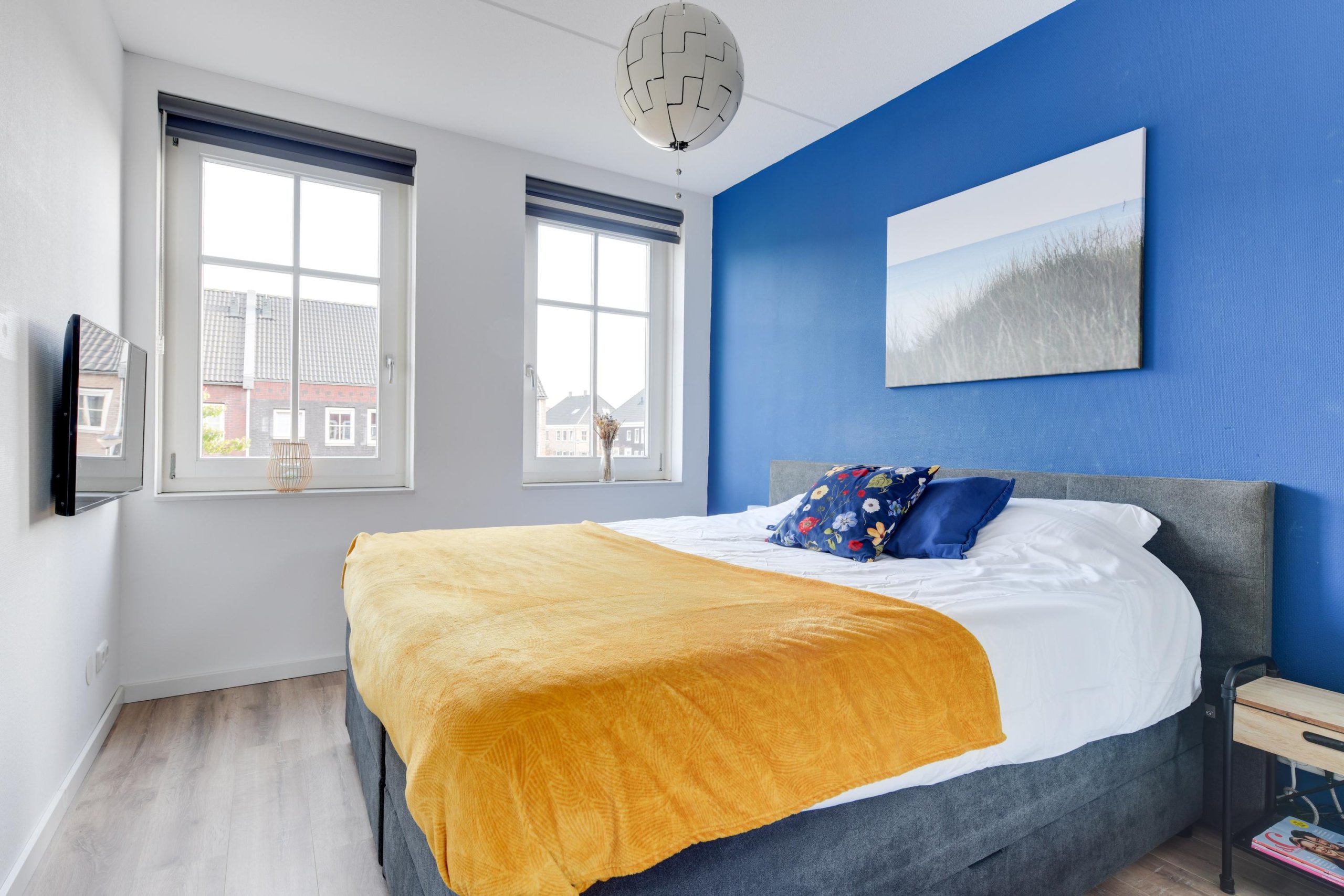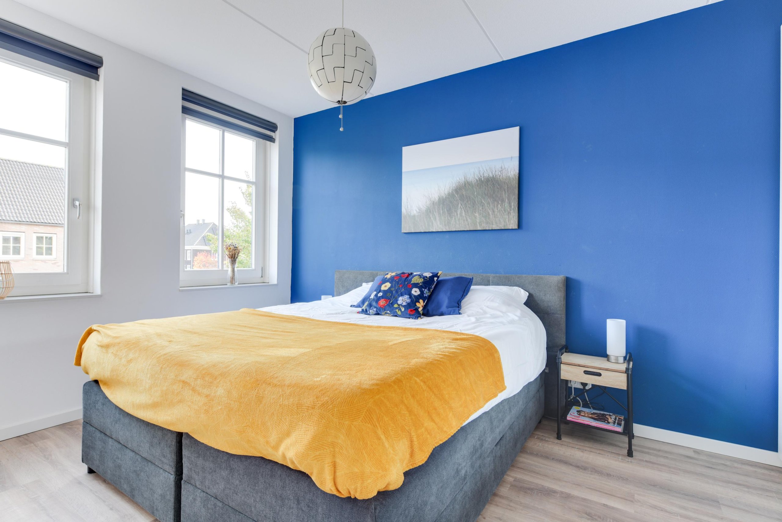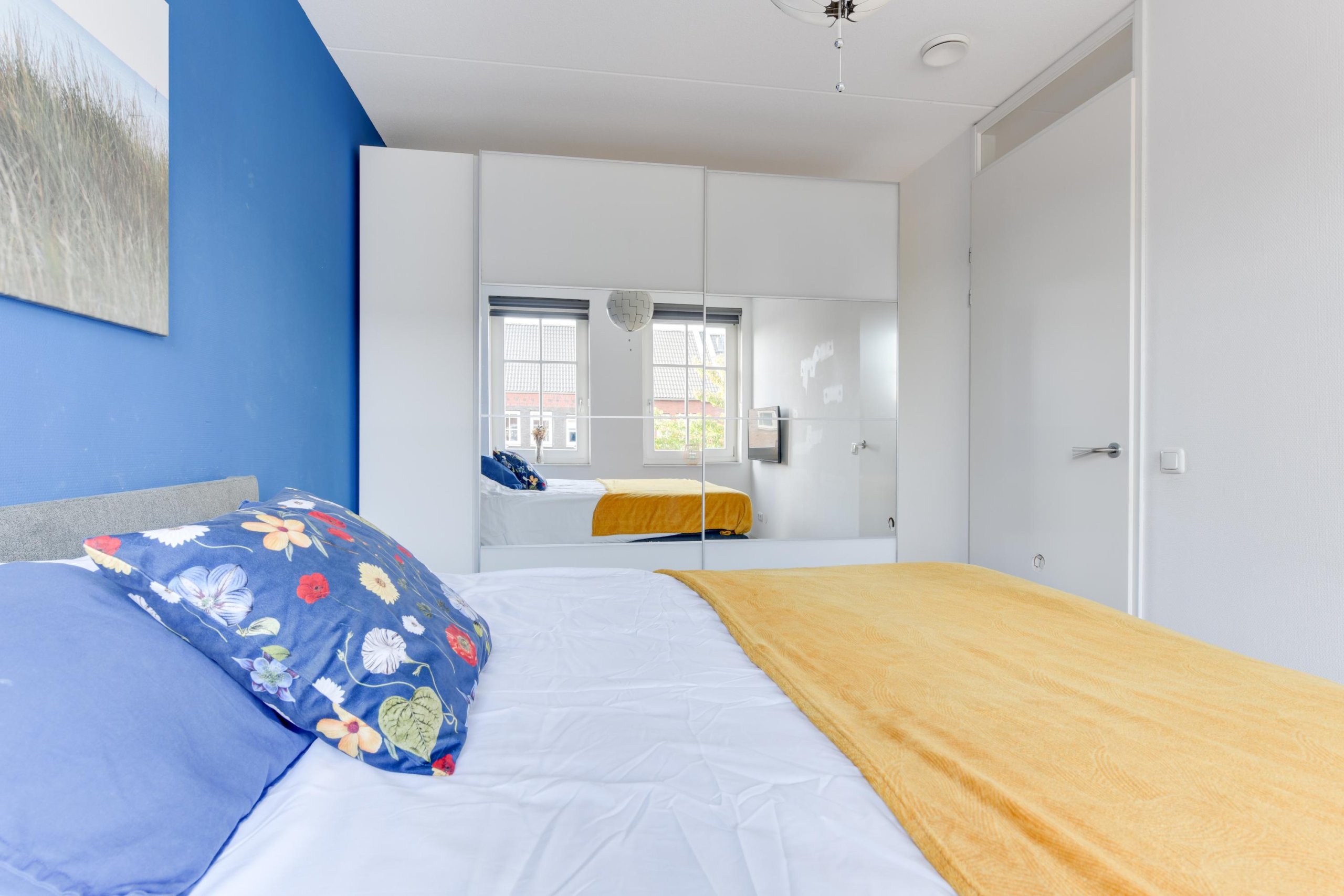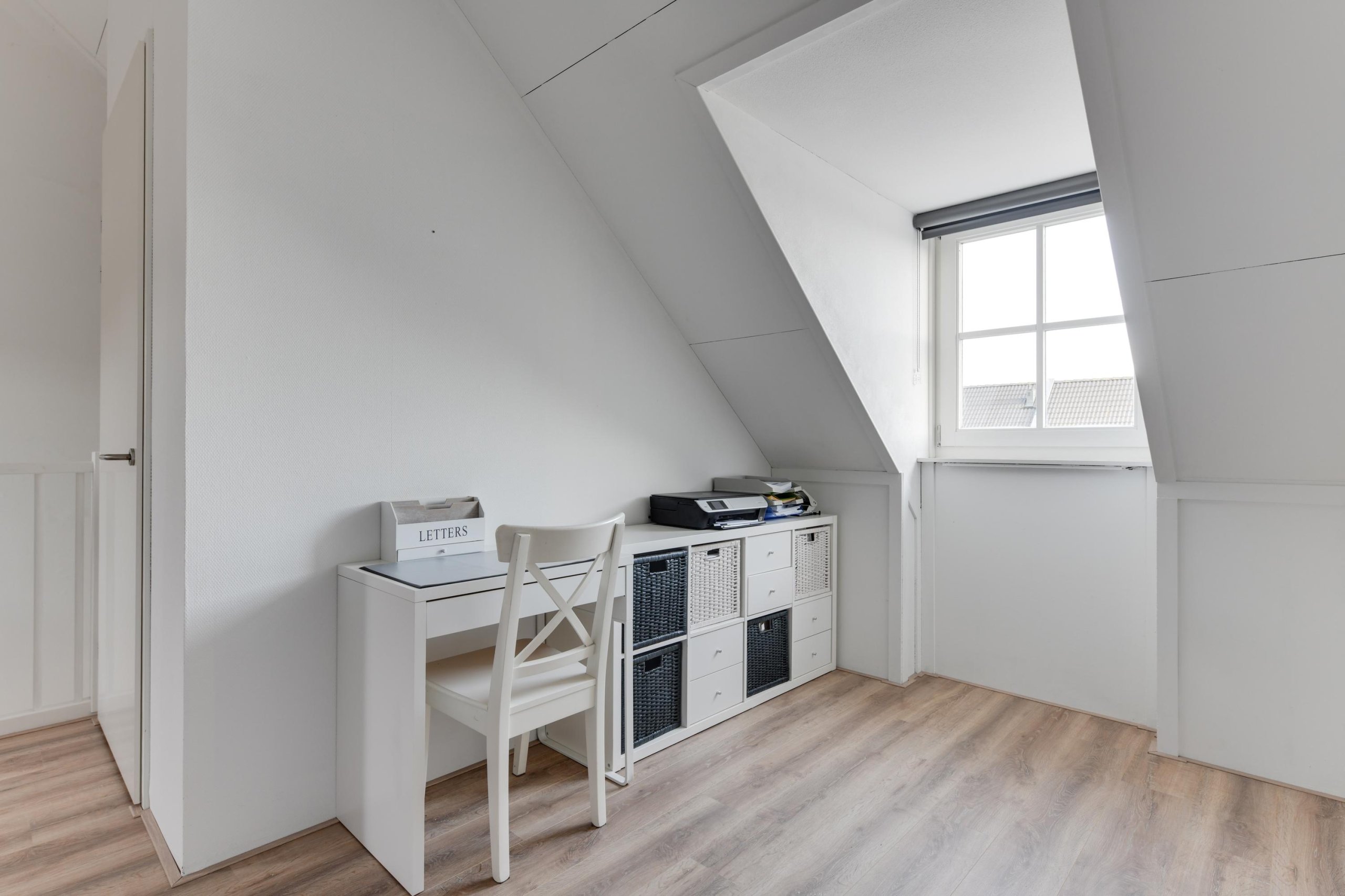 De vaste trap brengt je naar de tweede verdieping. Deze ruime zolder is nu ingericht als slaapkamer, maar kan ook perfect dienen als werkkamer of hobbyruimte. Hier vind je ook de technische ruimte met cv-installatie (Intergas) en aansluiting voor de wasmachine.