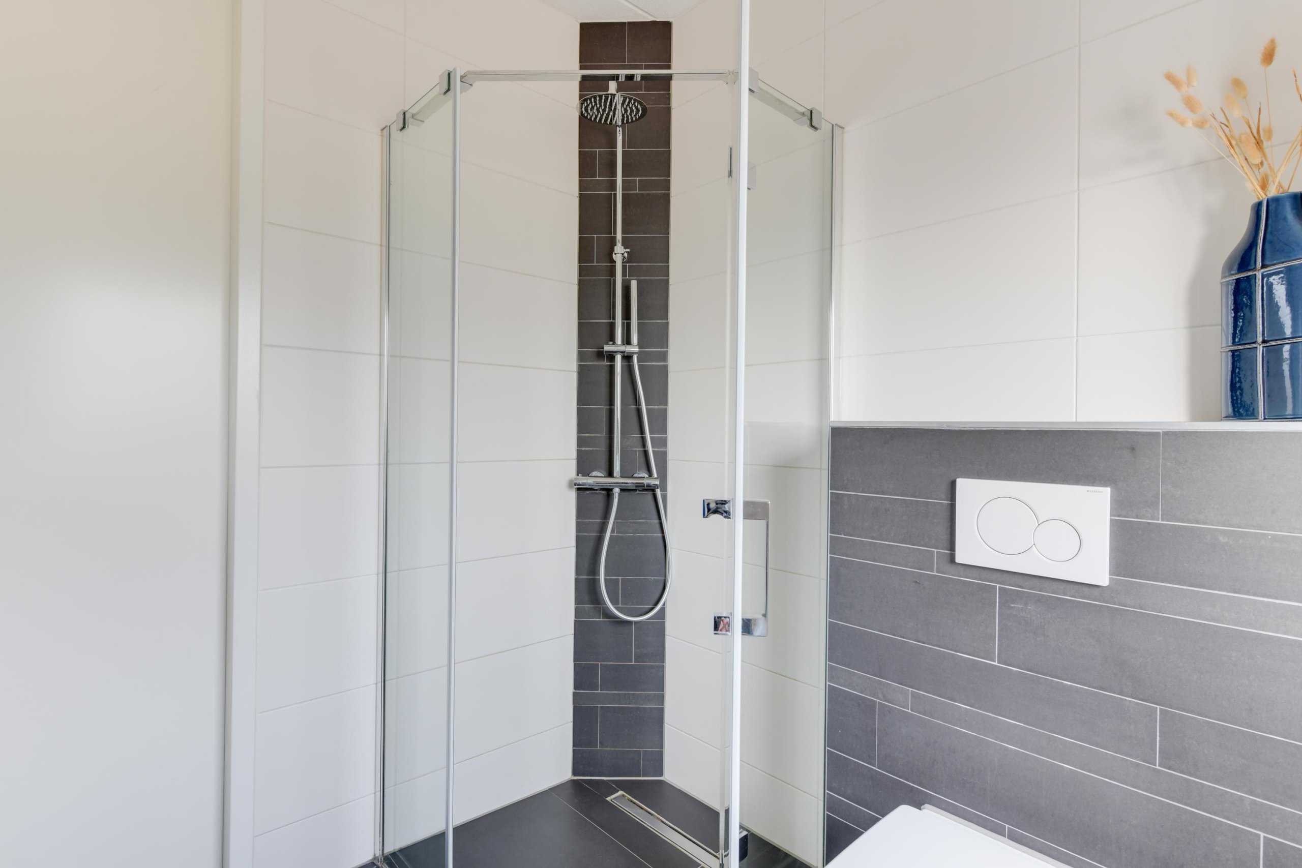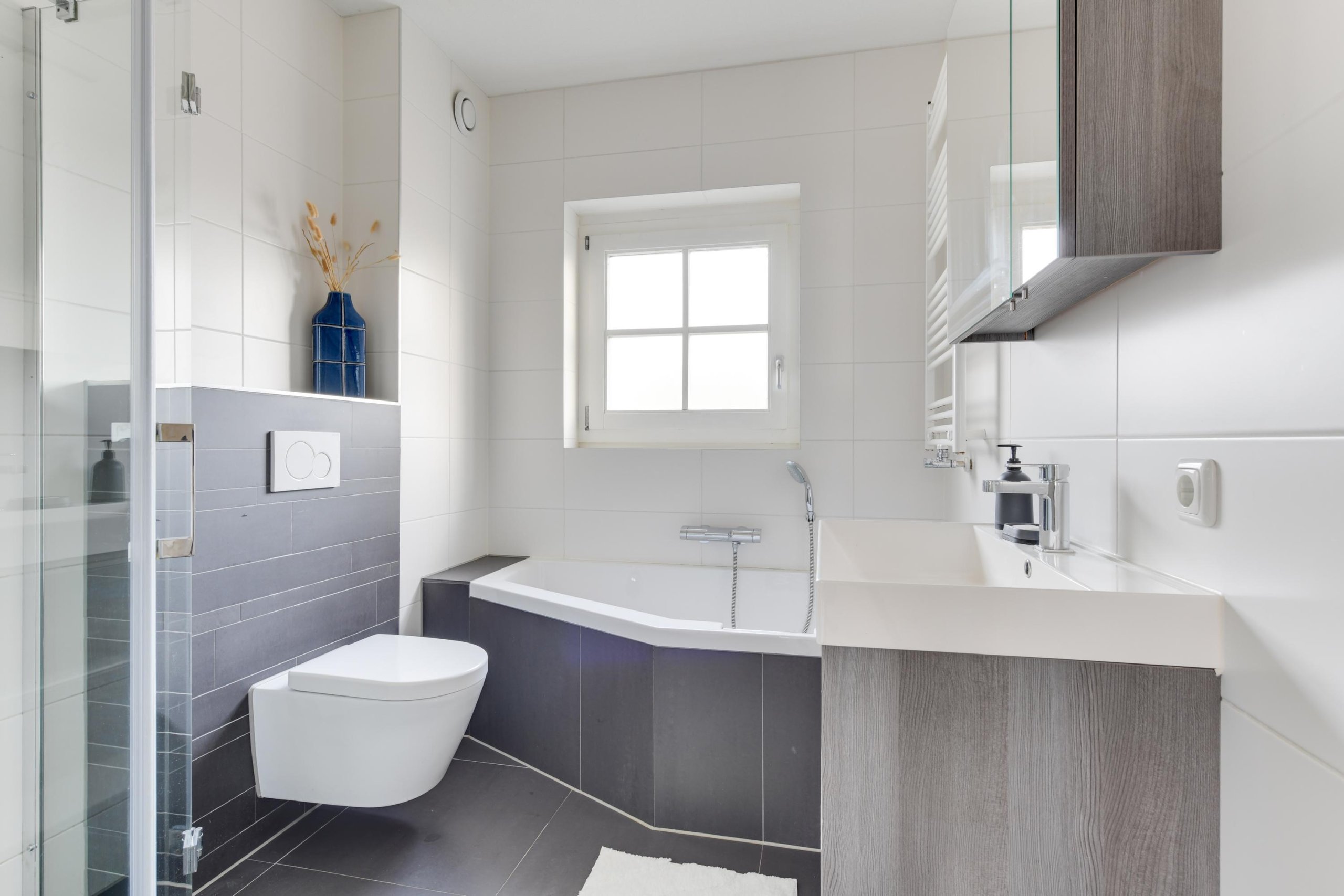 - Badkamer met hoekbad, douche, toilet en wastafel
