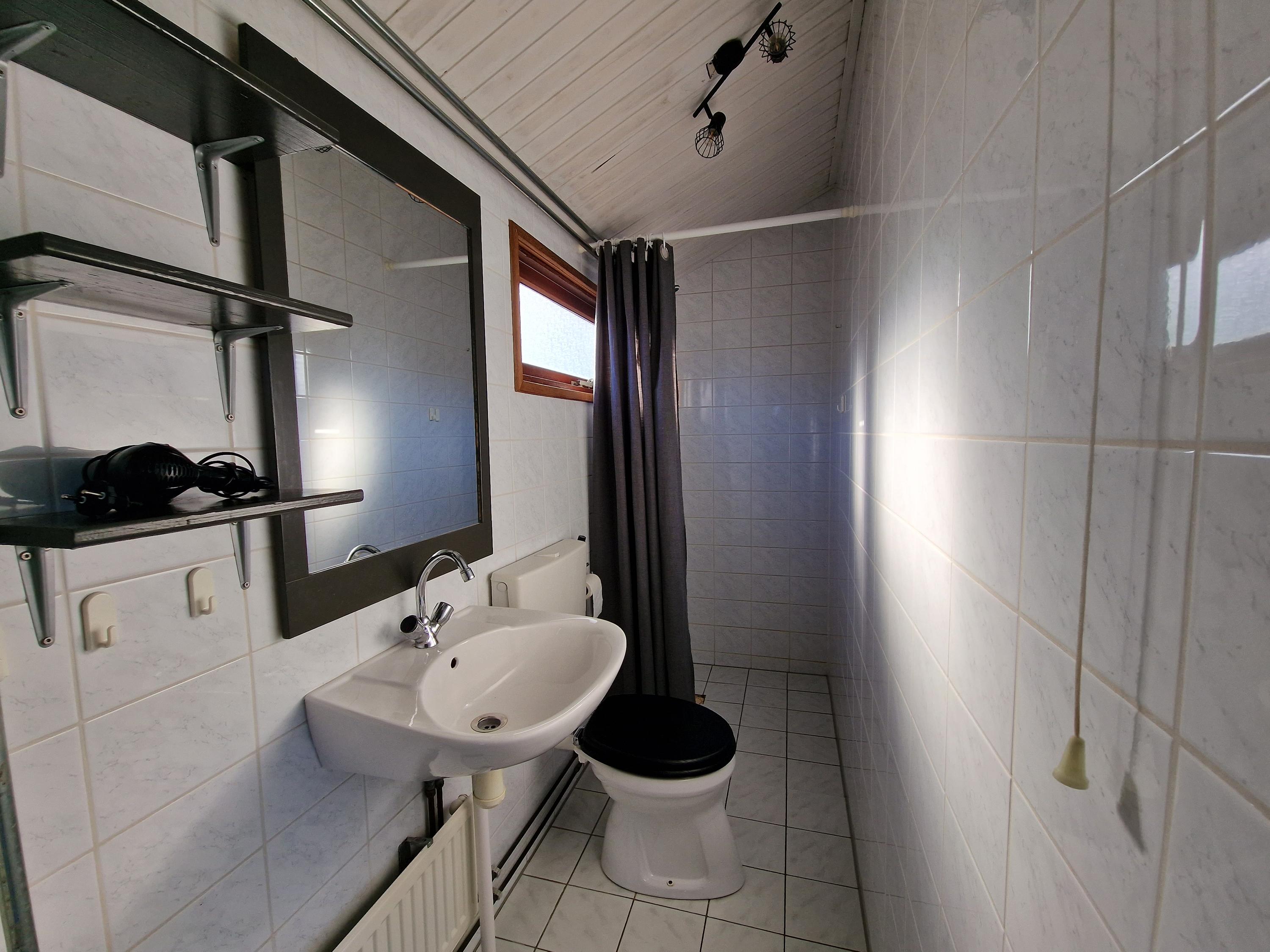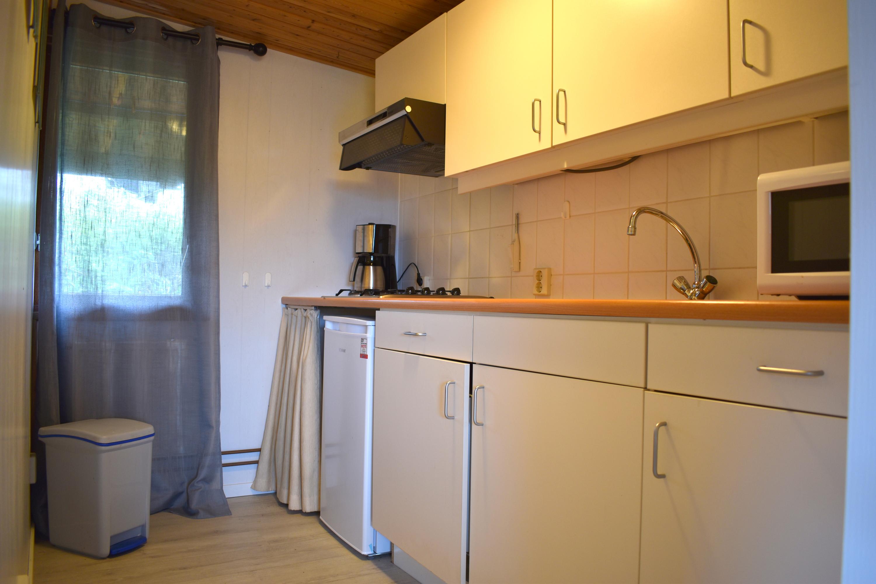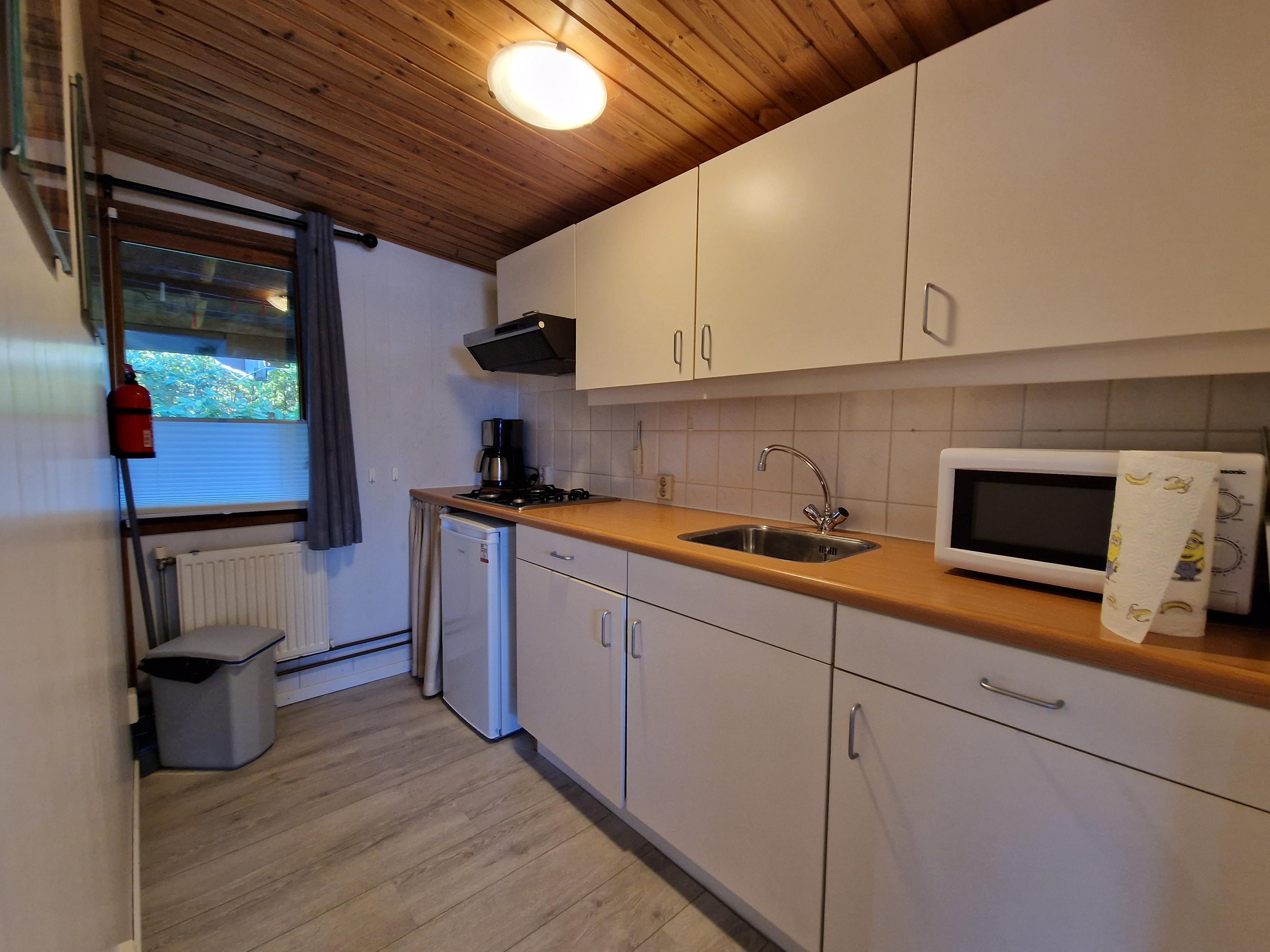 Via de entree kom je binnen in de bungalow met toegang tot de woonkamer. Vanuit de hal bereik je de badkamer, die is voorzien van een douche, wastafel en toilet. Daarnaast heb je toegang tot een slaapkamer en de keuken.