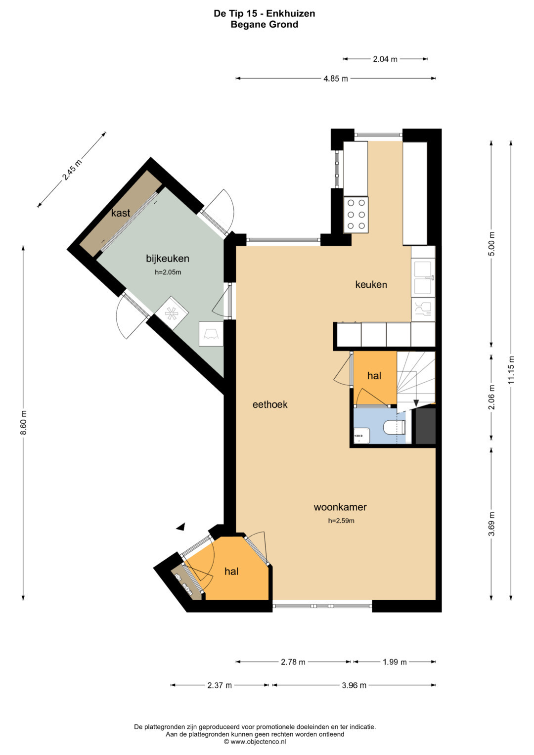 Entree via de hal met meterkast, garderobe en toegang tot de woonkamer. De lichte woonkamer met massief houten vloer heeft vrij uitzicht aan de voorzijde. Aan de achterzijde bevindt zich de keuken, voorzien van een 5-pits fornuis met oven, vaatwasser, combi-oven, grote spoelbak en kastruimte. De bijkeuken heeft zowel een deur naar de achter- als zijtuin. Vanuit het tussenportaal bereikt u de trapopgang en het toilet met fontein.