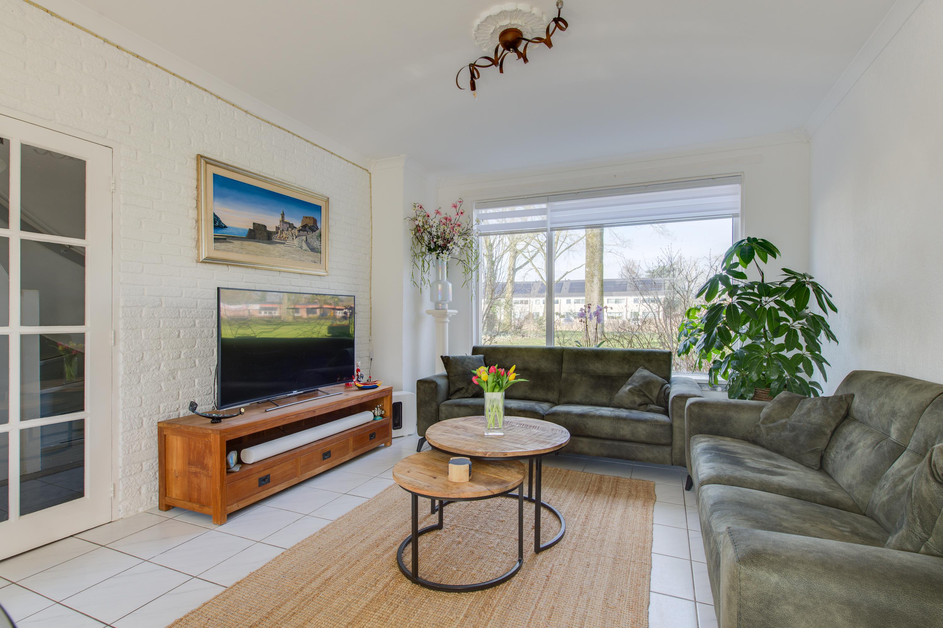 De lichte woonkamer beschikt over grote raampartijen die zorgen voor een prettige lichtinval en een fijne verbinding met de tuin. Er is volop ruimte voor een royale zithoek én een comfortabele eethoek.