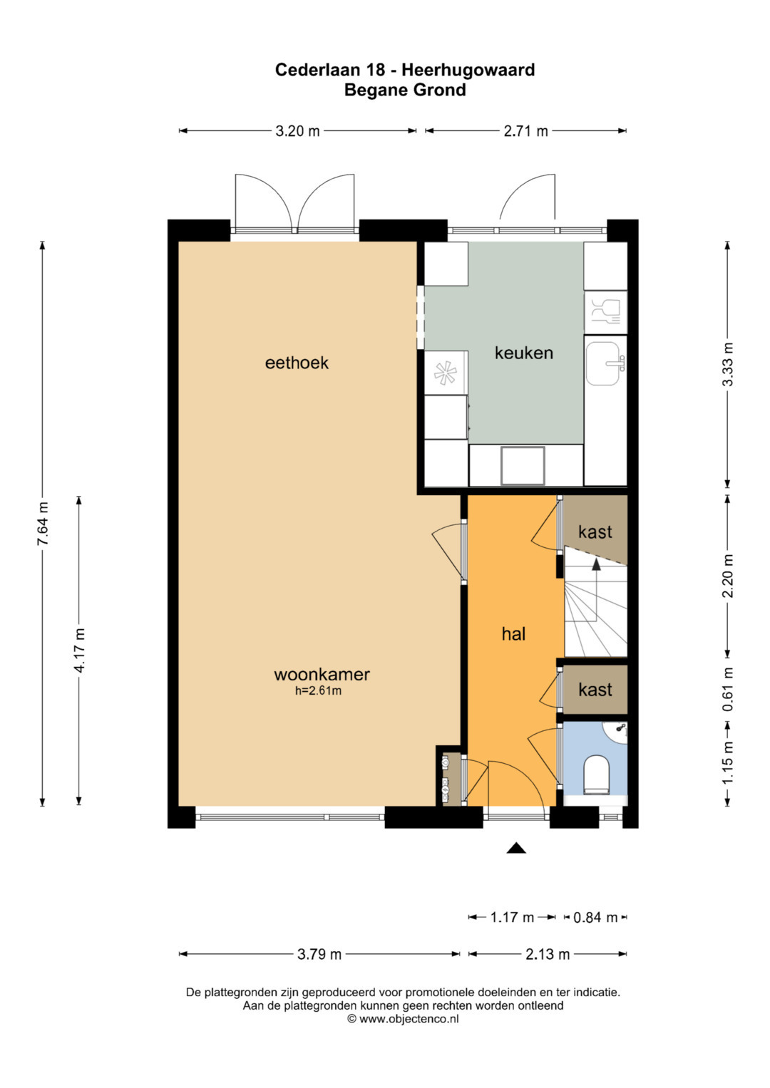 Begane grond: Via de entree kom je in de hal met meterkast, toilet en trapopgang naar de eerste verdieping. Vanuit de hal heb je toegang tot de woonkamer en keuken.