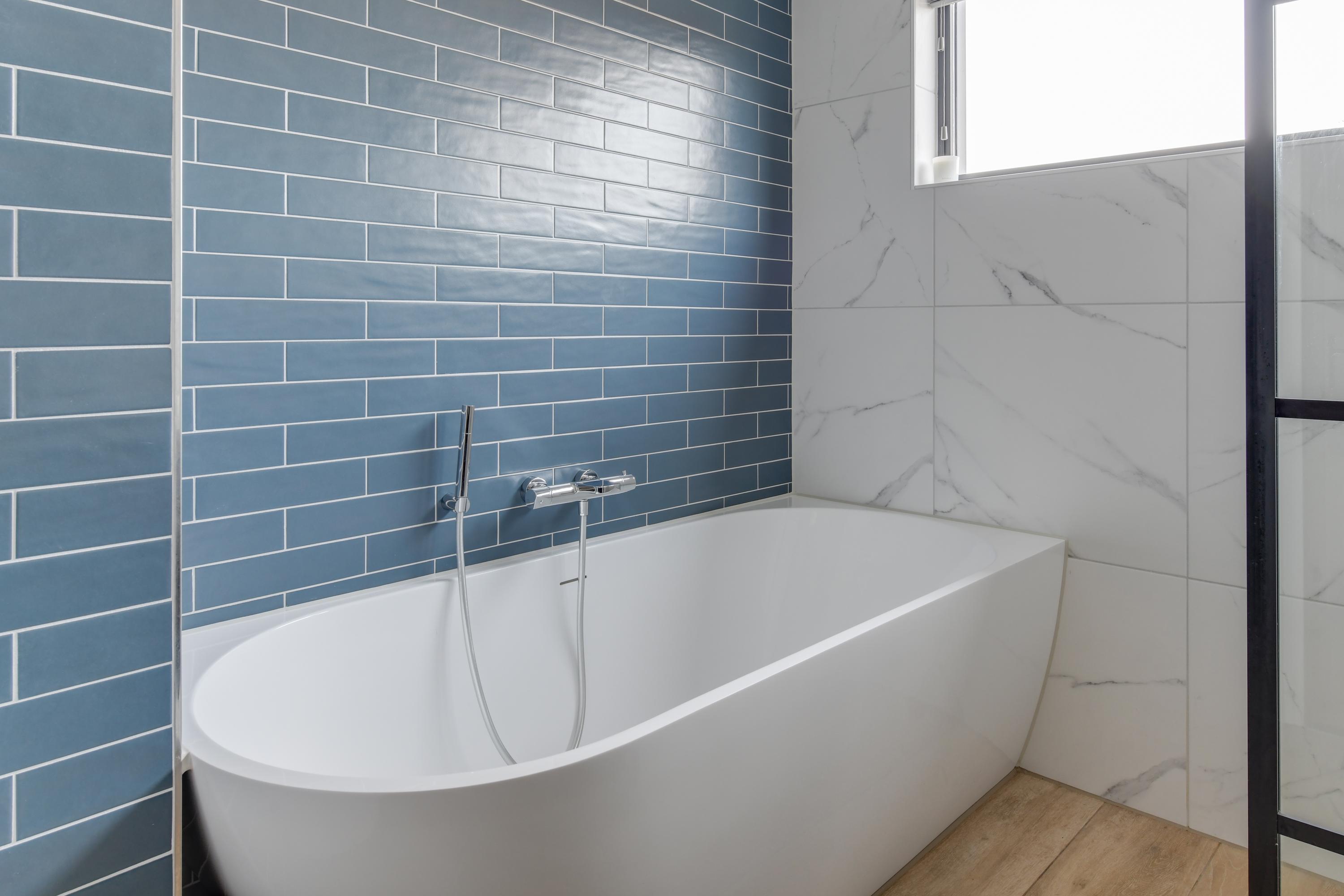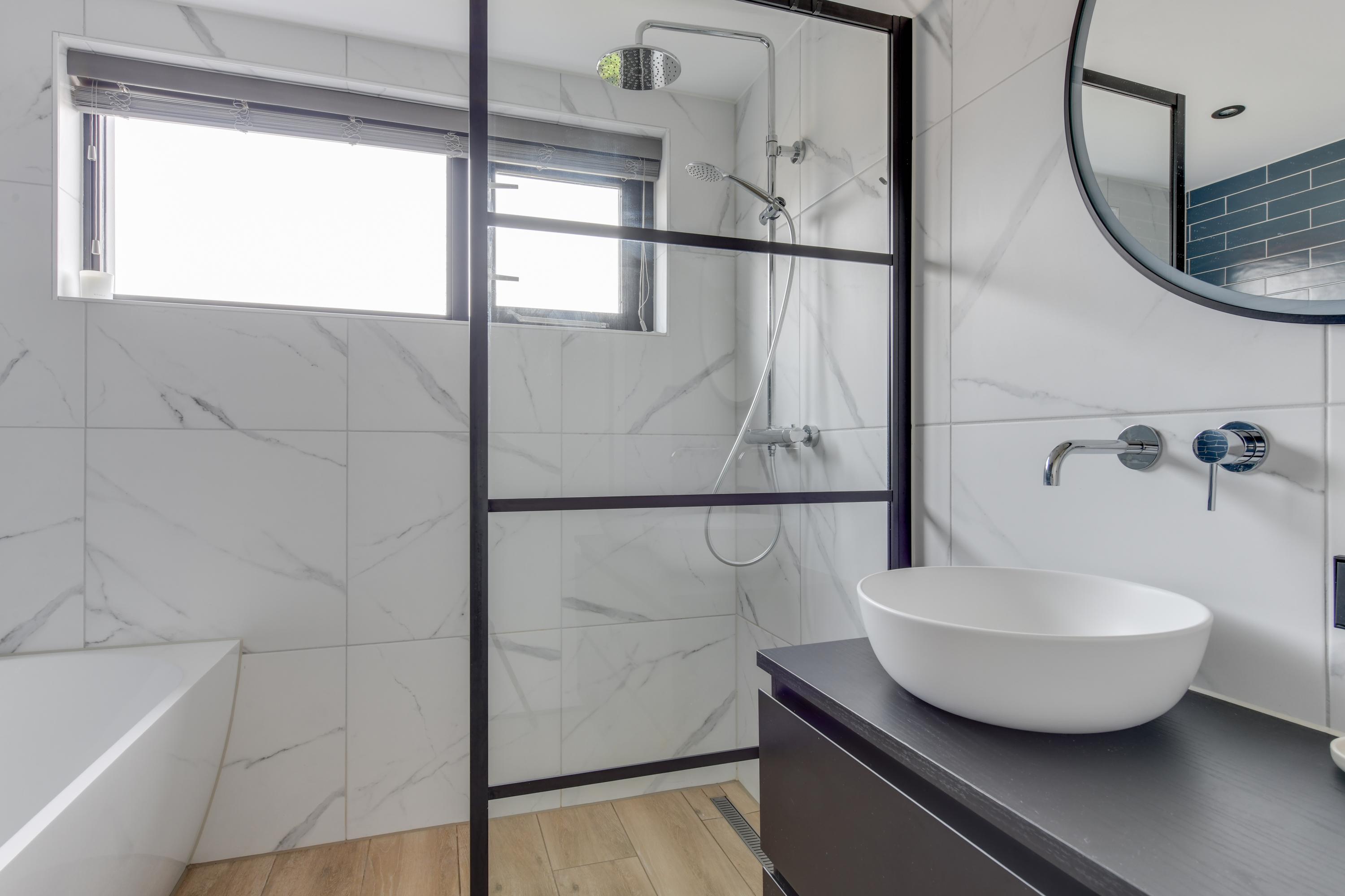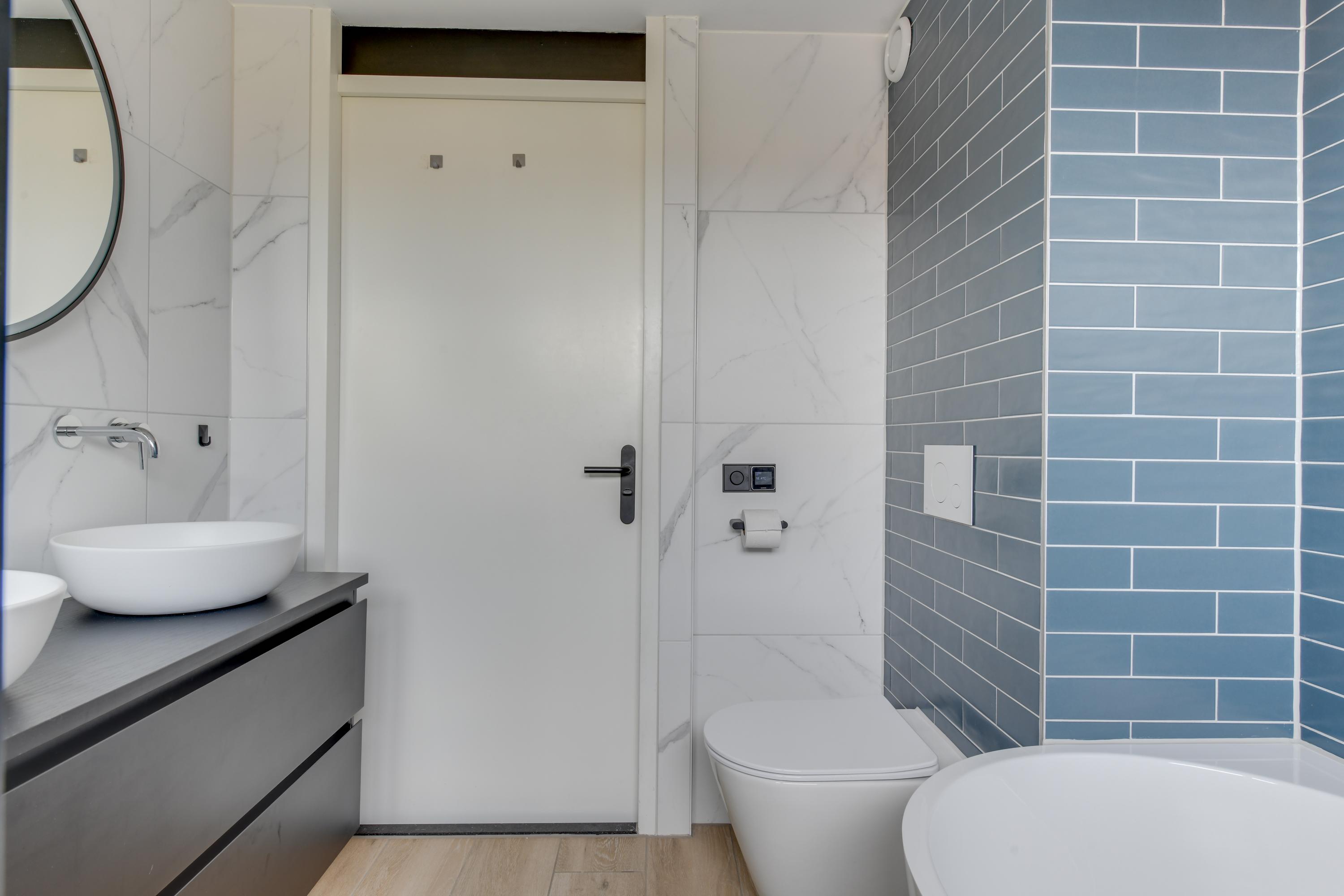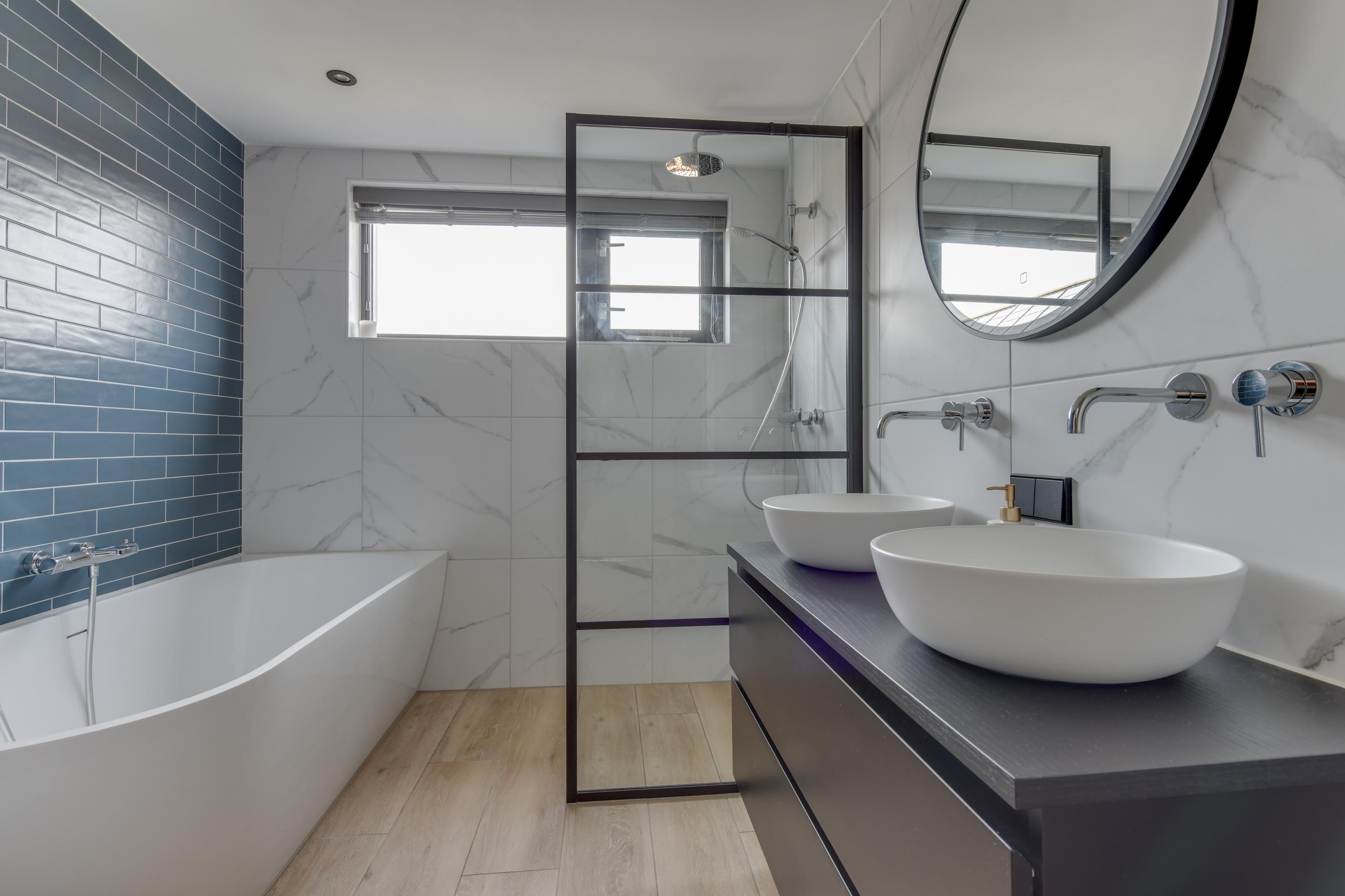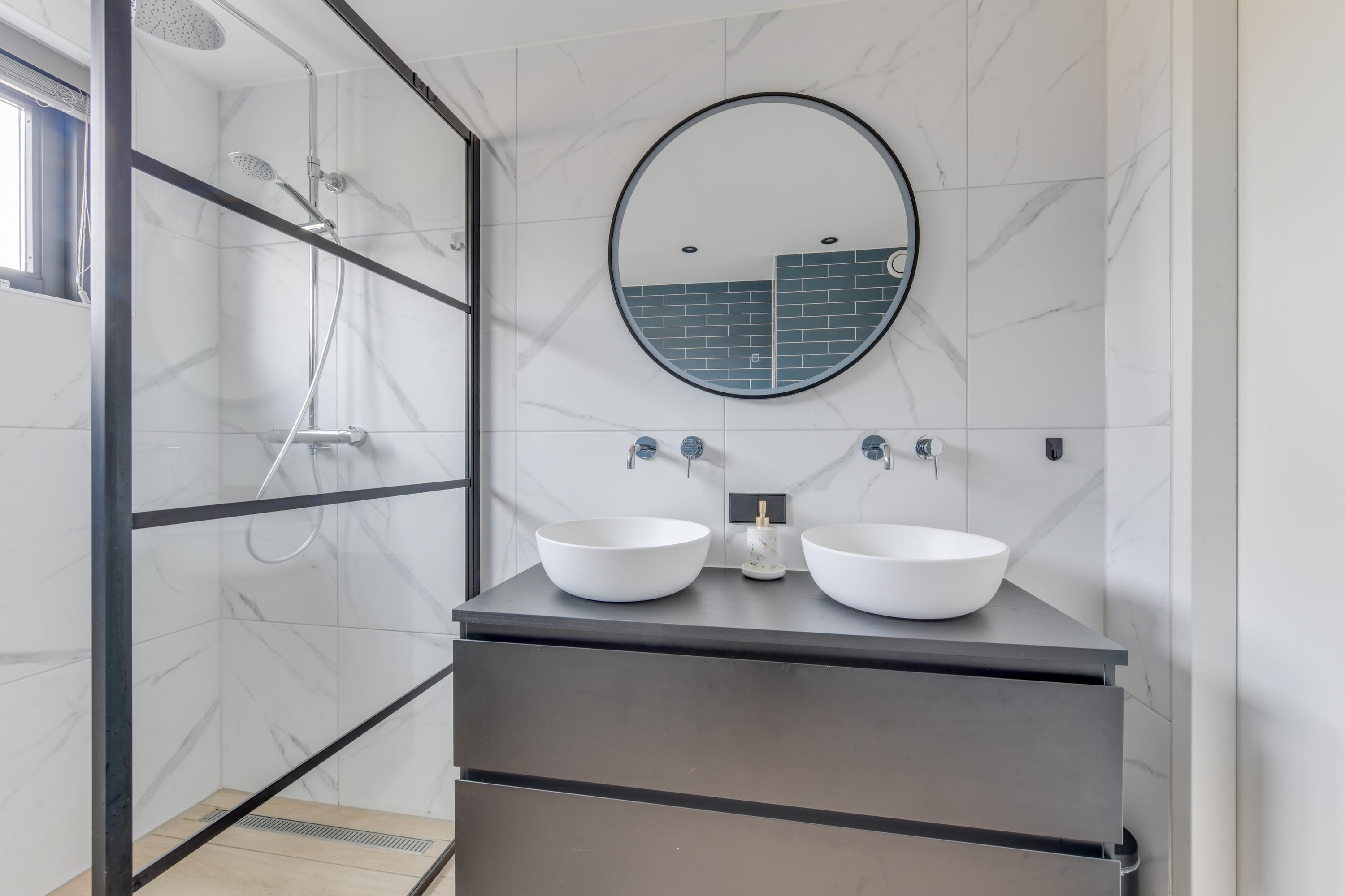 Overloop met toegang tot drie ruime slaapkamers en een luxe badkamer met inloopdouche, ligbad, dubbele wastafelmeubel en een tweede toilet. Alles is modern afgewerkt.