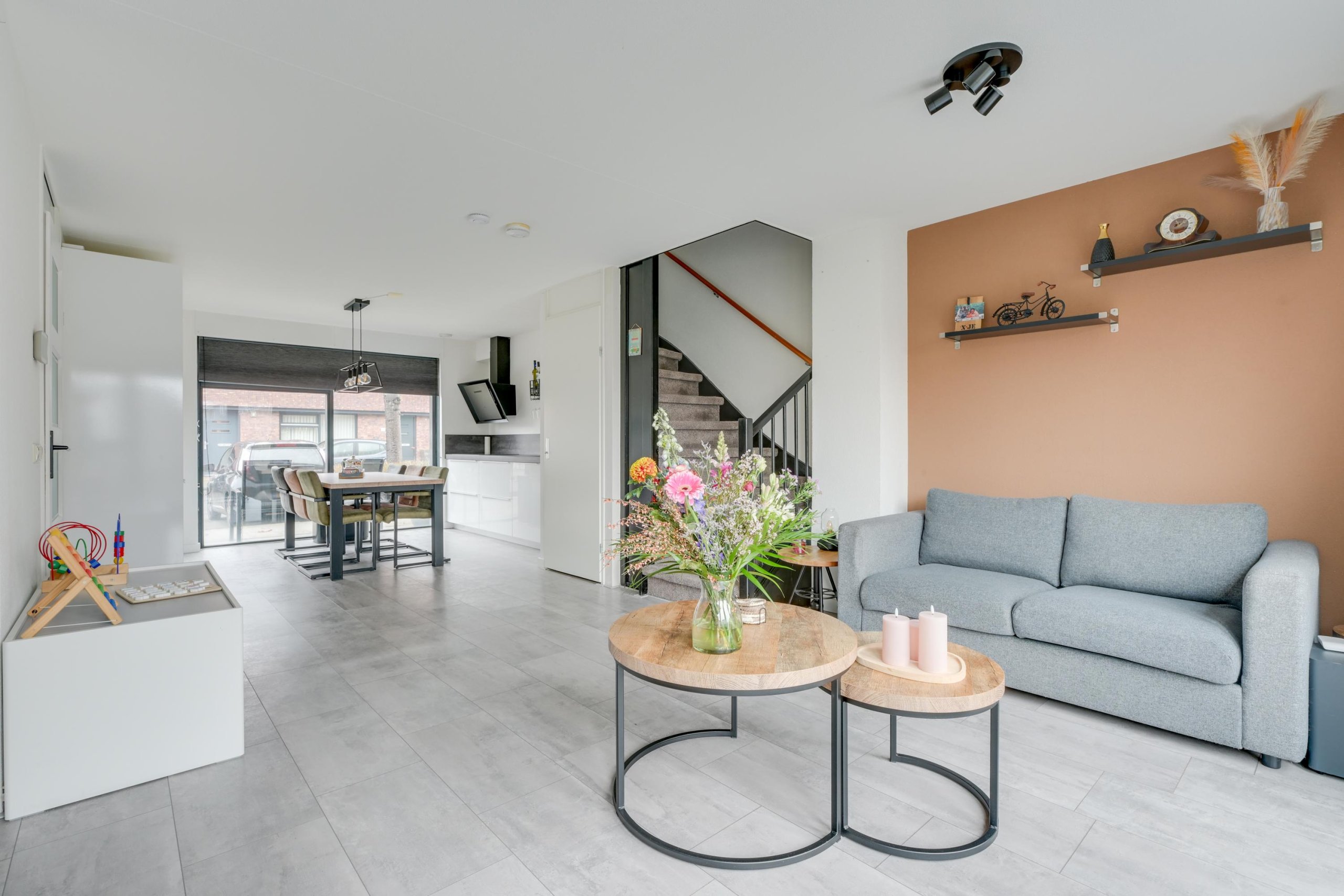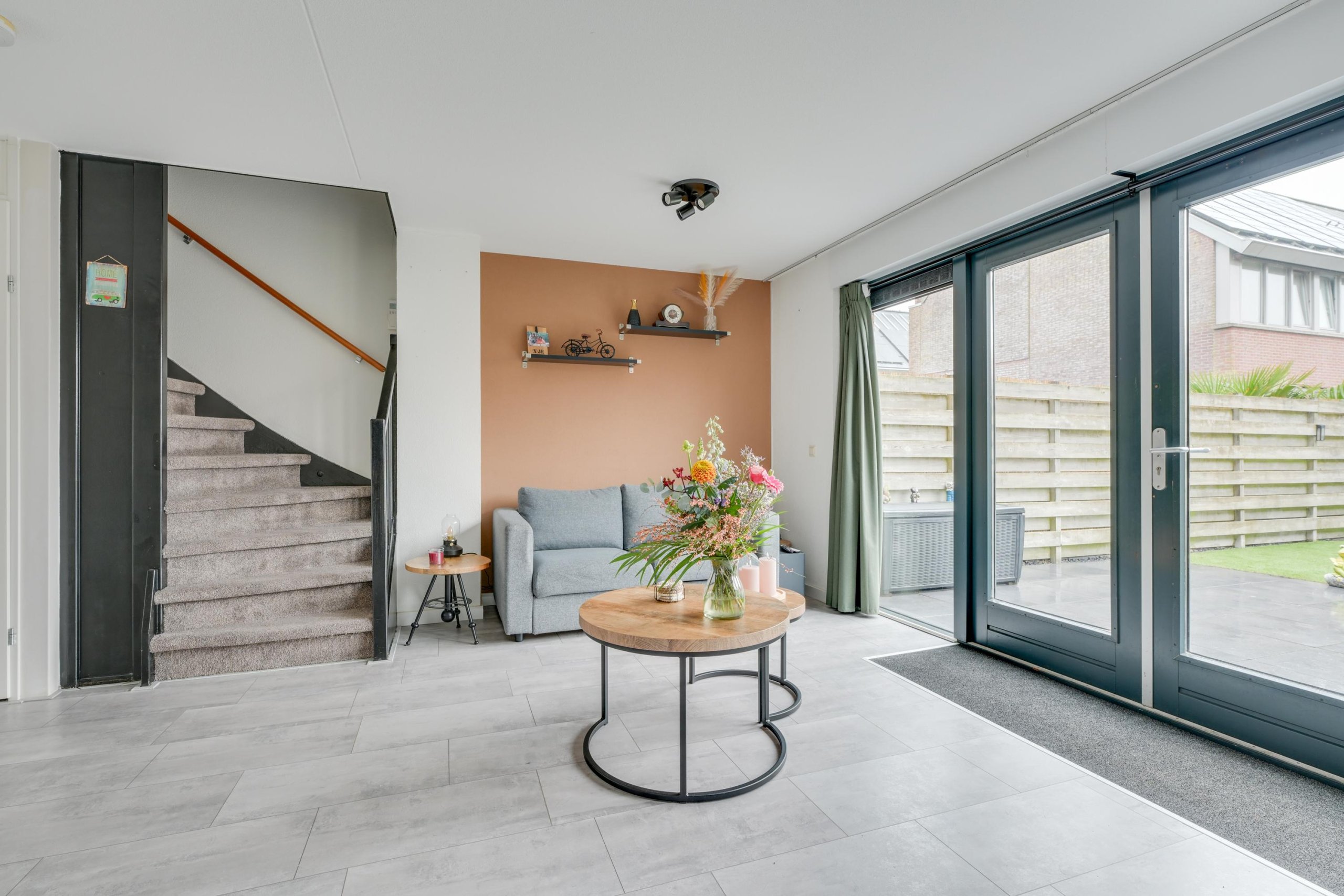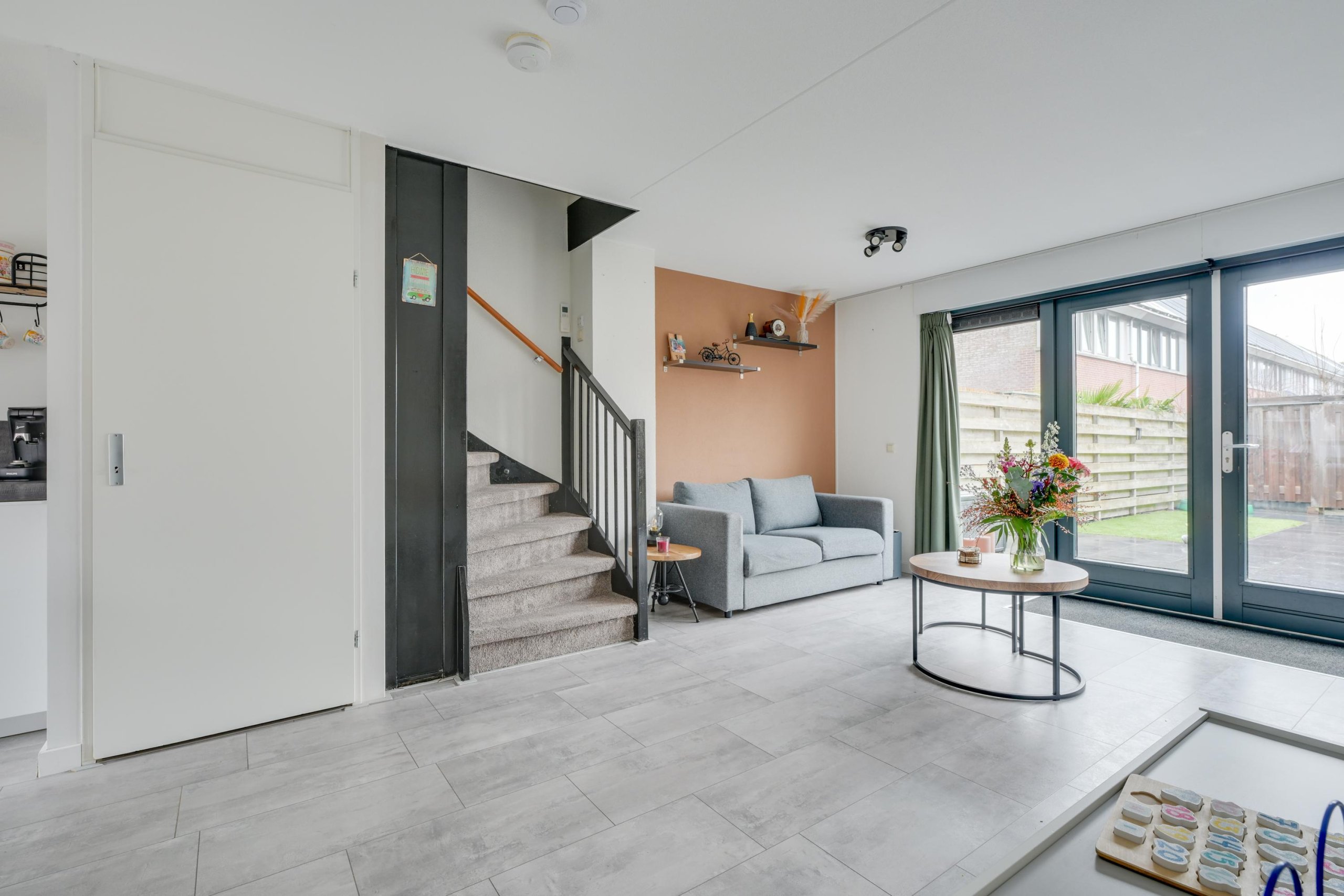 Entree met hal, meterkast, garderoberuimte en moderne toiletruimte voorzien van hangend toilet en fontein. De tuingerichte woonkamer is heerlijk licht dankzij de grote raampartij met openslaande deuren naar de achtertuin. De begane grond is voorzien van comfortabele vloerverwarming en strak afgewerkte wanden en vloeren, wat zorgt voor een moderne en rustige uitstraling.