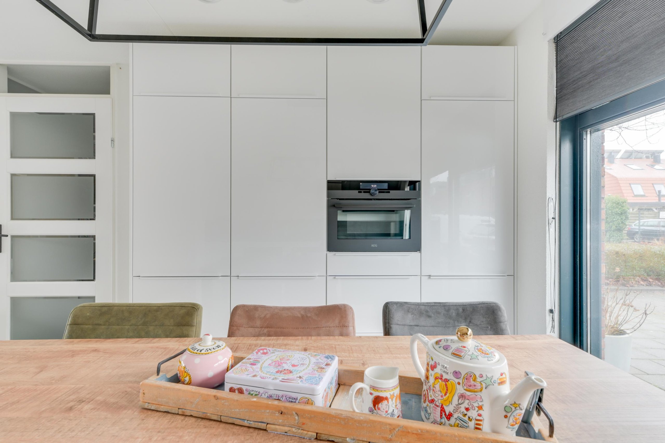 Aan de voorzijde bevindt zich de open keuken, vernieuwd in 2021, uitgevoerd in een praktische opstelling en voorzien van diverse inbouwapparatuur. Extra bergruimte is aanwezig in de trapkast.