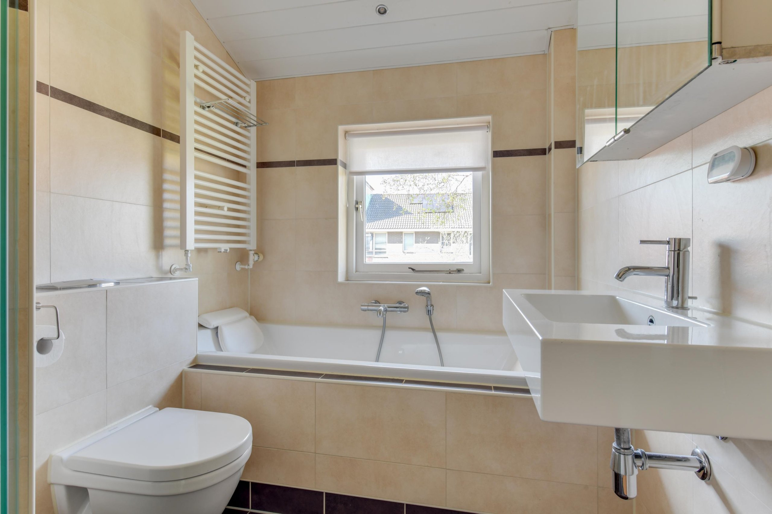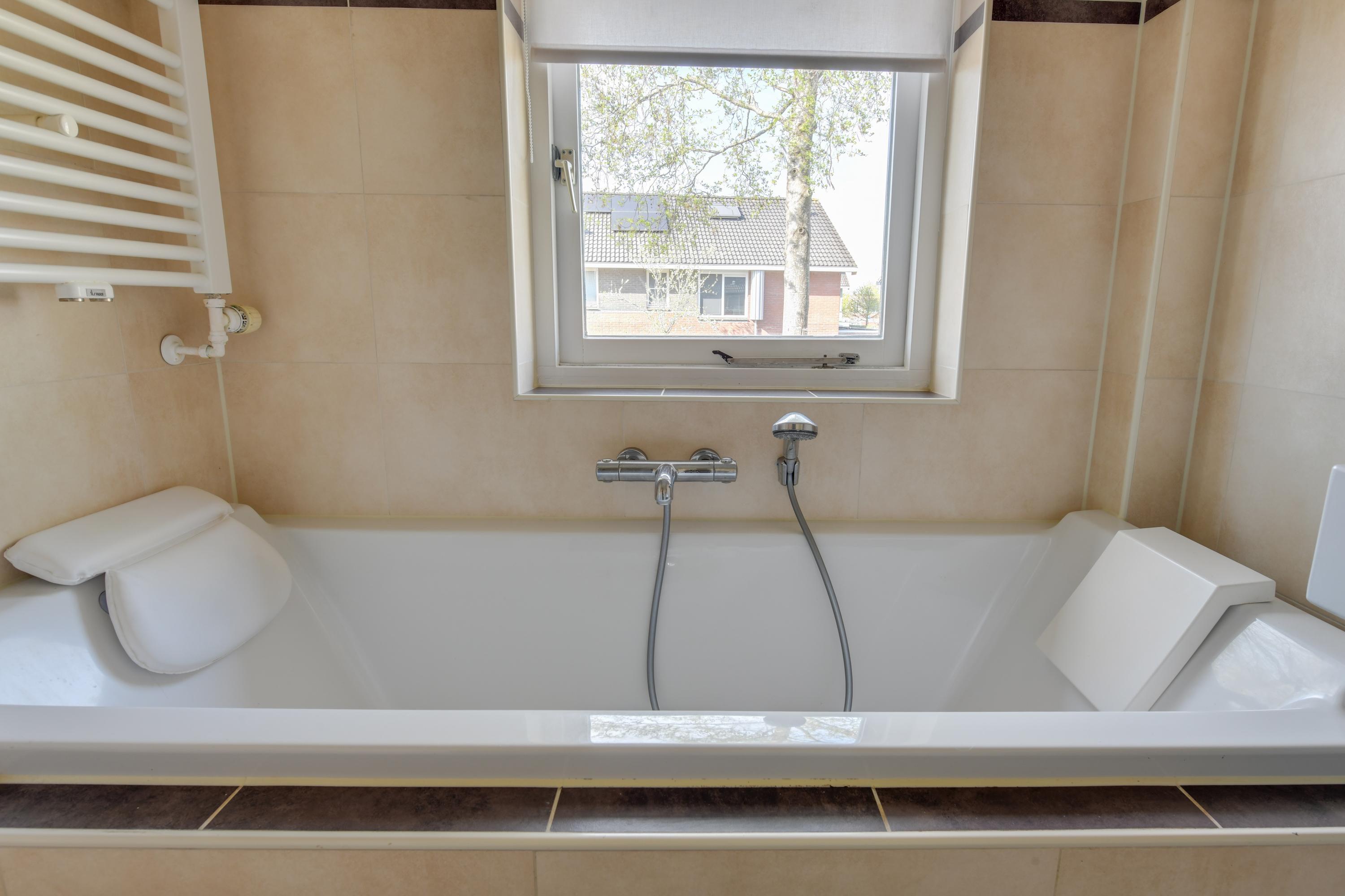 Overloop, drie goed bemeten slaapkamers en een badkamer met inloopdouche, ligbad, wastafel en tweede toilet.