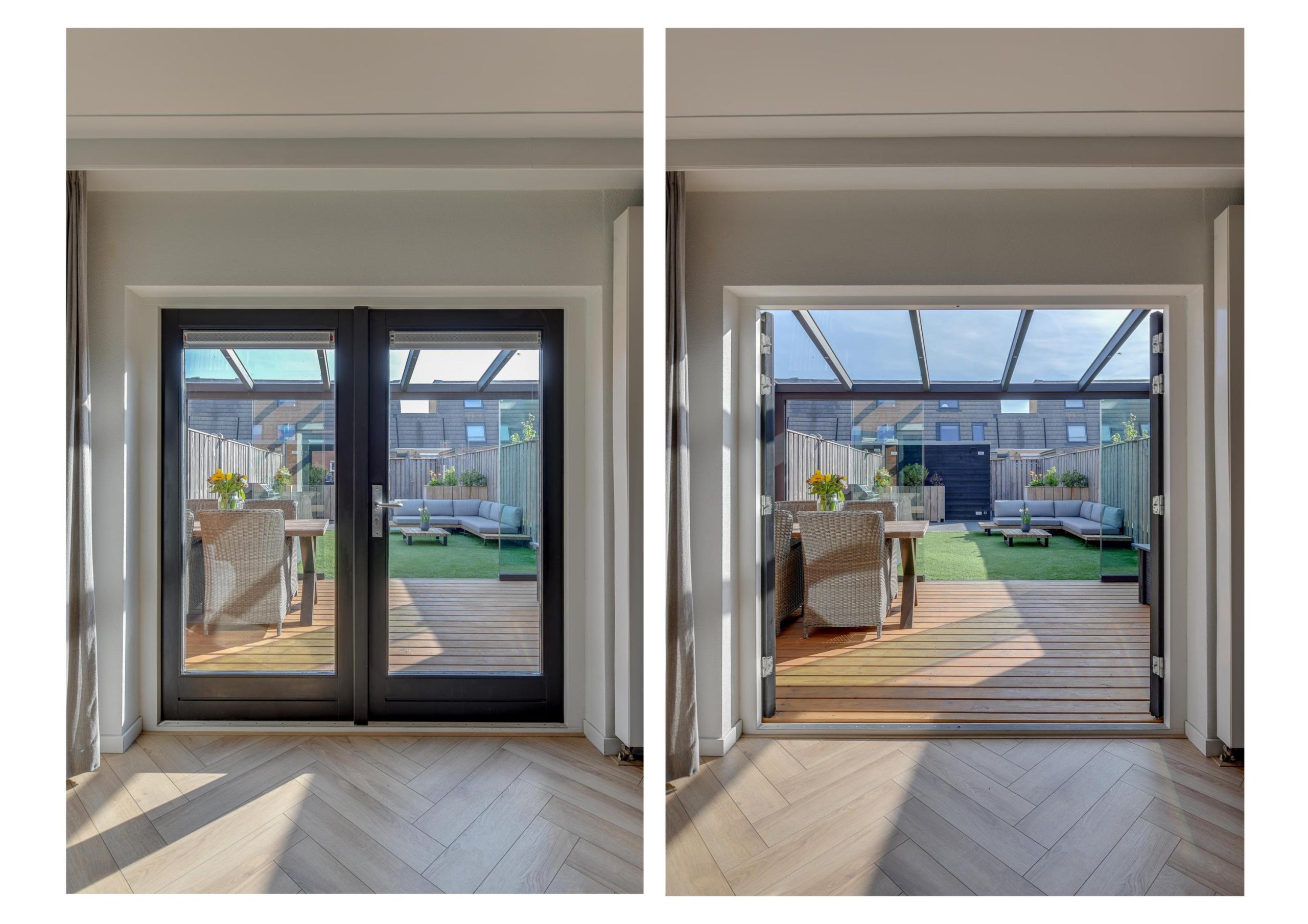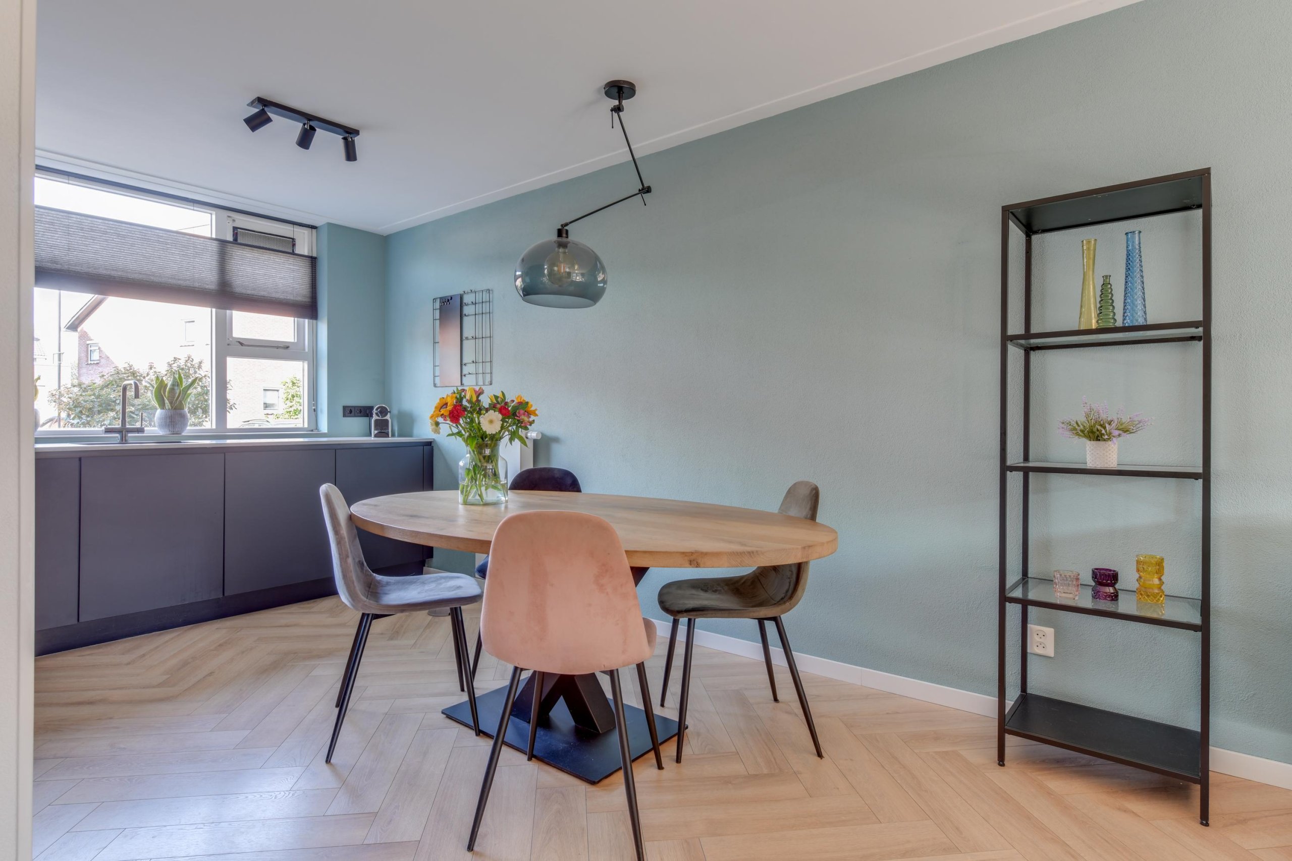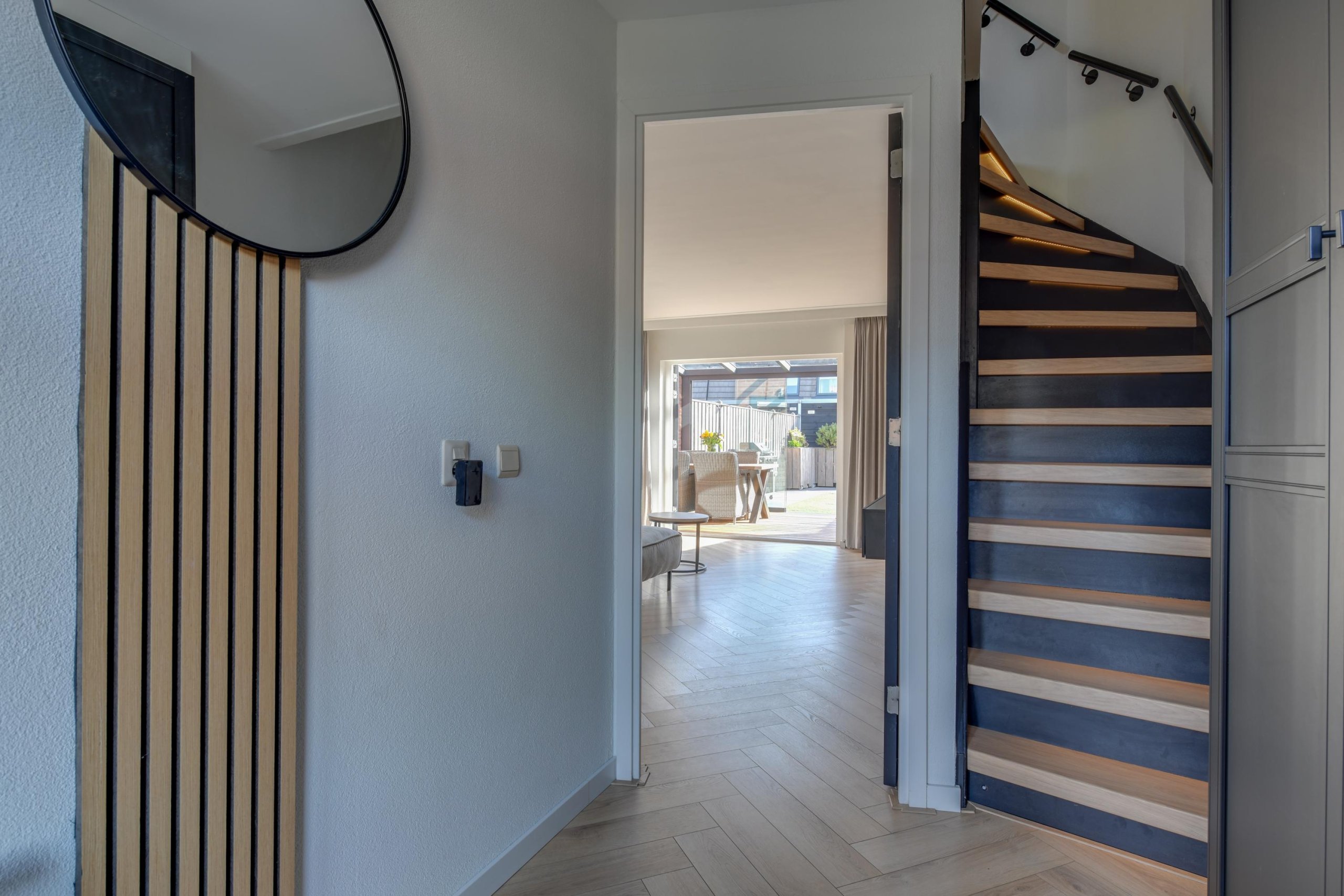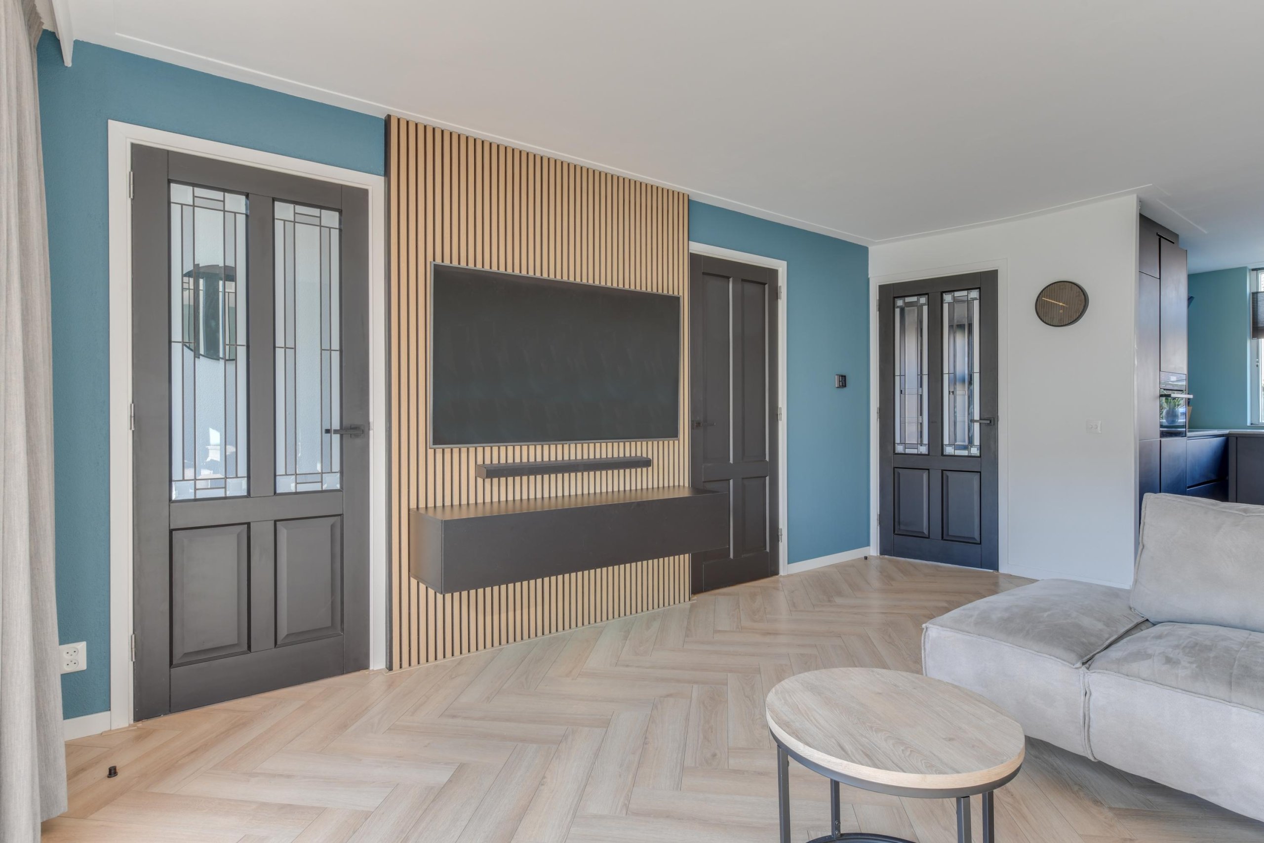 - Woonkamer met visgraatvloer;