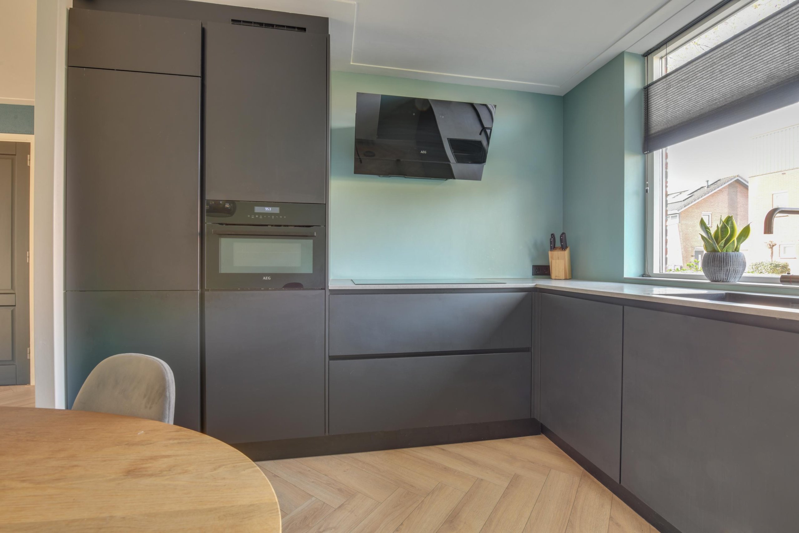 De moderne, luxe L-vormige keuken is voorzien van diverse inbouwapparatuur, waaronder een combi-oven, koel- en vrieskast, inductie kookplaat en vaatwasser. Of je nu snel een maaltijd wilt bereiden of uitgebreid wilt koken voor gasten – hier heb je alle ruimte en comfort.
