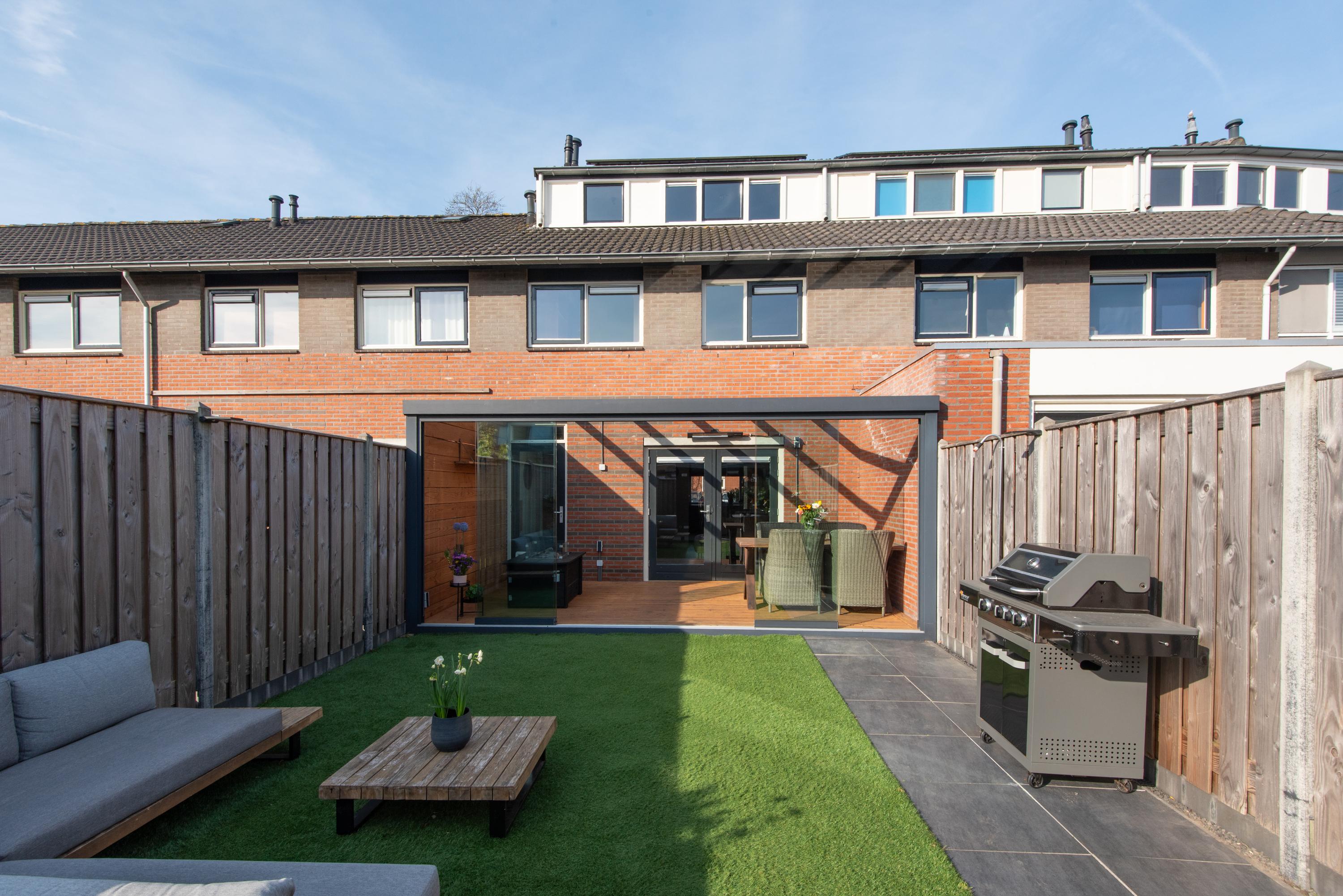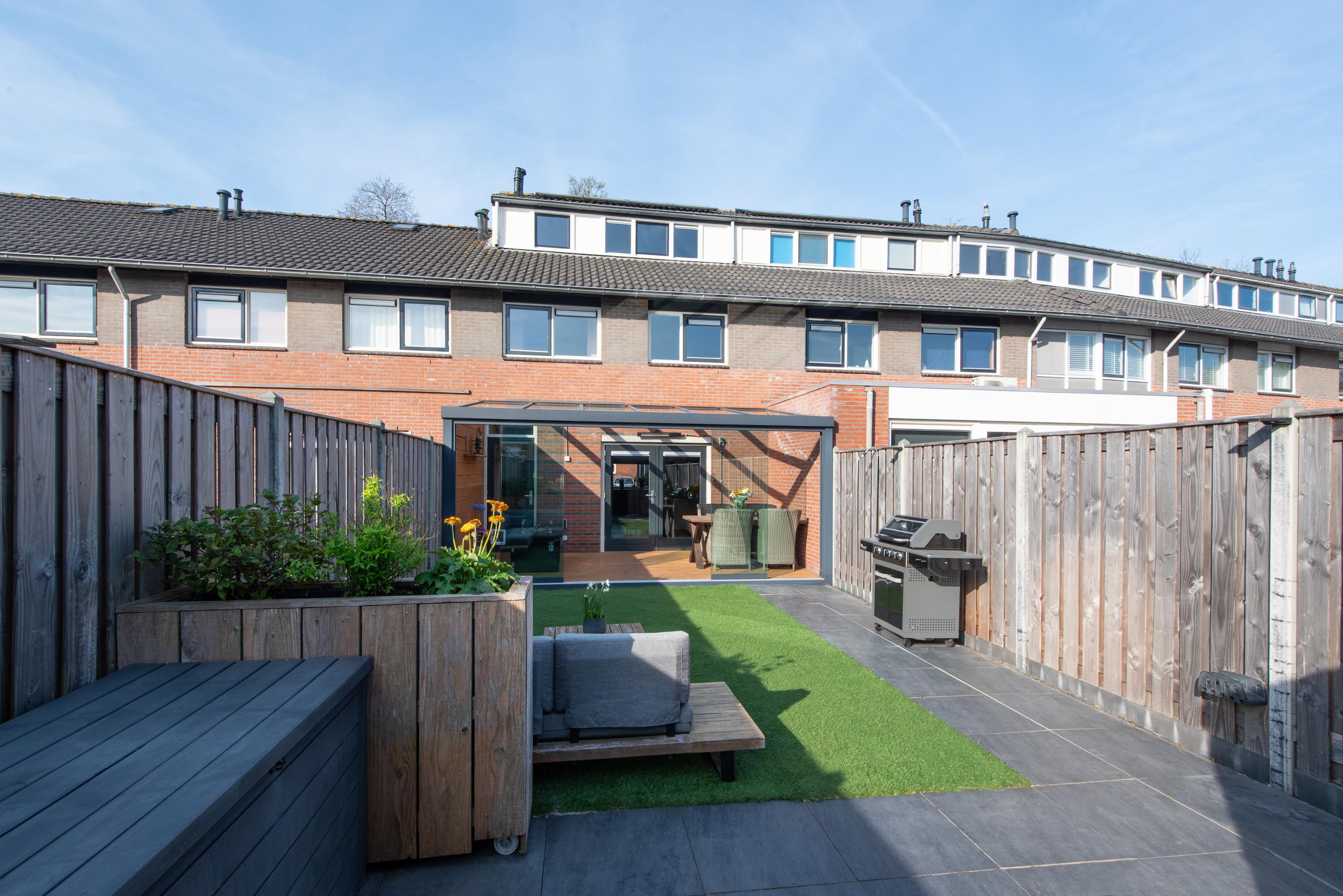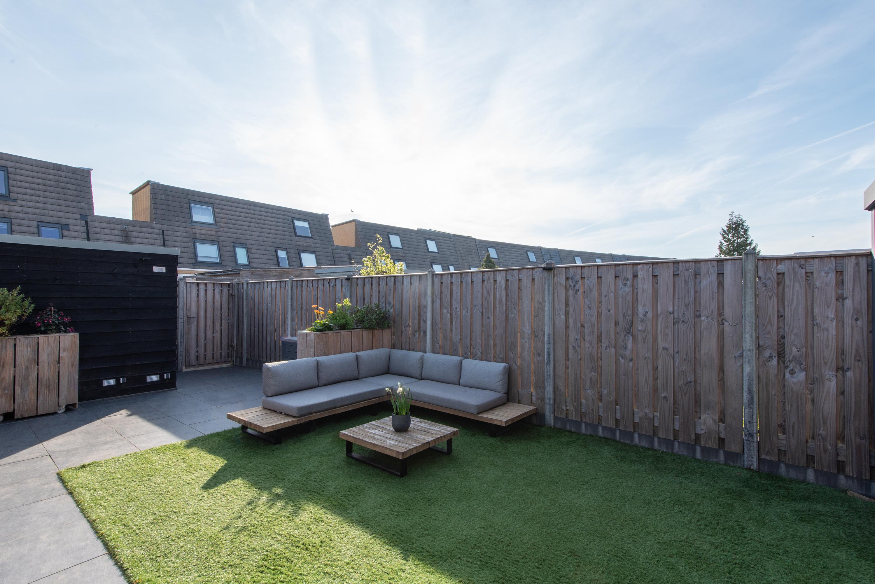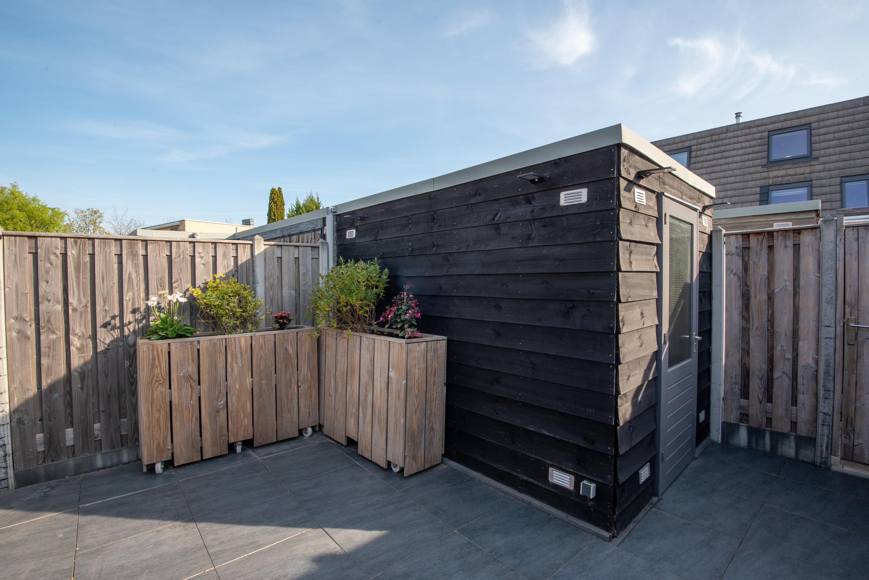 De diepe tuin is fraai aangelegd en voorzien van een berging en achterom.