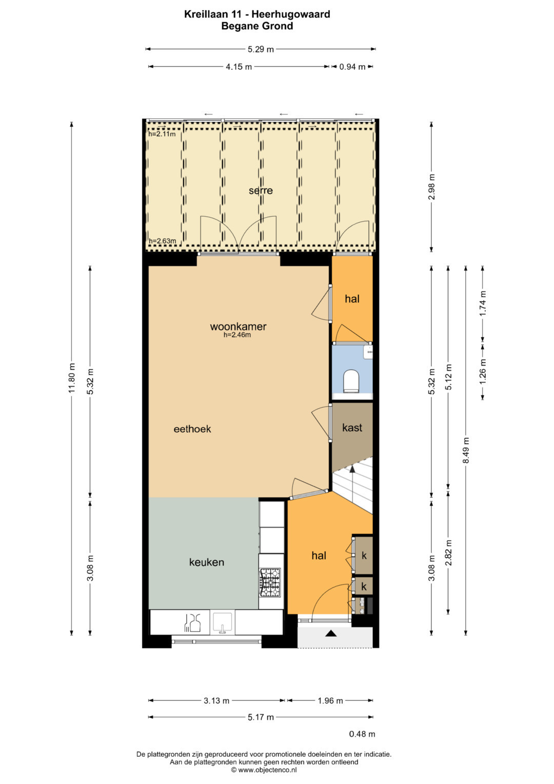 Begane grond: Ruime hal met inbouwkasten en meterkast. Toegang tot de lichte woonkamer met visgraatvloer en verlengd door middel van openslaande deuren toegang tot de serre. Extra hal met toiletruimte. Aan voorzijde een luxe keuken met hoogwaardige inbouwapparatuur. Vrijwel de gehele benedenverdieping en dan in het bijzonder de vloer, muren, keuken, toilet, trap, meterkast en radiatoren zijn gerenoveerd in 2021/2022.