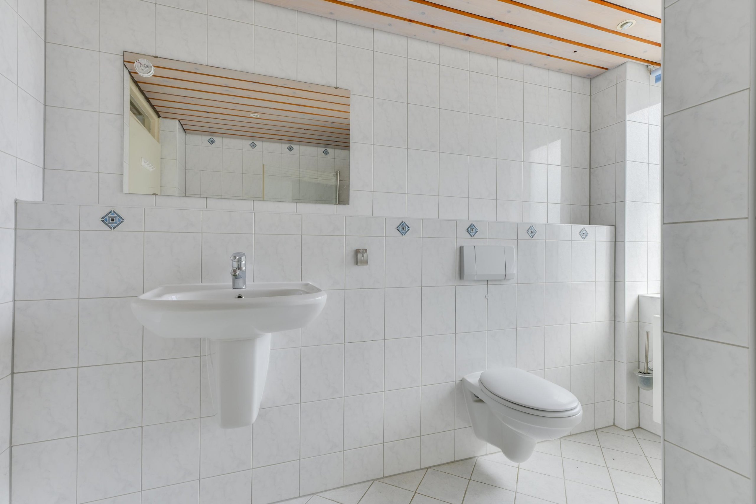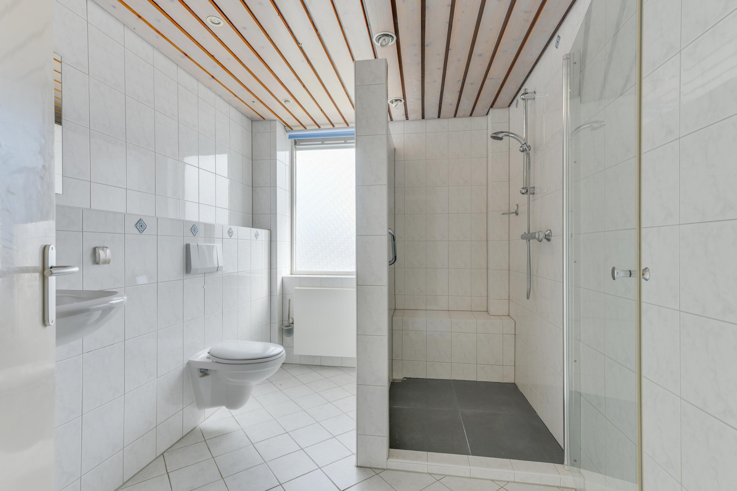De badkamer is ruim opgezet en voorzien van een douche, wastafel en toilet.