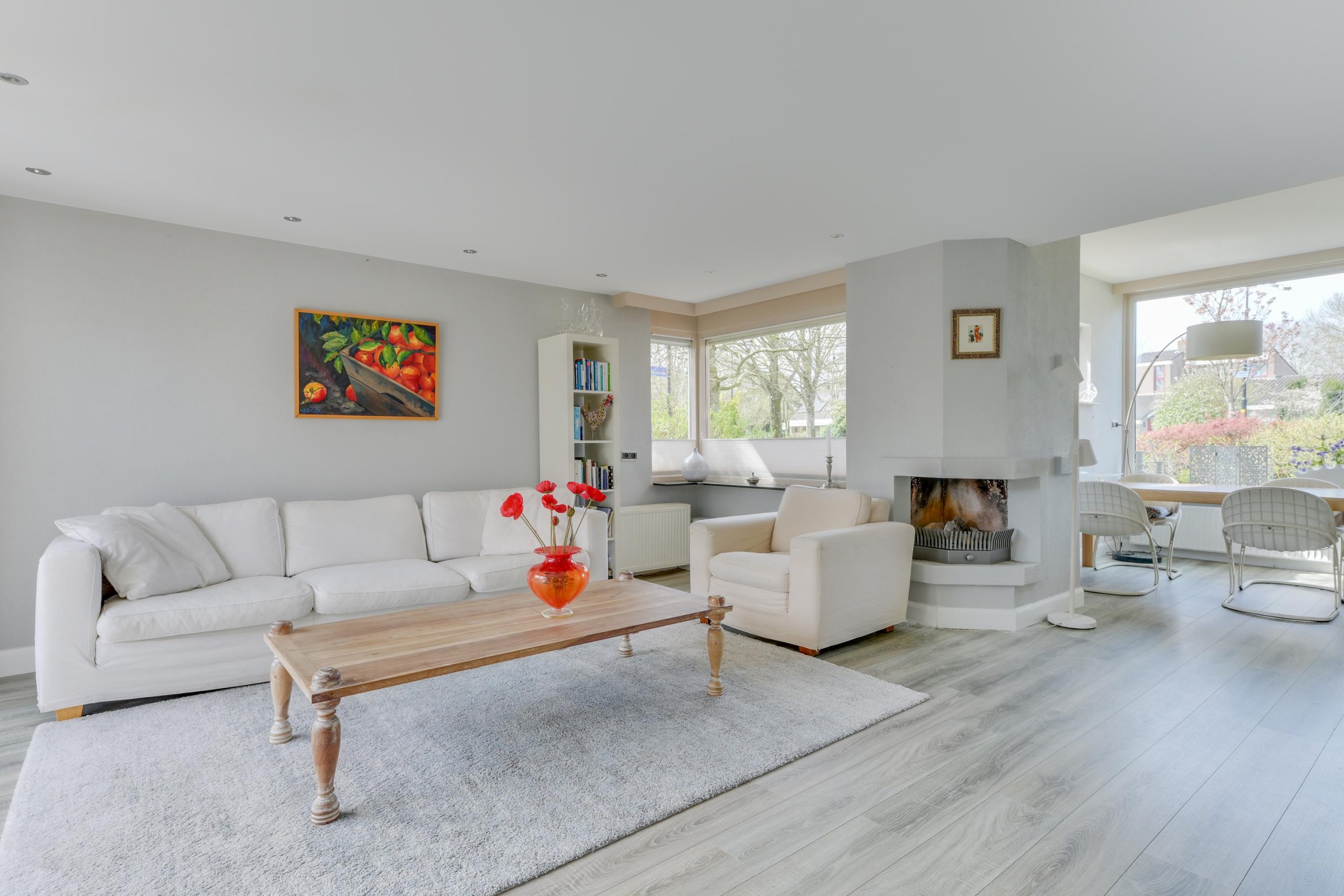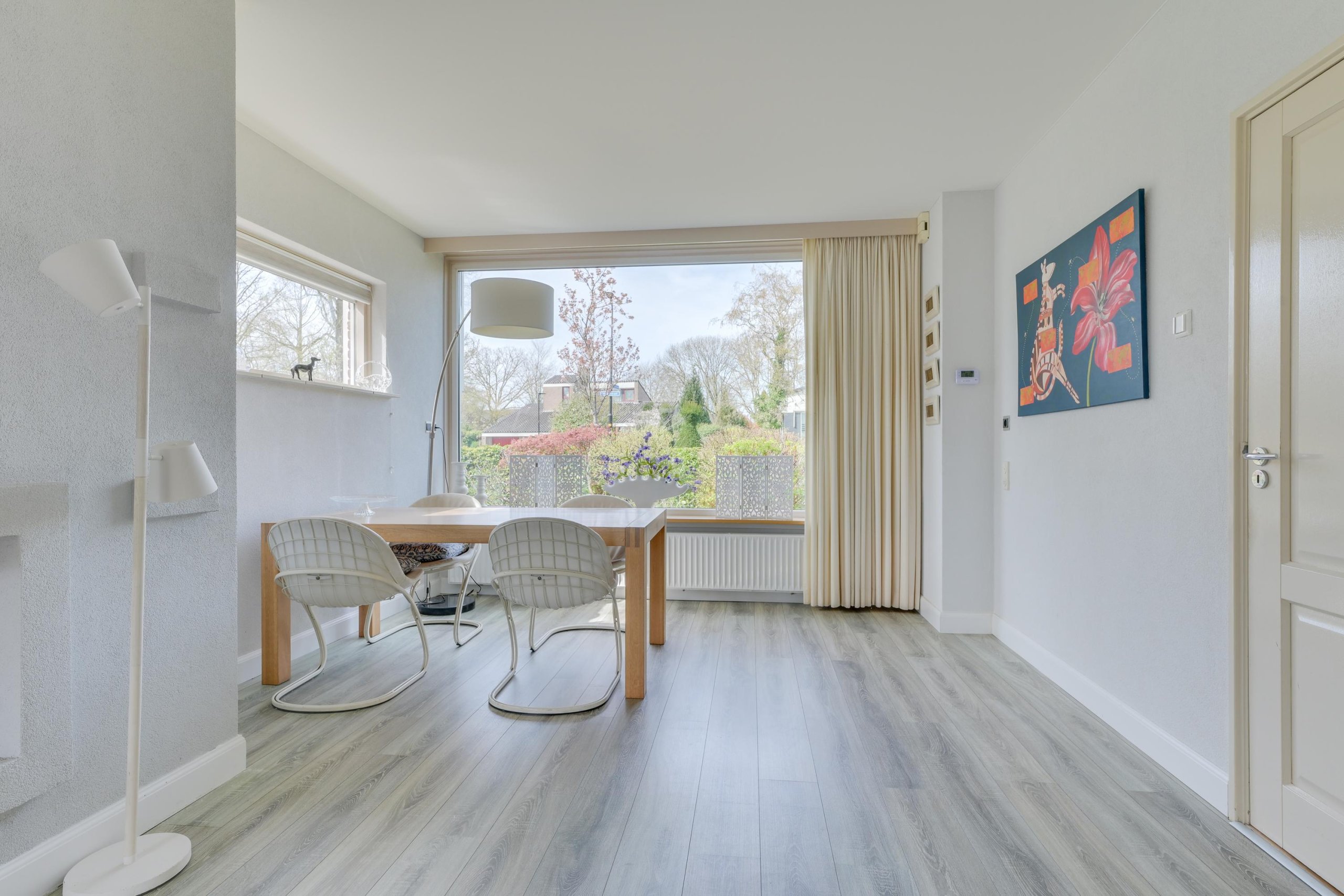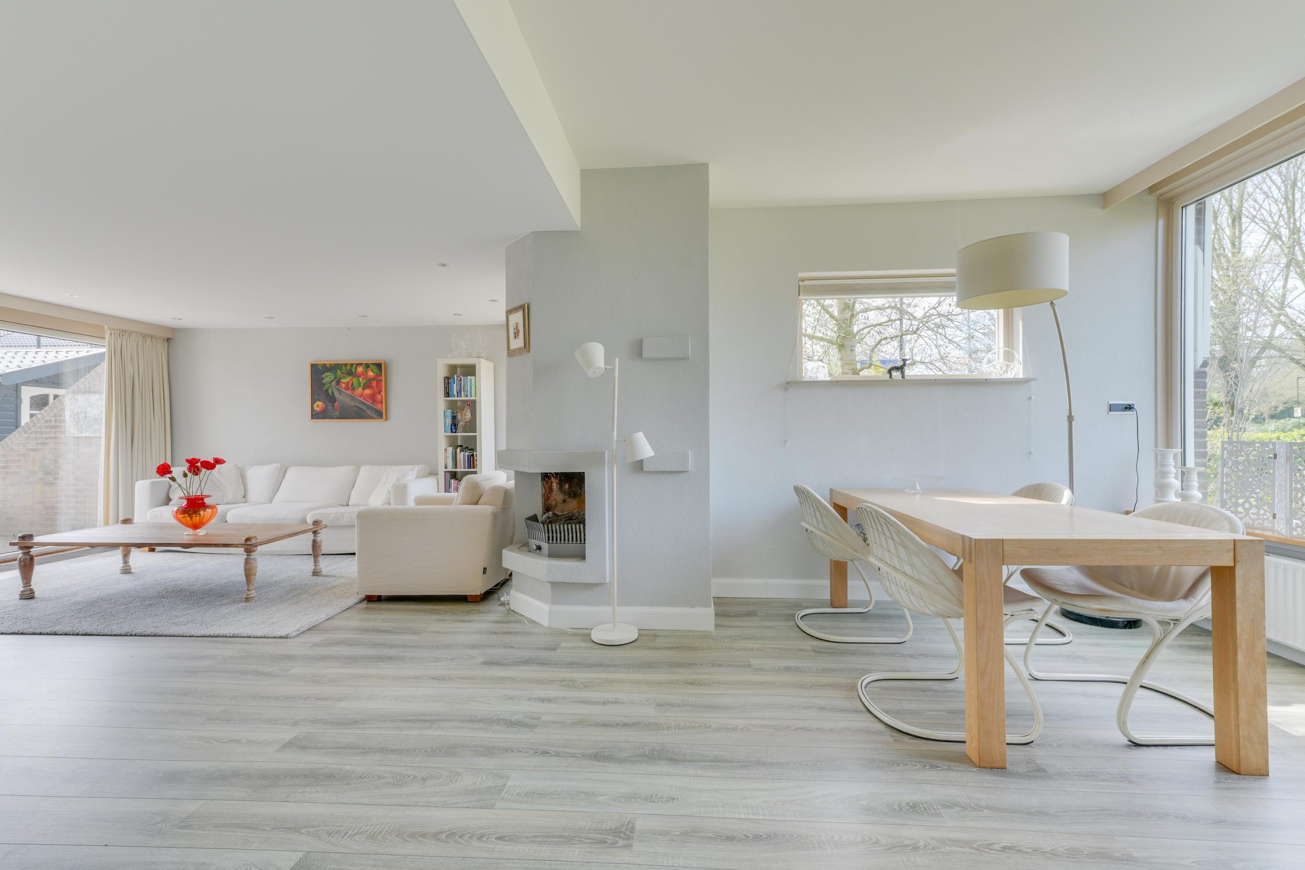 Aan de voorzijde bevindt zich de eethoek met vrij zicht over de straat. De woonkamer is aan de achterzijde gelegen en is door de uitbouw in de zijgevel extra ruim en licht. Een prettige leefruimte met verschillende indelingsmogelijkheden. De open haard wordt momenteel niet gebruikt, maar vormt een sfeervol element in de ruimte.