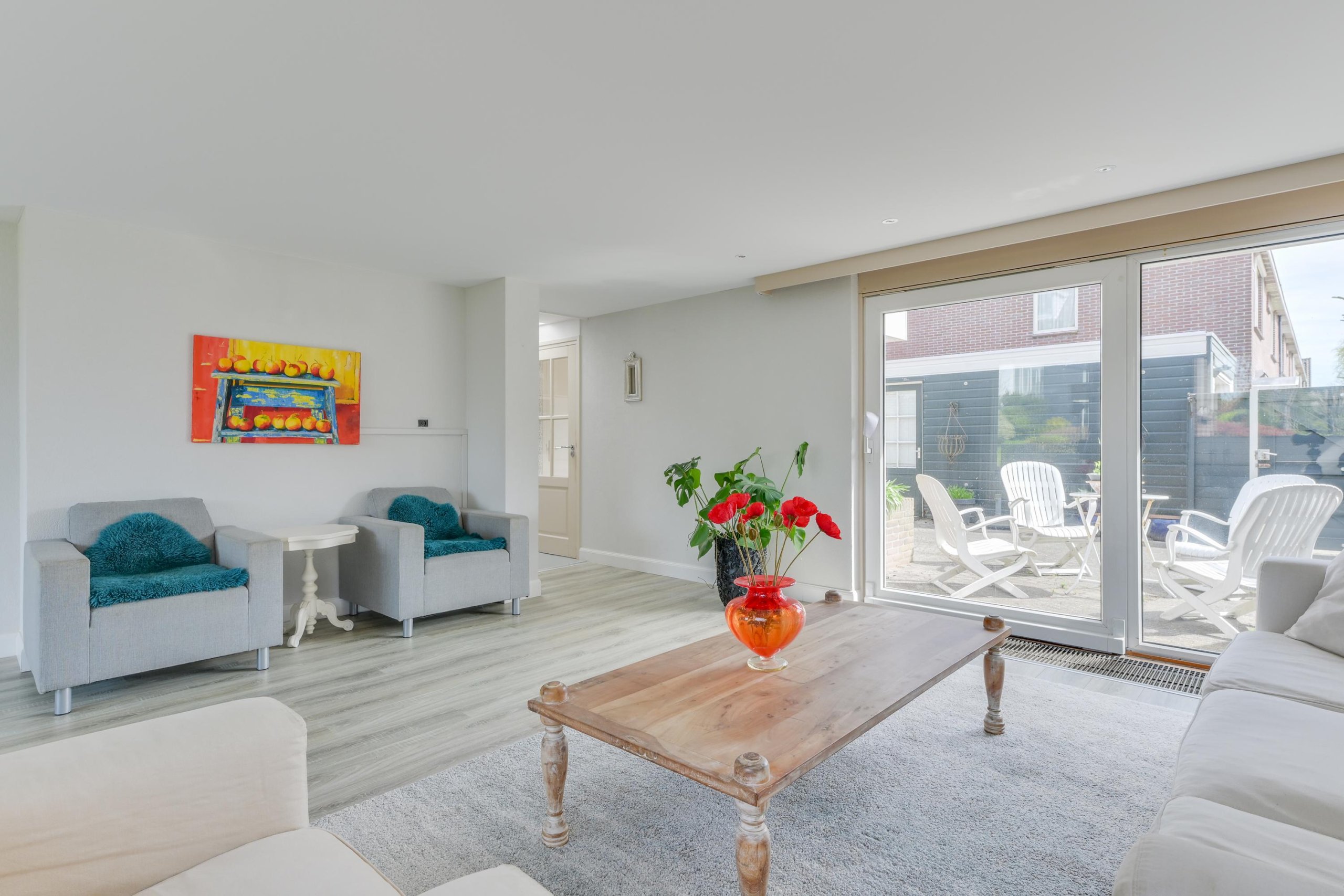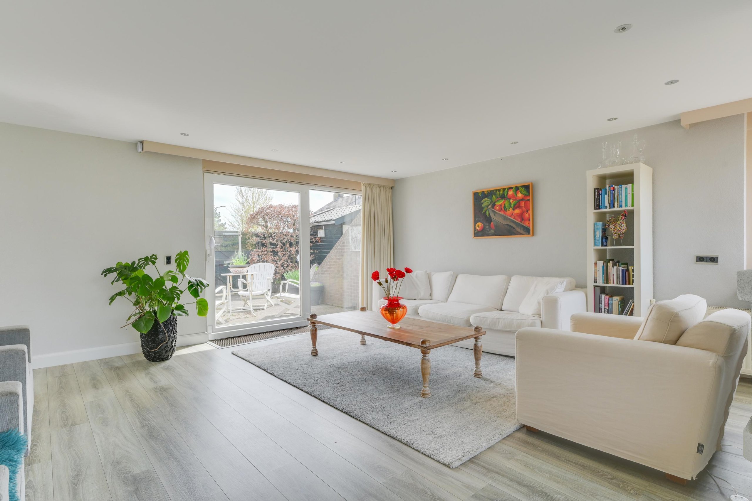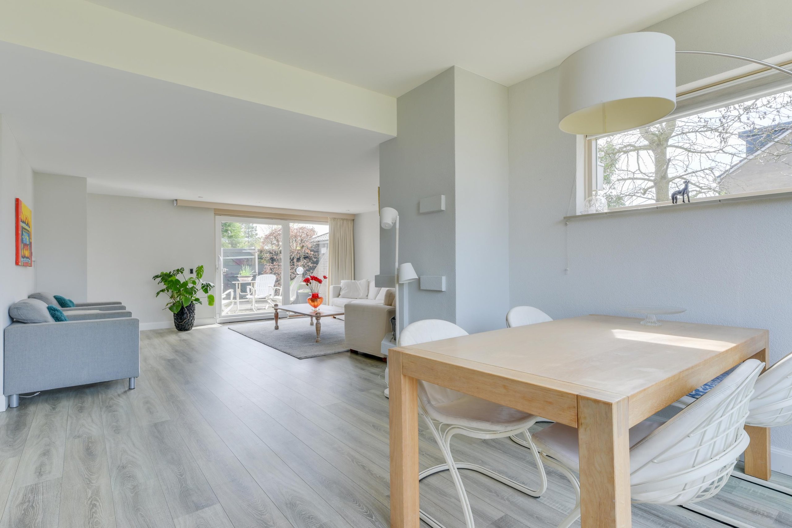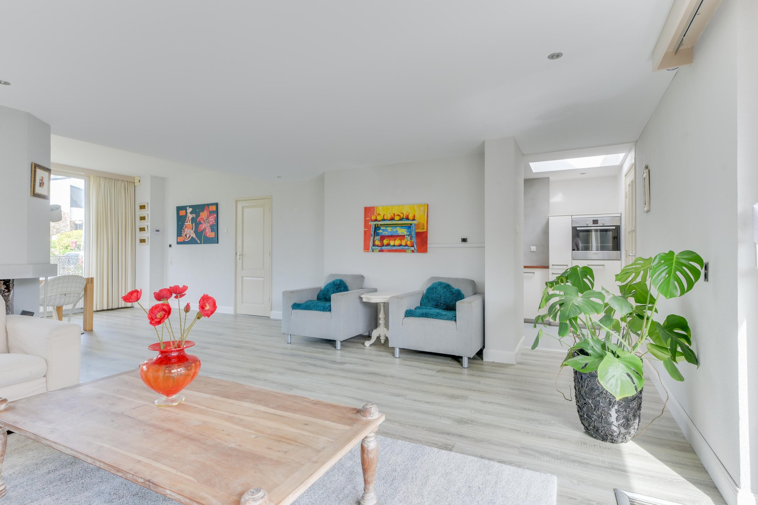 Aan de voorzijde bevindt zich de eethoek met vrij zicht over de straat. De woonkamer is aan de achterzijde gelegen en is door de uitbouw in de zijgevel extra ruim en licht. Een prettige leefruimte met verschillende indelingsmogelijkheden. De open haard wordt momenteel niet gebruikt, maar vormt een sfeervol element in de ruimte.