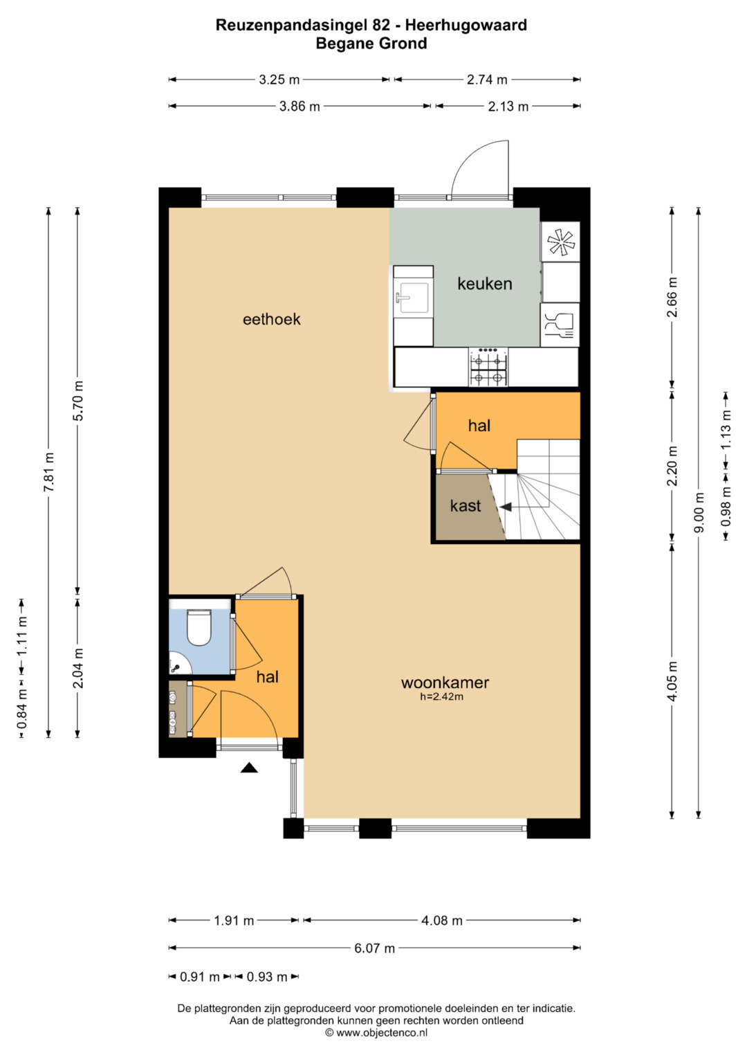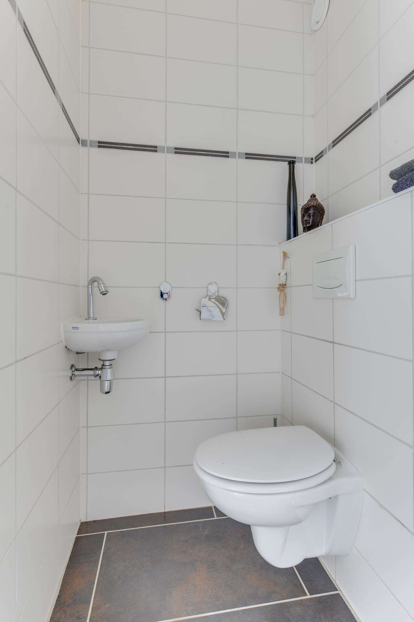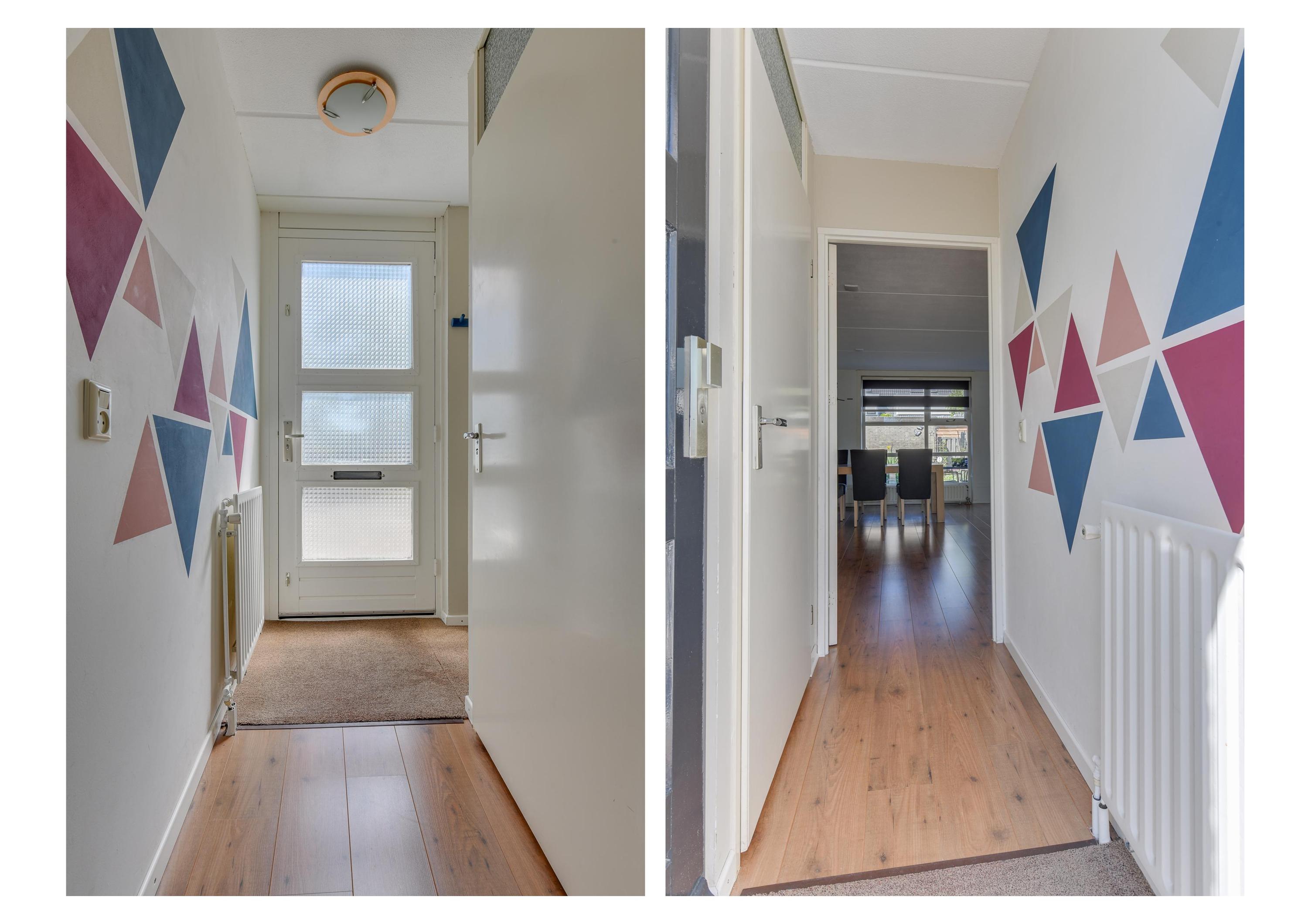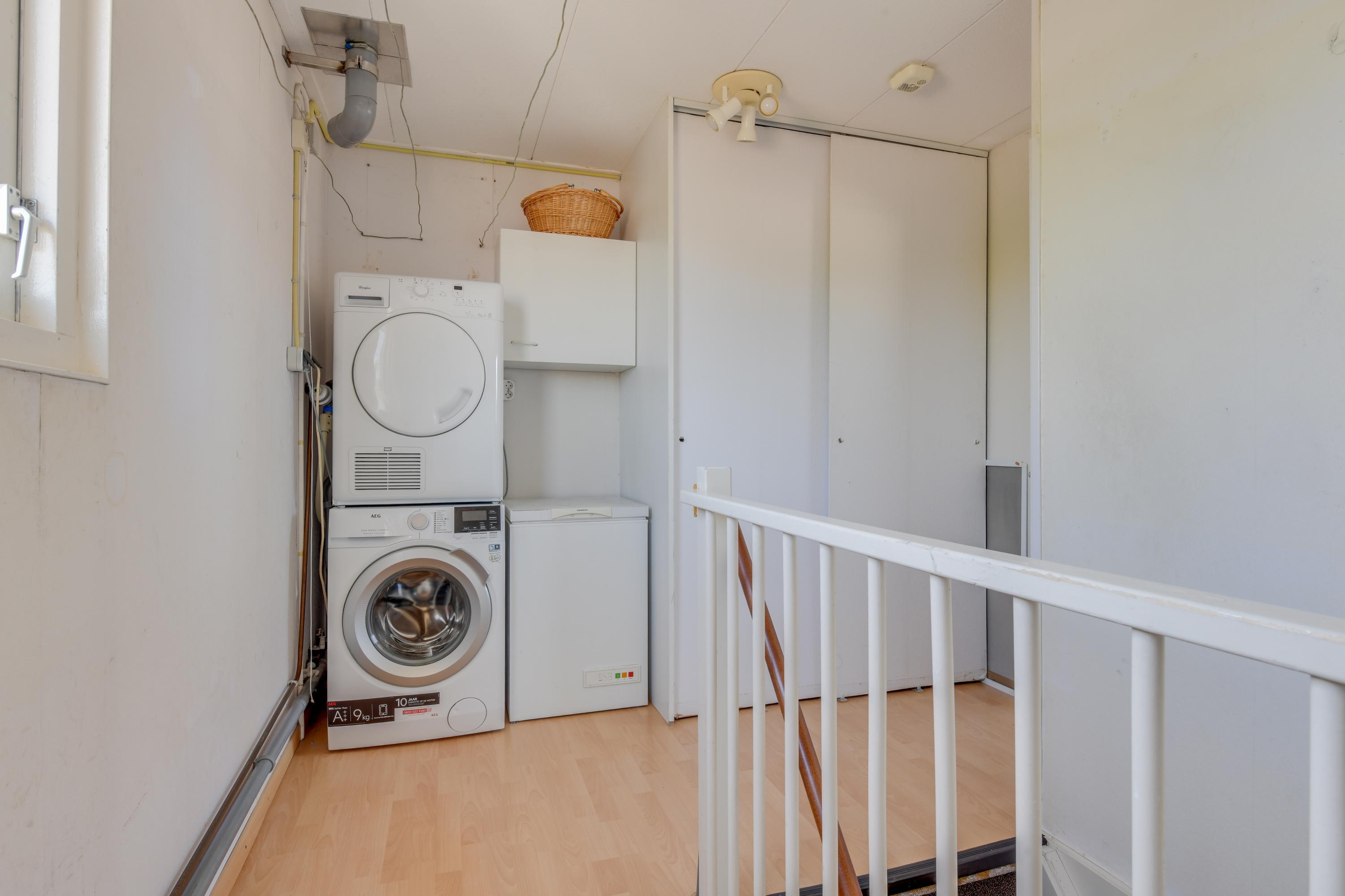 Aangrenzend aan de keuken is een tweede hal met praktische trapkast en trapopgang naar de eerste verdieping.